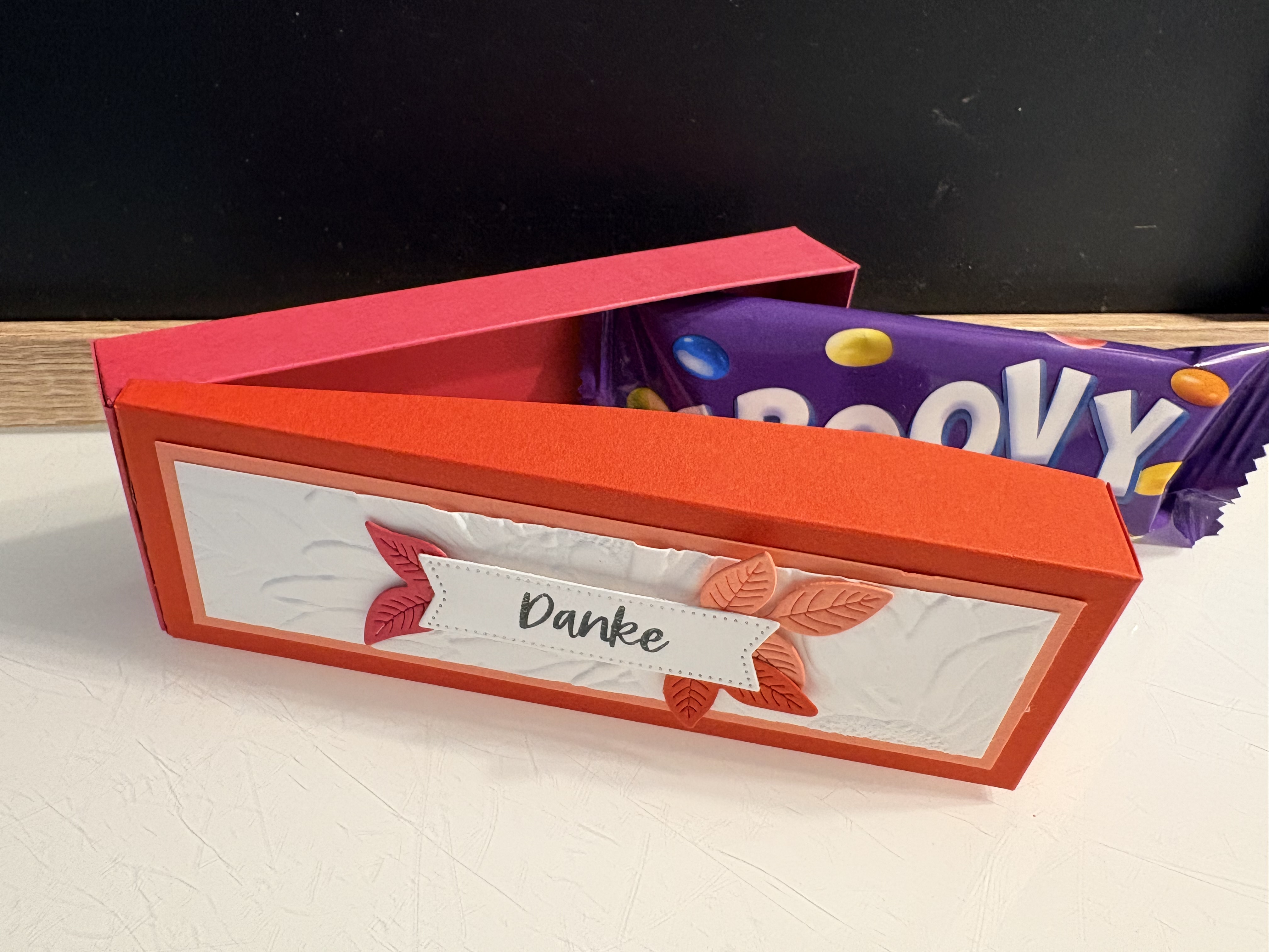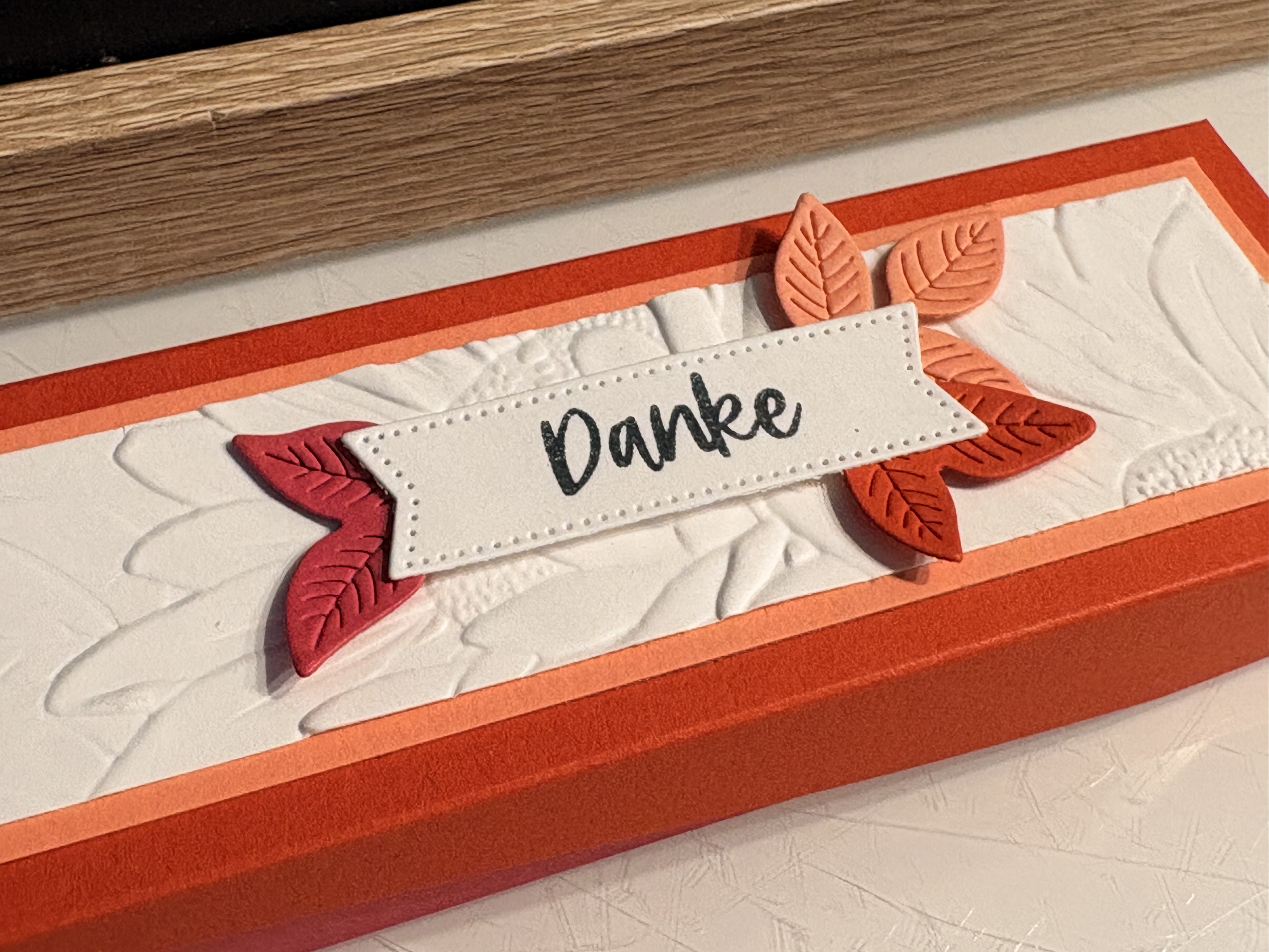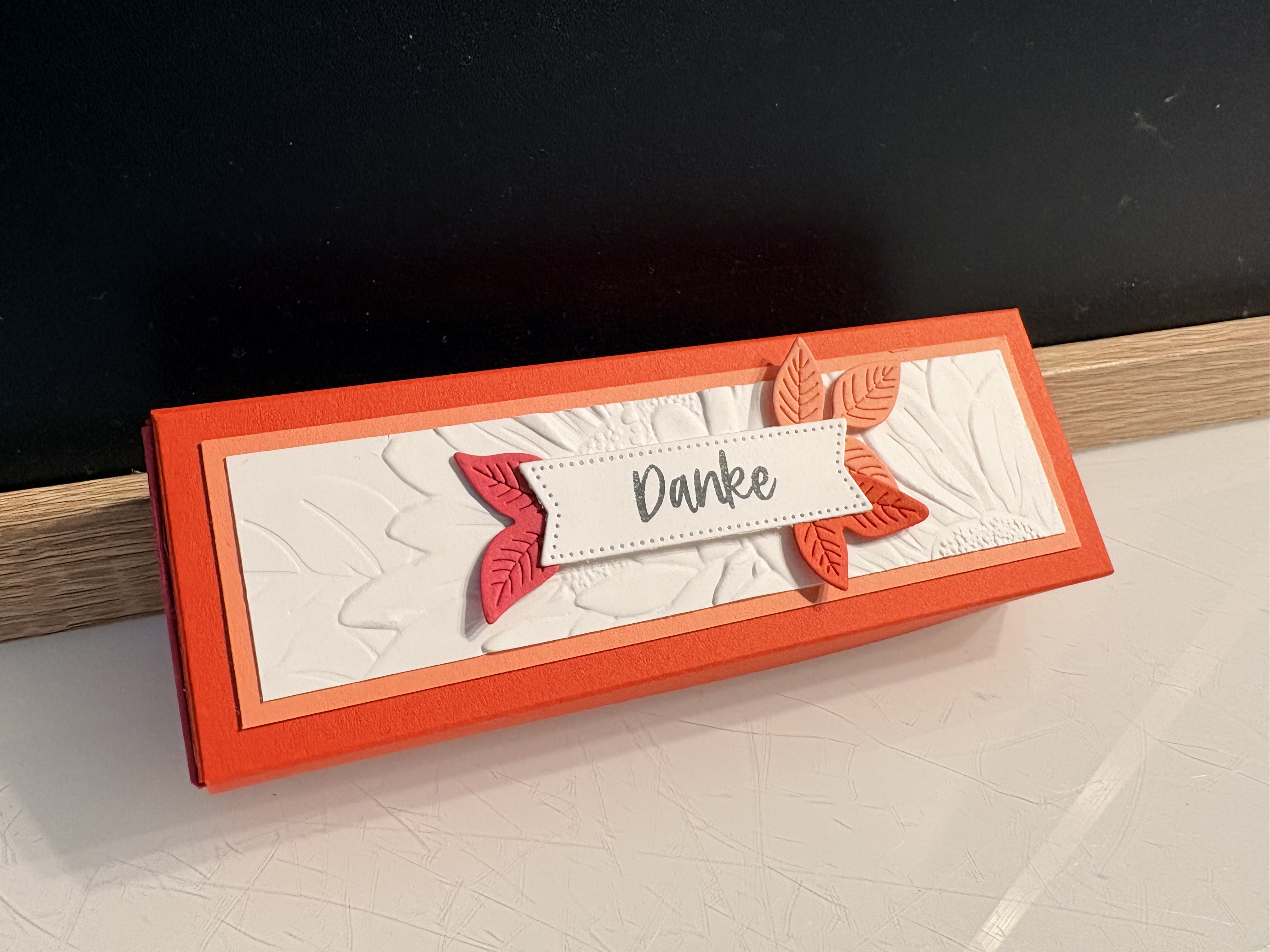 Am kommenden Freitag ist wieder Woekshop-Time bei mir daheim und wie so oft machen wir 3 coole Projekte. Das erste davon ist diese längliche Verpackung mit schrägem Deckel. Gearbeitet habe ich hier ausschließlich mit Stampin‘ Up! Farbkarton in Blutorange, Flamingorot, Wassermelone und Grundweiss. Letzteren habe ich mit dem 3D-Prägefolder „Sonnenblumenfeld“ embosst. Spruch und Stanzen sind aus dem Produktpaket „Lagenweise Blüten“ .
