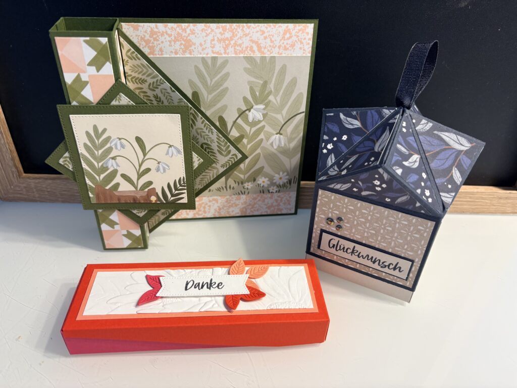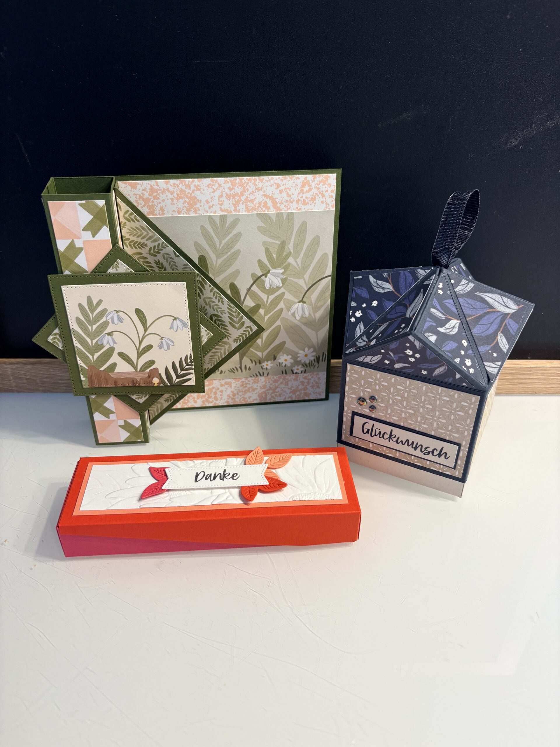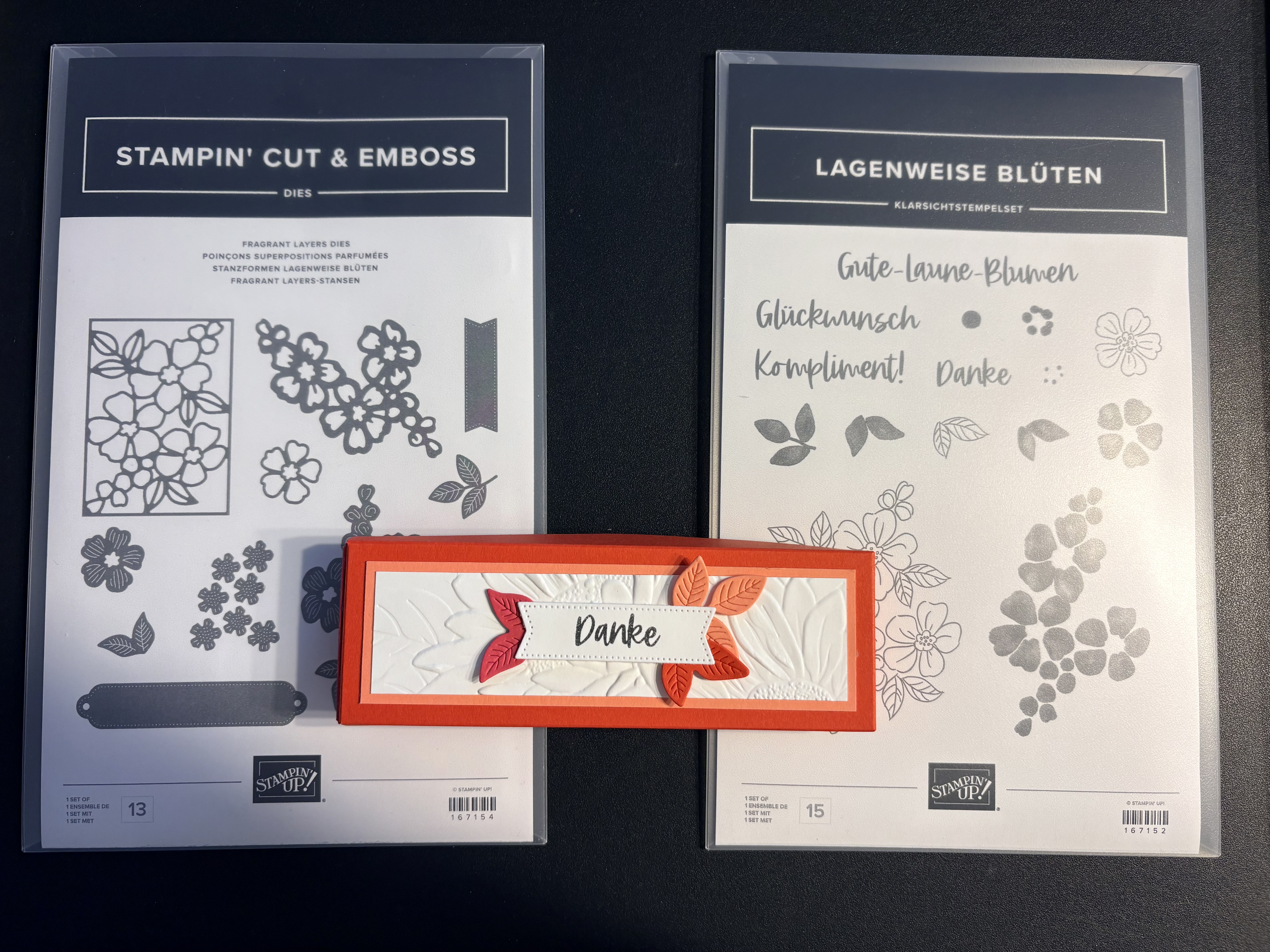 Am kommenden Freitag ist wieder Woekshop-Time bei mir daheim und wie so oft machen wir 3 coole Projekte. Das erste davon ist diese längliche Verpackung mit schrägem Deckel. Gearbeitet habe ich hier ausschließlich mit Stampin‘ Up! Farbkarton in Blutorange, Flamingorot, Wassermelone und Grundweiss. Letzteren habe ich mit dem 3D-Prägefolder „Sonnenblumenfeld“ embosst. Spruch und Stanzen sind aus dem Produktpaket „Lagenweise Blüten“ .