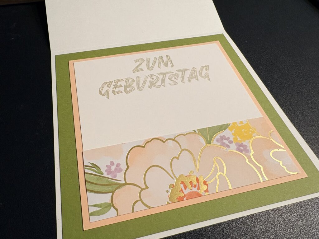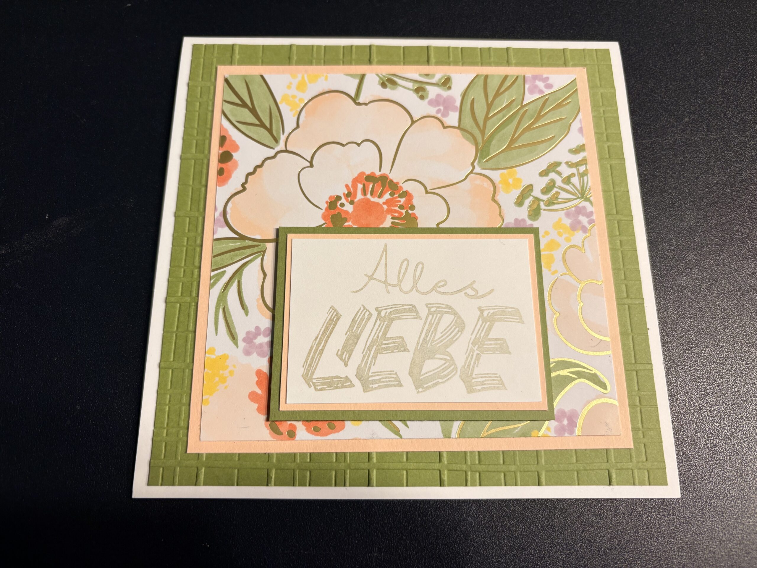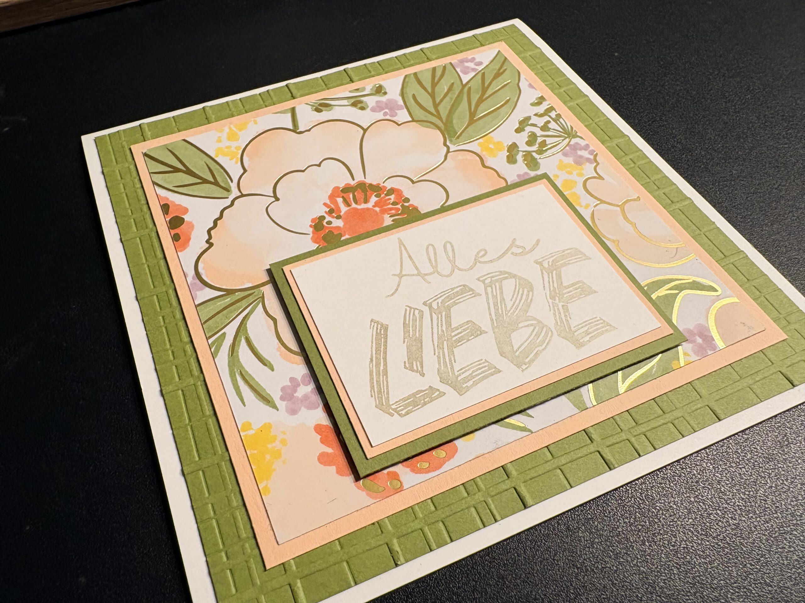 Vor kurzem hatte die liebe Karin aus meinem Team Geburtstag und natürlich hat sie von mir auch heuer wieder eine Karte bekommen. Verwendet habe ich das wunderschöne Besondere Designerpapier „Liebevolle Schönheit“ von Stampin‘ Up! Dazu kombiniert habe ich Farbkarton in Olivgrün – den ich mit dem 3D Prägefolder „Verspielte Karos“ geprägt habe -, Blütenrosa und Grundweiß. Um das Gold im Designerpapier aufzugreifen, habe ich in Savanne gestempelt und zwar habe ich hier das Stampin’ Up! Stempelset „Grüße über Grüße“ verwendet, das ich wirklich toll und gelungen finde. Für mehr Tiefe habe ich den Spruch außen gemattet und mit Stampin‘ Dimensionals festgeklebt. Beste Wünsche nachträglich und viel Freude sowie Gesundheit im neuen Lebensjahr!