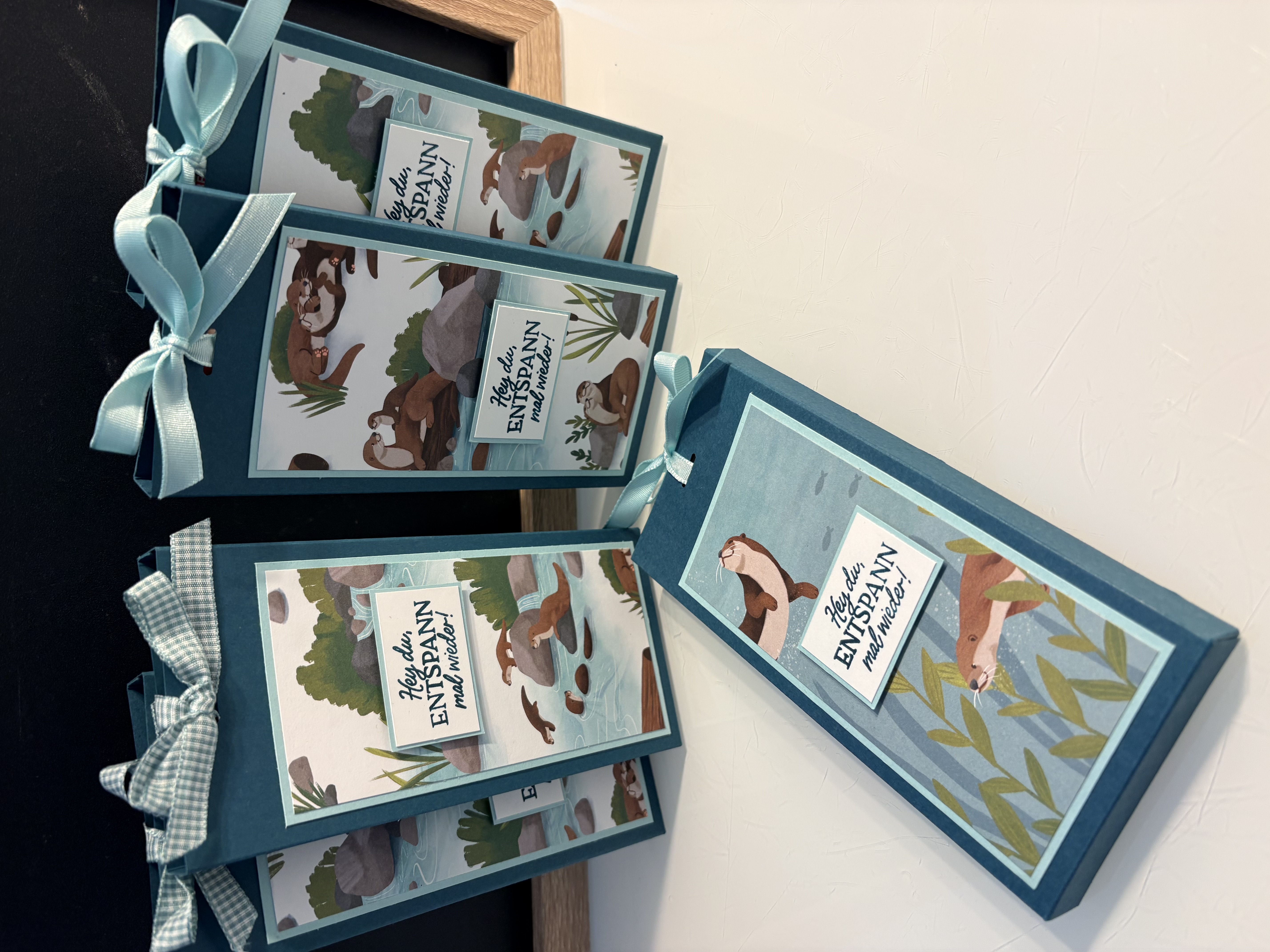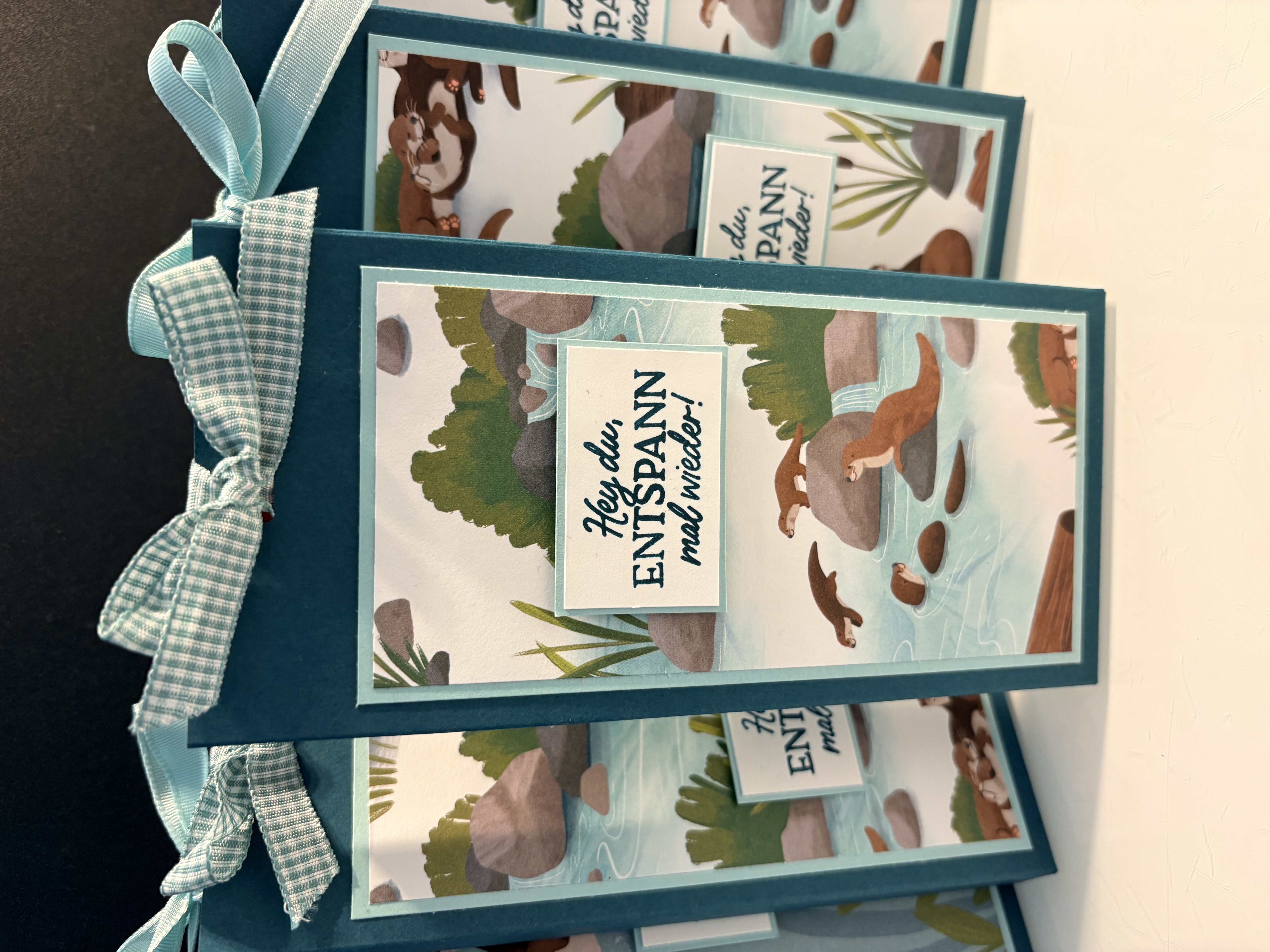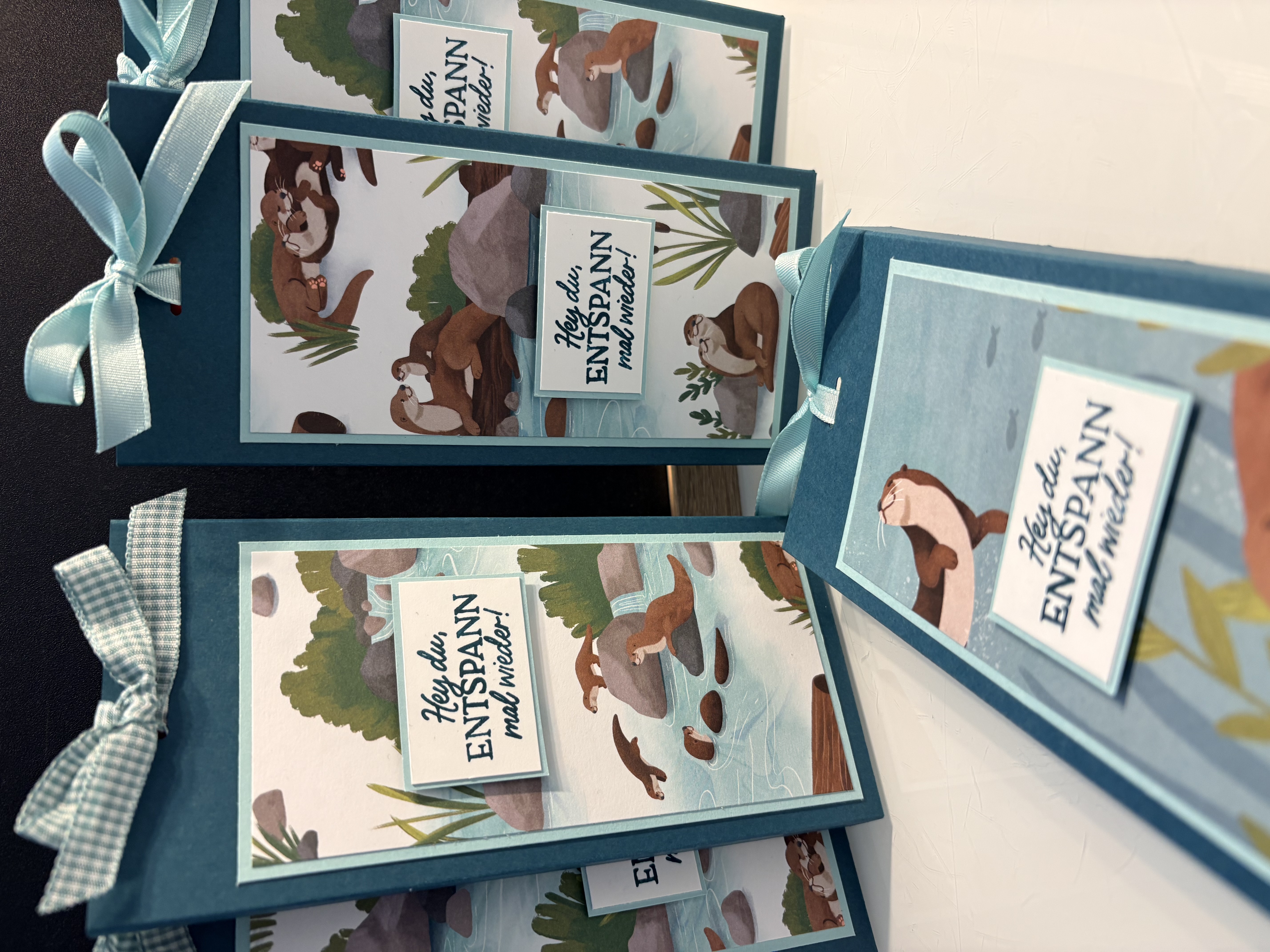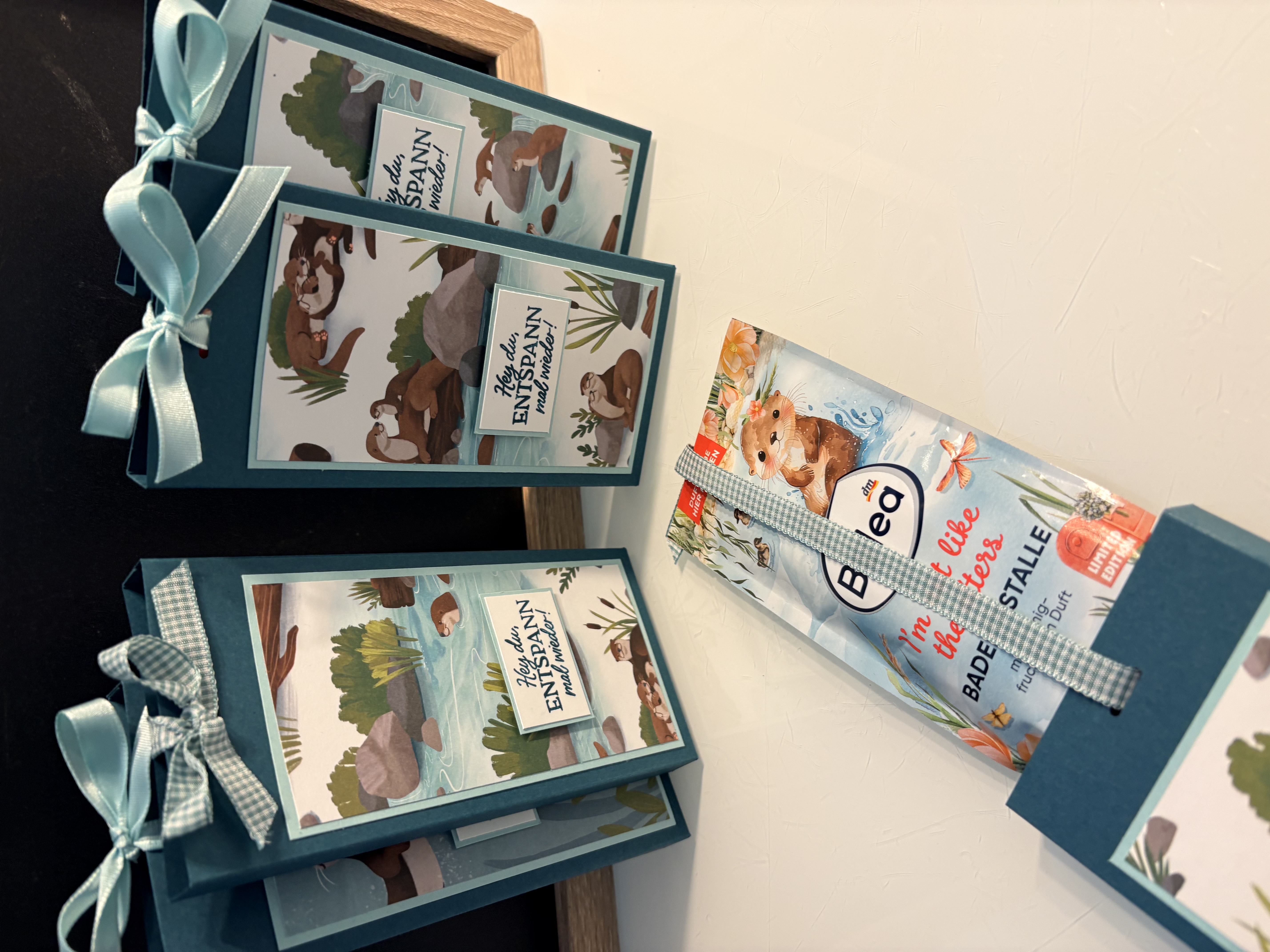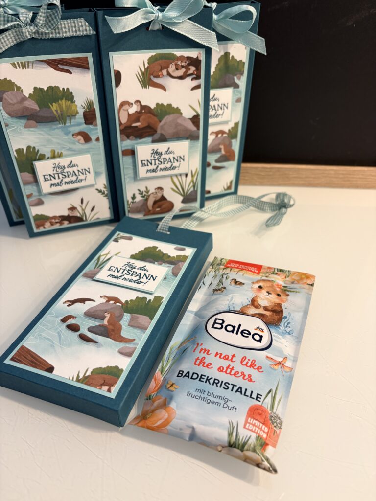 Gestern hatten wir das erste Stampin‘ Up! Teamtreffen heuer und natürlich wurde wieder geswappt. Ich habe so süße Badezusätze gefunden mit einem Otter drauf, dass ich zum leider nicht mehr erhältlichen Stampin‘ Up! Designerpapier „Süße Otter“ bzw. dem Stempelset „Ottergrüße“ greifen musste! Ich finde das ja so bezaubernd! 🦦 Außerdem habe ich Farbkarton in Pfauengrün und Aquamarin verwendet sowie ein passendes Geschenkband ins Aquamarin. Den Spruch habe ich ebenfalls in Pfauengrün gestempelt. Das liebe ich ja so an Stampin‘ Up! Alles ist perfekt farblich aufeinander abgestimmt!