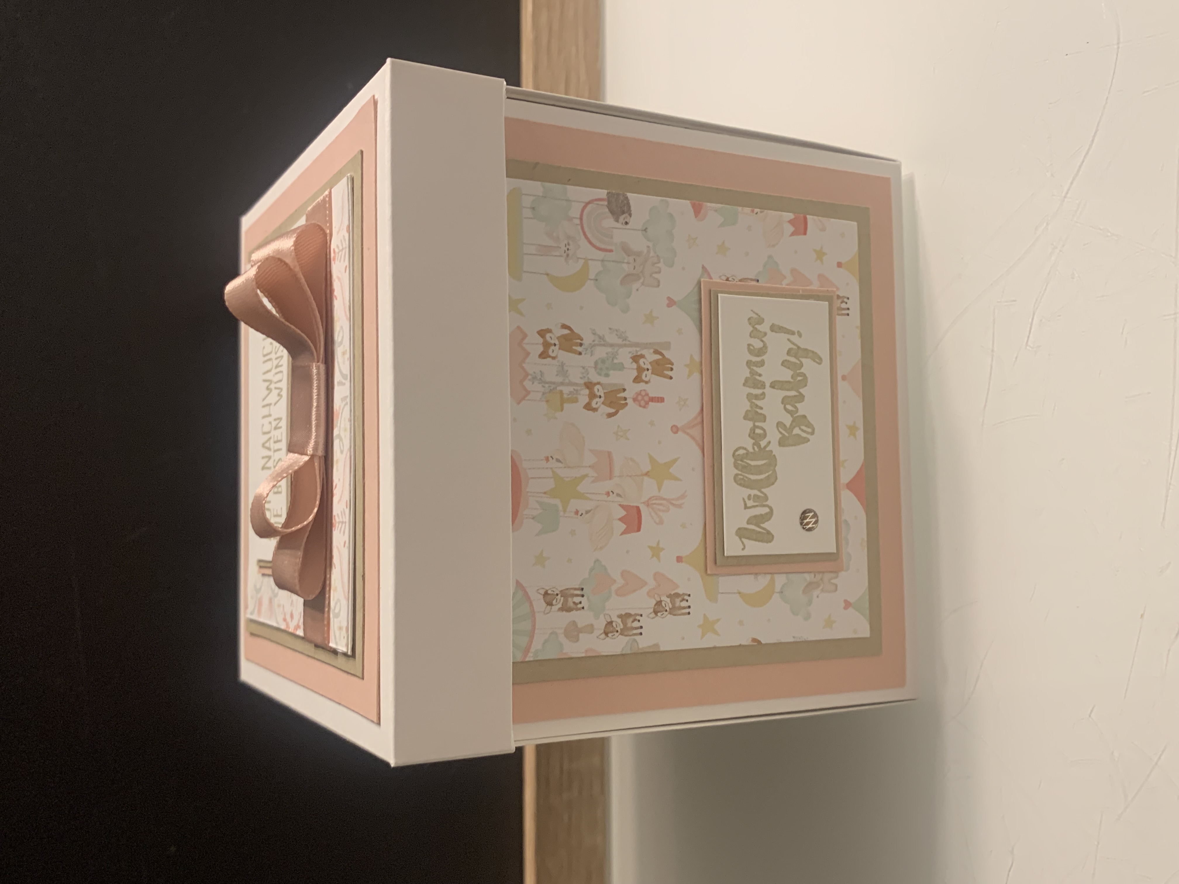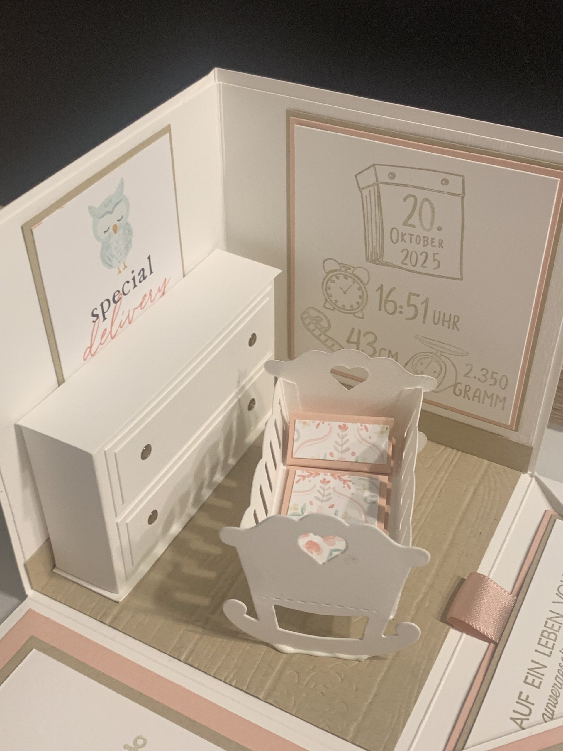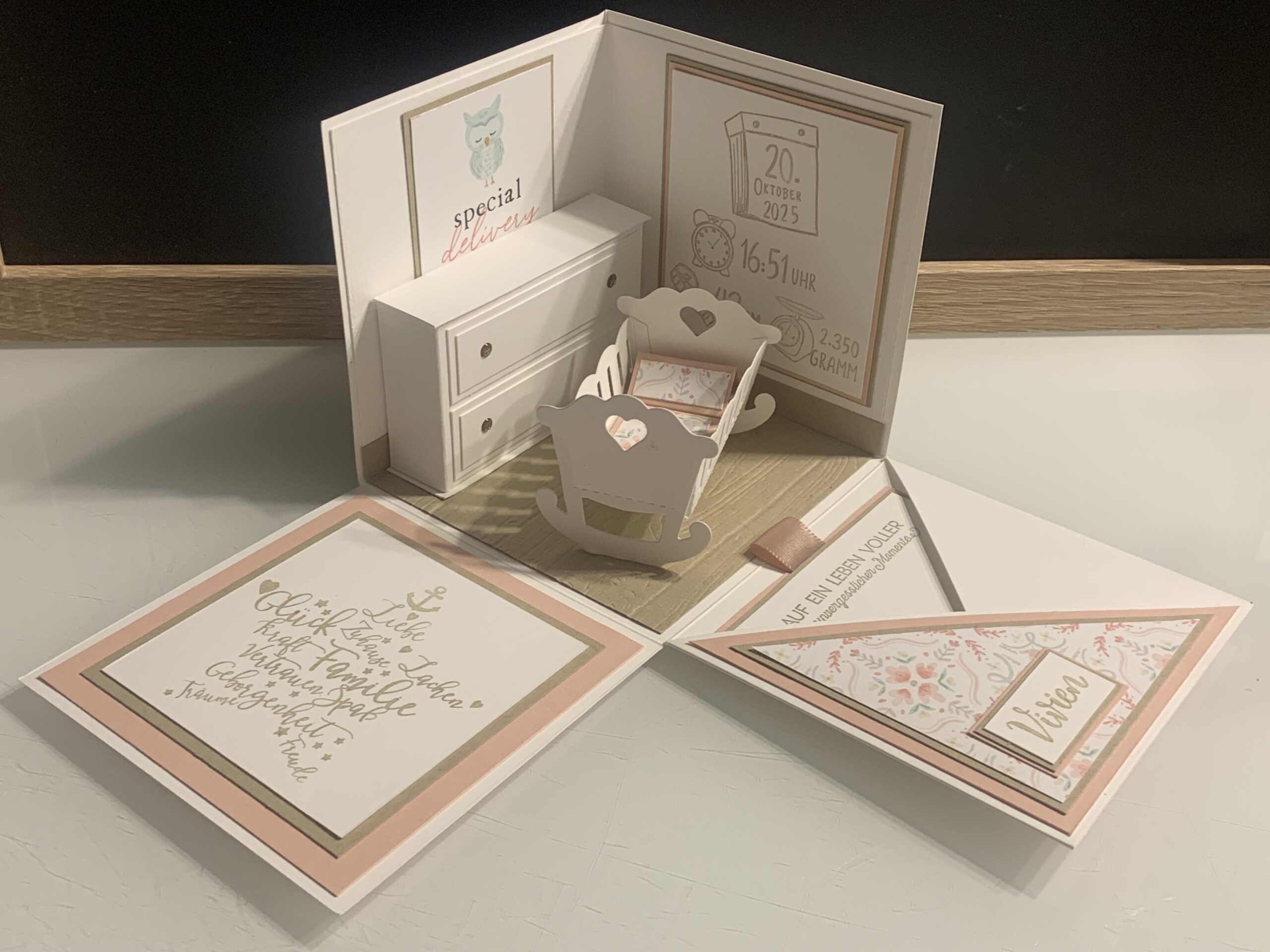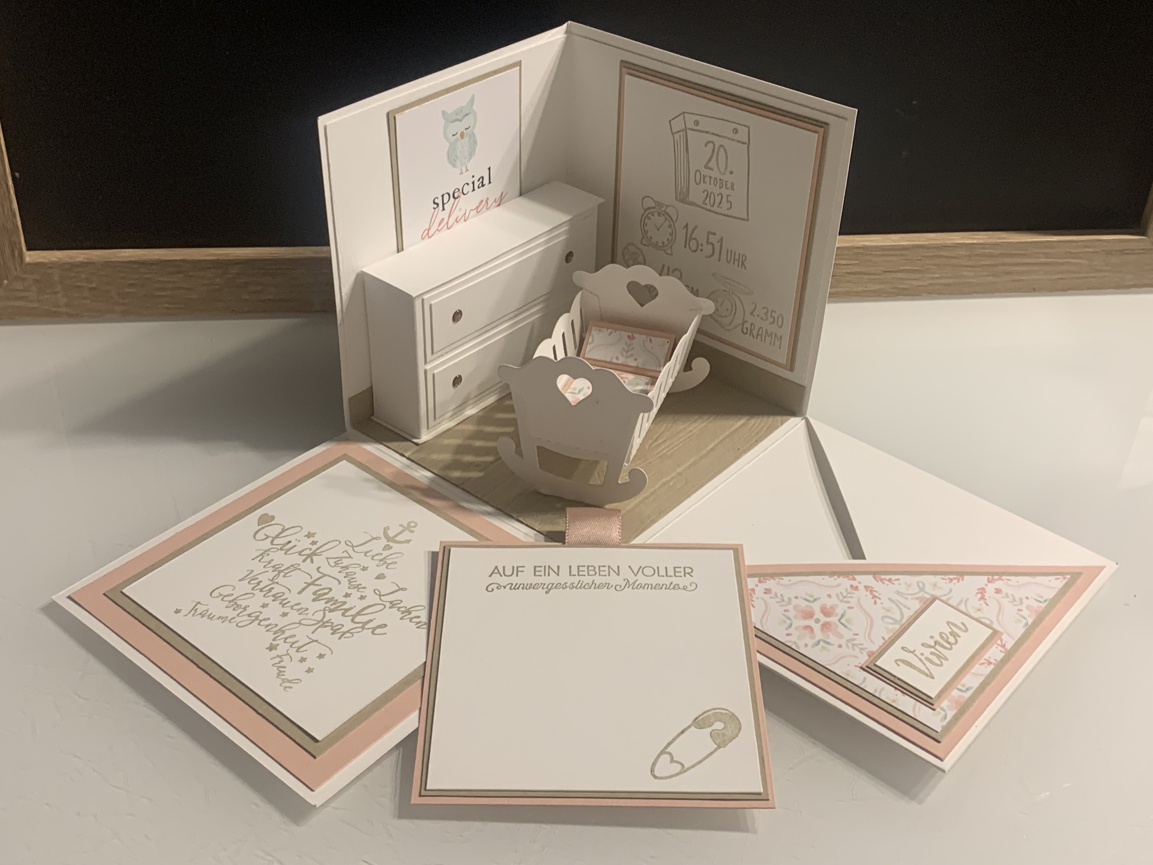 Zur Geburt der kleinen Vivien durfte ich diese Explosionsbox anfertigen in Grundweiß, Savanne und Kirschblüte, passend zu dem zuckersüßen gewählten Designerpapier. Innen ist sowohl in der Wiege als auch im Schrank Platz für einen Gutschein, ein Geldgeschenk oder auch ein kleines Schmuckstück. Dazu gab es auch noch eine passende Karte für die persönlichen Glückwünsche! Vielen lieben Dank für die Bestellung, ich hoffe die Überraschungsbox hat Freude bereitet!