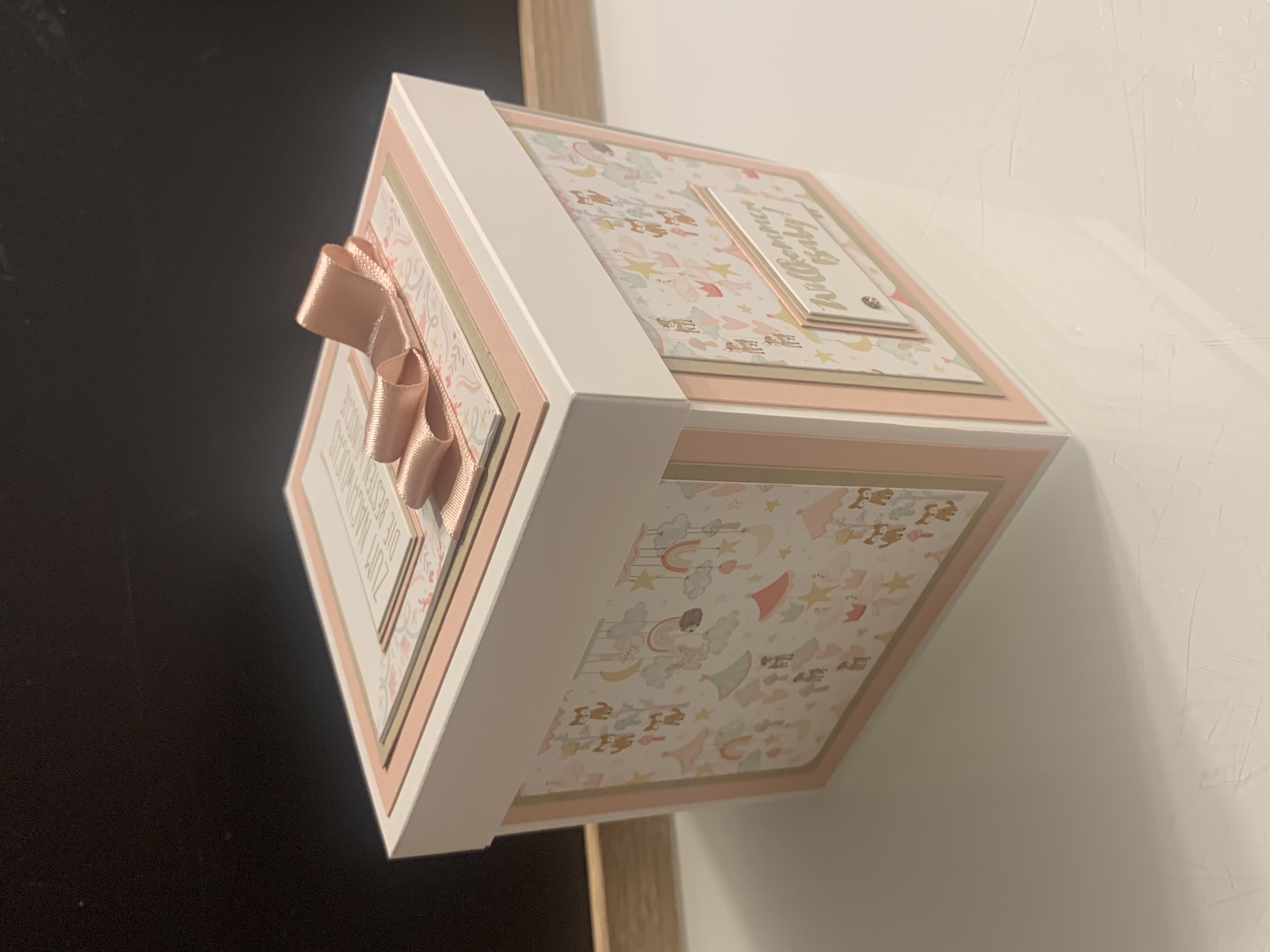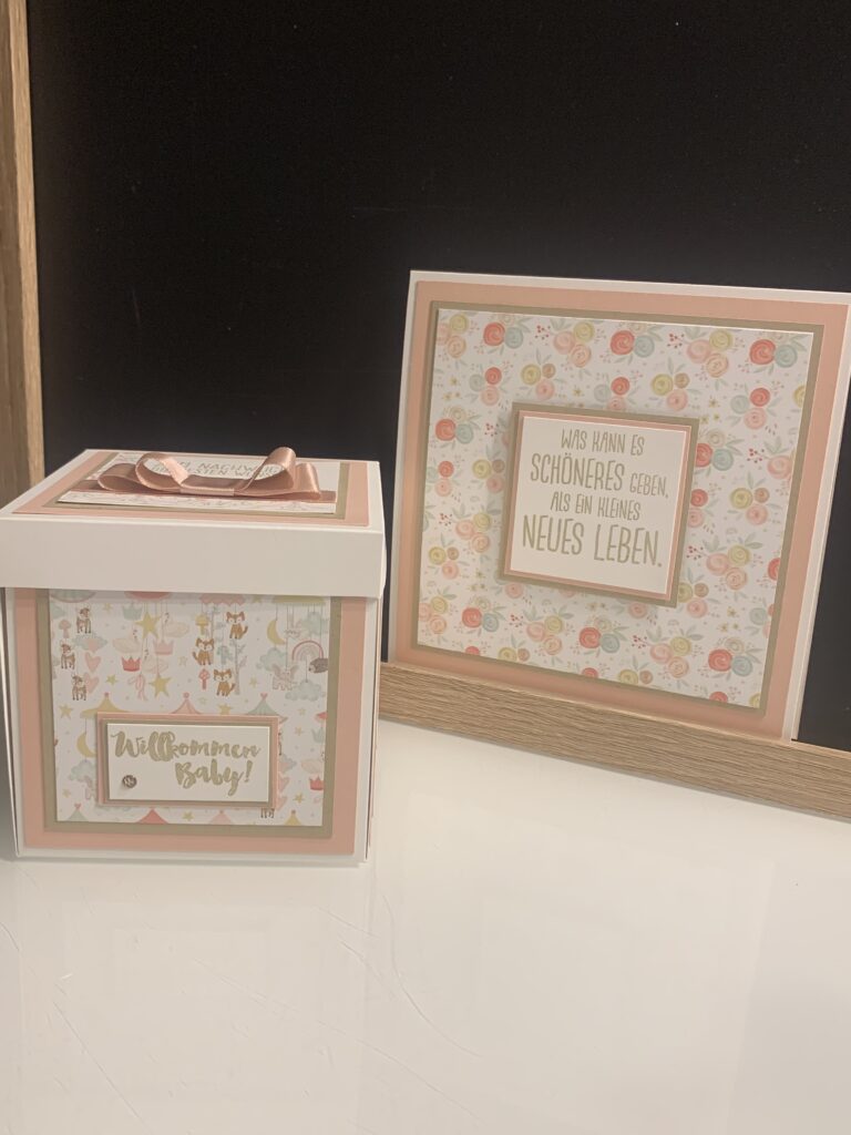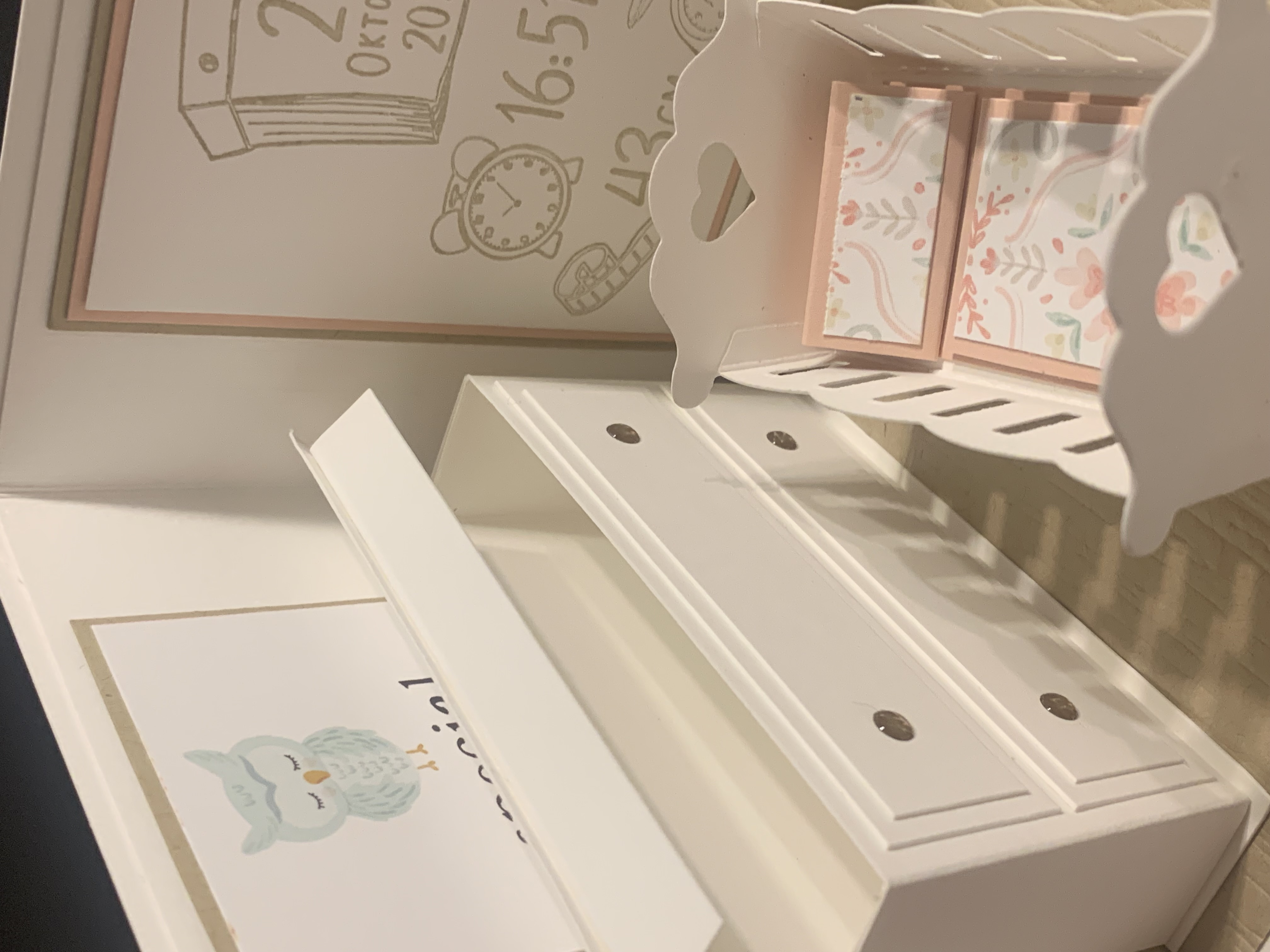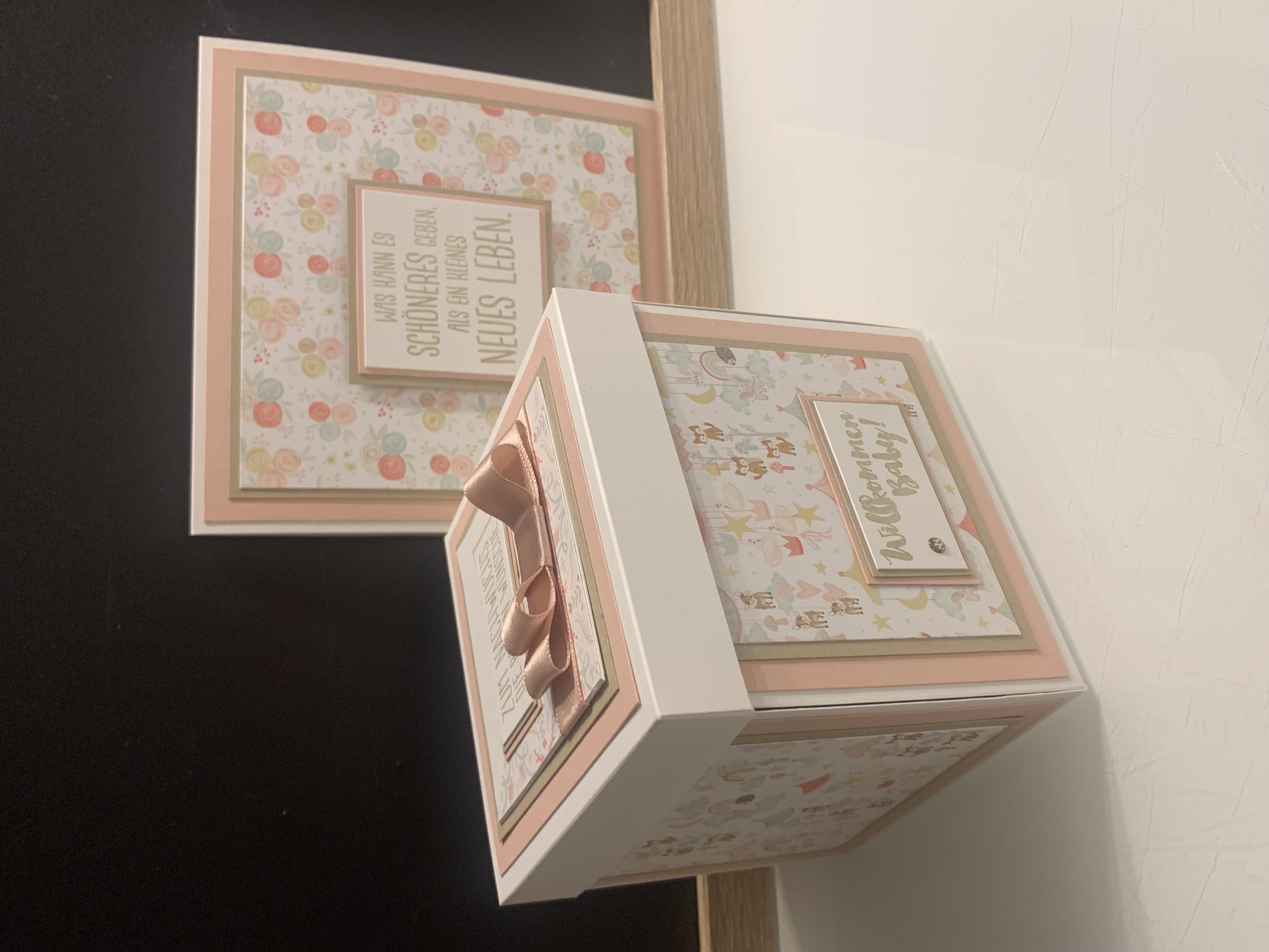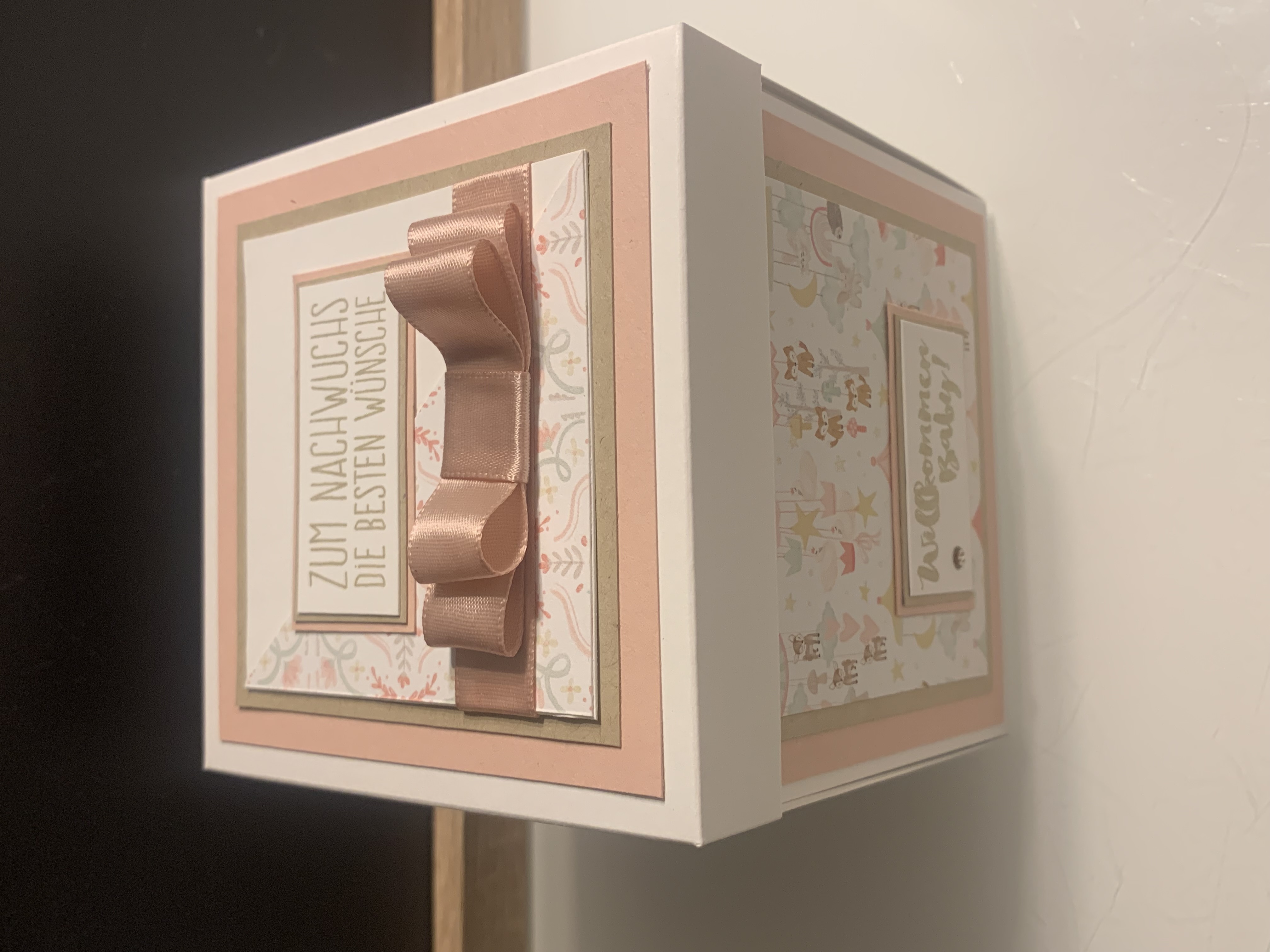 Zur Geburt der kleinen Vivien durfte ich diese Explosionsbox anfertigen in Grundweiß, Savanne und Kirschblüte, passend zu dem zuckersüßen gewählten Designerpapier. Innen ist sowohl in der Wiege als auch im Schrank Platz für einen Gutschein, ein Geldgeschenk oder auch ein kleines Schmuckstück. Dazu gab es auch noch eine passende Karte für die persönlichen Glückwünsche! Vielen lieben Dank für die Bestellung, ich hoffe die Überraschungsbox hat Freude bereitet!