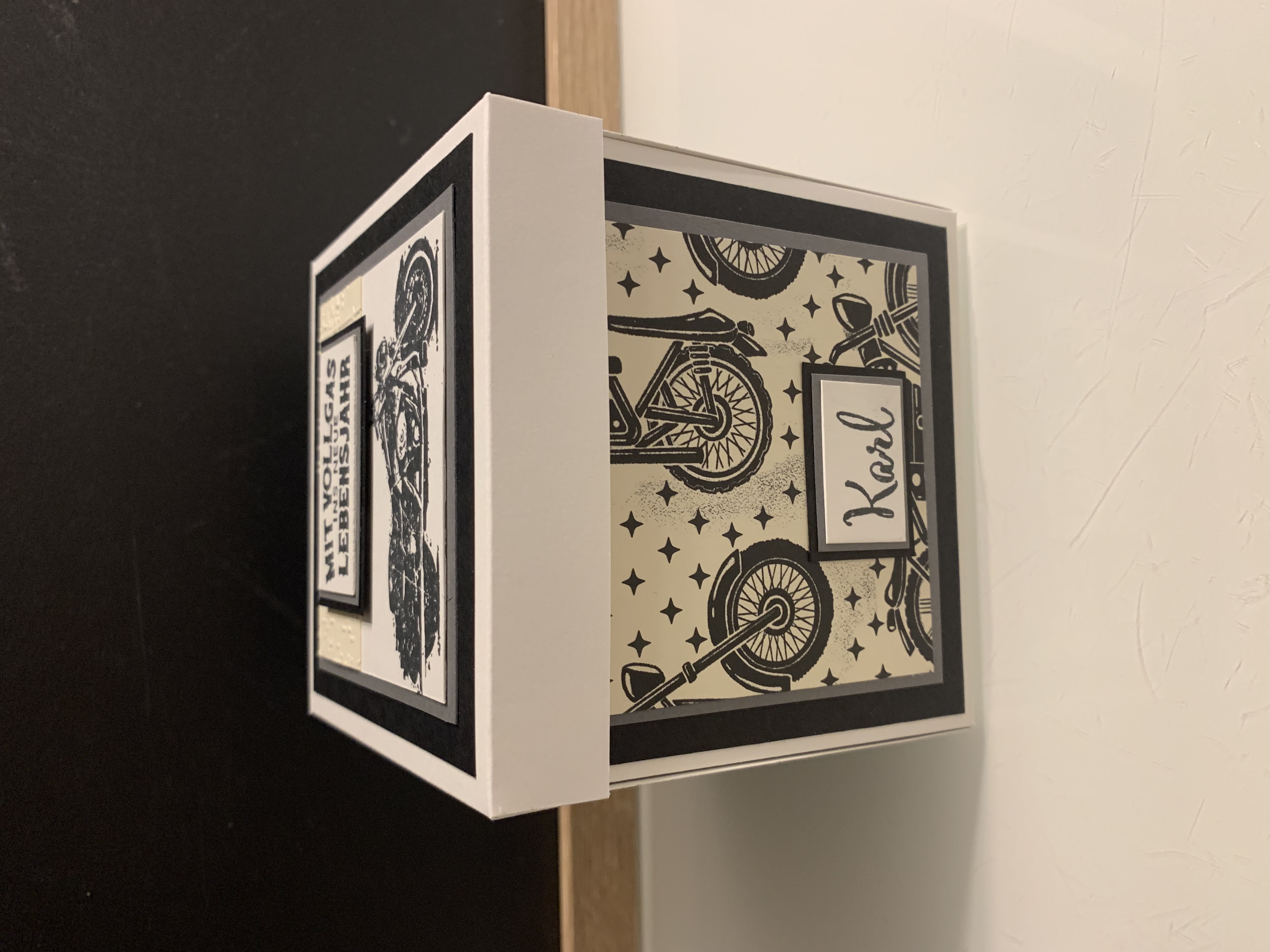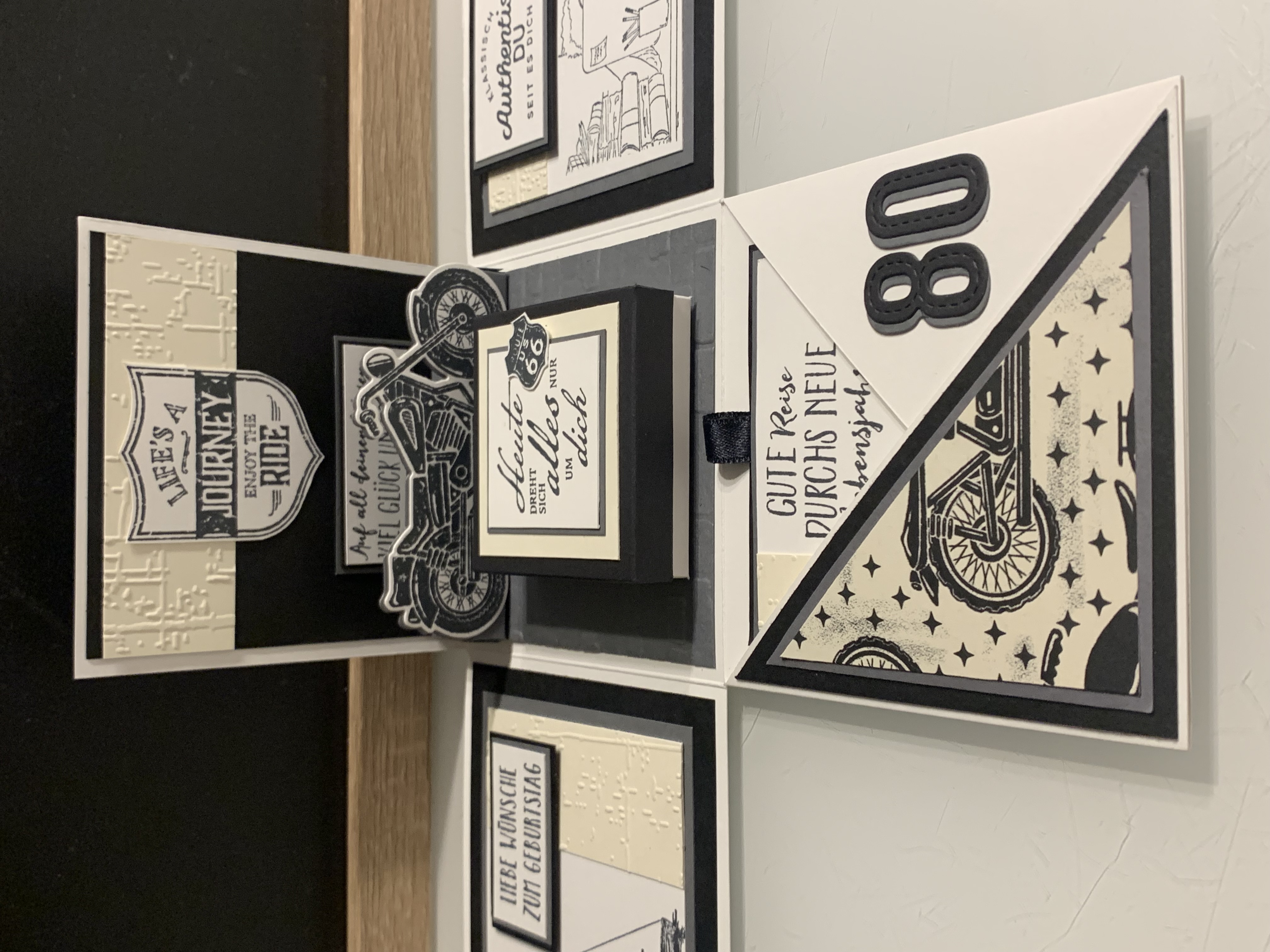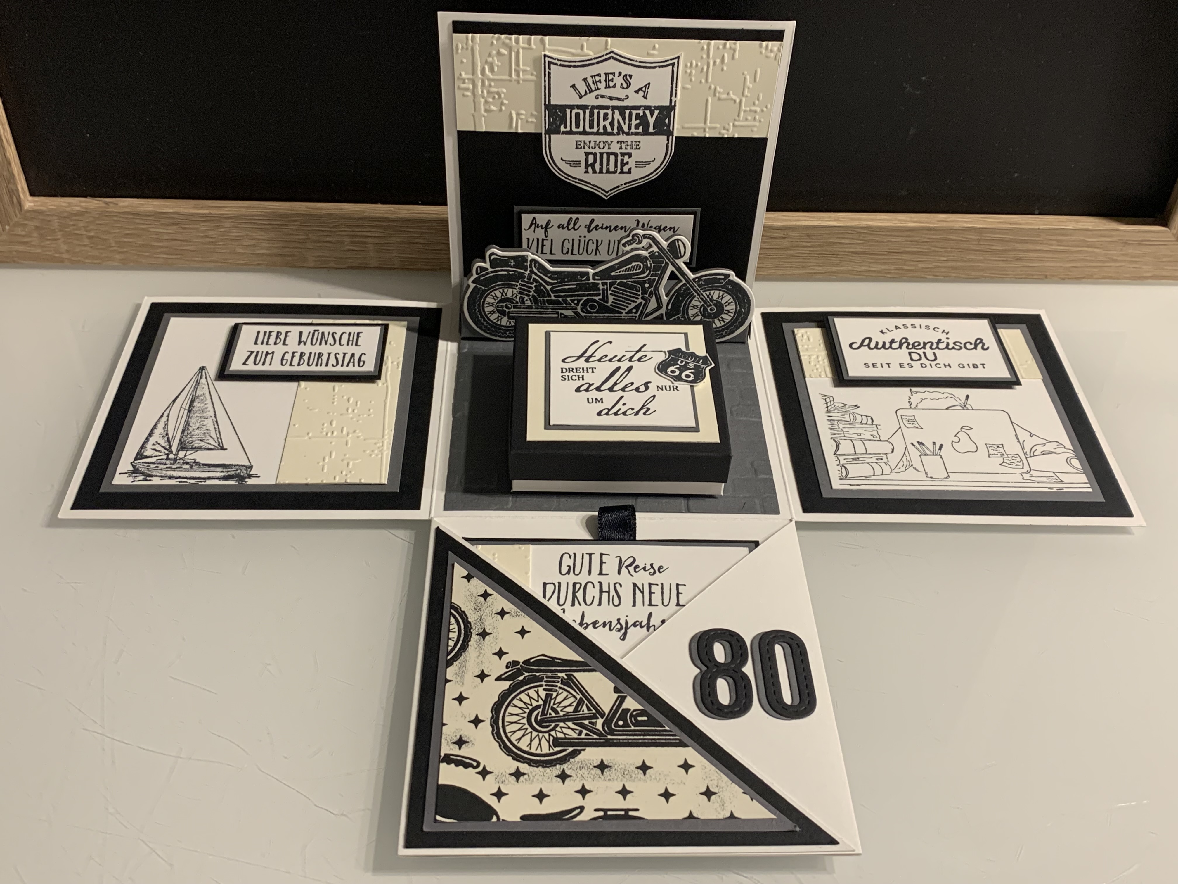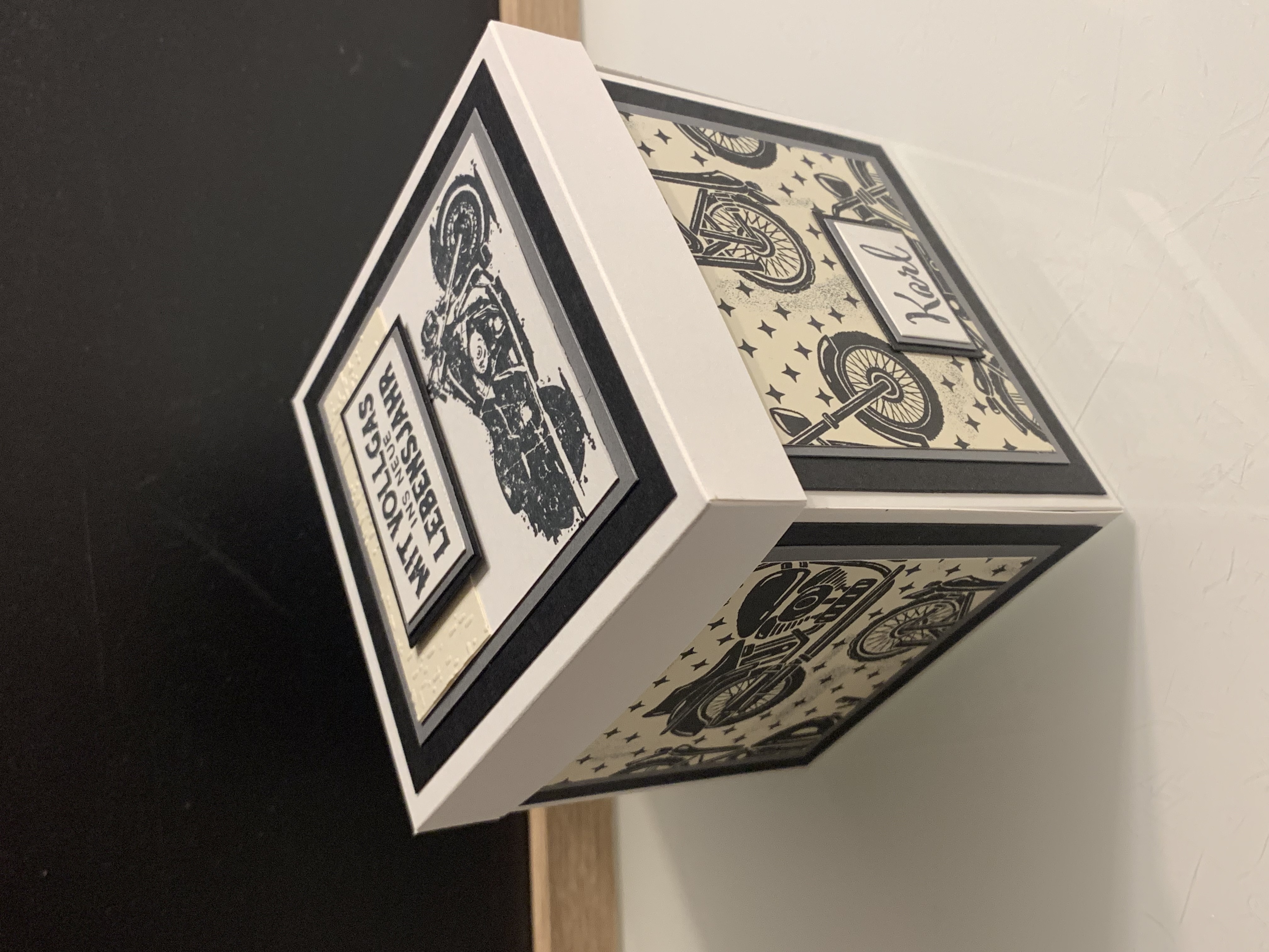 Zu Karls 80. Geburtsag durfte ich diese Explosionsbox herstellen Das Hauptthema der Box war Motorrad/ Harley, wobei auch betont werden sollte, dass er ein Arbeitstier ist und auch das Segeln liebt. Diese beiden Themen habe ich innen an den Seiten angebracht. Farblich habe ich in Schwarz, Grundweiß, Vanille Pur und Anthrazit gearbeitet. Innen befindet sich noch eine kleine Box für das Geldgeschenk. Vielen lieben Dank für die Bestellung und viel Freude beim Verschenken!!