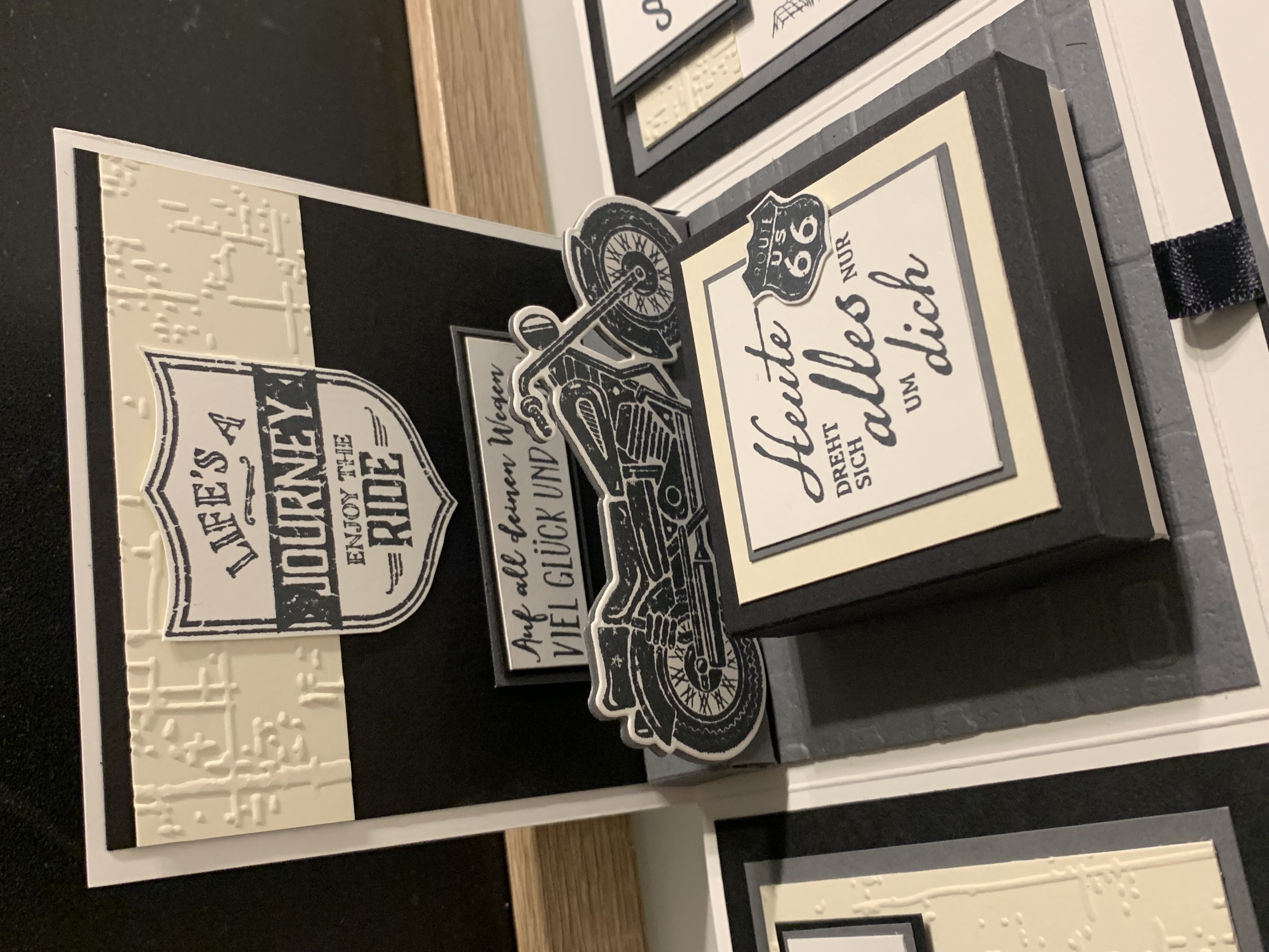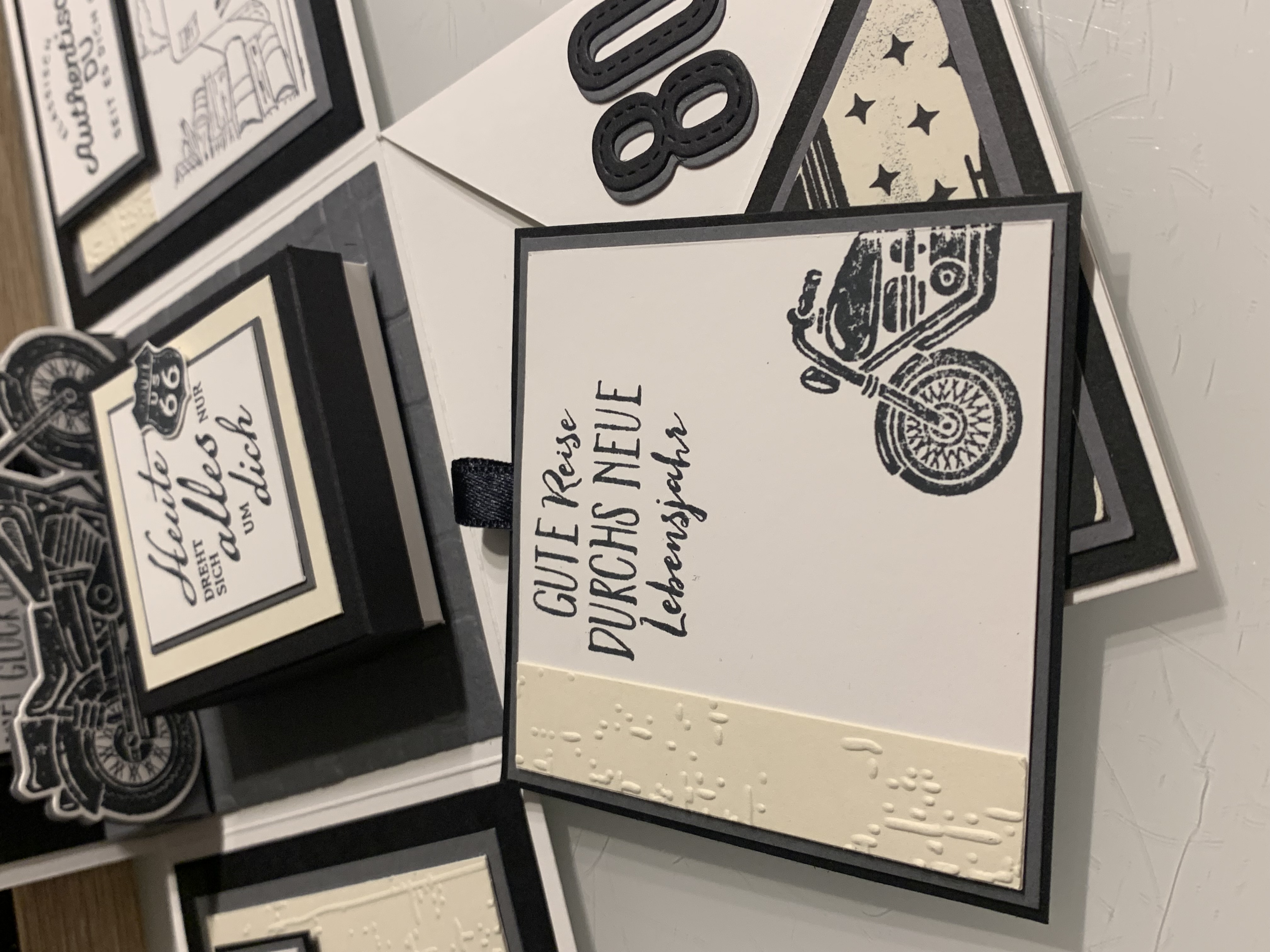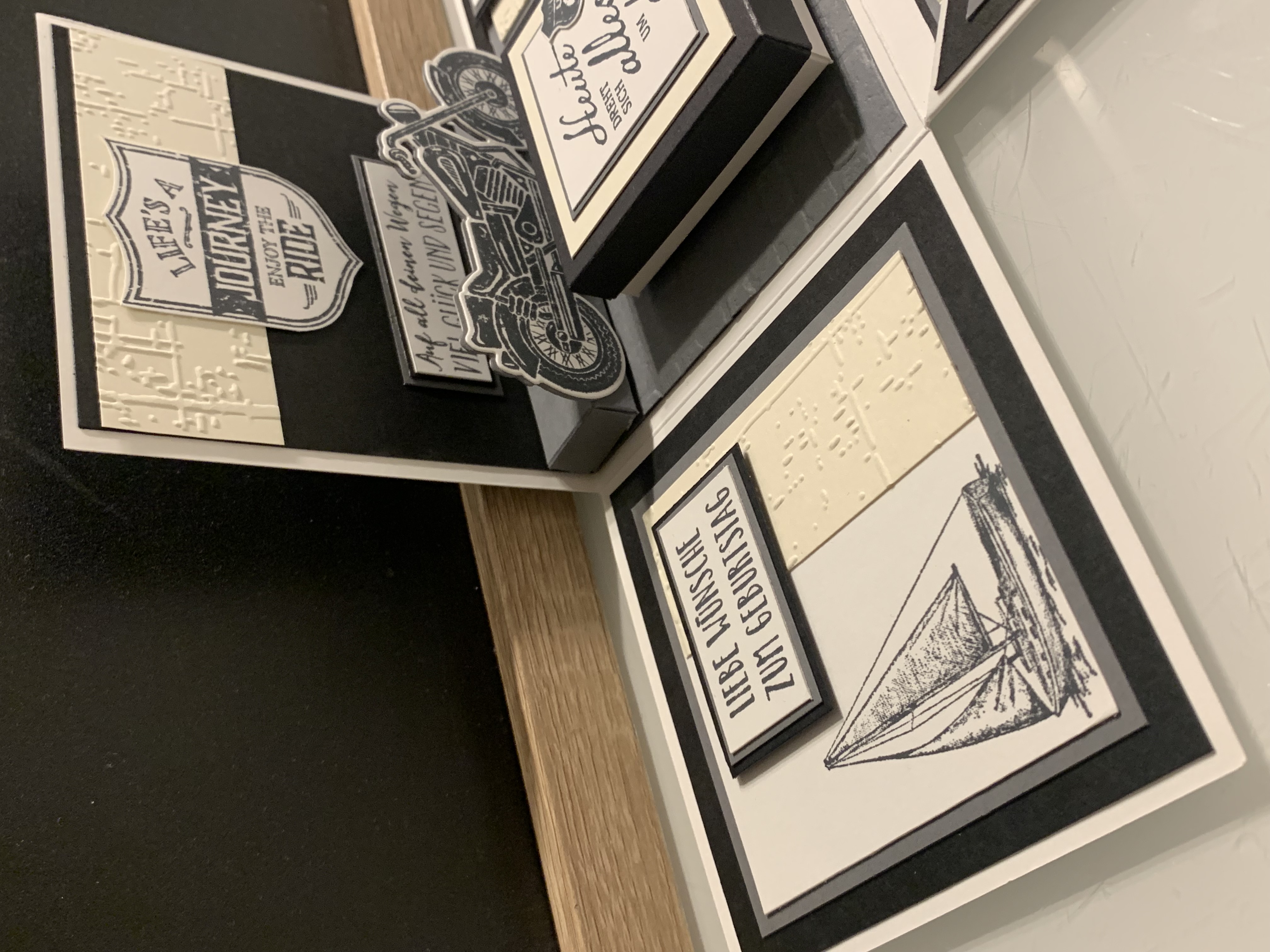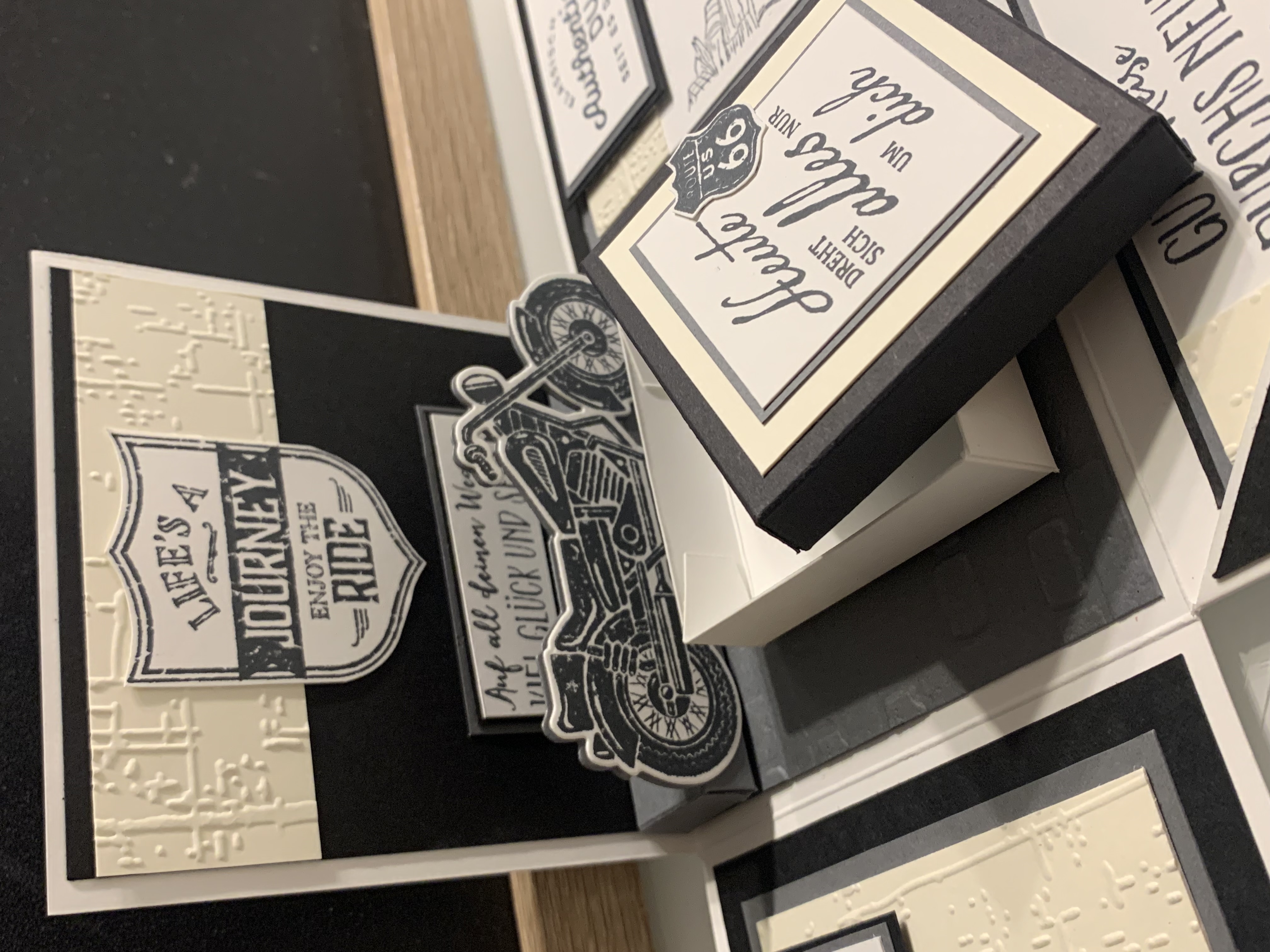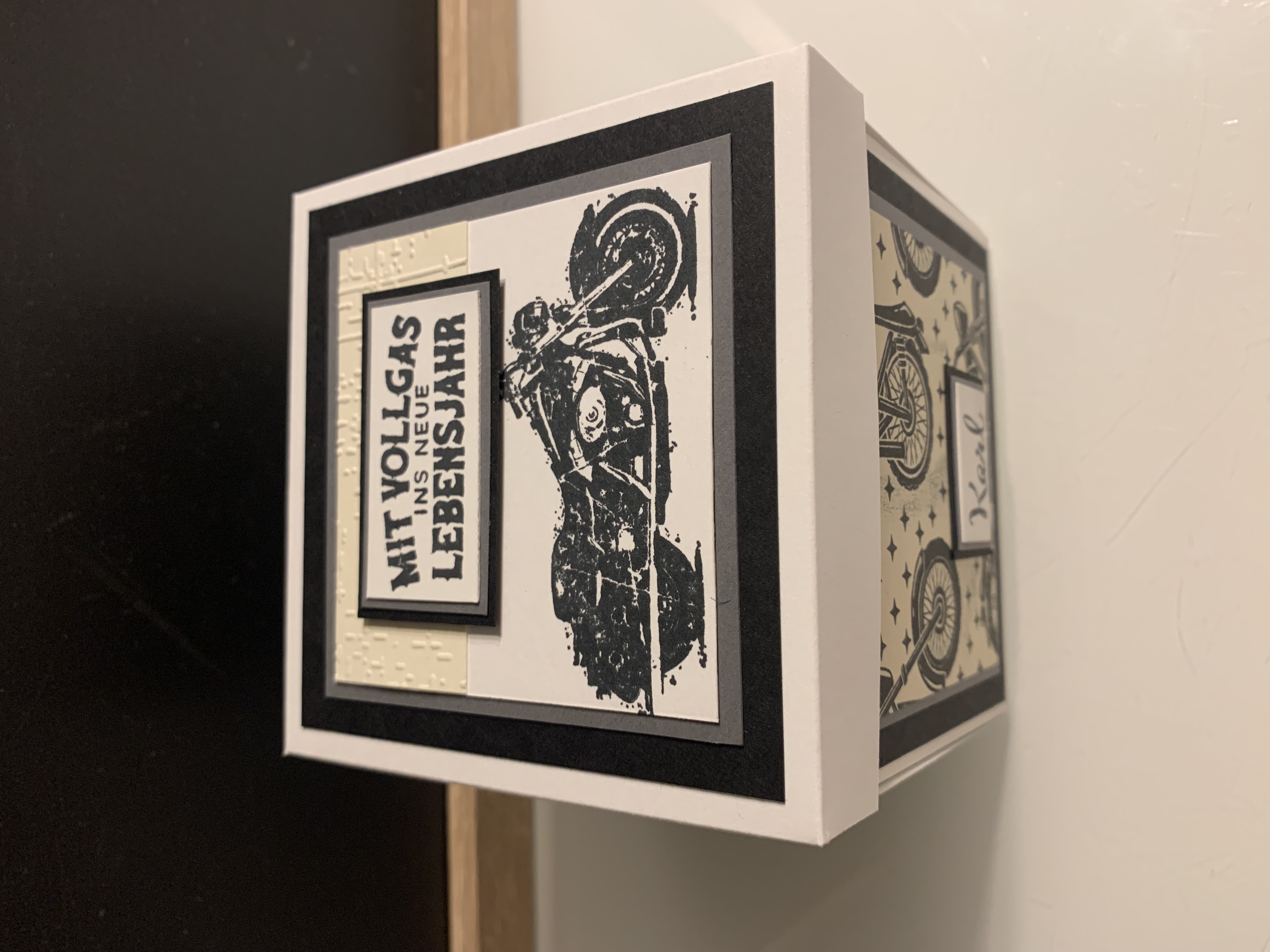 Zu Karls 80. Geburtsag durfte ich diese Explosionsbox herstellen Das Hauptthema der Box war Motorrad/ Harley, wobei auch betont werden sollte, dass er ein Arbeitstier ist und auch das Segeln liebt. Diese beiden Themen habe ich innen an den Seiten angebracht. Farblich habe ich in Schwarz, Grundweiß, Vanille Pur und Anthrazit gearbeitet. Innen befindet sich noch eine kleine Box für das Geldgeschenk. Vielen lieben Dank für die Bestellung und viel Freude beim Verschenken!!