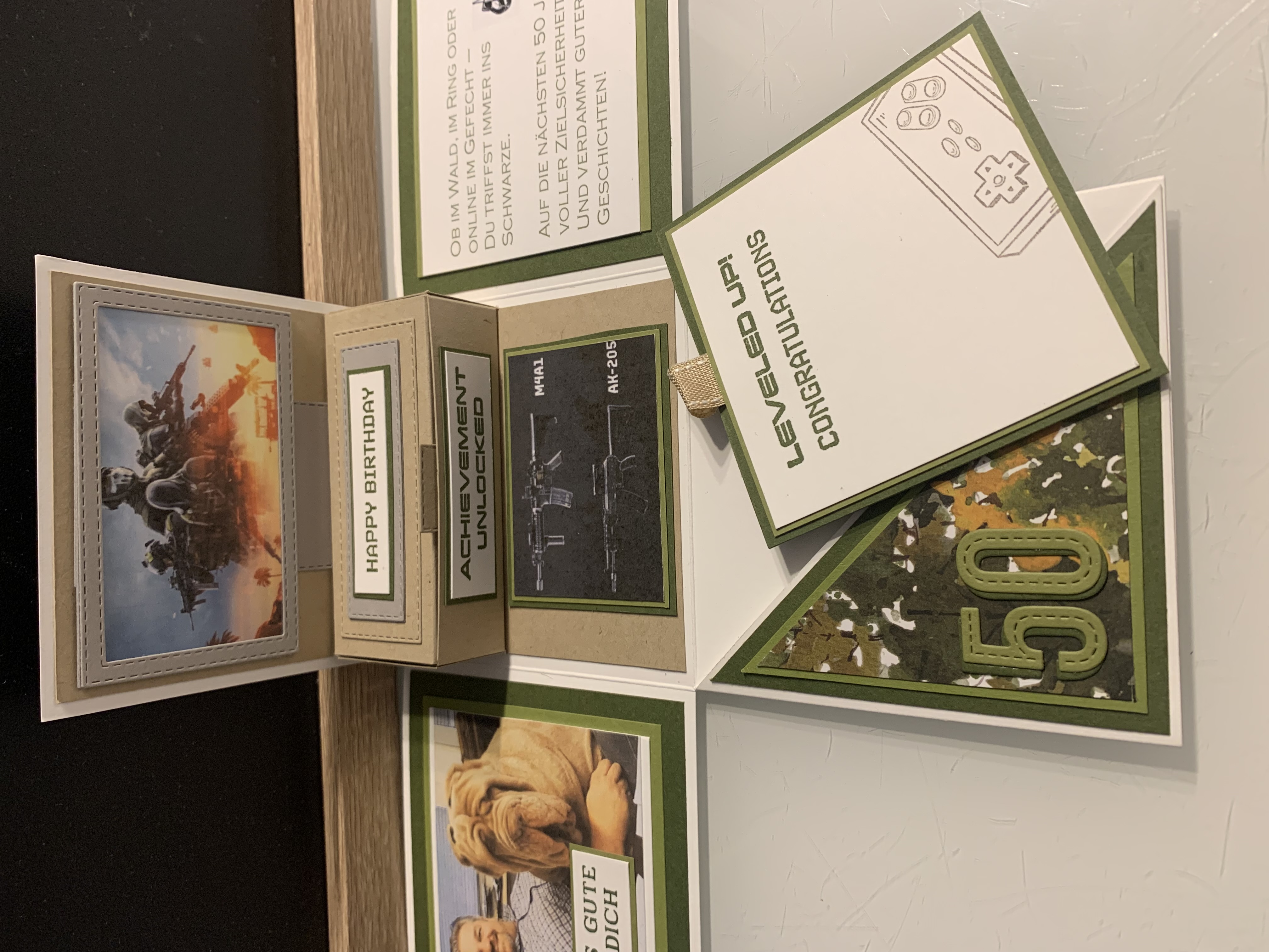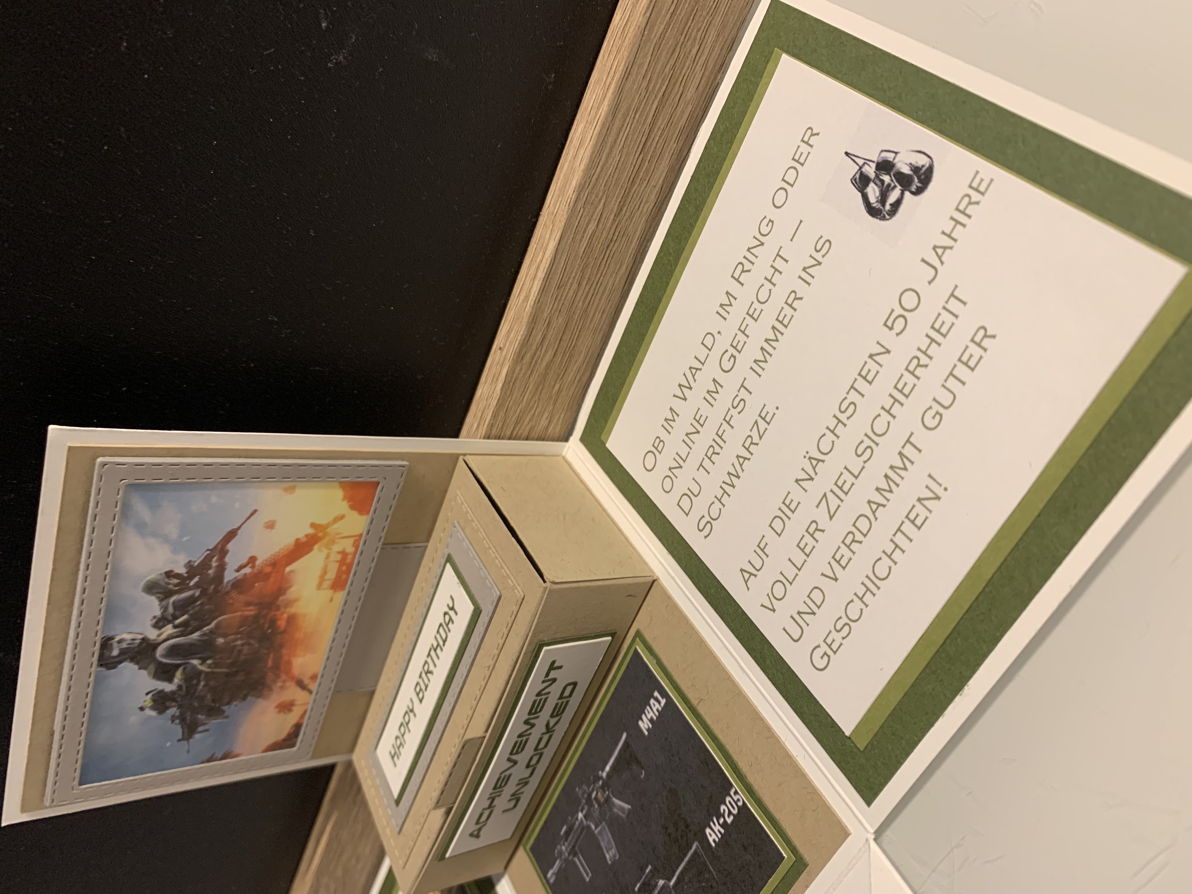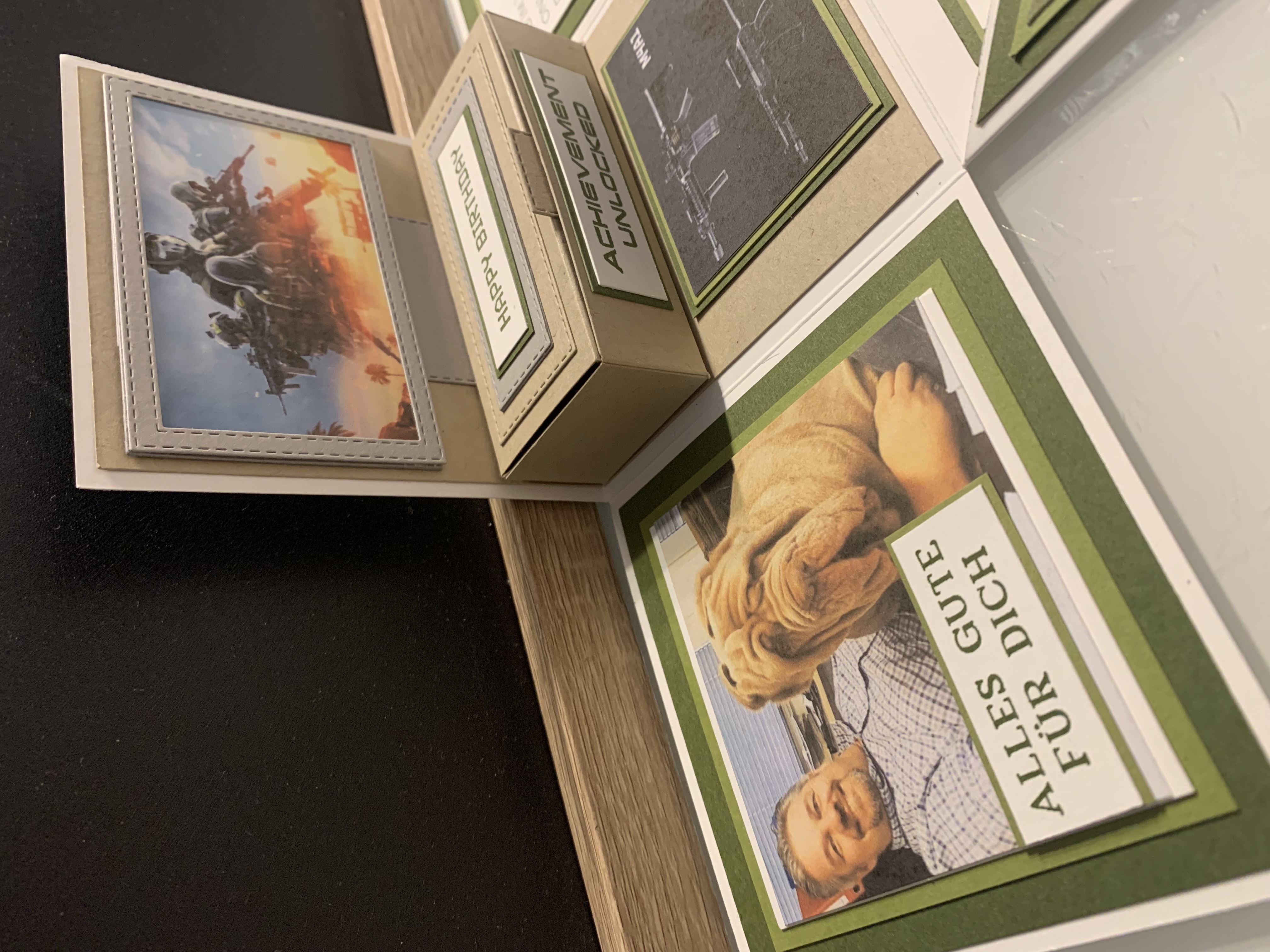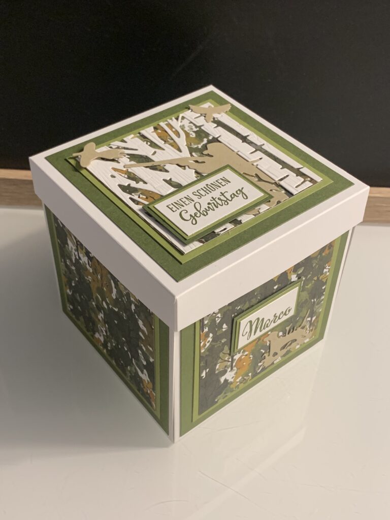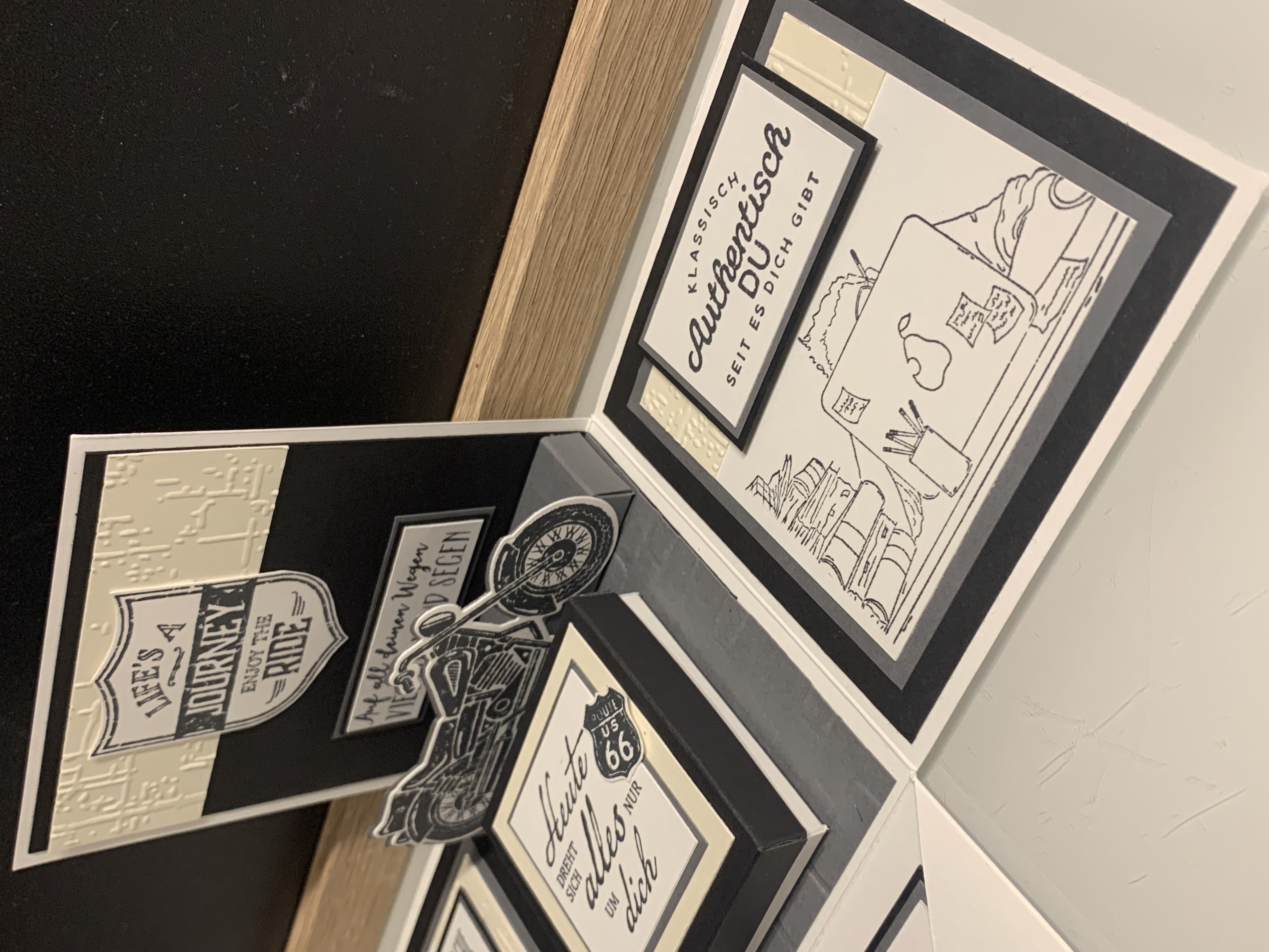 Zu Karls 80. Geburtsag durfte ich diese Explosionsbox herstellen Das Hauptthema der Box war Motorrad/ Harley, wobei auch betont werden sollte, dass er ein Arbeitstier ist und auch das Segeln liebt. Diese beiden Themen habe ich innen an den Seiten angebracht. Farblich habe ich in Schwarz, Grundweiß, Vanille Pur und Anthrazit gearbeitet. Innen befindet sich noch eine kleine Box für das Geldgeschenk. Vielen lieben Dank für die Bestellung und viel Freude beim Verschenken!!