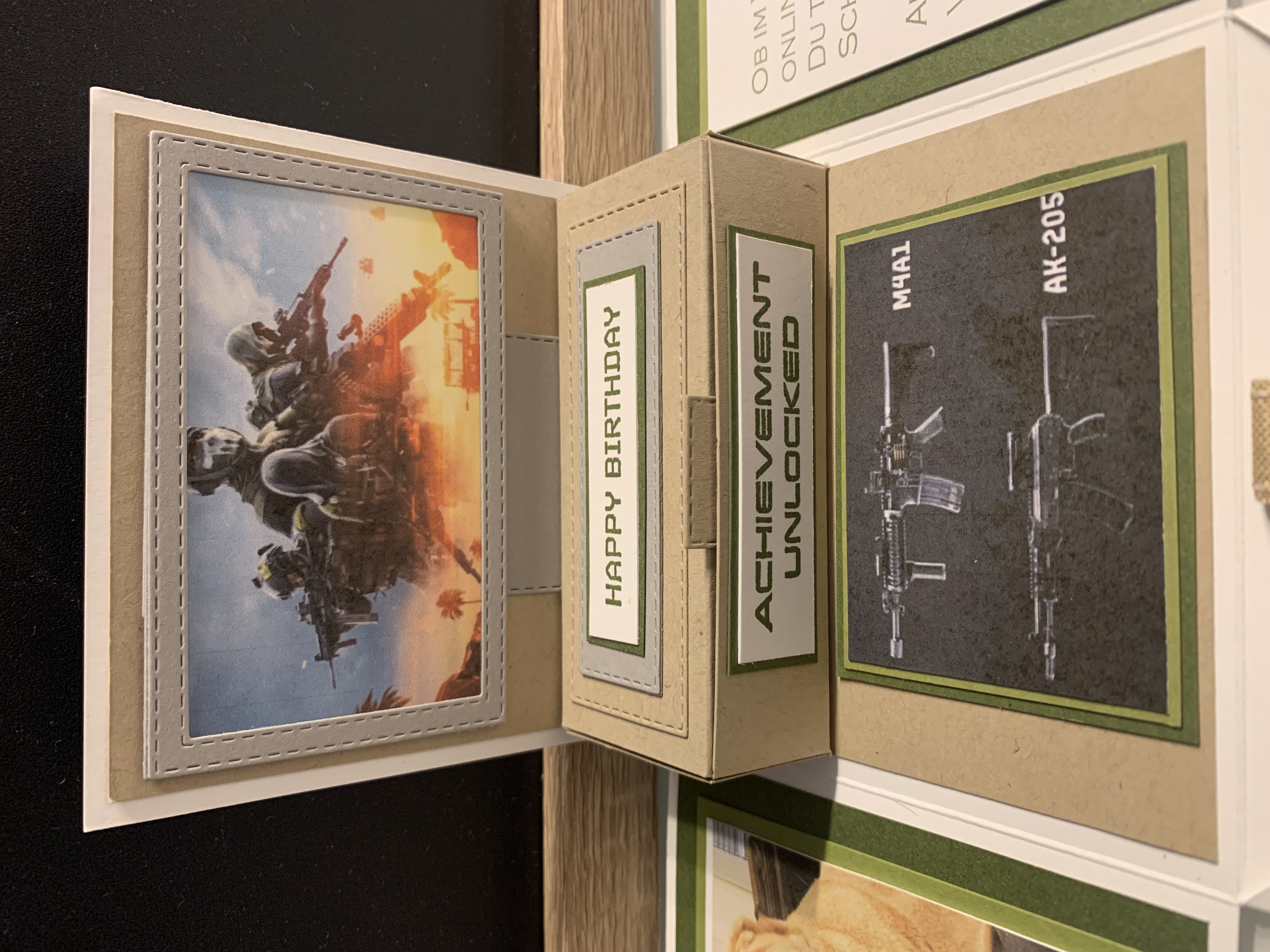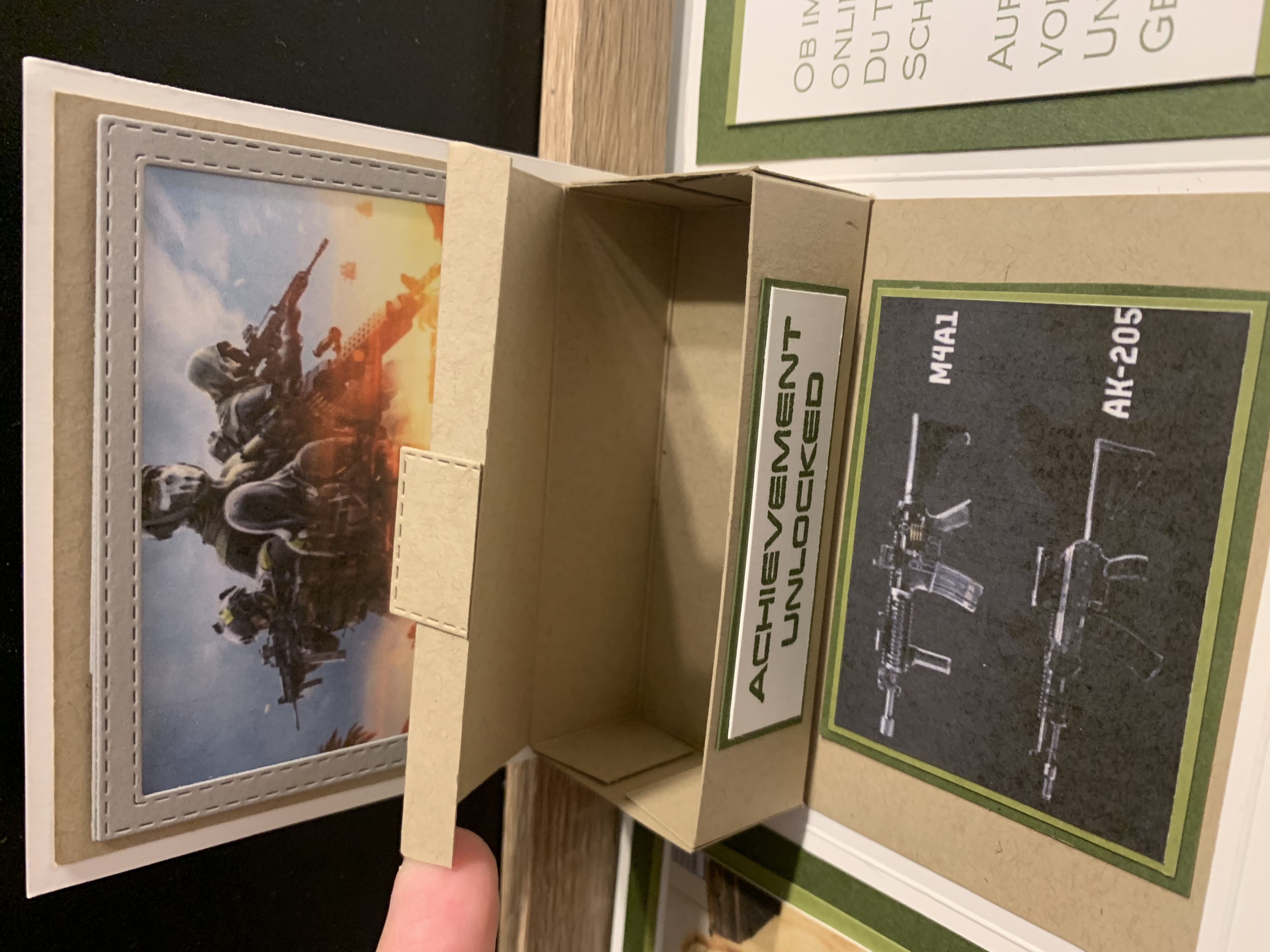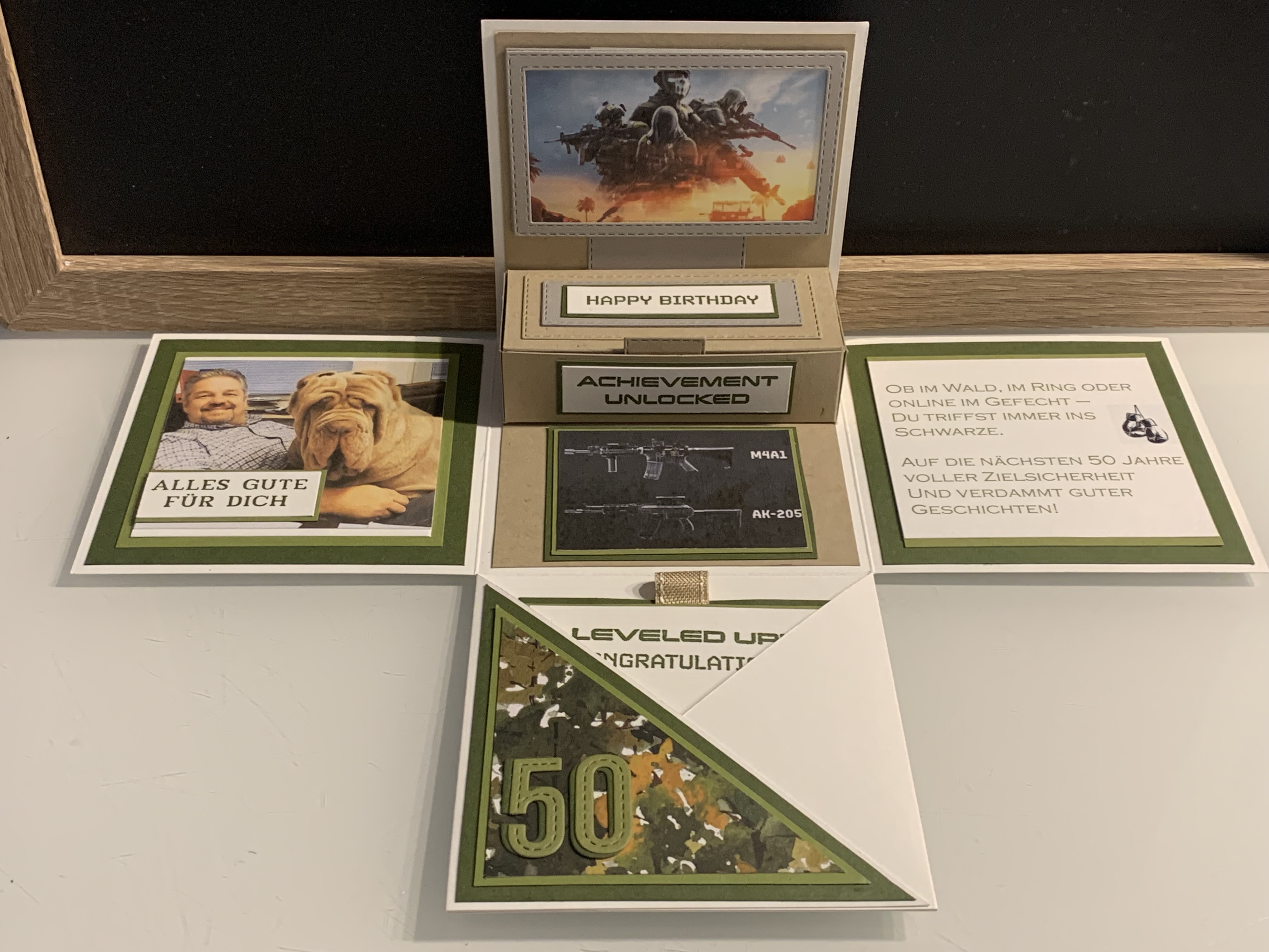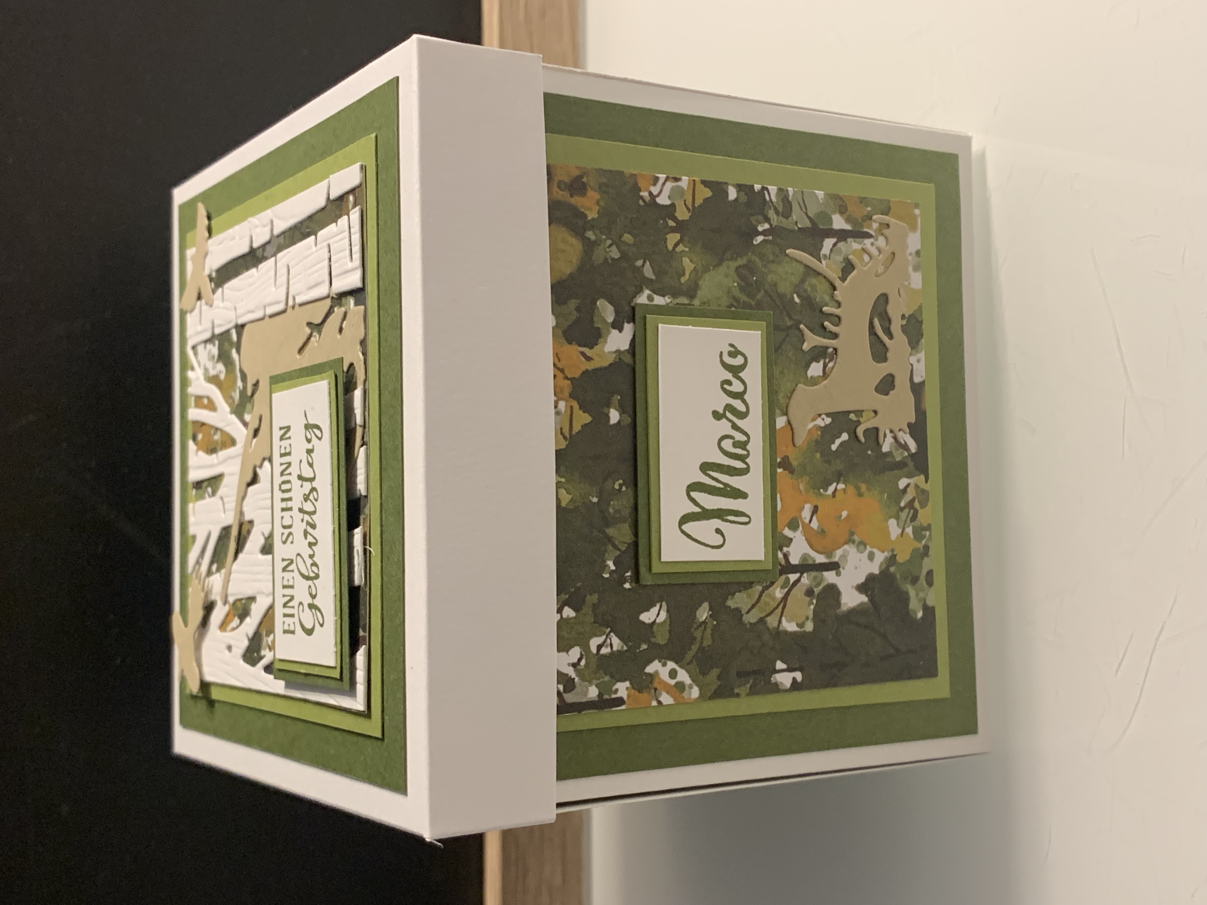 Zu Karls 80. Geburtsag durfte ich diese Explosionsbox herstellen Das Hauptthema der Box war Motorrad/ Harley, wobei auch betont werden sollte, dass er ein Arbeitstier ist und auch das Segeln liebt. Diese beiden Themen habe ich innen an den Seiten angebracht. Farblich habe ich in Schwarz, Grundweiß, Vanille Pur und Anthrazit gearbeitet. Innen befindet sich noch eine kleine Box für das Geldgeschenk. Vielen lieben Dank für die Bestellung und viel Freude beim Verschenken!!