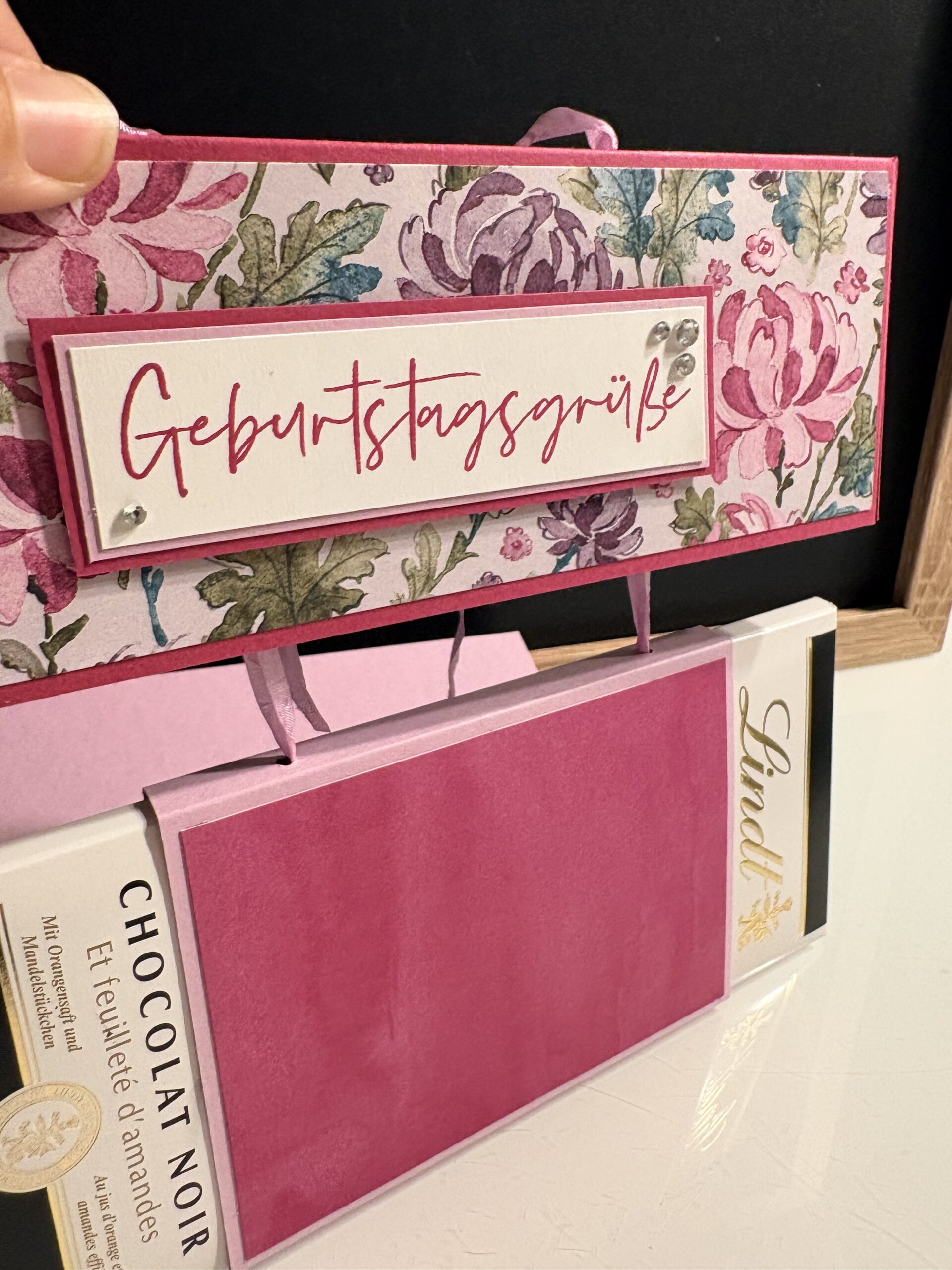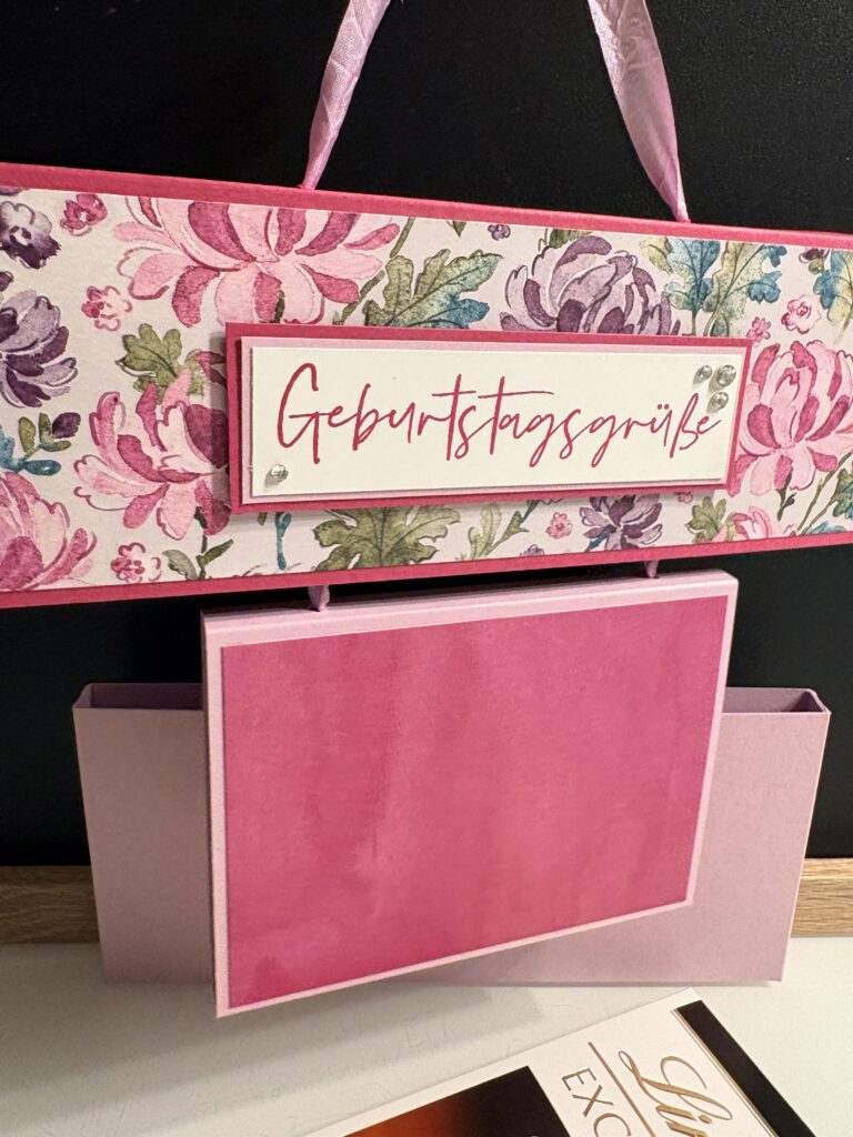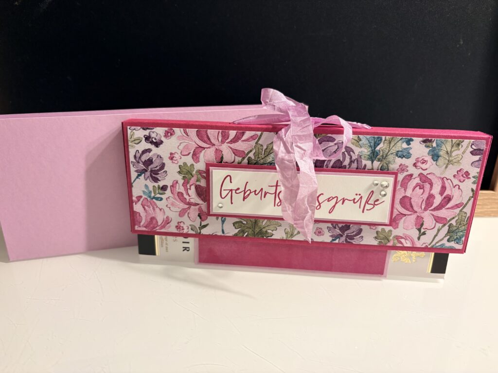 Das 3. und letzte Projekt meines kommenden April Workshops/ Workshops2Go ist diese Geschenkbox mit Hängeelement. Die zu verschenkende Schokoladentafel wird im Deckel verschnürt und sorgt für einen tollen Effekt beim Öffnen der Box. Verwendet habe ich Farbkarton in Sommerbeere und Freesienlila, dazu habe ich das schöne Designerpapier „Bezaubernd Floral“ kombiniert. Das Geschenkband ist auch in Freesienlila gehalten und gestempelt habe ich in Sommerbeere mit dem Stempelset „Wunderbar Gesagt“, das ihr euch bei einer Stampin‘ Up! Bestellung über 90 EUR für nur 6 EUR dazubestellen könnt. Alle angeführten Produkte sind von Stampin‘ Up! und können über meinen Webshop bestellt werden: tatjanabreitfeller.stampinup.net