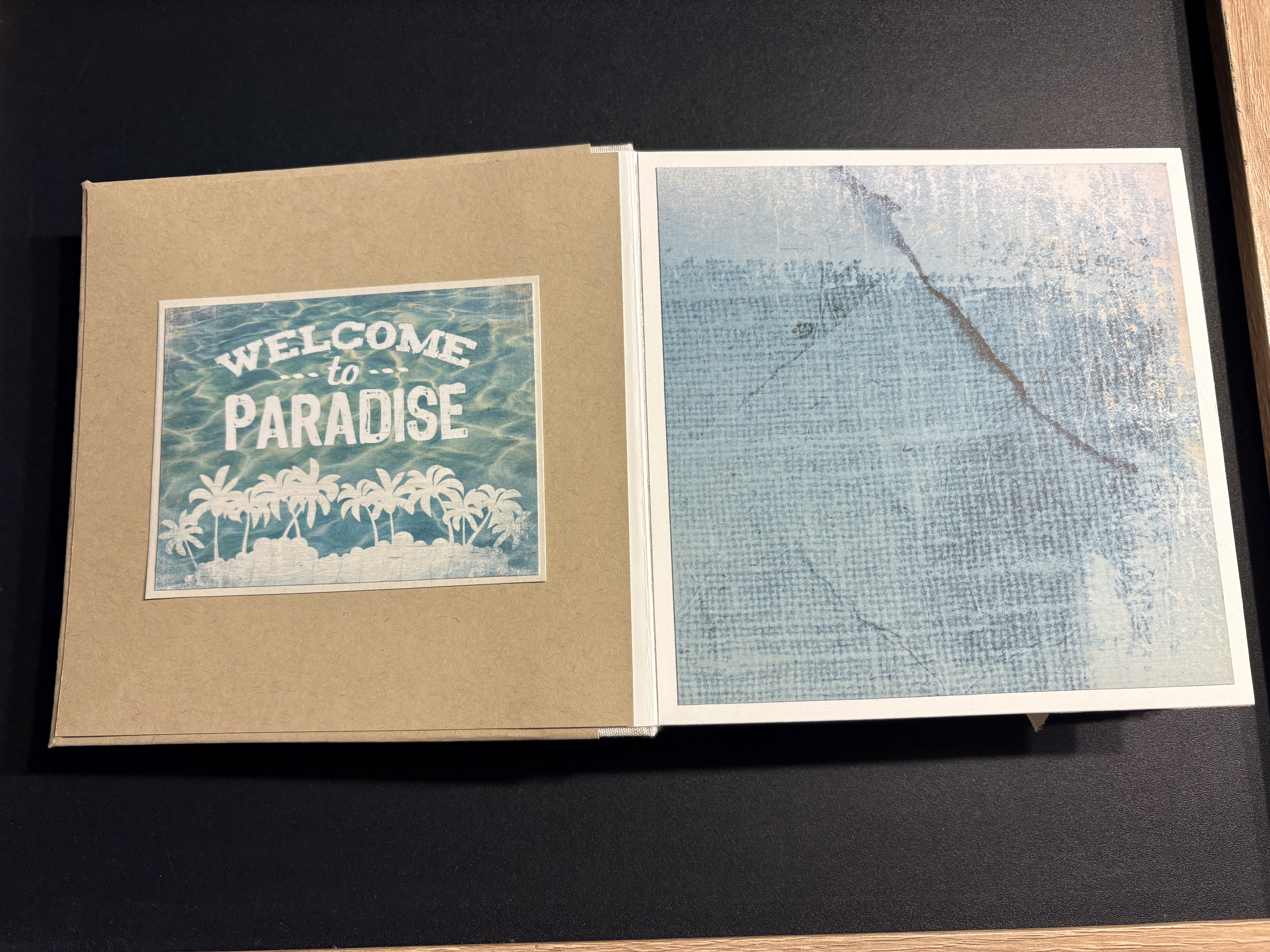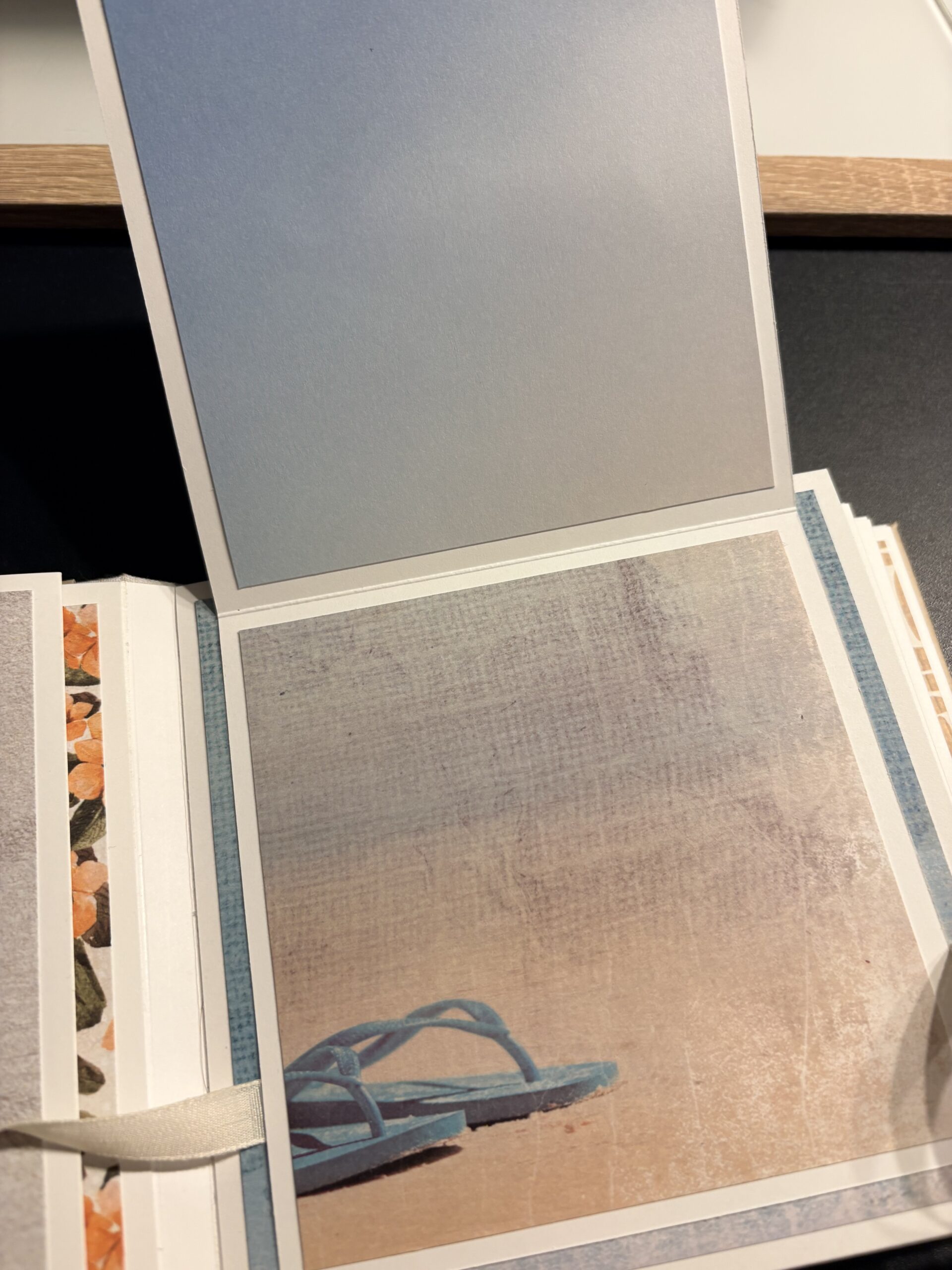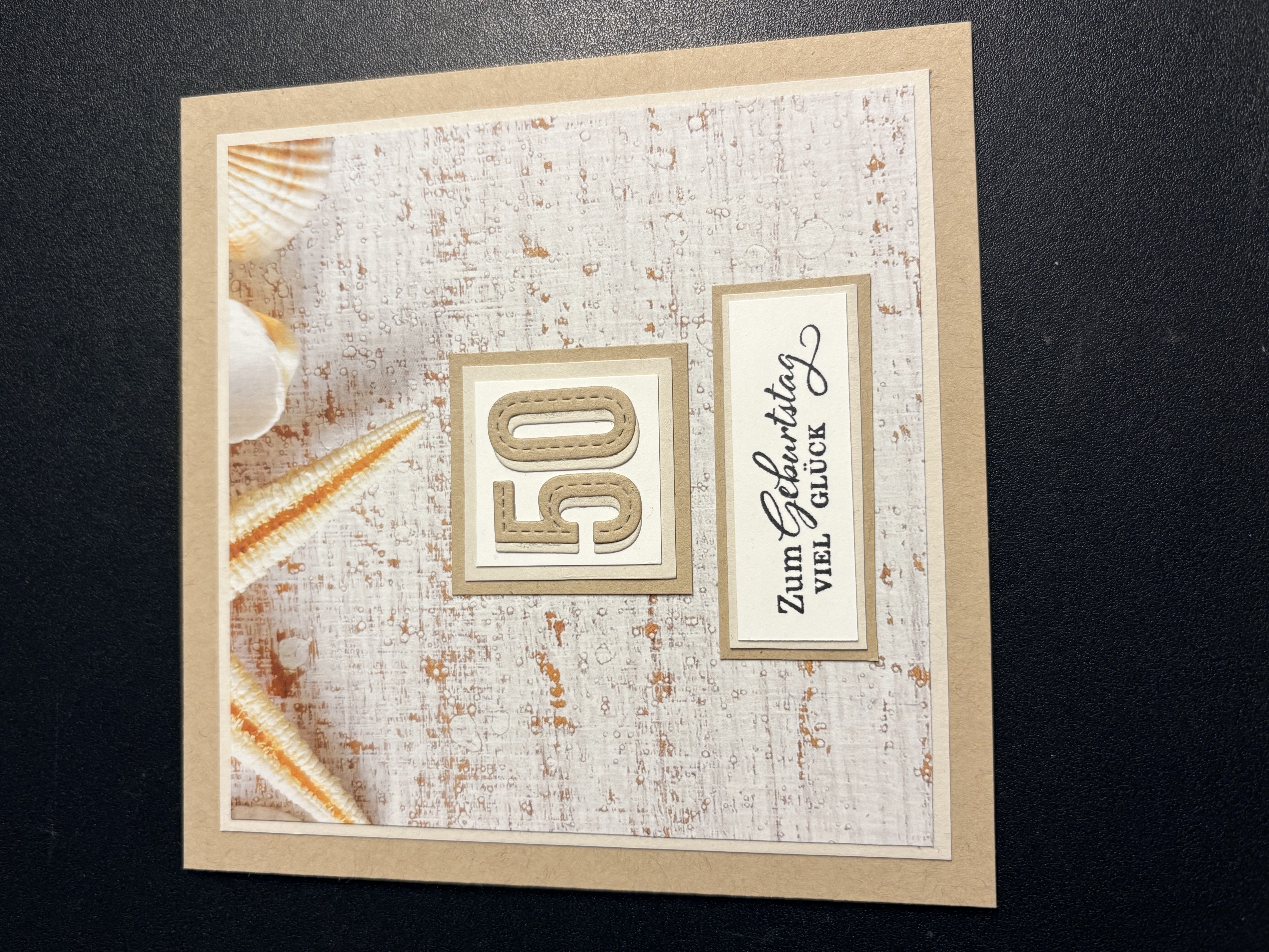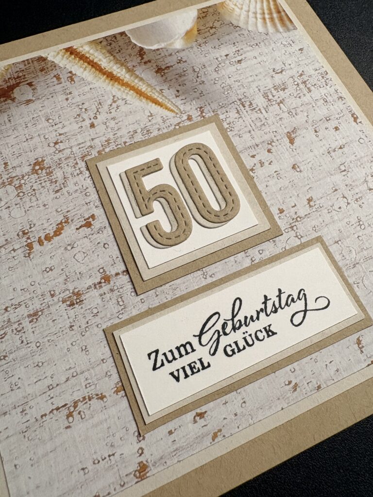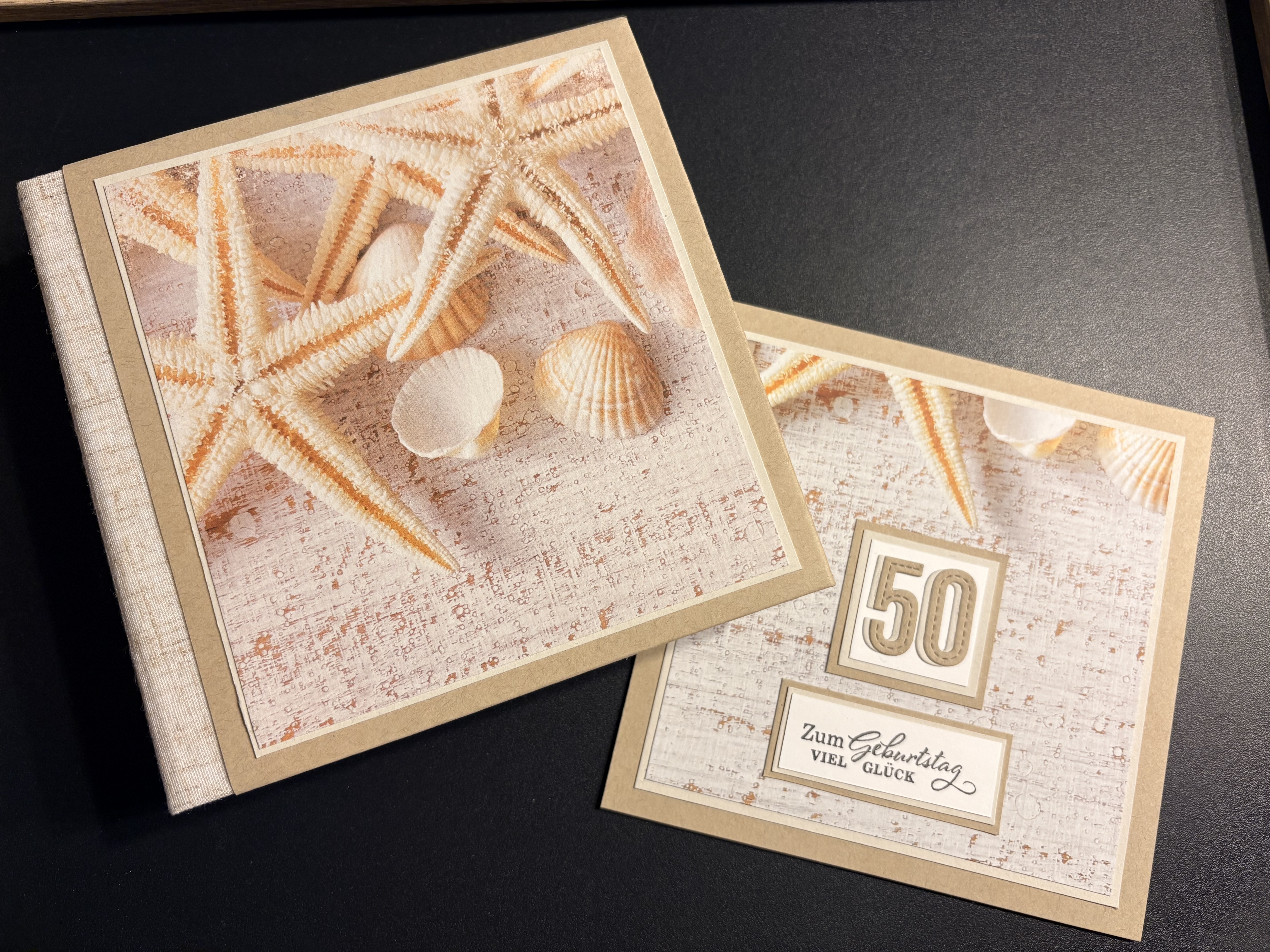 Die Frau eines lieben Kollegen feierte vor kurzem ihren 50. Geburtstag. Auch seiner steht kurz vor der Tür und daher gönnen sie sich heuer einen Urlaub auf den Malediven. Um das Geschenk entsprechend zu überreichen, durfte ich dieses hübsche Minialbum anfertigen samt passender Glückwunschkarte zum runden Geburtstag. Ich habe passend zum Papier in Savanne gearbeitet, außerdem mit Graupappe und Buchbindeleinen. Ich hoffe sie hat sich darüber gefreut und es werden viele unvergessliche Momente Platz darin finden. Vielen Dank für diese schöne Bestellung!