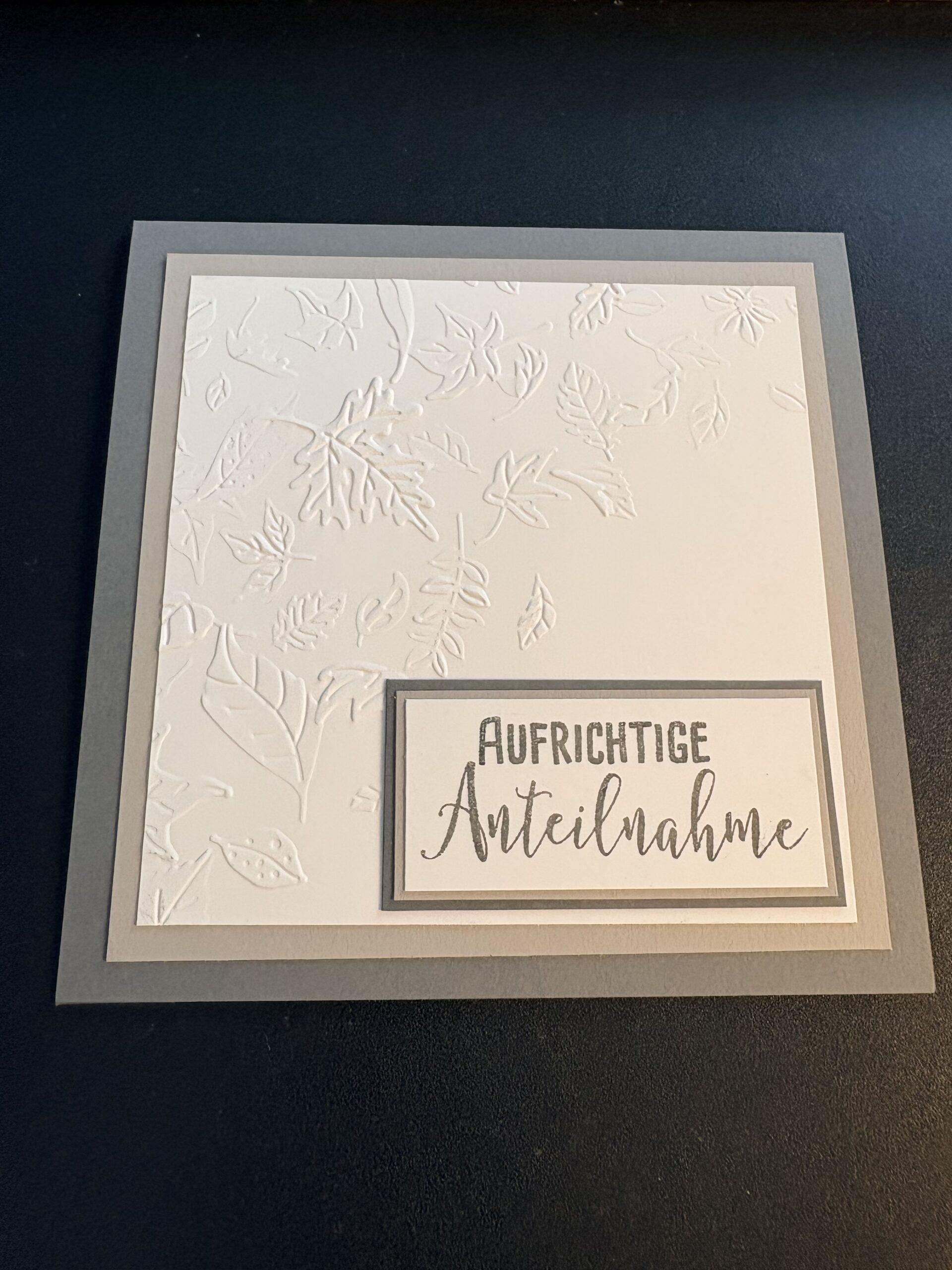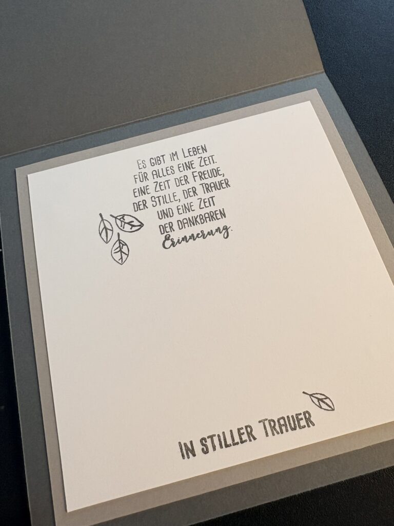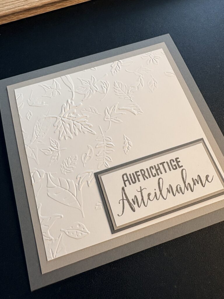 Diese Trauerkarte ist Anfang des Jahres entstanden. Gearbeitet habe ich mit Farbkarton in Kieselgrau, Granit und Grundweiß, letzteren habe ich noch mit einem Prägefolder mit dem Motiv von fallendem Laub geprägt. Manchmal gibt es leider auch traurige Anlässe für die schöne Karten benötigt werden.