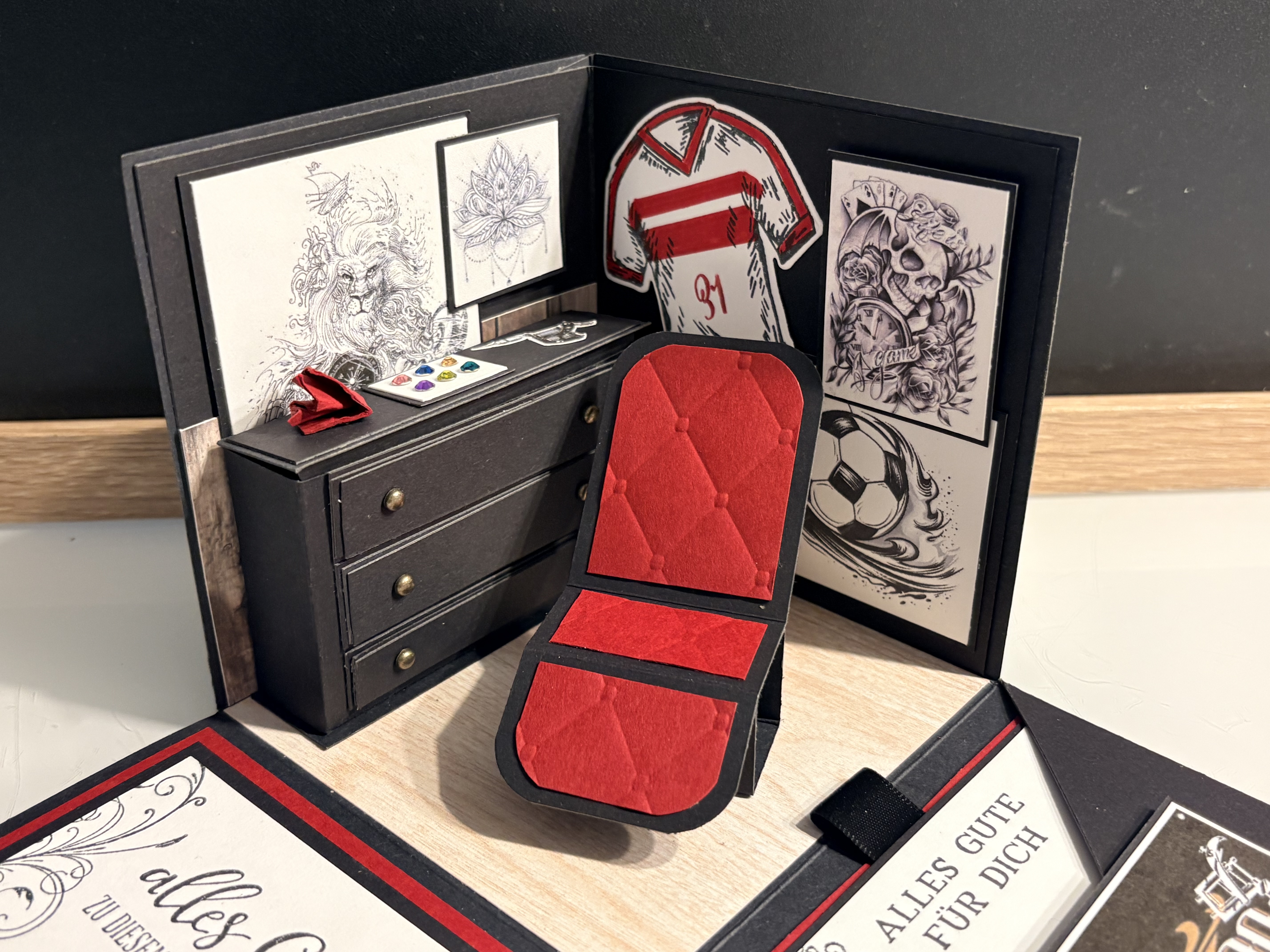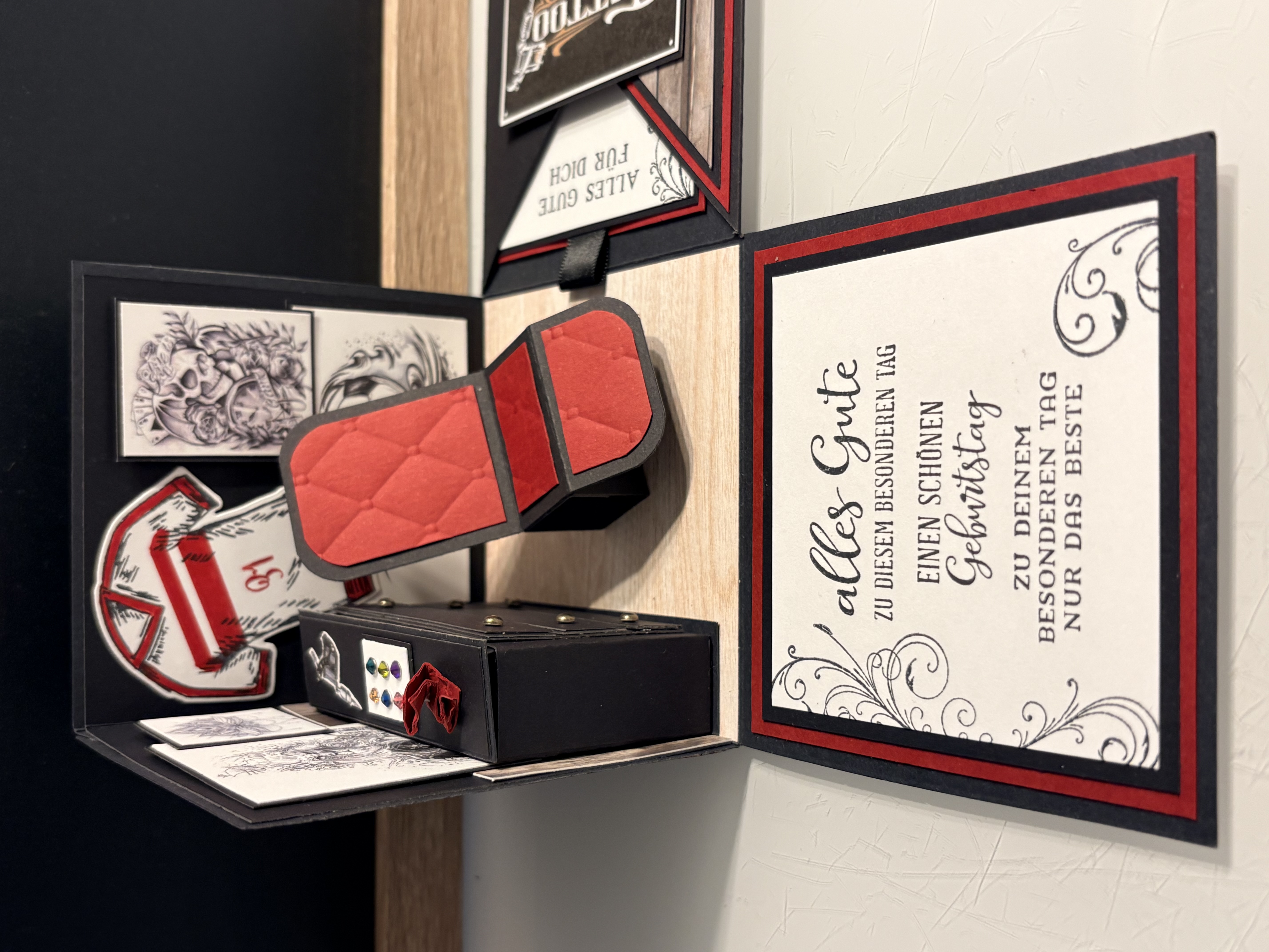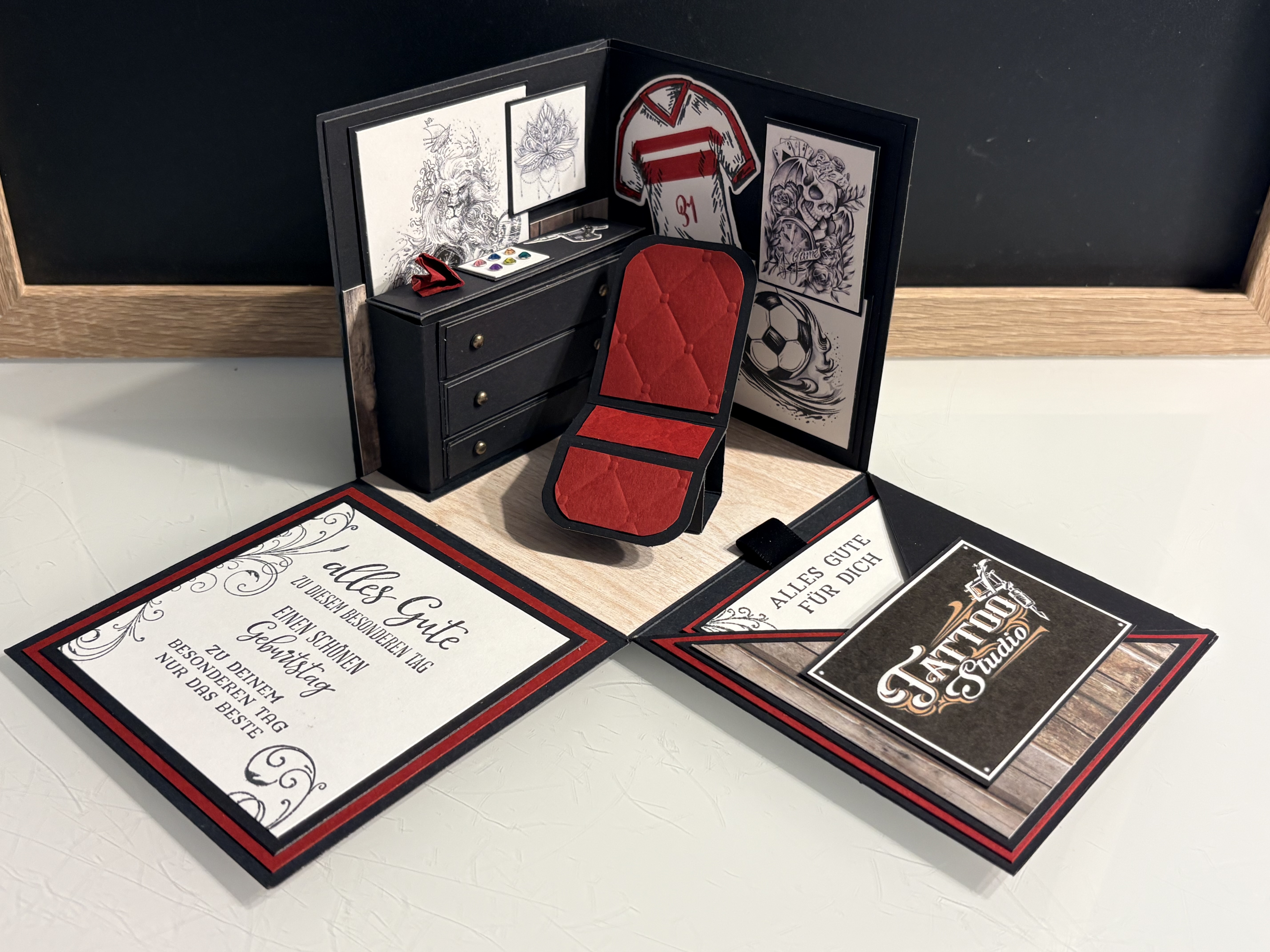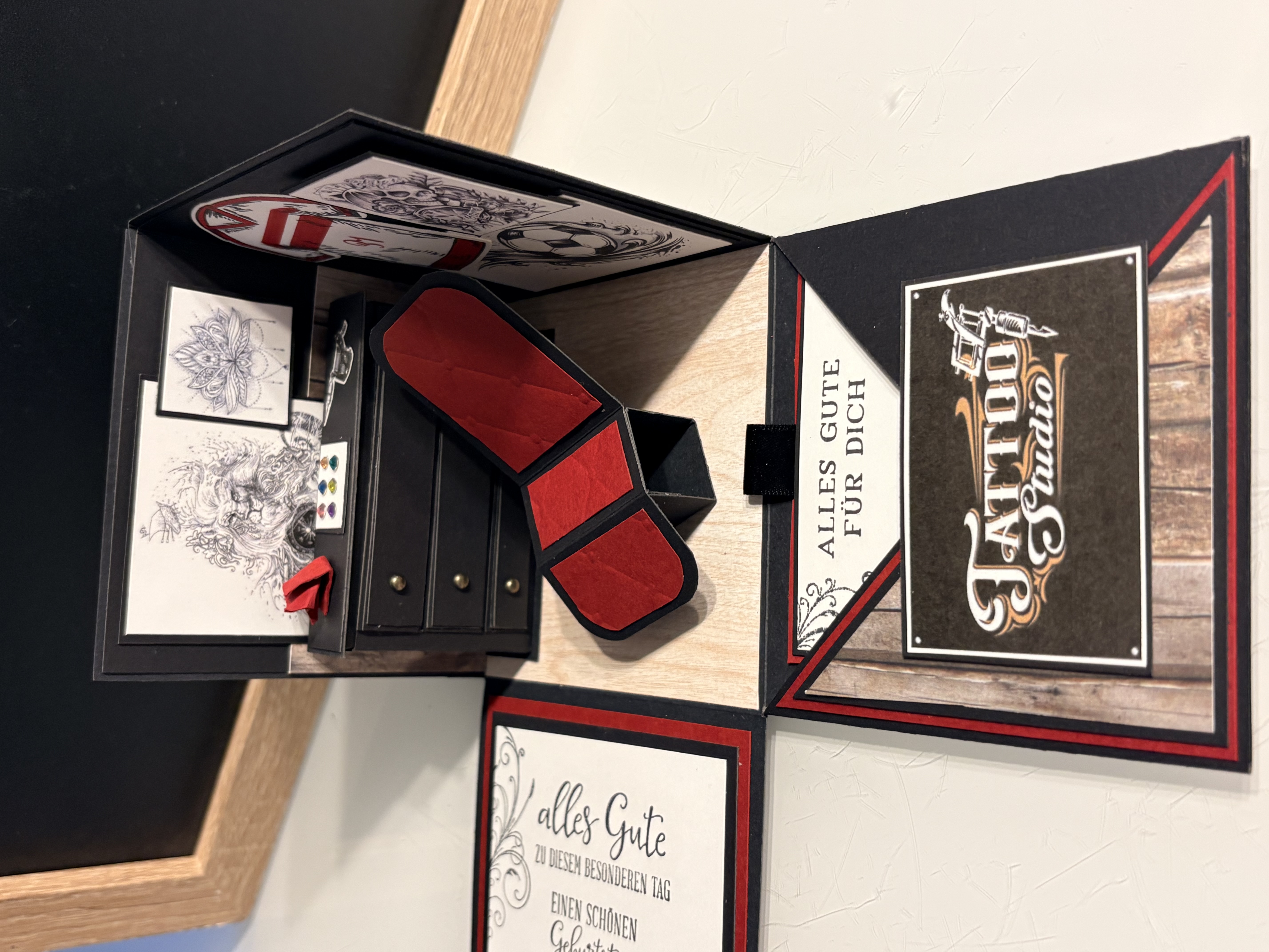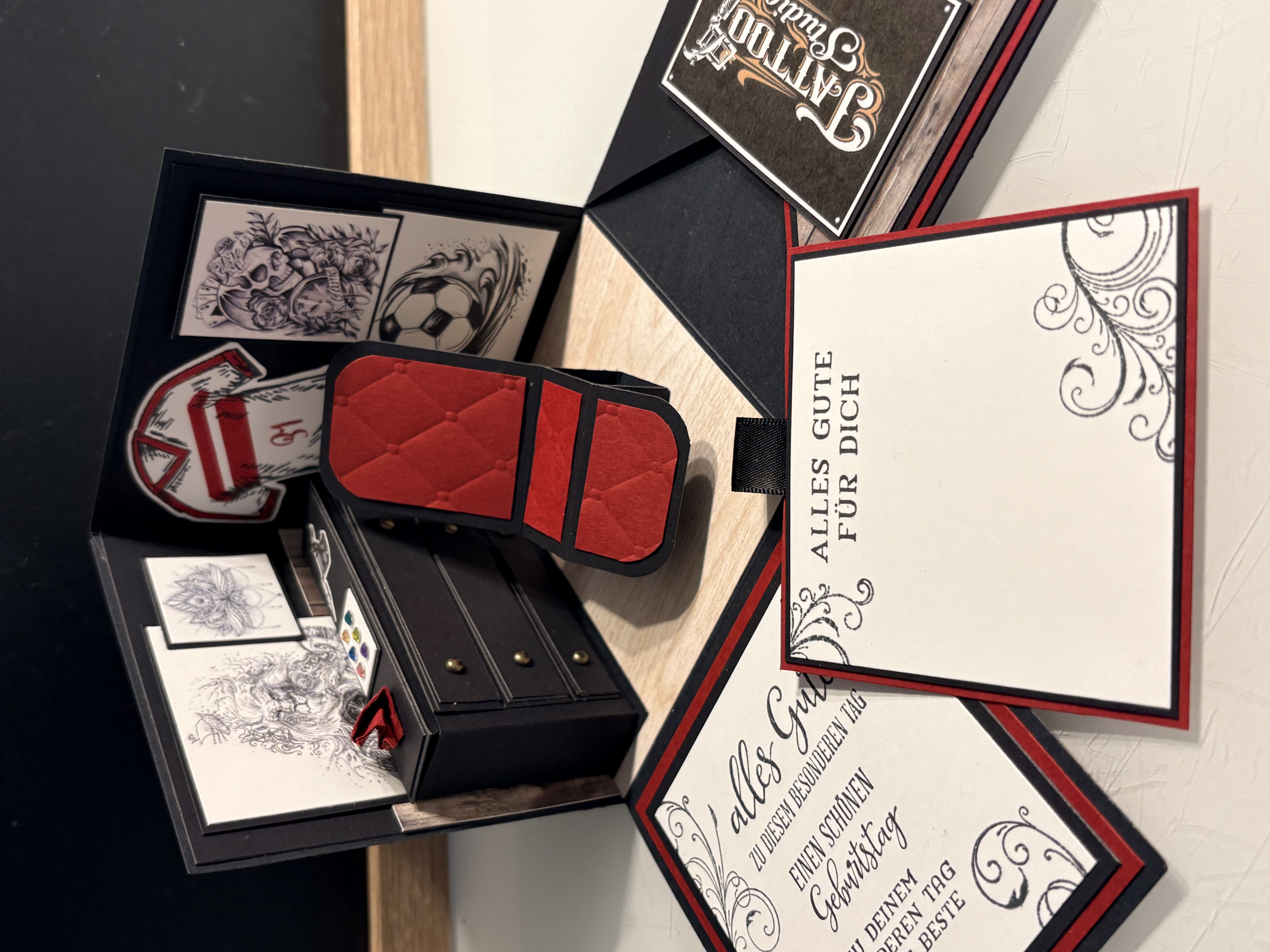 Für eine liebe Arbeitskollegin, die nebenbei auch in einem Fitnessstudio tätig war, durfte ich diese besondere Explosionsbox anfertigen. Aufgrund des Ruhestands von Chef Martin, wurde das Studio geschlossen und als Dankeschön für die tolle Zeit haben die Kolleg:innen ein persönliches Geldgeschenk gesucht. Ich habe hier in den Farben des Studios gearbeitet und die Kombi Grundweiß, Kürbisgelb undPazifikblau verwendet. Die Außenseiten sind mit dem Prägefolder „Strukturputz“ dezent geprägt. Innen gibt es einen Studiohintergrund und eine selbstgemachte Hantelbank. Ich bedanke mich für die Bestellung und hoffe die Überraschungsbox hat dem Beschenkten Freude bereitet.