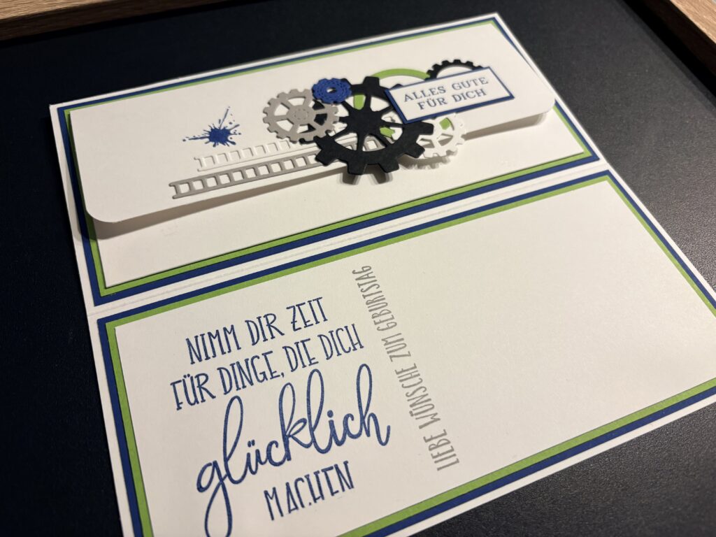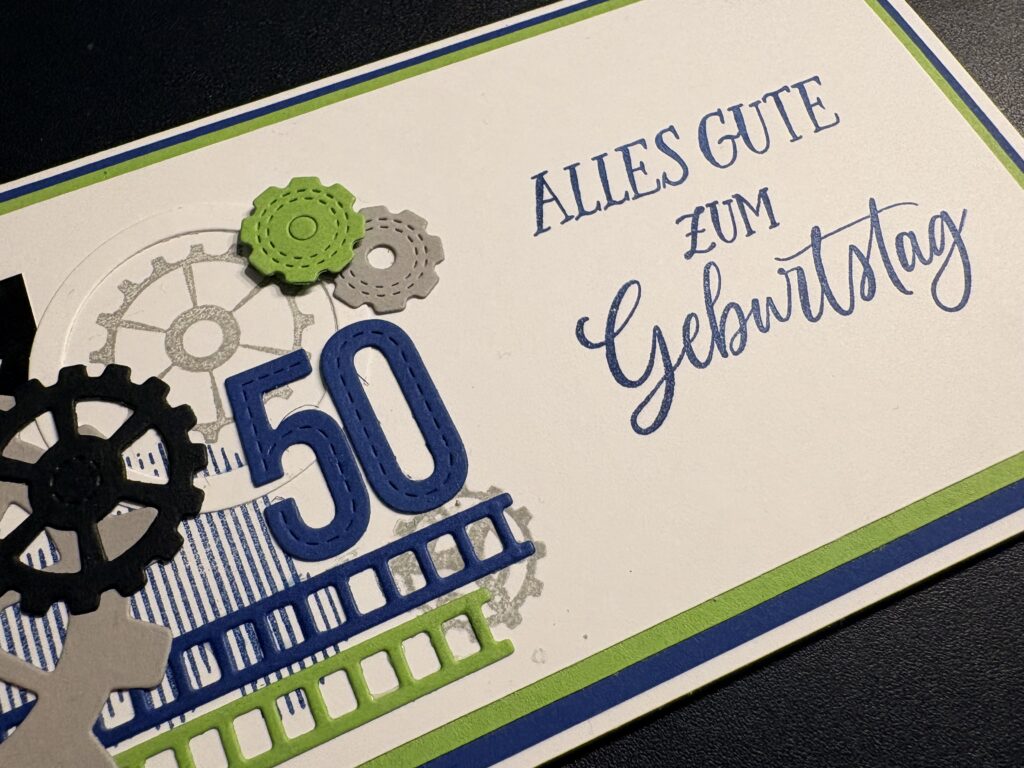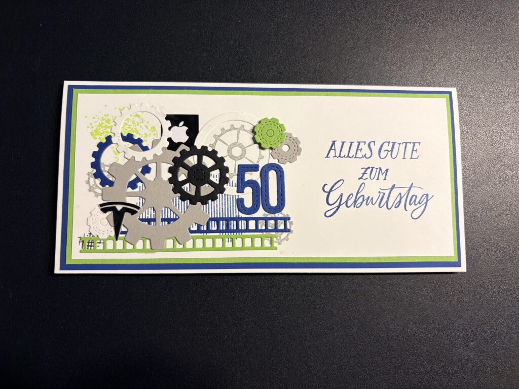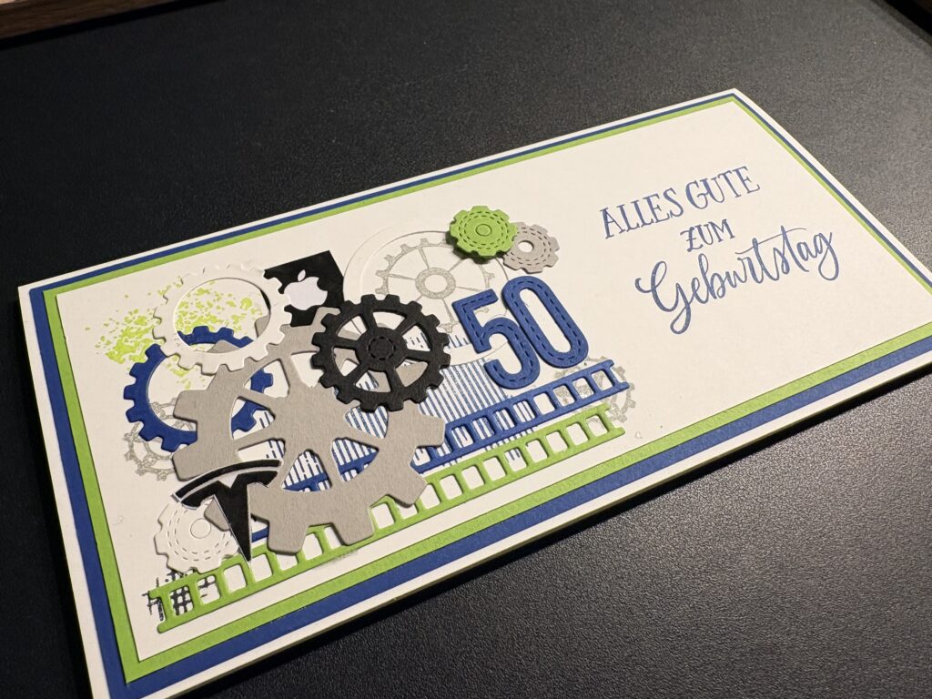 Eine liebe Kollegin hat diese Glückwunschkarte zum 50. Geburtstag eines Freundes bei mir bestellt. Männerkarten sind ja oft nicht ganz so einfach, aber nachdem er sehr technik-affin ist, wusste ich gleich, dass ich mir dem Stampin‘ Up! Produktpaket „Gears & Textures“ arbeiten möchte. Dazu habe ich mit den Farben Blaubeere, Grüner Apfel, Granit, Schwarz und Grundweiß gearbeitet. Innen befindet sich noch ein Kuvert für das Geldgeschenk. Liebe Sabine, danke dir für die Bestellung, ich hoffe Markus hat sich darüber gefreut!