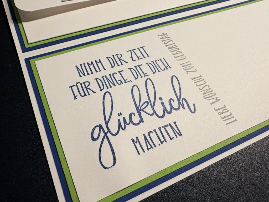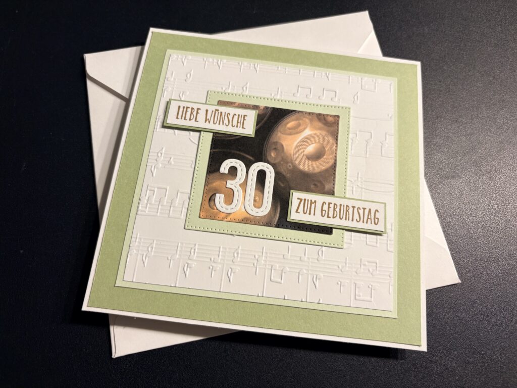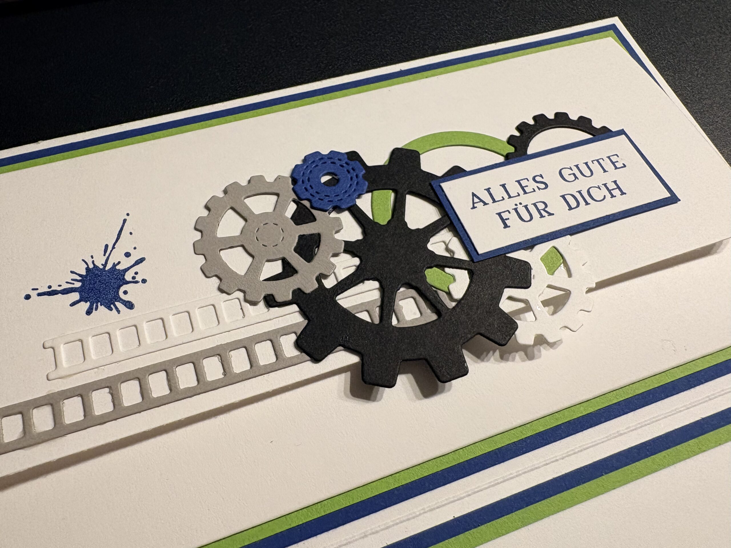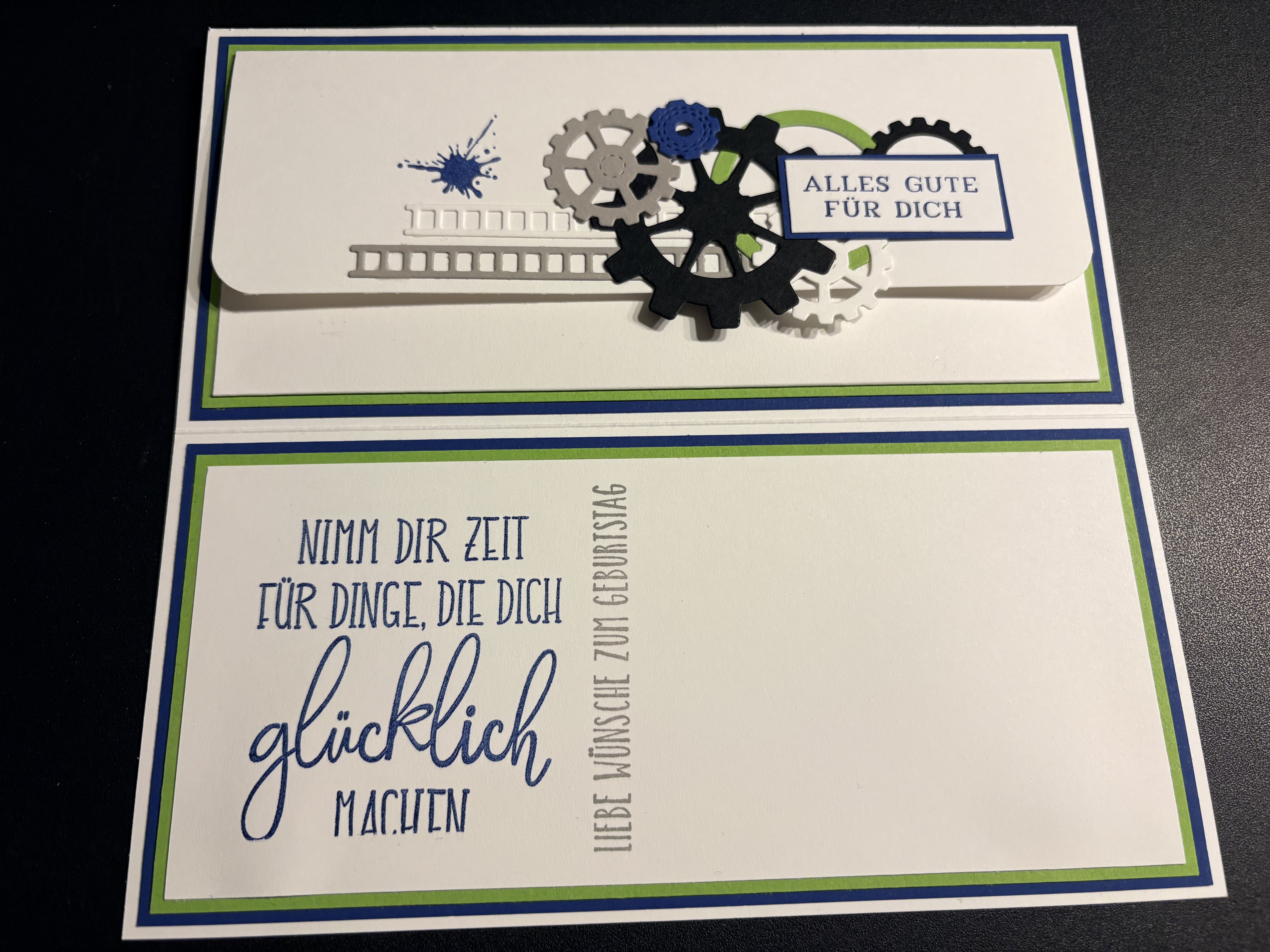 Eine liebe Kollegin hat diese Glückwunschkarte zum 50. Geburtstag eines Freundes bei mir bestellt. Männerkarten sind ja oft nicht ganz so einfach, aber nachdem er sehr technik-affin ist, wusste ich gleich, dass ich mir dem Stampin‘ Up! Produktpaket „Gears & Textures“ arbeiten möchte. Dazu habe ich mit den Farben Blaubeere, Grüner Apfel, Granit, Schwarz und Grundweiß gearbeitet. Innen befindet sich noch ein Kuvert für das Geldgeschenk. Liebe Sabine, danke dir für die Bestellung, ich hoffe Markus hat sich darüber gefreut!