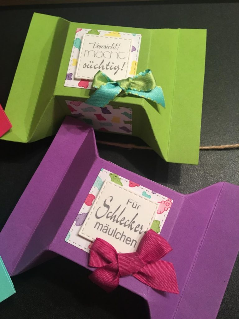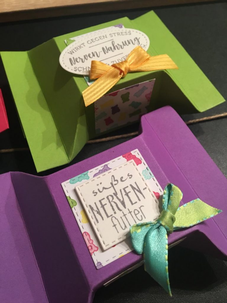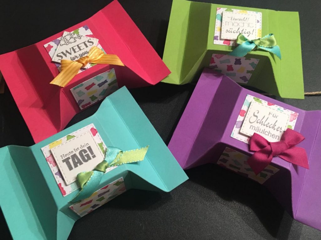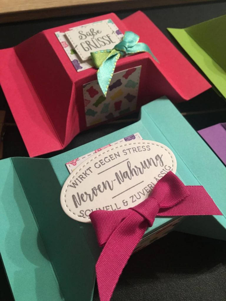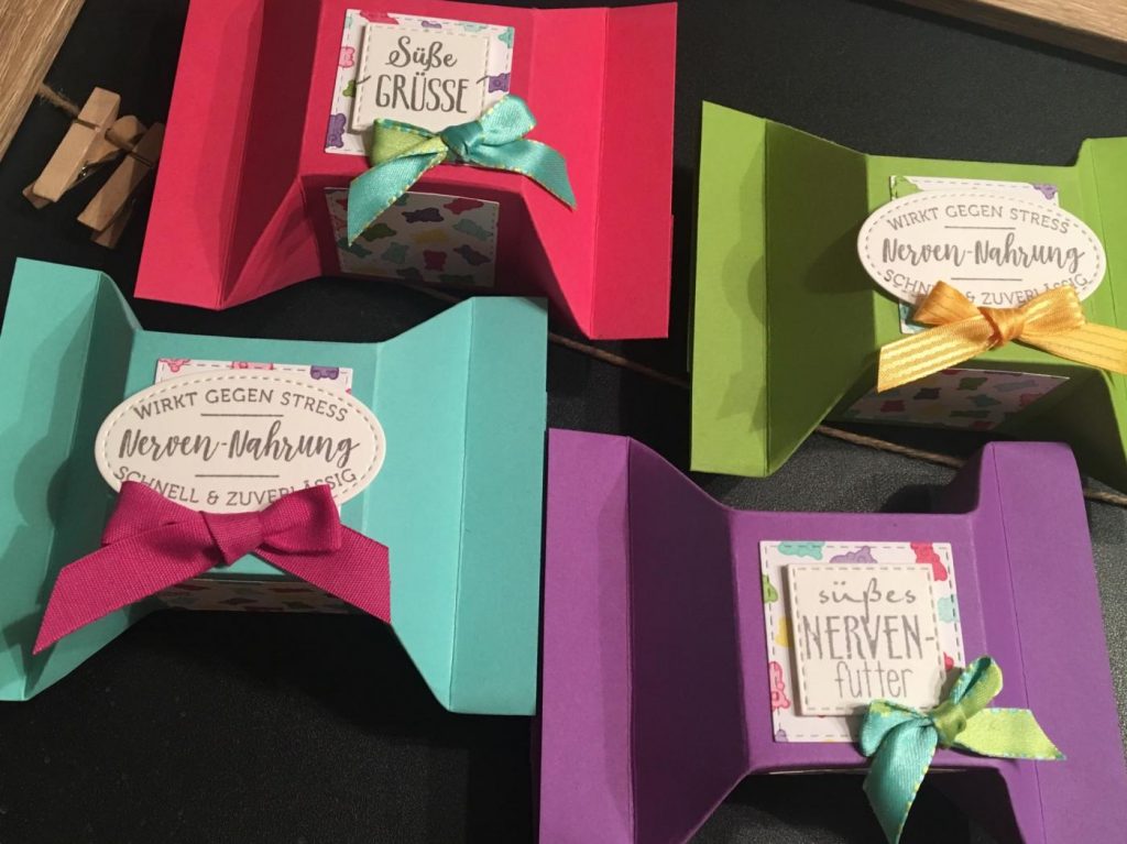Heute wird es mal total bunt. Für mein Mietfach bei GRABi in Wr.Neustadt habe ich Nachschub gewerkelt und unter anderem sind diese farbenfrohe Bonbon Boxen entstanden. Diese sind süß mit Gummizeugs befüllt und auch auf der Verpackung spiegelt sich das Thema mit dem Designerpapier „Süße Überraschung“ von Stampin‘ Up! wider! Ich finde es wirklich super entzückend!