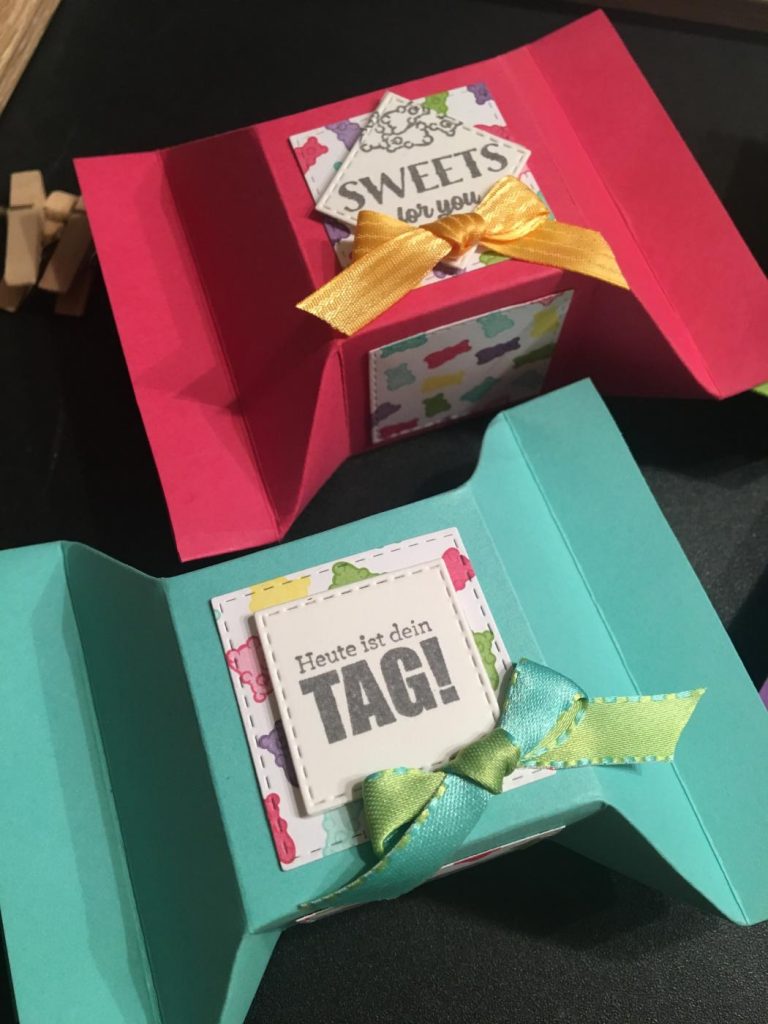 Today is really colourful. I made several of these Bonbon boxes and filled them with gum sweets. The Stampin‘ Up! Designer Paper Series „How Sweet it is“matches this topic perfectly. Isn‘t it cute?!
