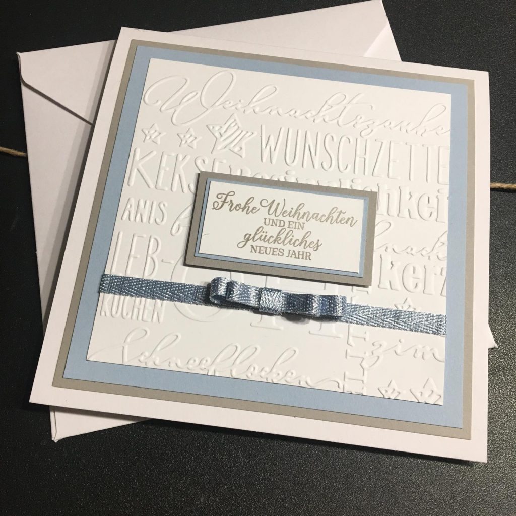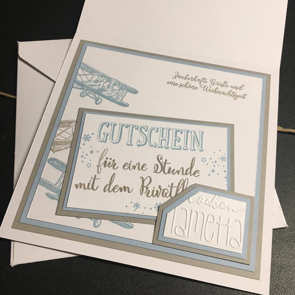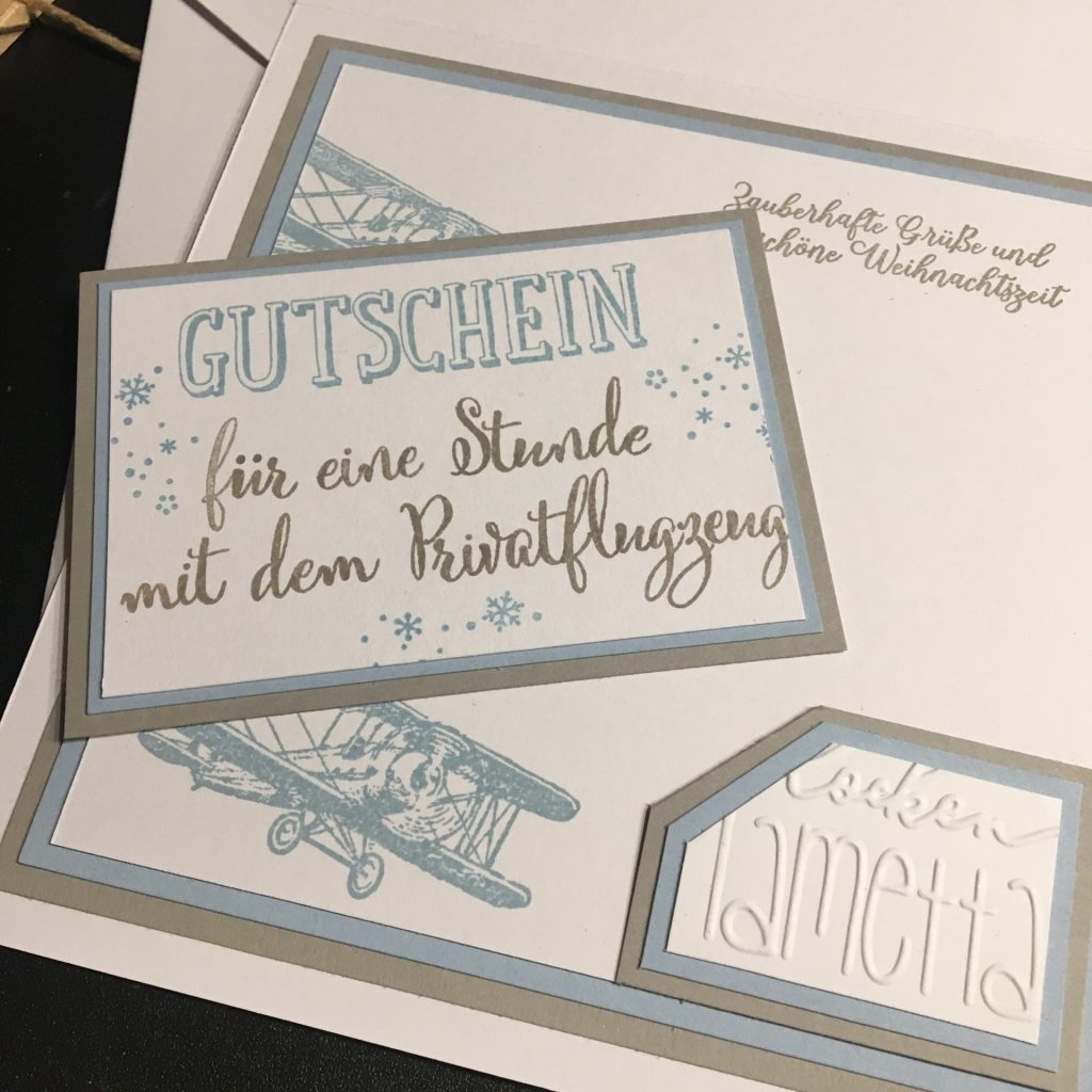 Eine letzte Weihnachtskarte möchte ich euch heuer noch zeigen. Und zwar wurde ein Sohn mit einem Gutschein beschenkt für eine Stunde mit einem Privatflugzeug. Gearbeitet habe ich mit Flüsterweiß, Rauchblau und Granit! Ich hoffe der junge Mann hat sich über dieses wirklich tolle Geschenk gefreut!