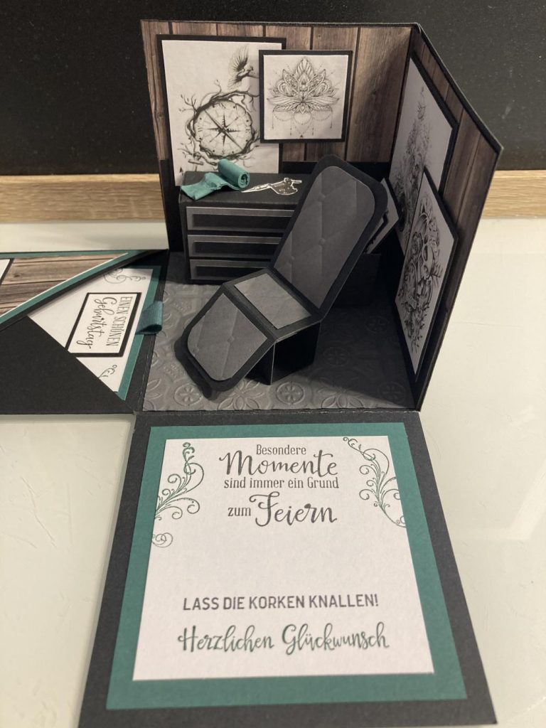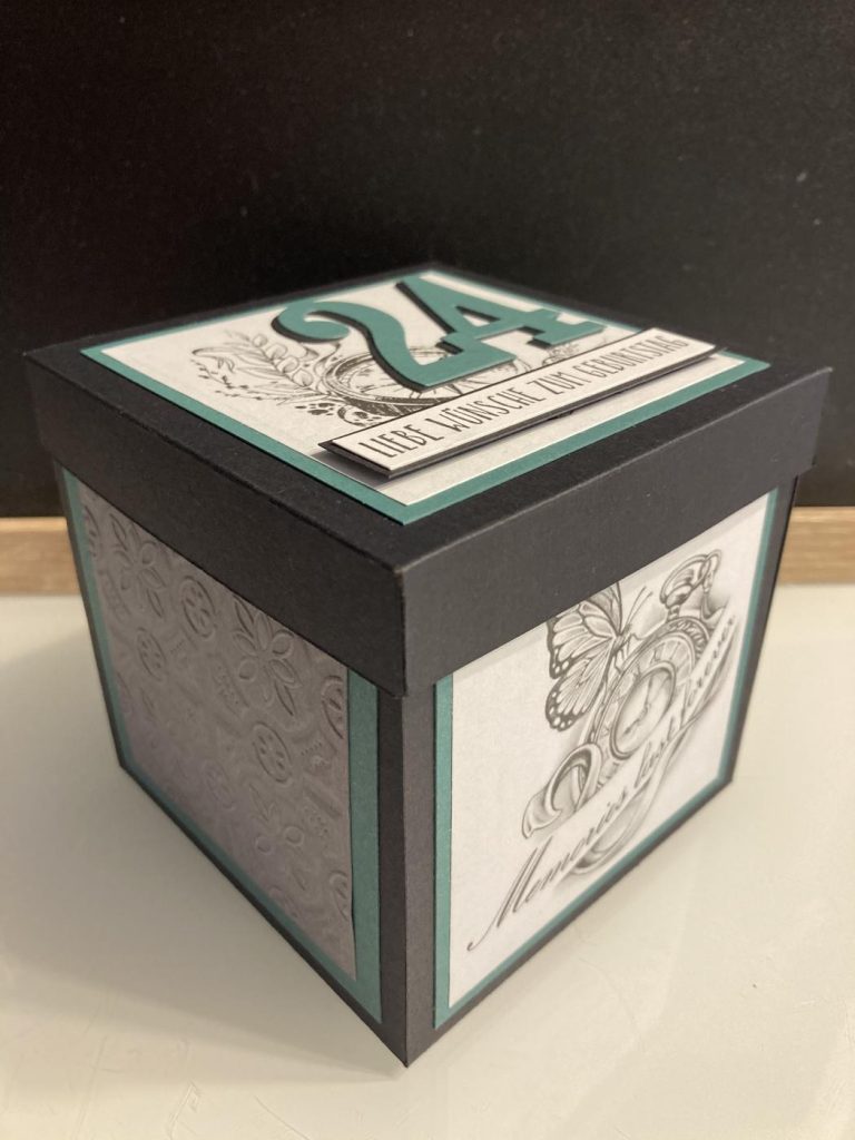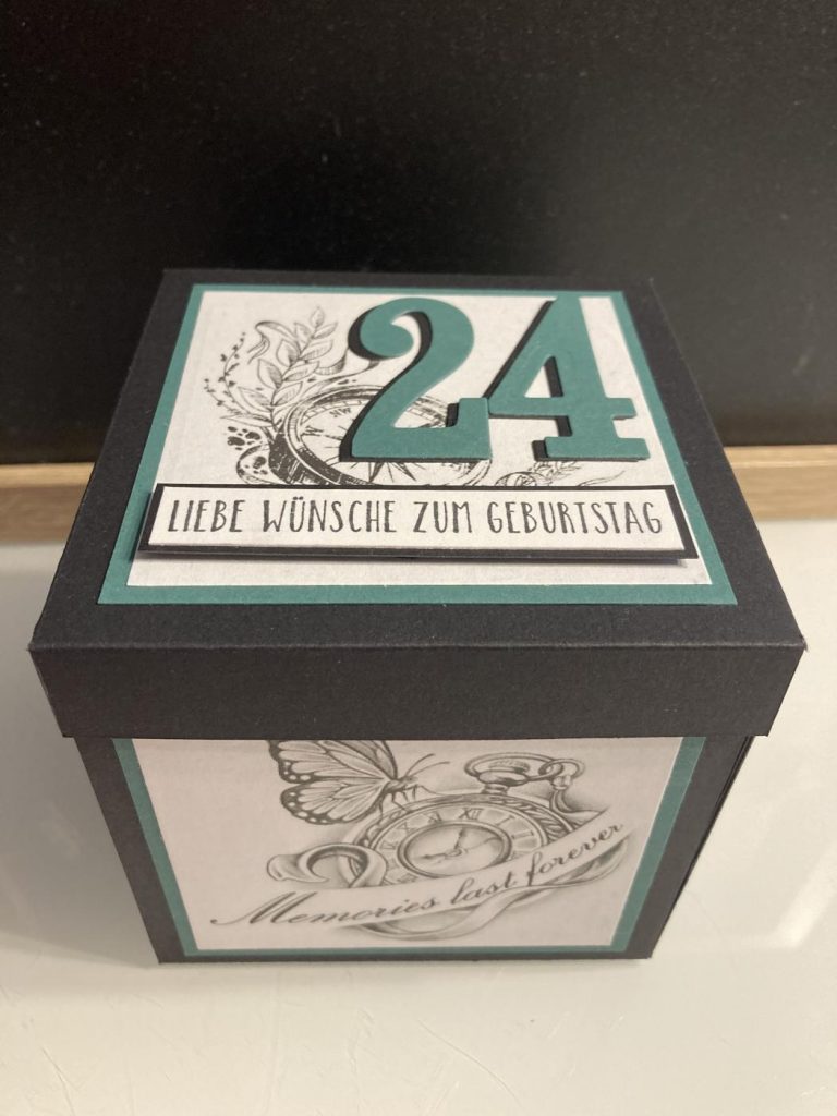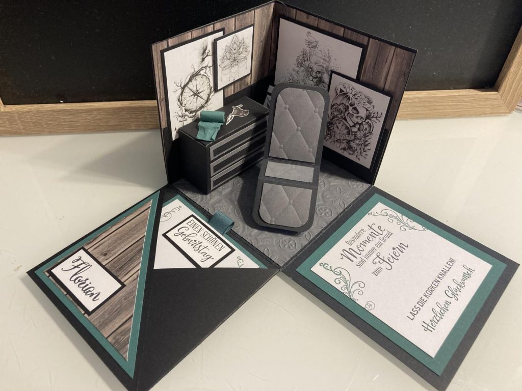 Recently, I have received several inquiries about my Tattoo Explosion Boxes. Let me today show you one of the actual orders – a box in Black, White and Tranquil Tide, similar to another box I made already about a year ago. It was supposed to be a surprise for Florian on his 24th birthday. I hope he liked his surprise- the actual gift as well as the box. Thank you for the order!!!😊