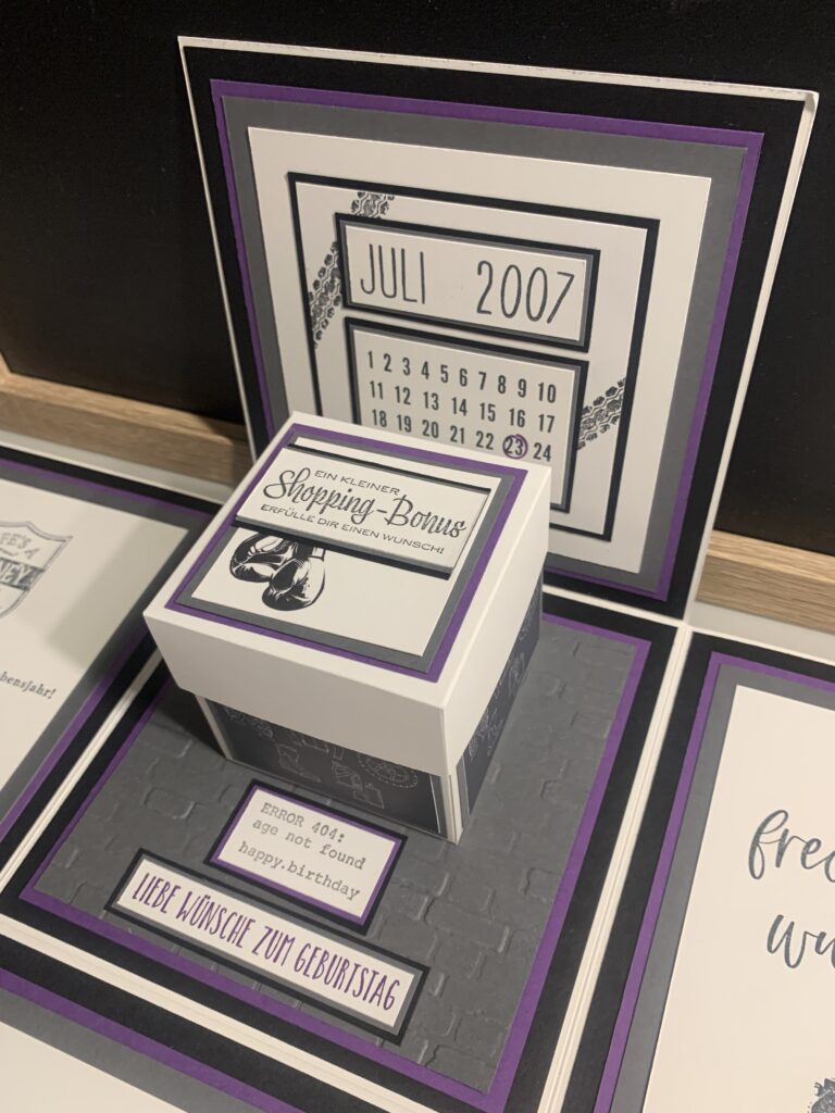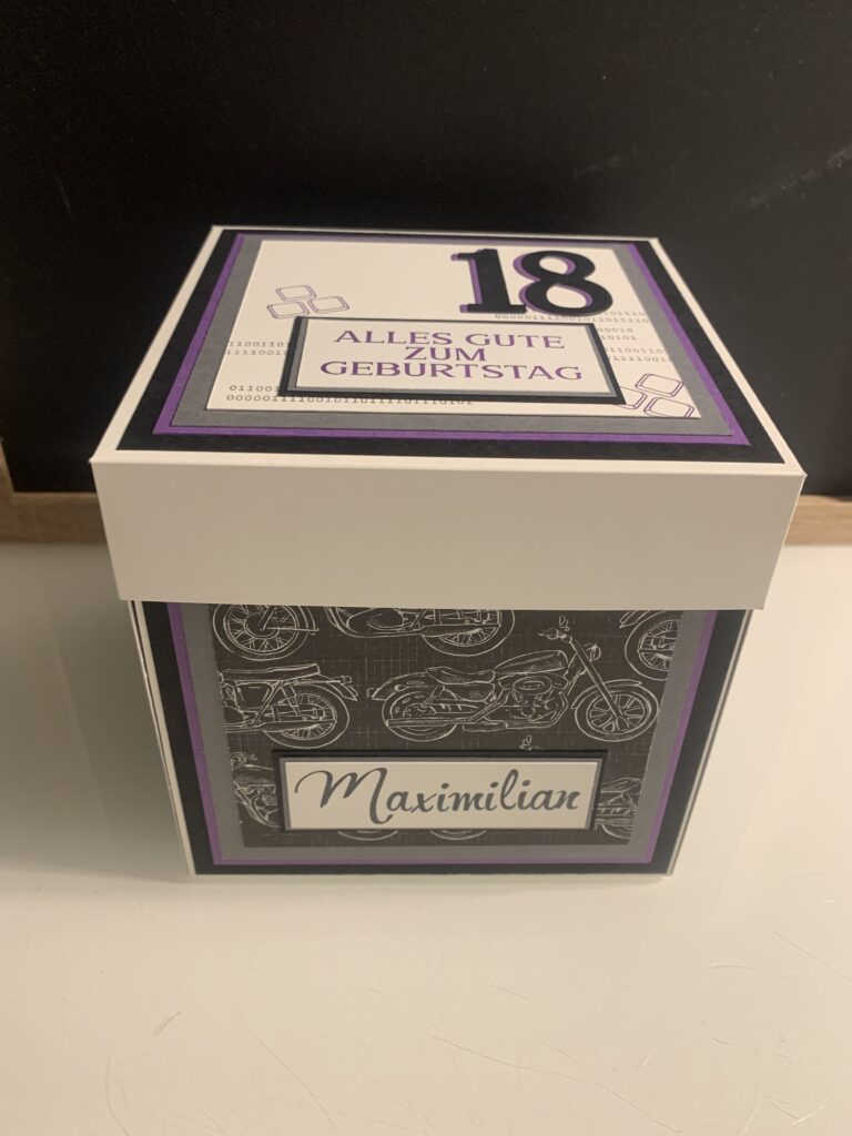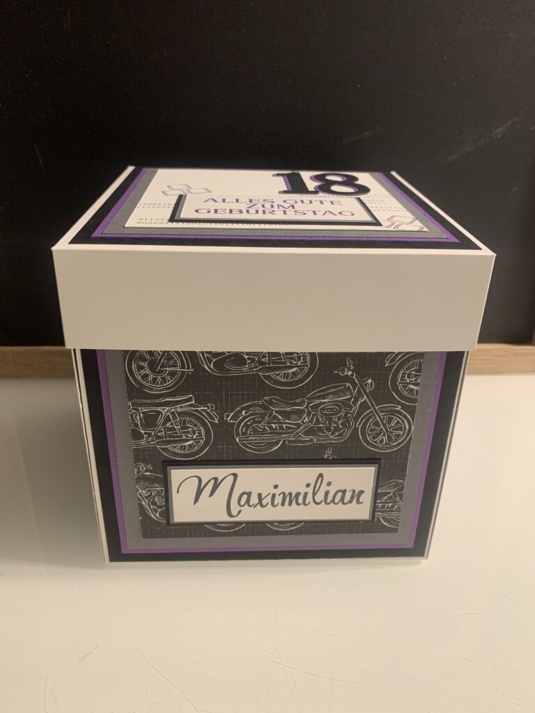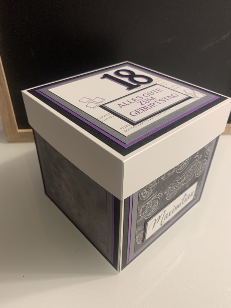 Diese XL Explosionsbox wurde bei mir zum 18. Geburtstag von Maximilian bestellt. Gewünscht war eine Kombi aus Grundweiß, Schwarz, Anthrazit und Amethyst. Er liebt Motorräder und somit wurde dies das Hauptthema der Box, das Boxen habe ich thematisch auch innen aufgegriffen. Die kleine Box innen bietet genug Platz für den geplanten finanziellen Zuschuss.
