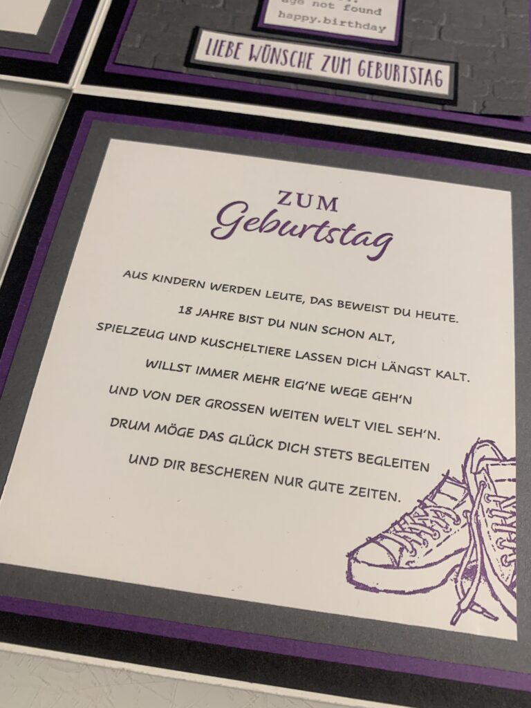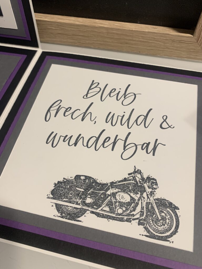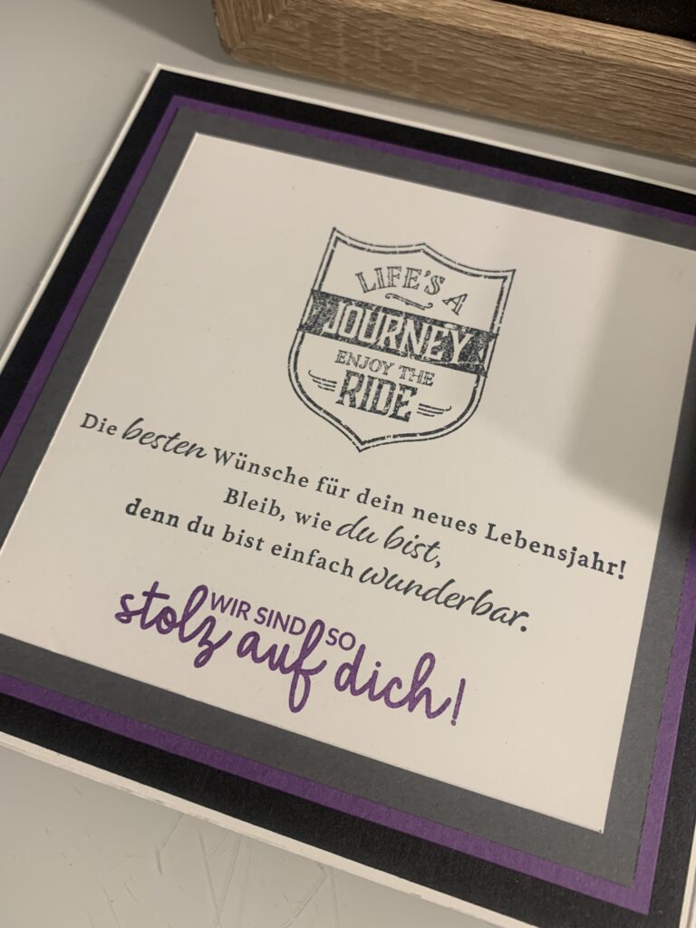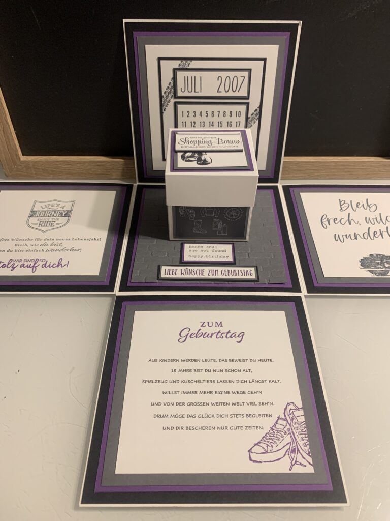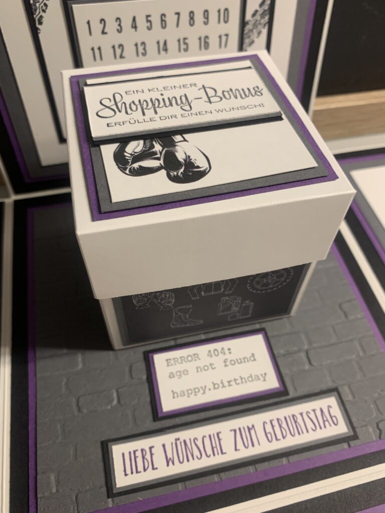 Diese XL Explosionsbox wurde bei mir zum 18. Geburtstag von Maximilian bestellt. Gewünscht war eine Kombi aus Grundweiß, Schwarz, Anthrazit und Amethyst. Er liebt Motorräder und somit wurde dies das Hauptthema der Box, das Boxen habe ich thematisch auch innen aufgegriffen. Die kleine Box innen bietet genug Platz für den geplanten finanziellen Zuschuss.