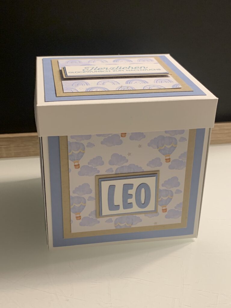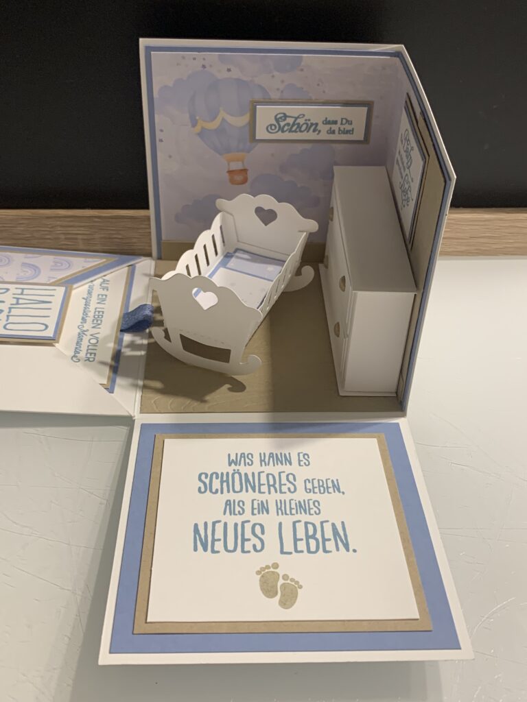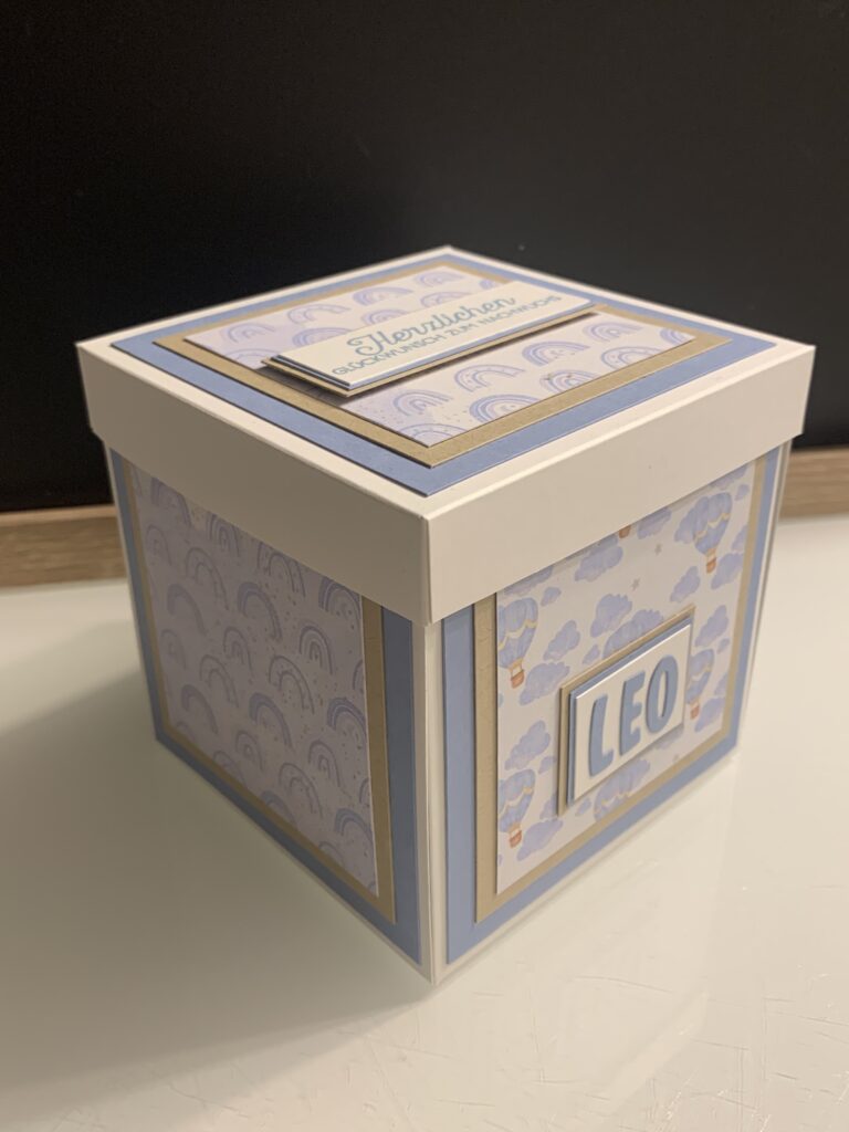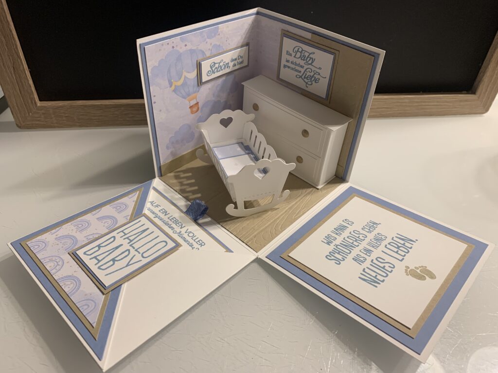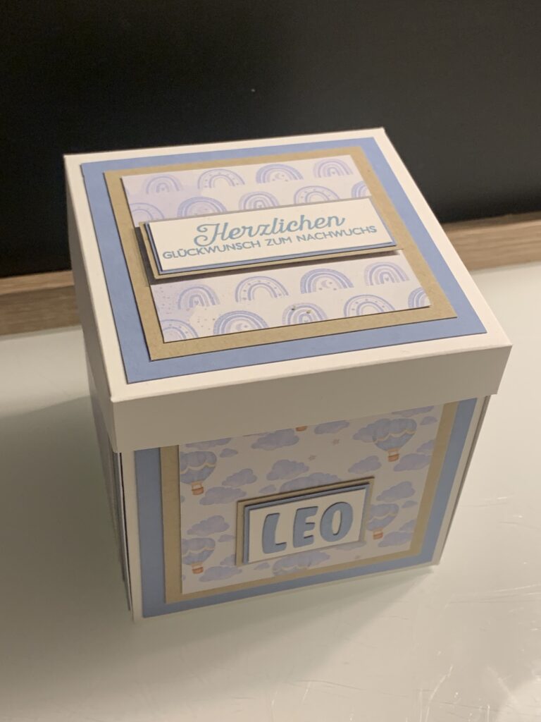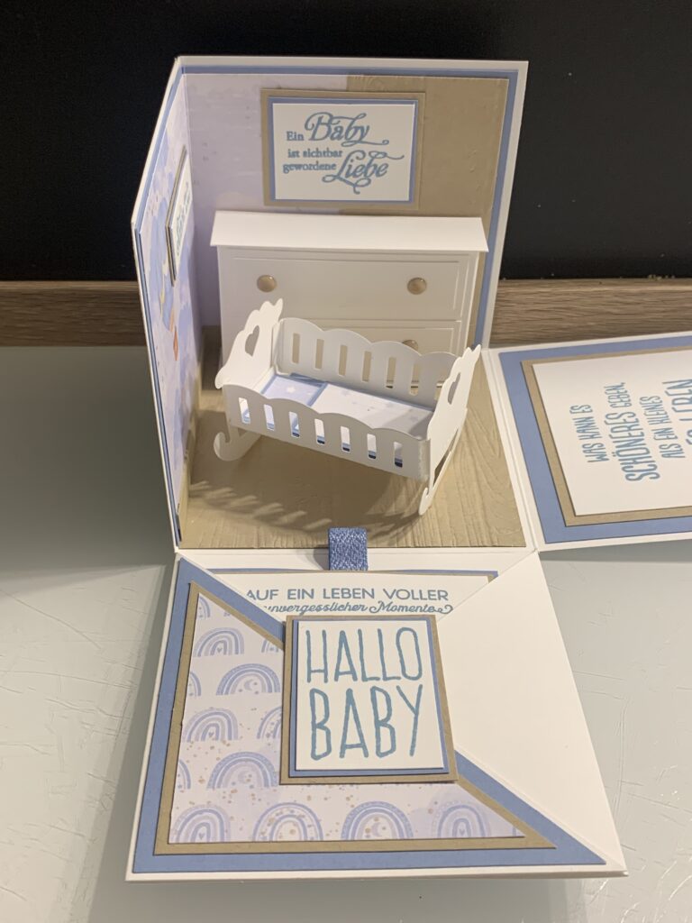 Der Urlaub ist leider zu Ende, aber neue Energie ist getankt für die 2. Jahreshälfte. Heute zeige ich euch eine Explosionsbox, die bei mir zur Geburt des kleinen Leo bestellt wurde. Gewünscht war eine typische Kombi mit blau – hier Grundweiß mit Boho-Blau und Savanne, kombiniert mit einem super süßen Designerpapier. Innen gab’s ein Babyzimmer mit Wiege, die Kommode ließe sich oben öffnen (für eine Gutscheinkarte oder ein Geldgeschenk). Außen habe ich noch den Namen Leo ausgestanzt. Ich bedanke mich für die Bestellung und hoffe die Überraschungsbox hat Freude bereitet.