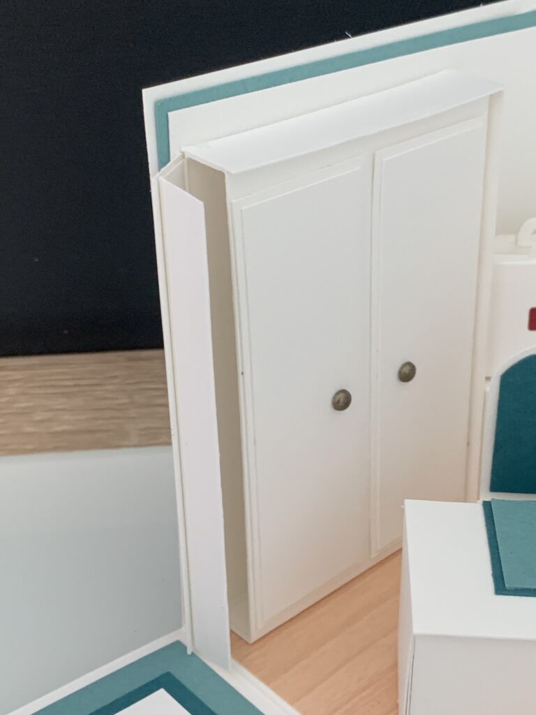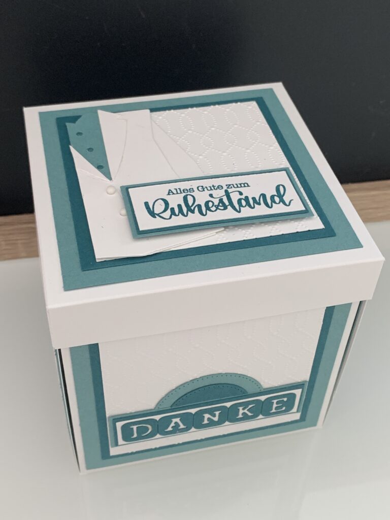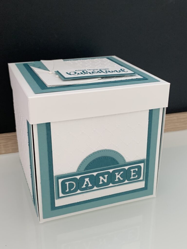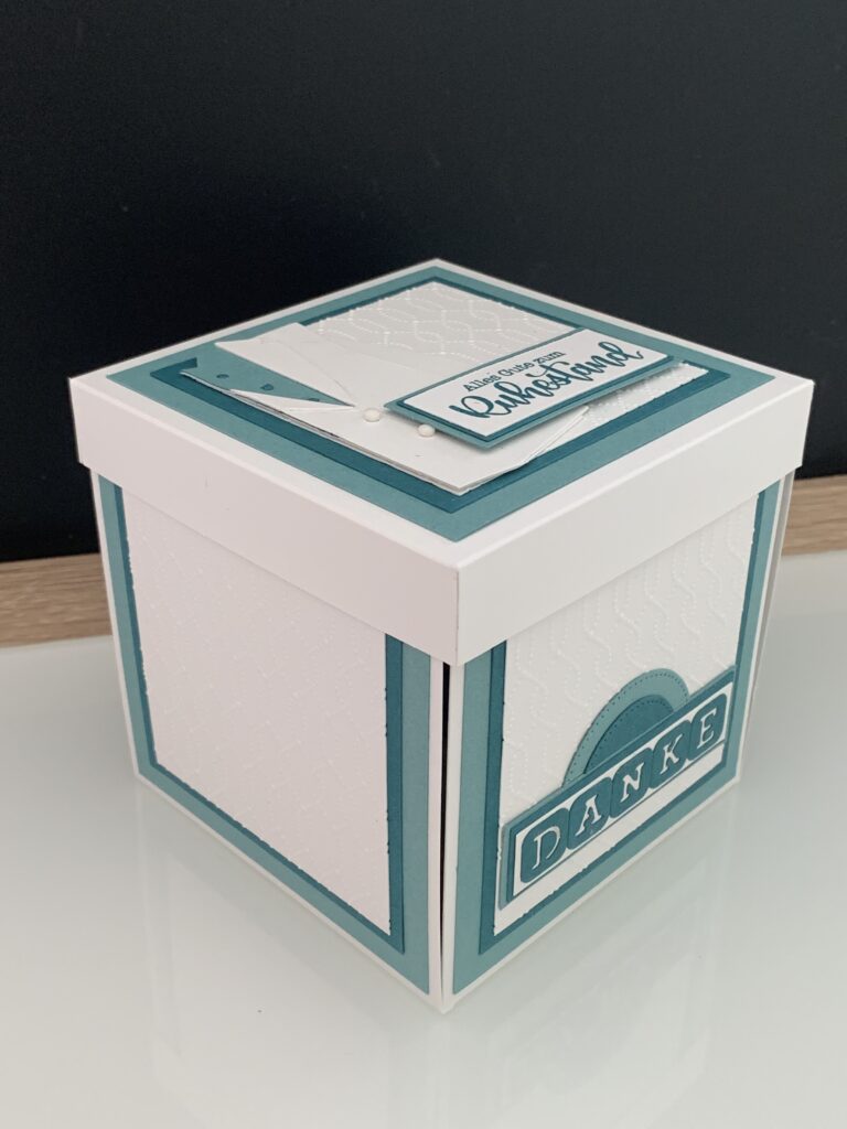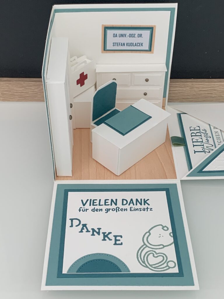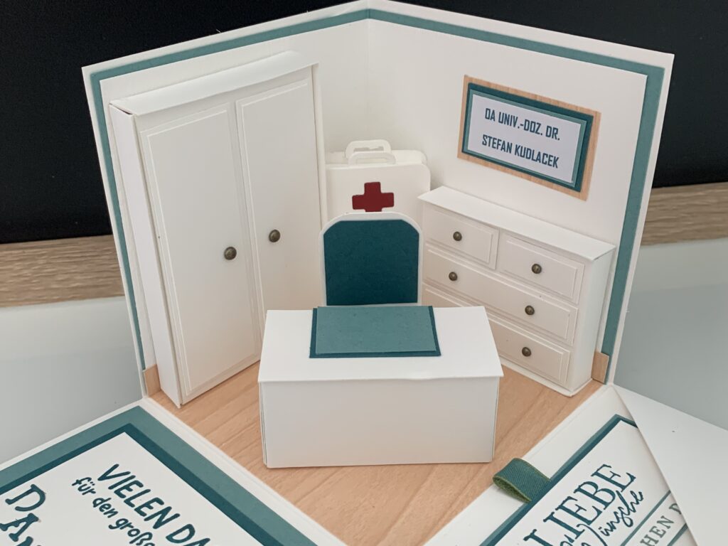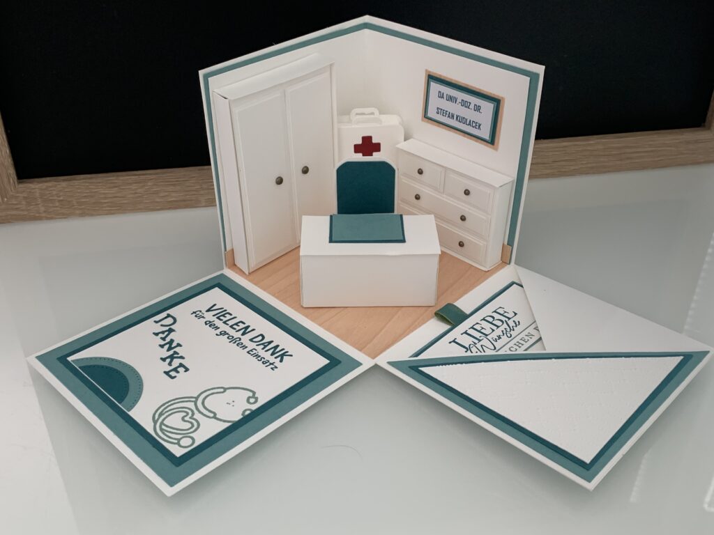Zum Ruhestand eines Arztes wurde diese Explosionsbox bei mir bestellt um Danke zu sagen für die vielen Jahre der Betreuung. Ich habe die Farben Pfauengrün, Lagunenblau und Grundweiß verwendet, oben auf den Deckel einen Arztkittel gemacht und innen eine kleine Ordination mit Schreibtisch, Erste Hilfe Koffer und einen Kasten, in dem die verschenkten Gutscheinkarten Platz finden. Liebe Selin, danke für deine Bestellung, ich hoffe dir und auch ihm hat die Box gefallen.