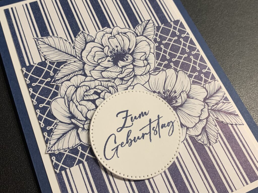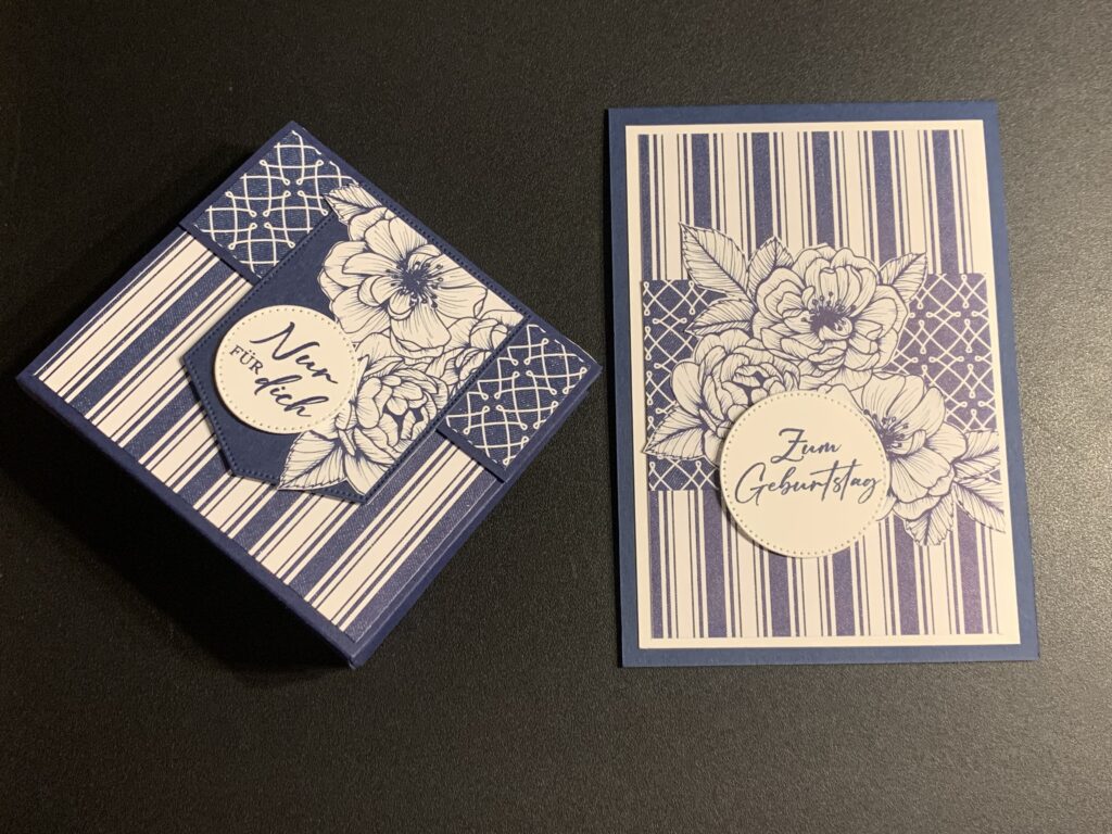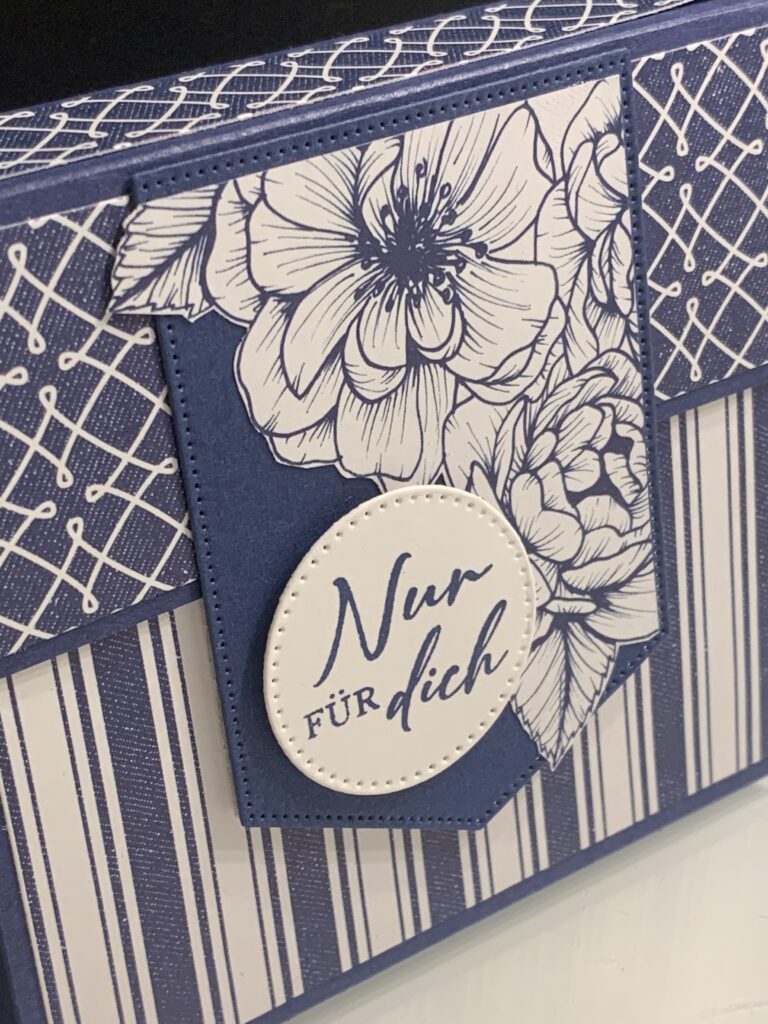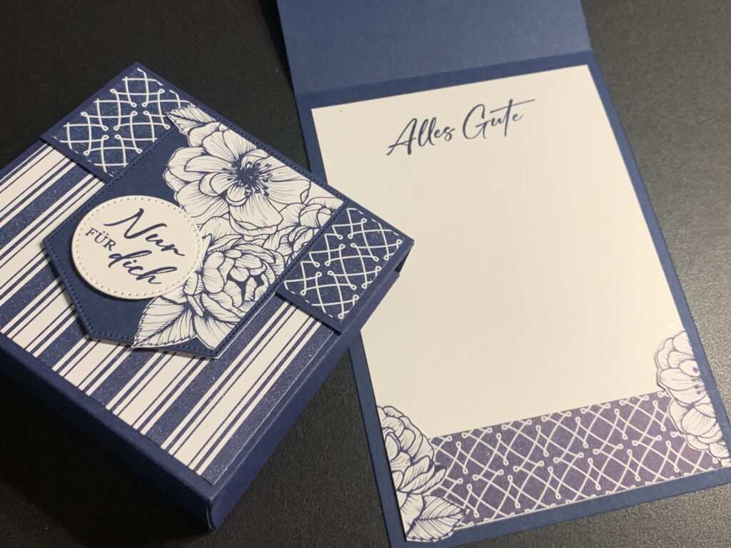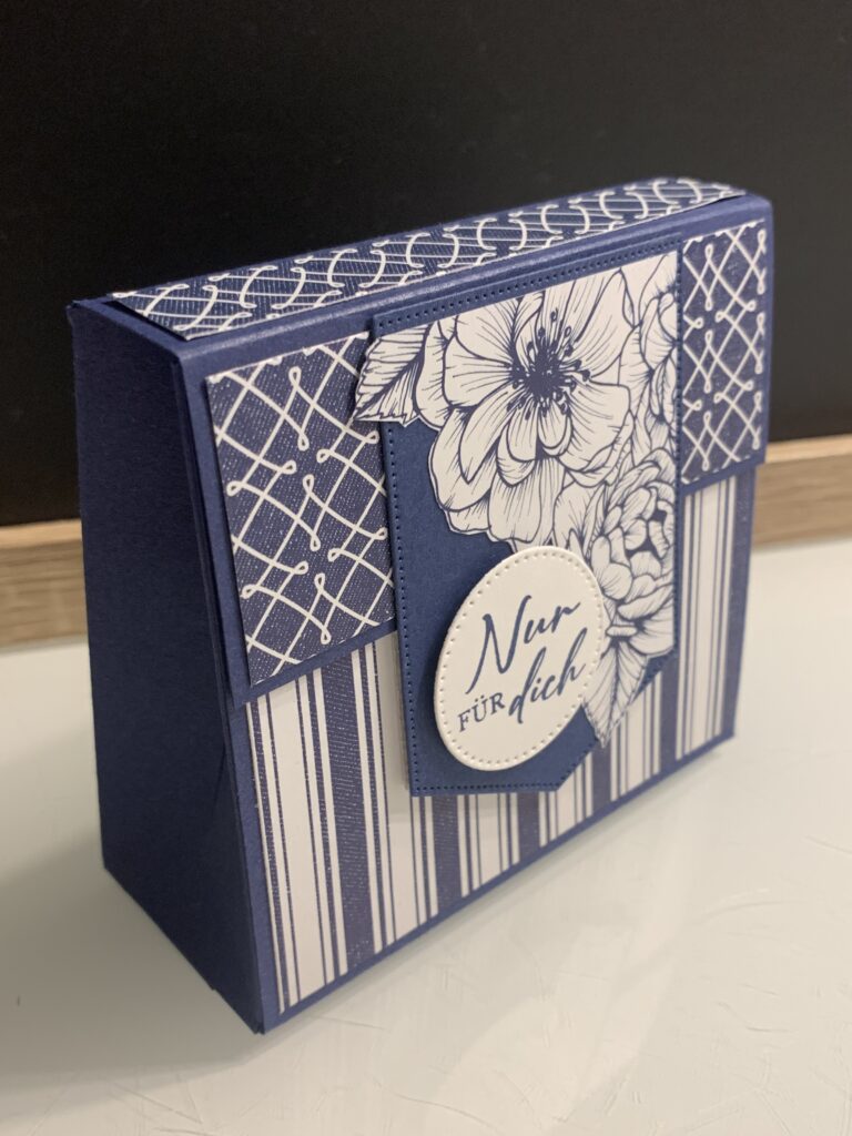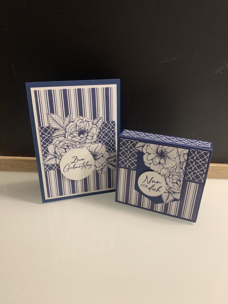 Gestern hatte ein lieber Freund von uns Geburtstag und zu diesem Anlass habe ich diese Karte samt passender Schokobox hergestellt. Verwendet habe ich Farbkarton in Marineblau und Grundweiß sind das farblich passende Designerpapier „Florale Liebe“. Das Stempelset „Liebe über alles“ ist eines meiner Lieblingsstempelsets von Stampin‘ Up! Lieber Stefan, beste Wünsche noch einmal und alles Gute fürs neue Lebensjahr!