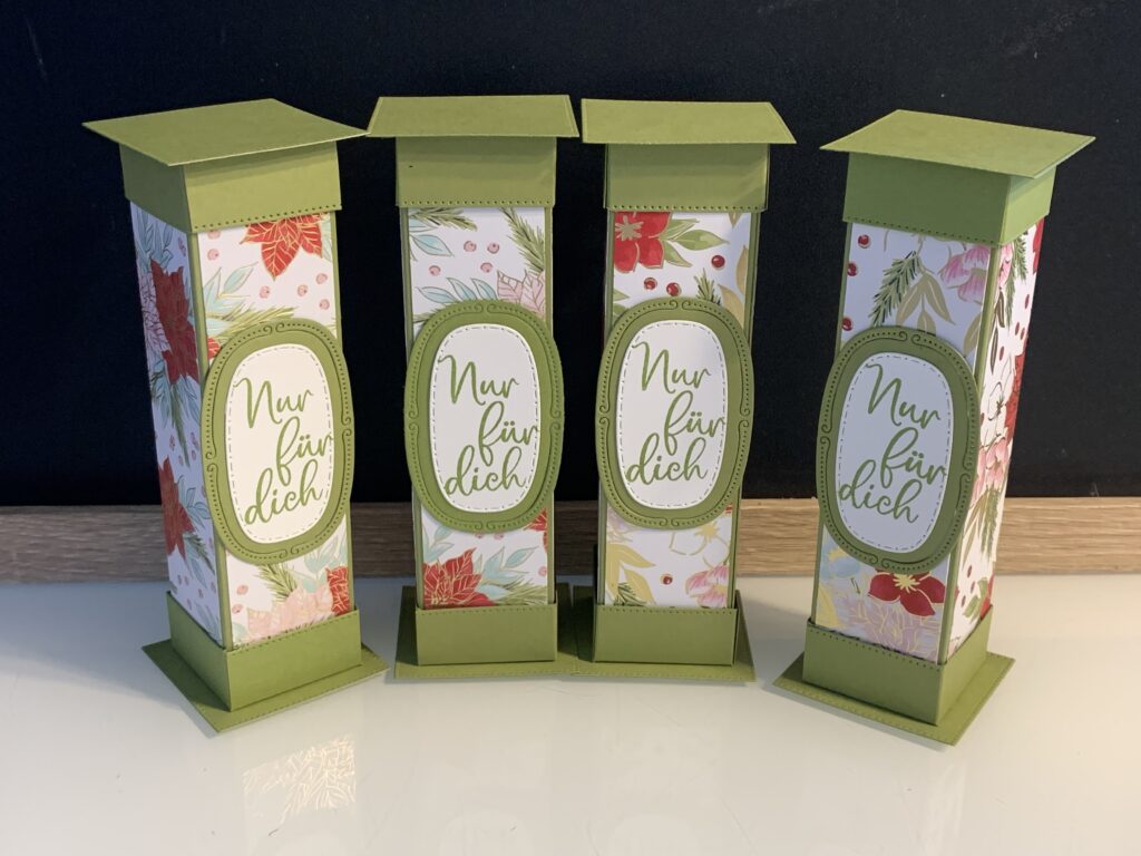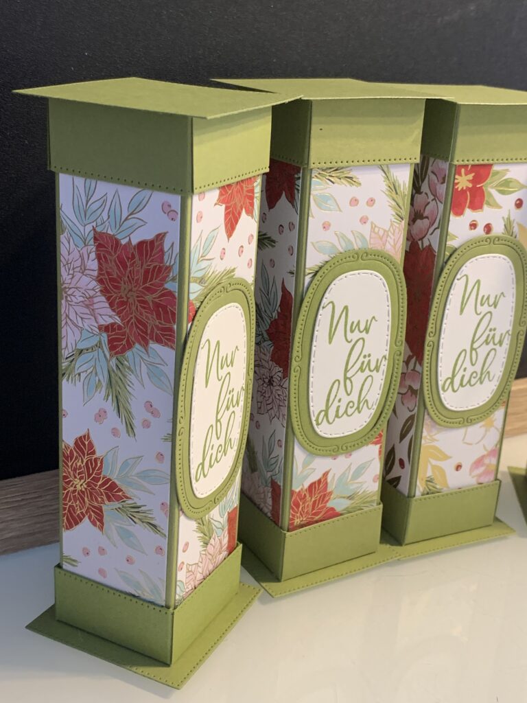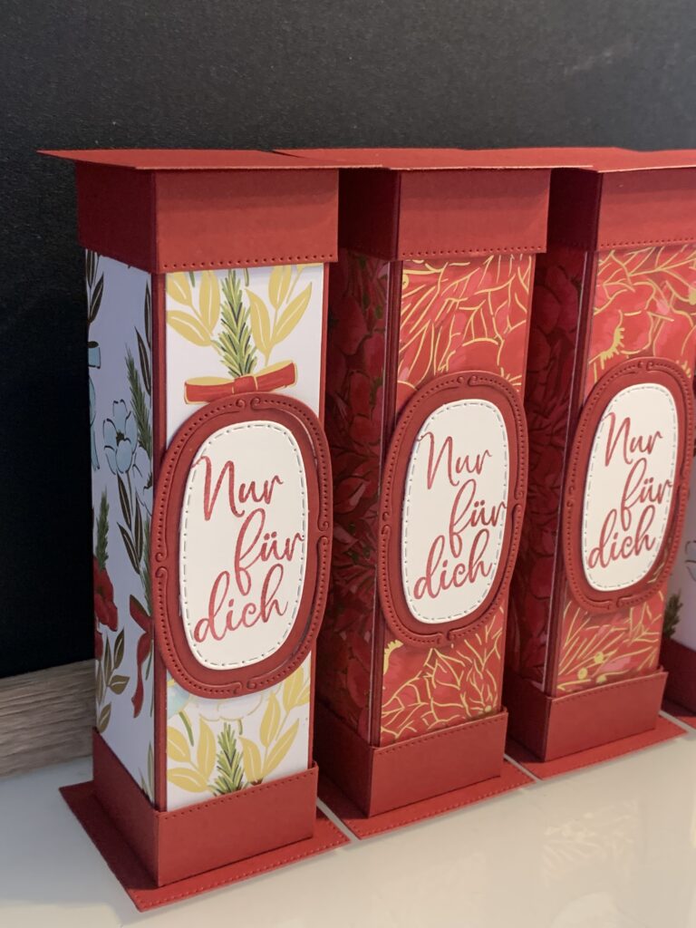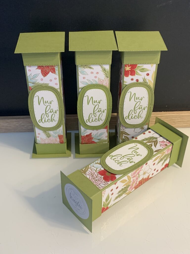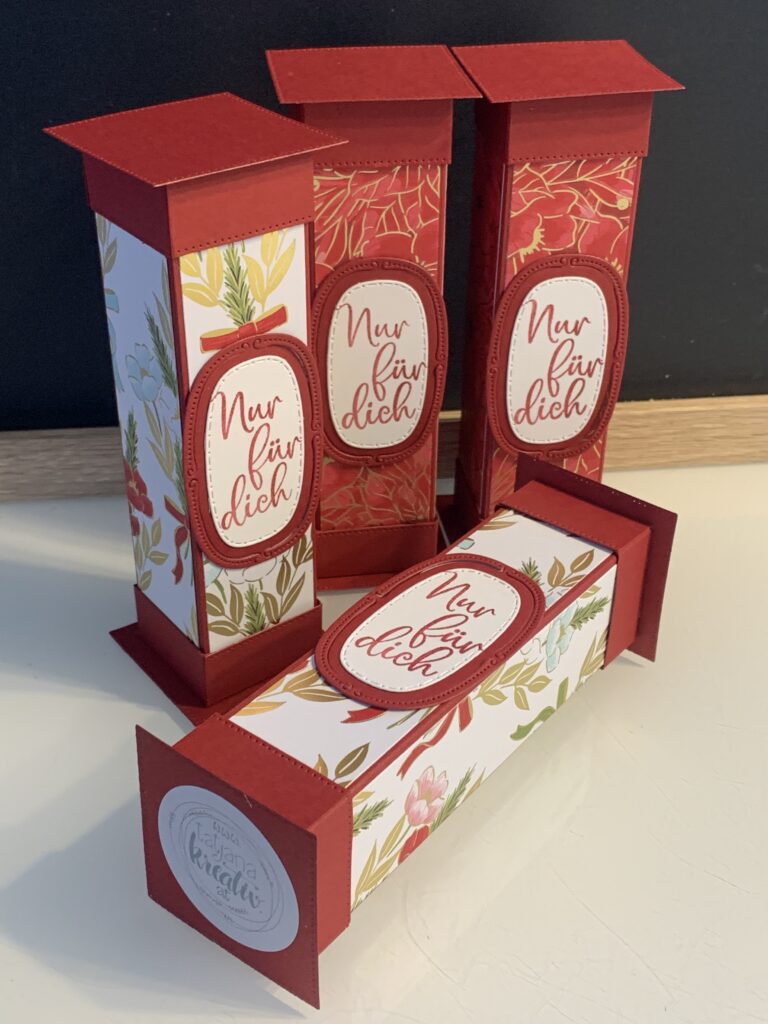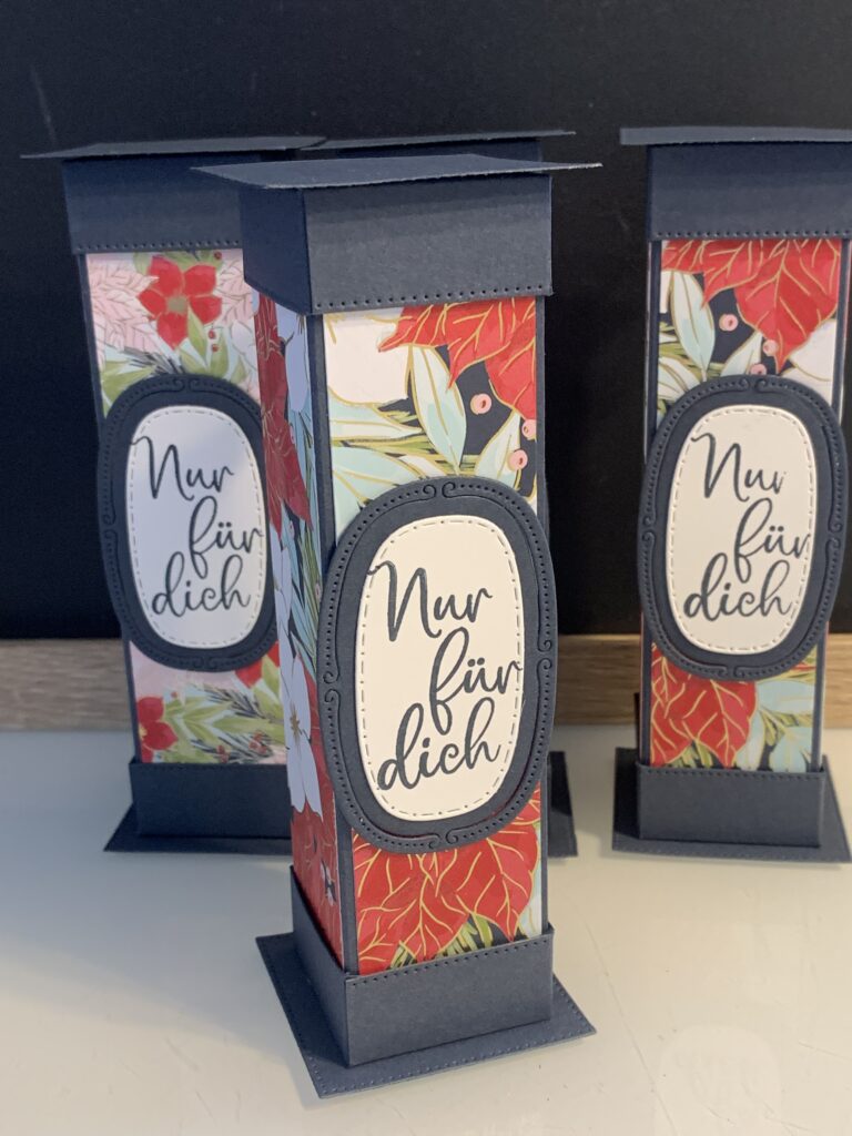 Diese Säulenboxen habe ich für einige meiner Kund:innen angefertigt und auch für meine Septemberaktion – ab 60 EUR Stampin‘ Up! Bestellwert bekommt ihr nämlich 20 Anleitungen zu eurer Bestellung kostenlos dazu und diese Anleitung ist eine davon. Verwendet habe ich für die Boxen Farbkarton in Tiefseeblau, Olivgrün und Chili und dazu das wunderschöne neue Stampin‘ Up! Besondere Designerpapier „Weihnachtstraditionen“. Der Spruch in Tiefseeblau und die Stanzen stammen aus dem Produktpaket „Traditionelle Etiketten“. Ich hoffe ihr habt ganz viel Freude mit der Anleitung!