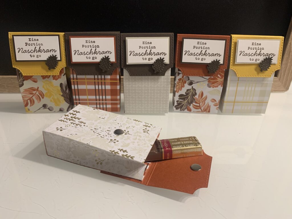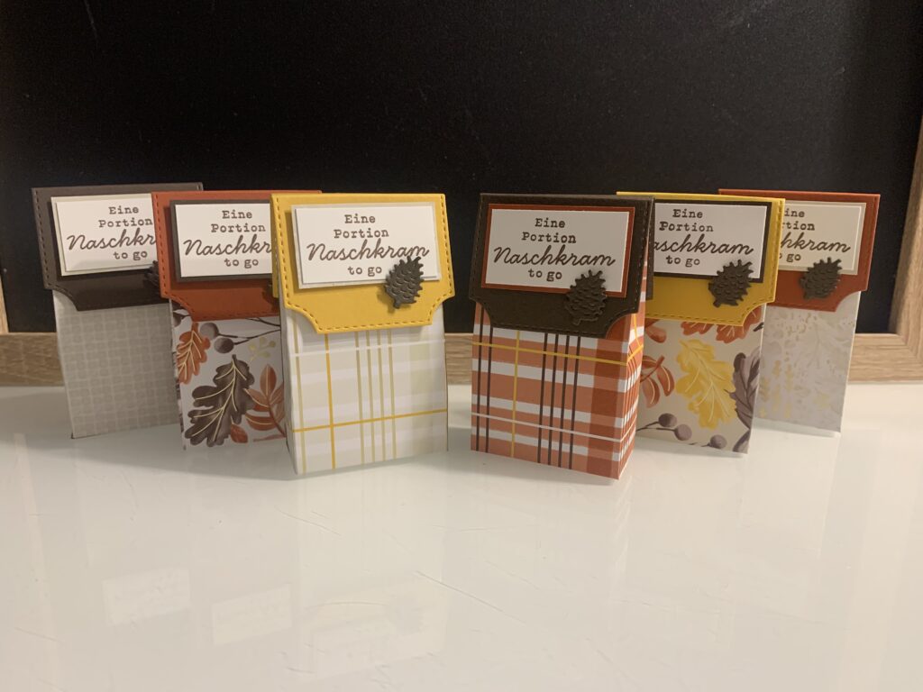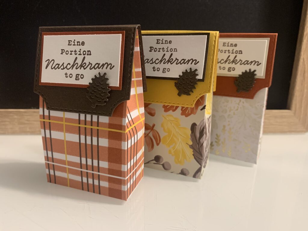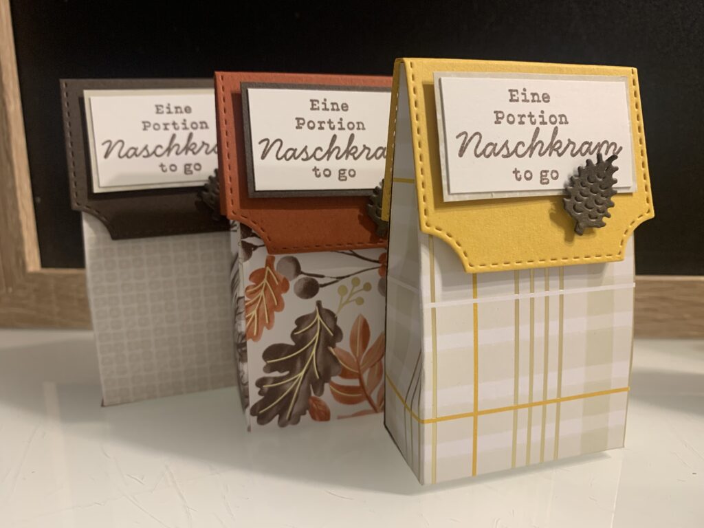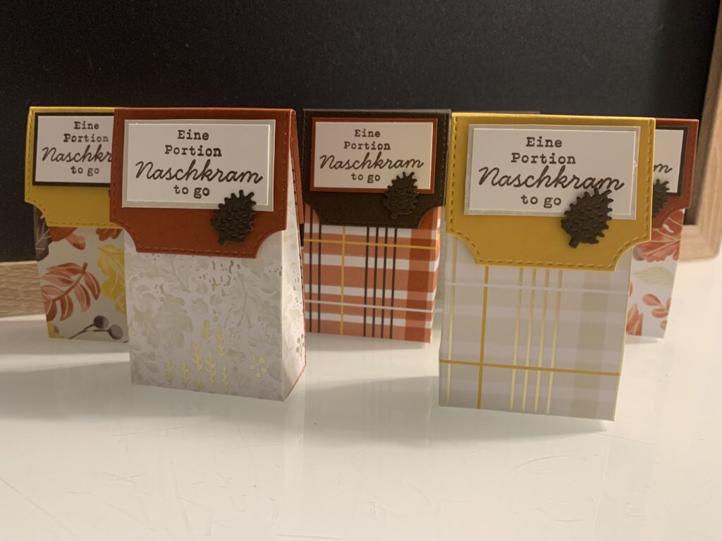 Für meine In Person Workshop Gäste gibt es immer kleine Danke Goodies. Dieses Mal wurde es herbstlich mit dem wunderschönen Designerpapier „Wunderbarer Herbst“. Ich liebe diese Farben, ihr nicht auch? Ich habe zu dem Stampin‘ Up! Designerpapier Farbkarton in Espresso, Curry-Gelb und Terrakotta kombiniert. Der Spruch stammt aus dem Stempelset „Süßes Bonbonglas“, passend gestempelt in Espresso. Den Verschluss der kleinen Verpackung habe ich mit einer der Stanzen aus dem Set „Bezaubernde Zweige“ gefertigt und auch der Zapfen oder das „Pockerl“ wie man bei uns sagt, stammt aus dem Set.