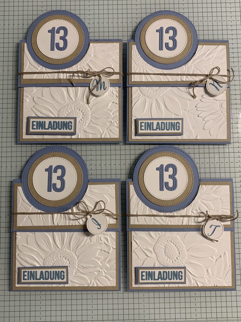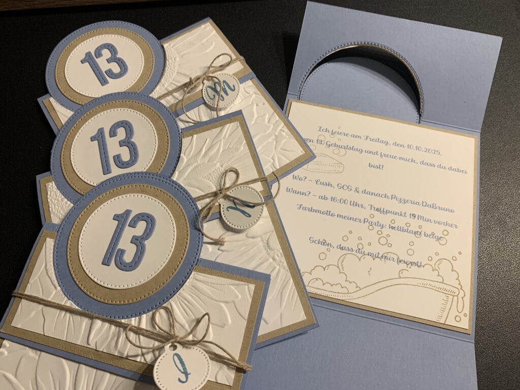 Gestern hatten wir die erste Geburtstagsfeier meiner Tochter – man wird ja nicht alle Tage ein Teenager! Mit den Freundinnen aus dem Haus gab es eine Party bei Lush, bei der Badebomben selber hergestellt wurden. Bei der Kartenart bin ich bei Circle Pop-Out Cards geblieben. Diese habe ich mit Stampin‘ Up! Farbkarton in Grundweiß, Boho-Blau und Savanne gestaltet, denn das Farbmotto war Hellblau/ Beige. Außen habe ich geprägt mit dem wunderschönen Stampin! Up! Prägefolder „Sonnenblumenfelder“, einer meiner Lieblingsprägefolder. Die Anfangsbuchstaben habe ich in Bohoblau auf ein kleines Tag gestempelt, das ich mit der Stanze aus dem Stampin‘ Up! Set „Anhänger für unterwegs“ ausgestanzt habe. Der Text innen ist gedruckt, wobei die Badewanne mit dem Badeschaum wieder ein Stempel ist, den ich dezent in Savanne abgestempelt habe. Hoffe sie haben den Mädls gefallen!