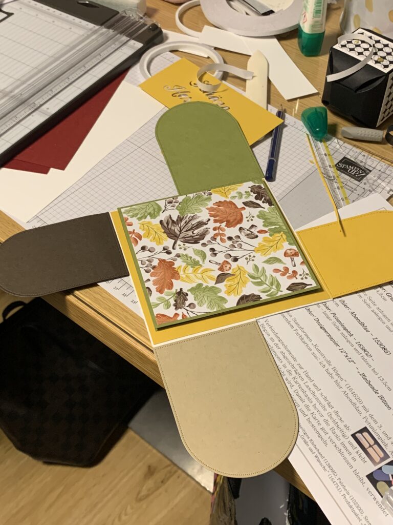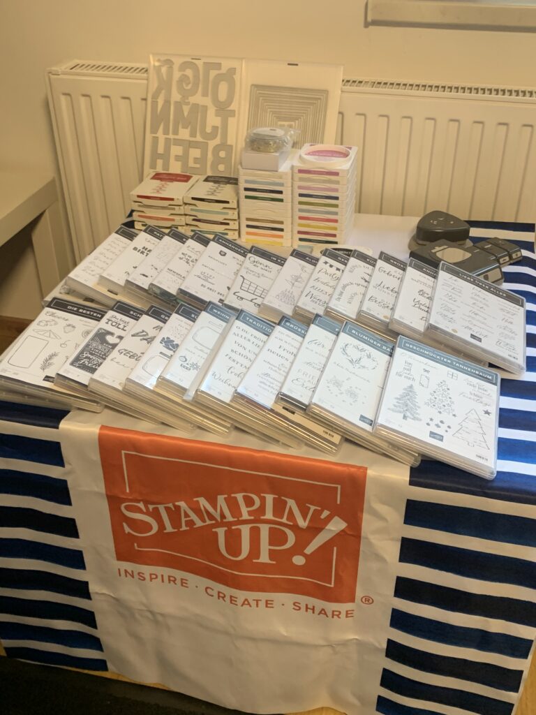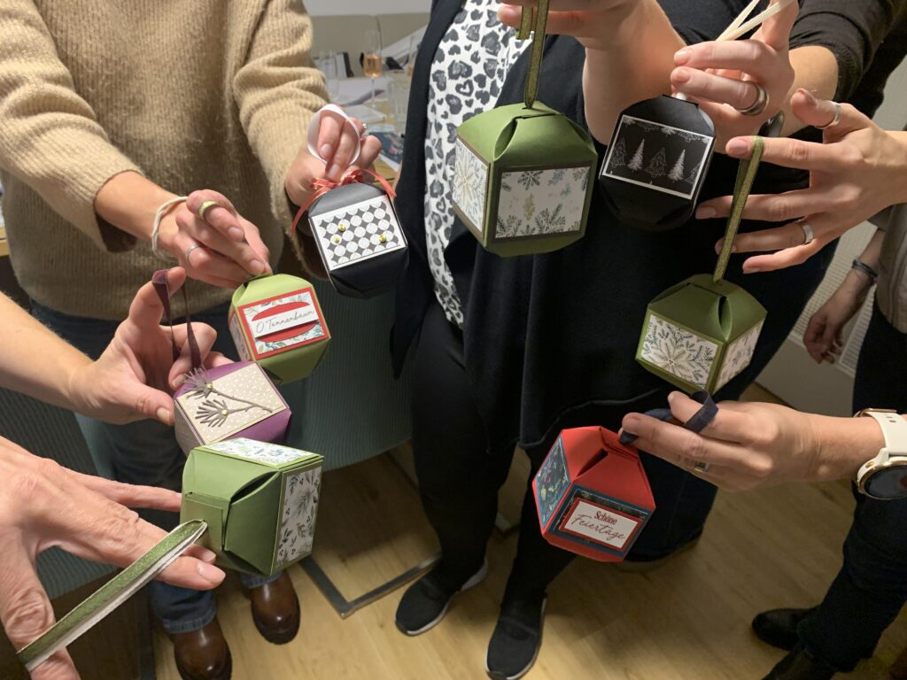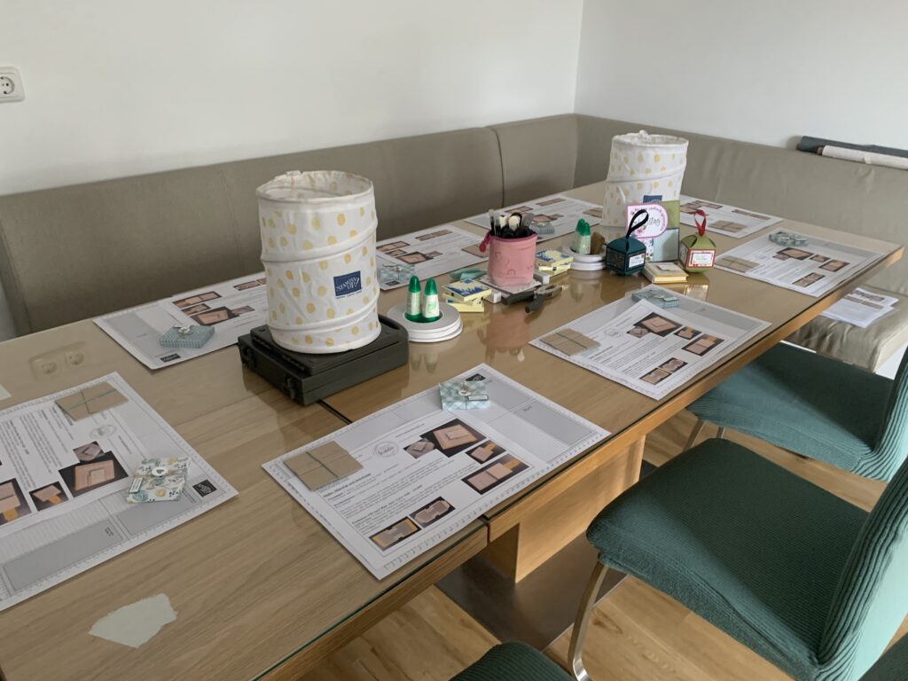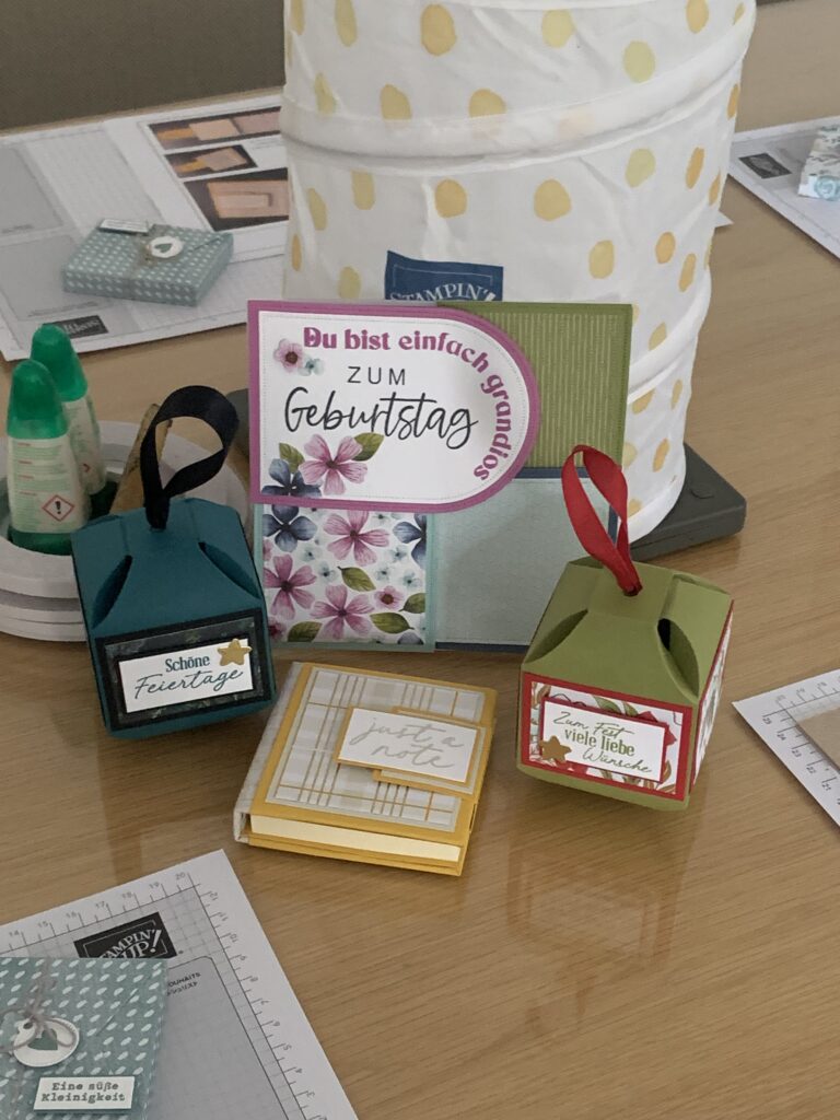 Gestern war ich bei der lieben Michaela zu Gast und gemeinsam mit 7 ihrer Freundinnen haben wir 3 tolle Projekte mit den Produkten von Stampin’ Up! gemacht – ein Post-It’s Büchlein mit Graupappe und Buchbindeleinen, eine Ornamentverpackung und eine Flip-Flap Karte (so habe ich sie zumindest getauft)! Und seht selbst, es sind so tolle Werke entstanden. Habt ihr super gemacht, Mädls!!!