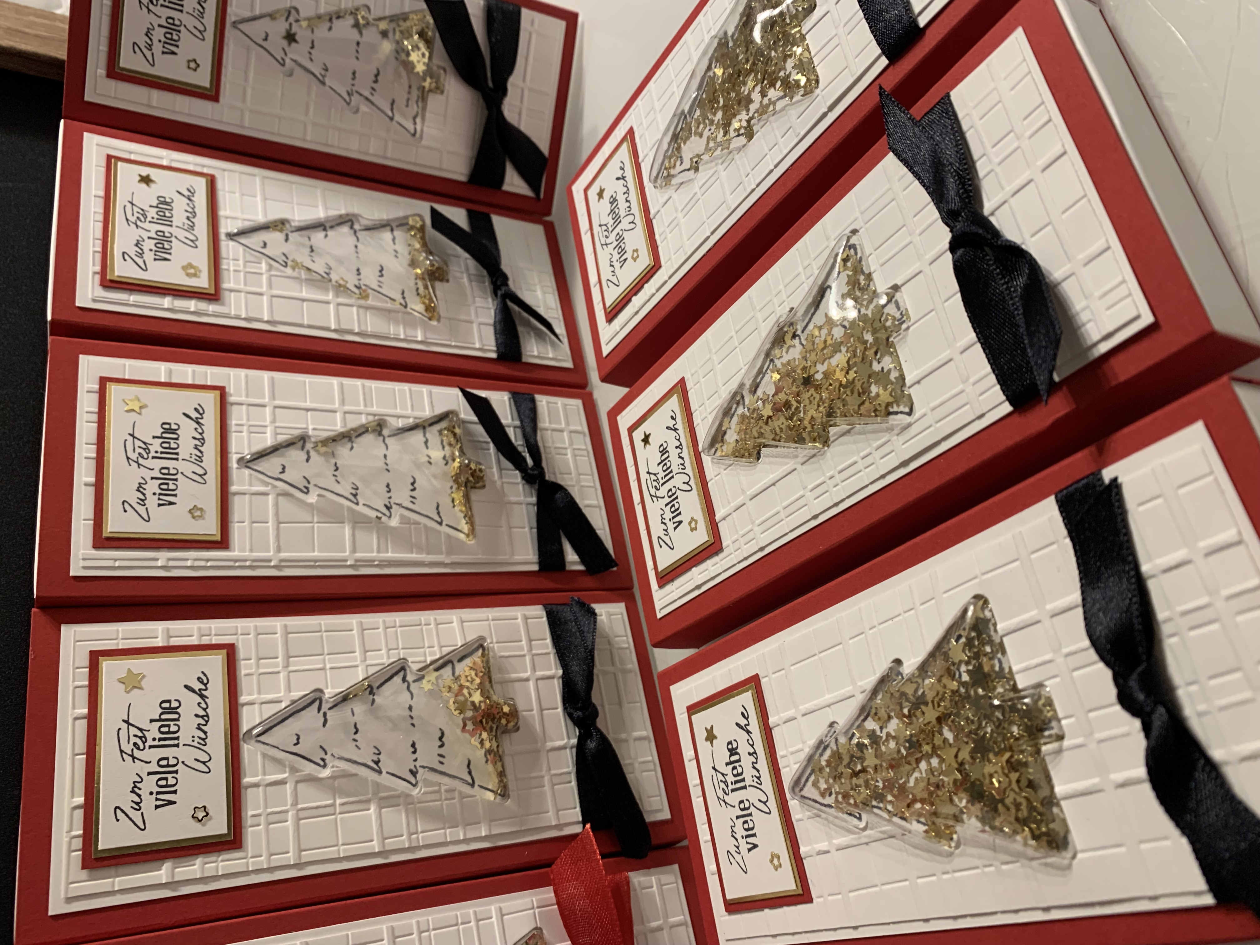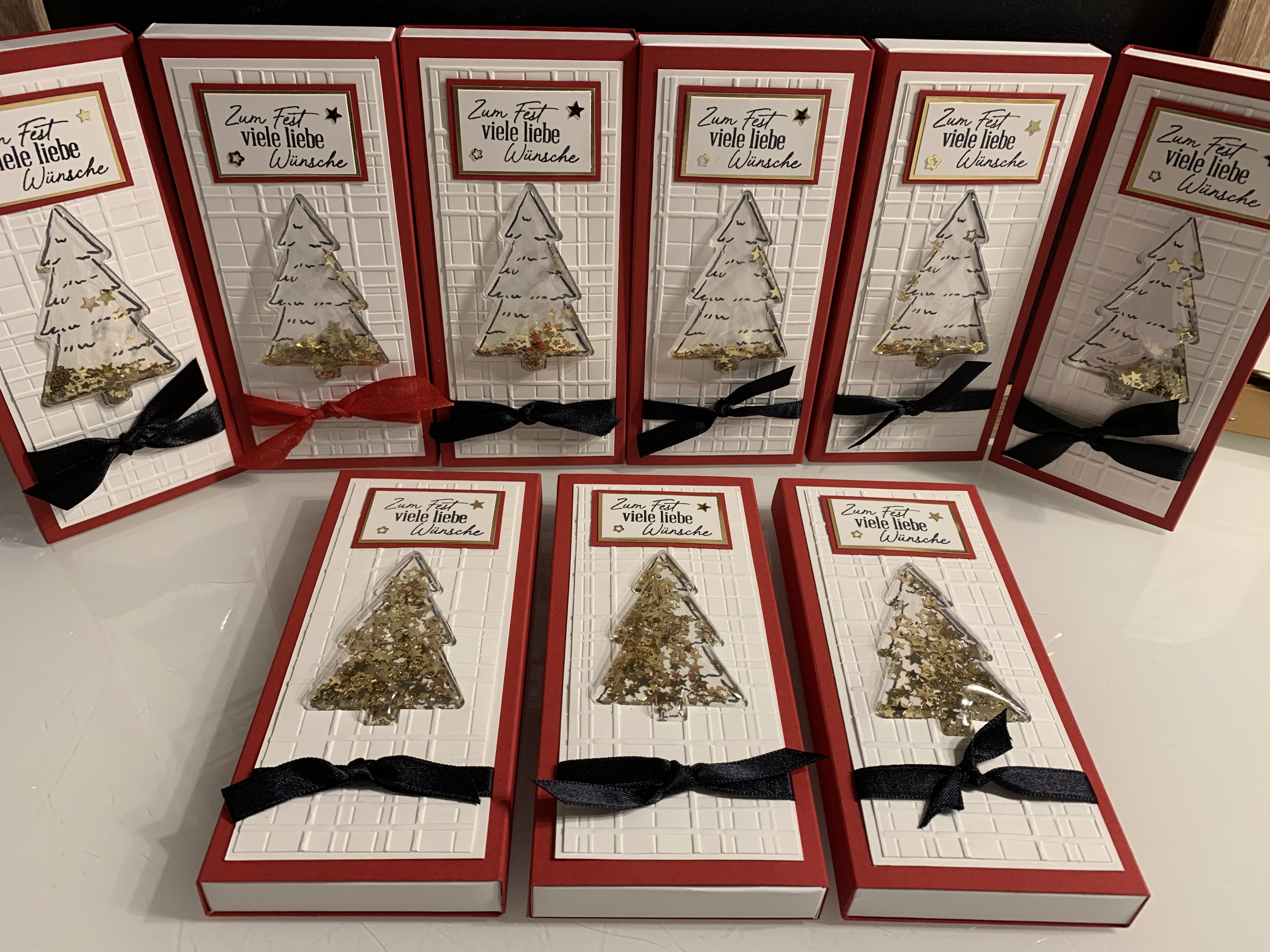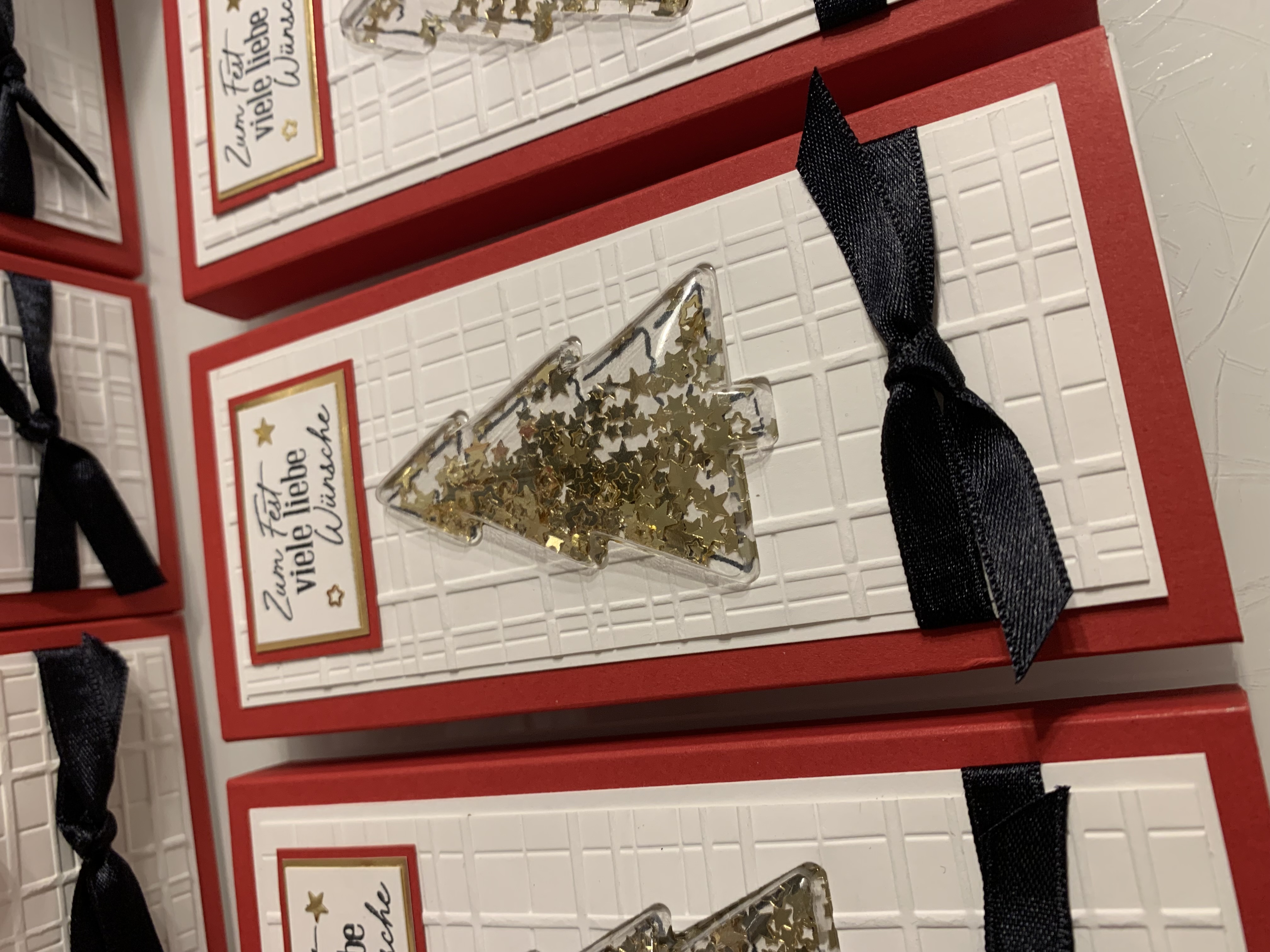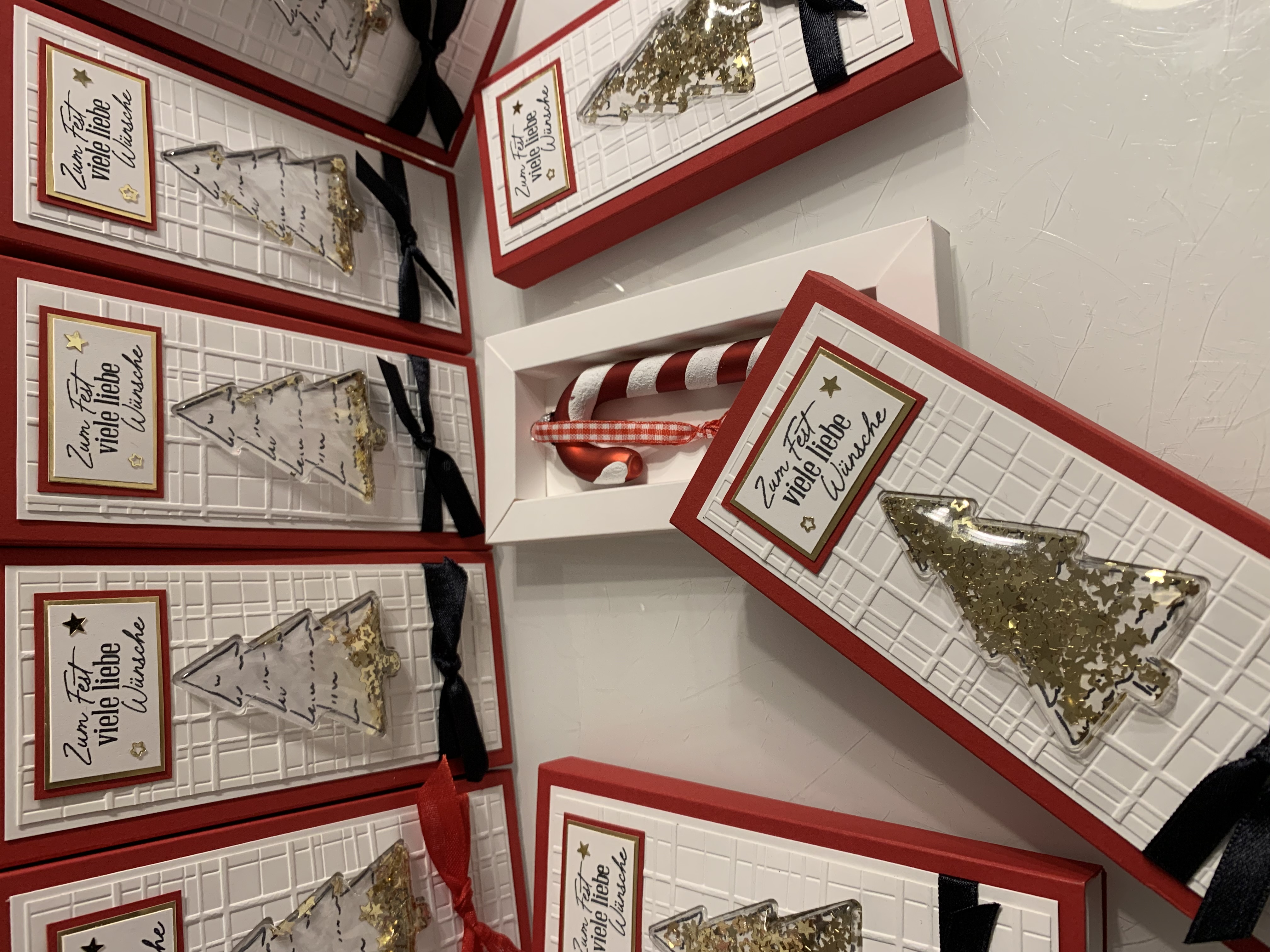 Im Dezember gab es wieder eine Swap-Challenge, die ich organisiert habe und meinen Beitrag dazu zeige ich euch heute. Ich habe diese Rahmen-Schüttelboxen gemacht in Grundweiß, Glutrot und Schwarz, passend zum Inhalt, einer Weihnachtskugel in Zuckerstangenform. Außen habe ich außerdem ein Weihnachtsbaum-Schüttelfenster angebracht (Plastikkuppeln in Tannenbaumform gefüllt mit den Goldfarbenen Sternen für Schüttelfenster) und das Set „Geschmückter Tannenbaum“ sowie den Prägefolder „Verspielte Karos“ verwendet. Alle verwendeten Materialien sind von Stampin‘ Up!