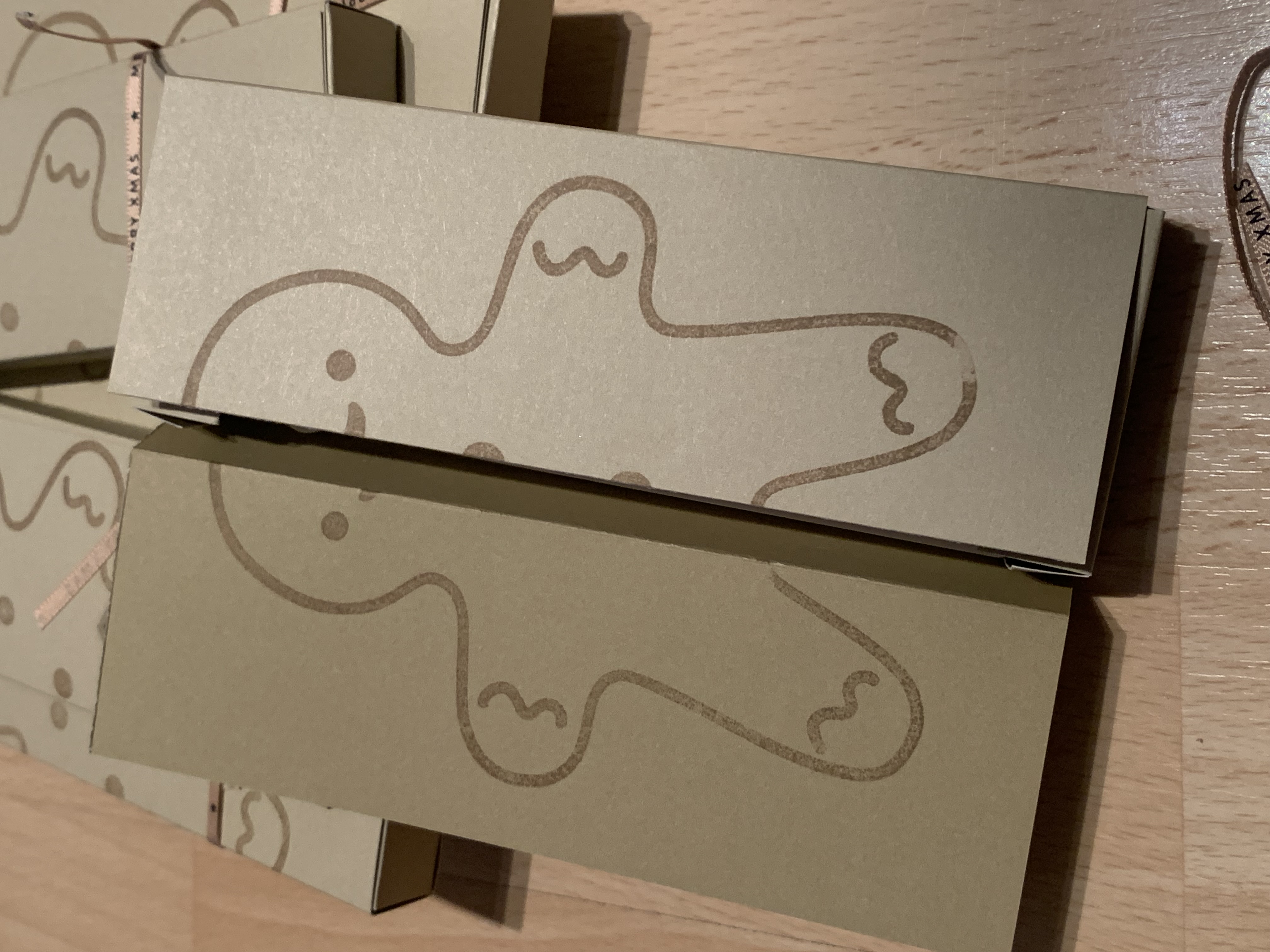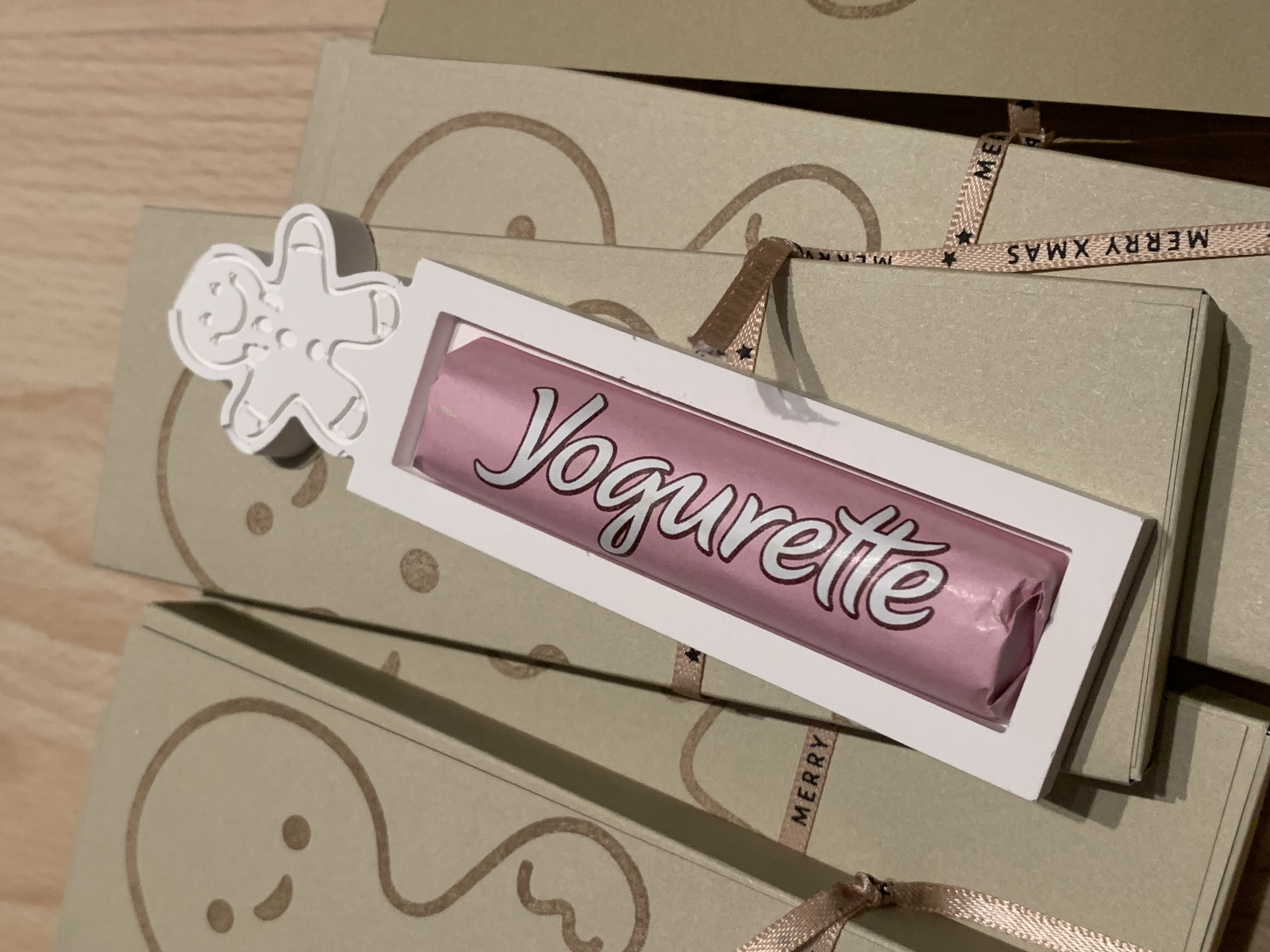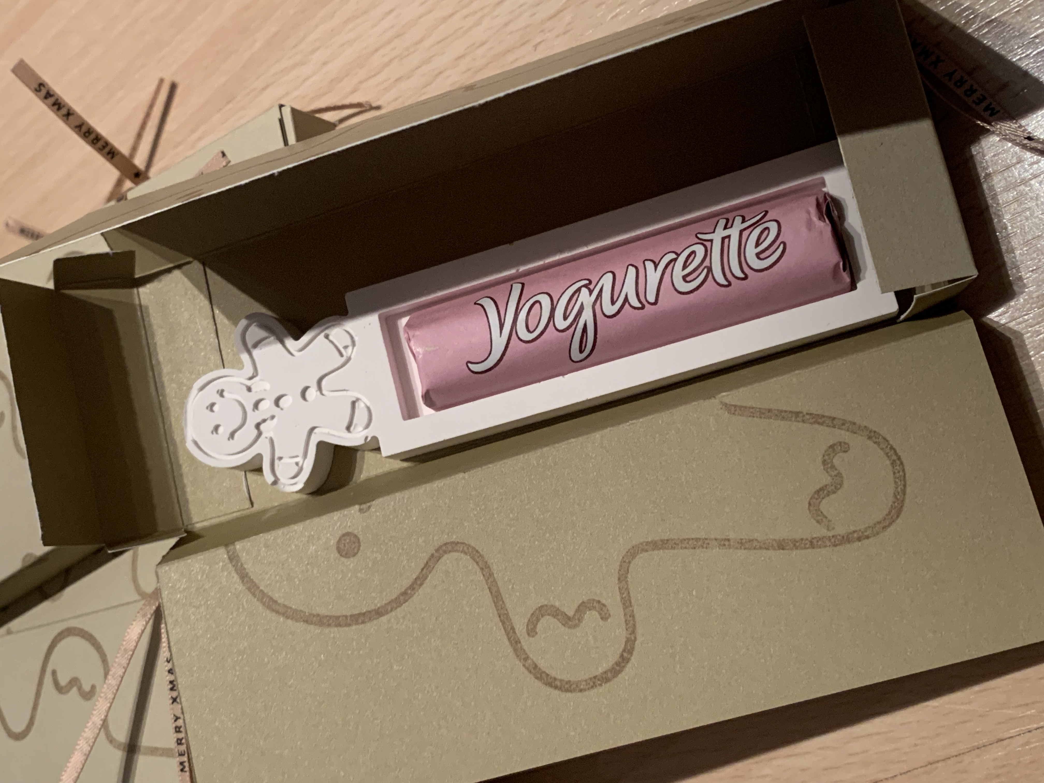 Die liebe Michi F. hat uns diese süßen Lebkuchenboxen in Savanne gezaubert – eine sehr raffinierte Öffnung übrigens! Drinnen war eine gegossene weihnachtliche Form mit einer Yogurette versteckt! Super lieb, danke schön!!