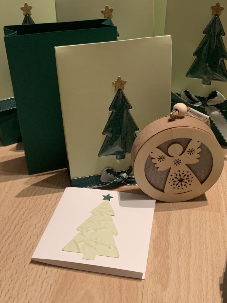 Diese wunderschönen Geschenksackerl in Tannengrün und Lindgrün samt passendem Band und Plastikkuppel in Tannenbaumform sind von der lieben Michi H. Innen befand sich neben einem kleinen Kärtchen auch ein weihnachtlicher Dekoartikel aus Holz, der sich beleuchten lässt. Wunderschön, war schon seit Mitte Dezember im Einsatz. Herzlichen Dank!
