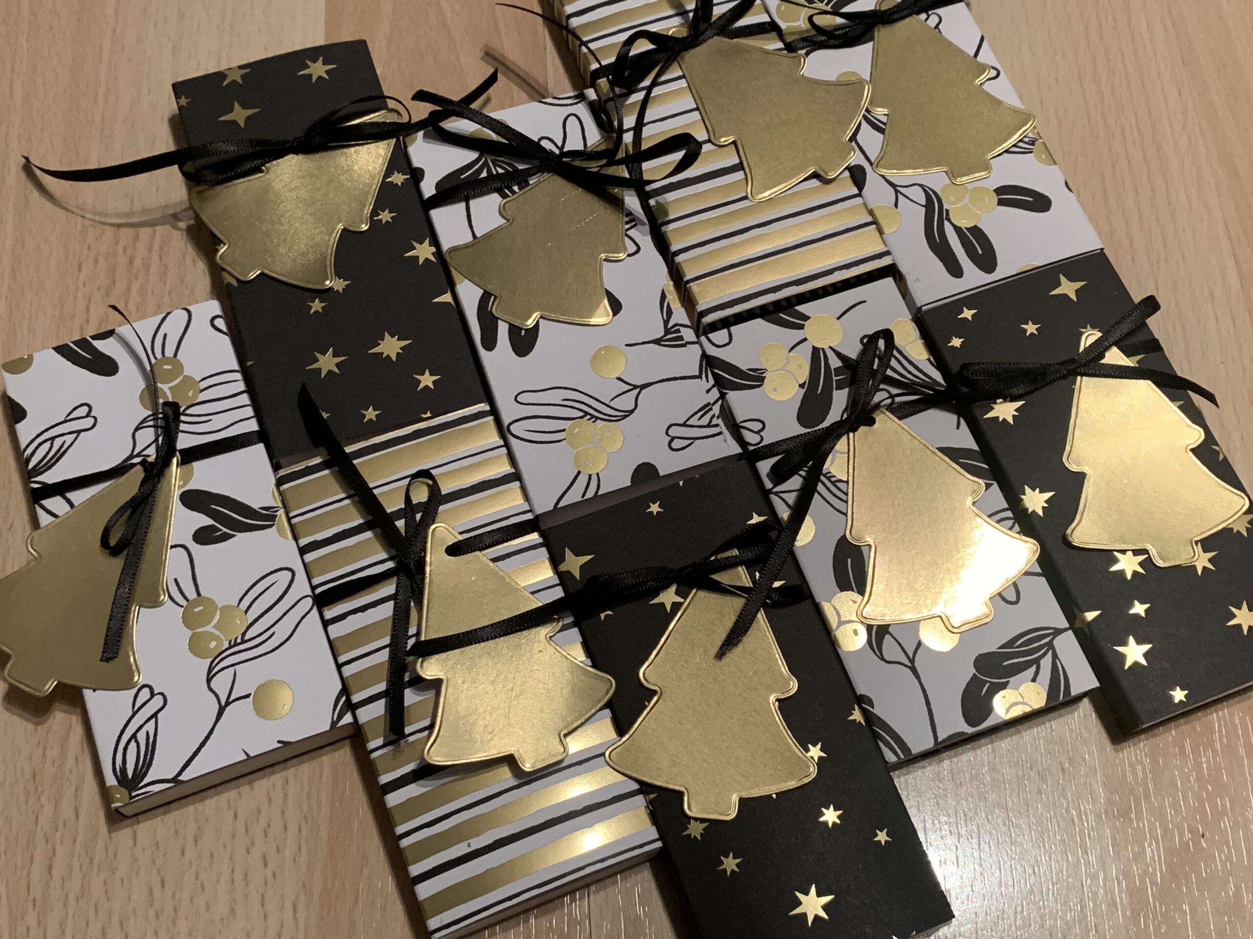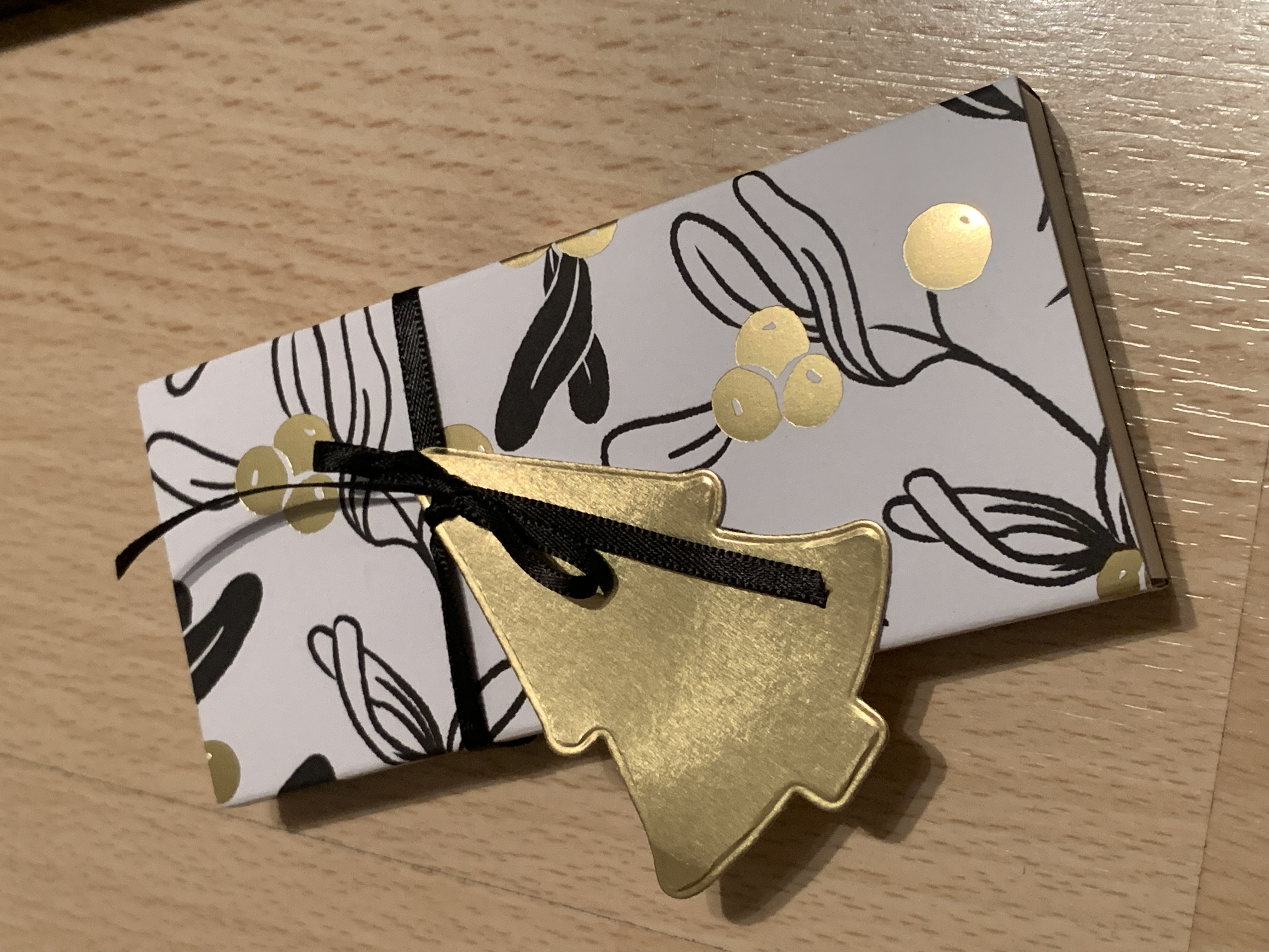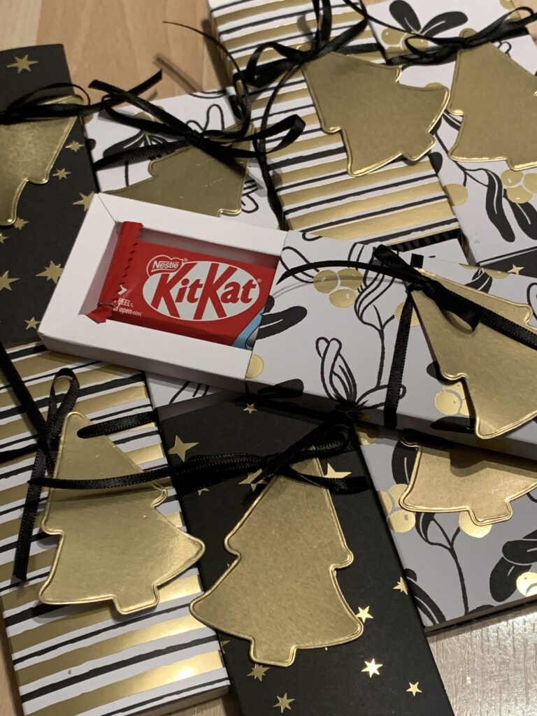Die liebe Patrica hat kleine Kitkats in diesen wirklich schönen Rahmenboxen in Grundweiß verpackt und mit dem Designerpapier „Moderne Weihnacht“ überzogen. Dazu ein gestanzter Tannenbaum in Gold Metallic und ein schwarzes Bändchen. So funkelnd schön! Vielen lieben Dank!