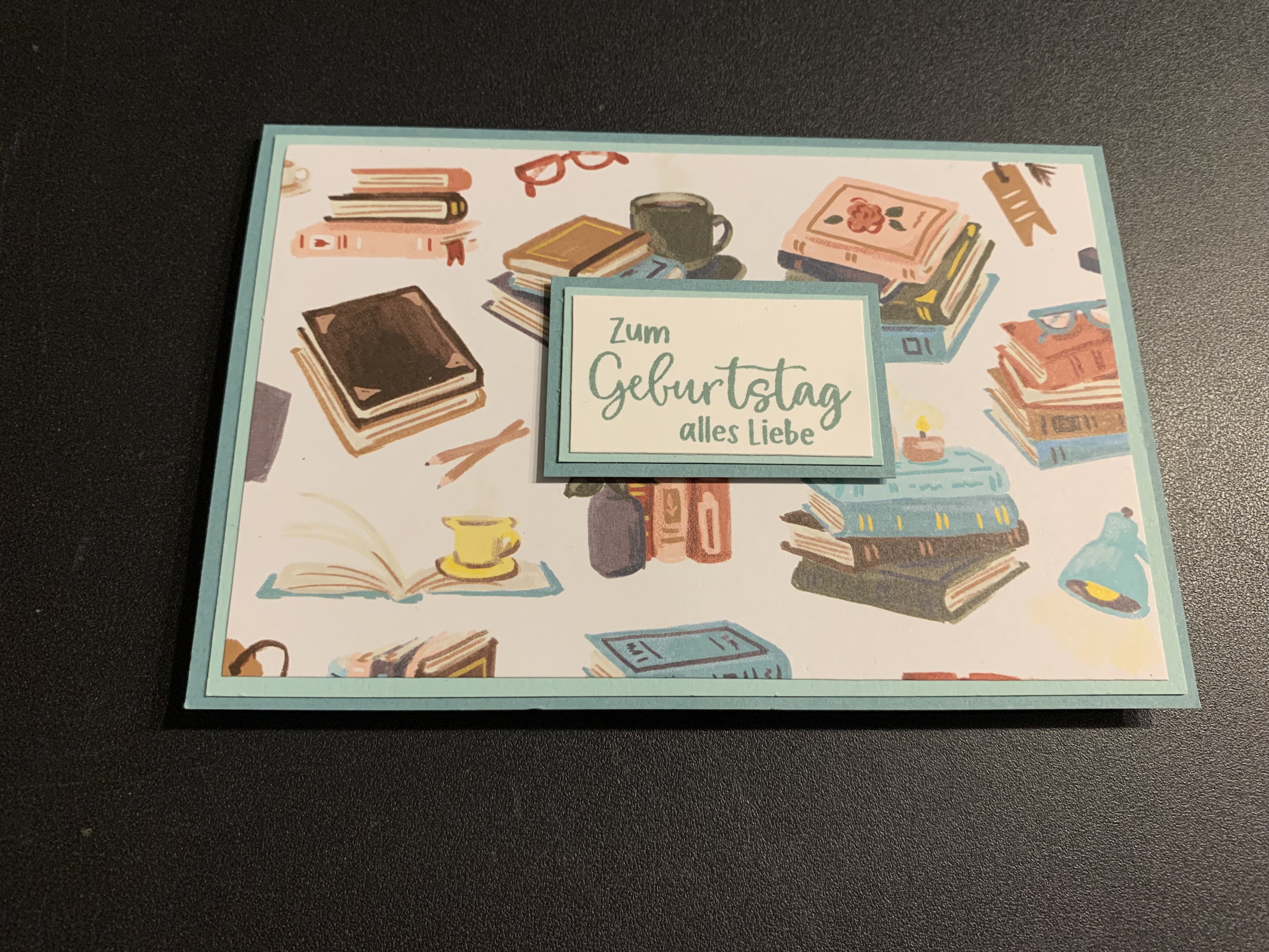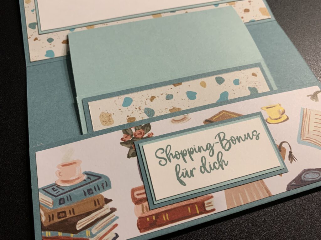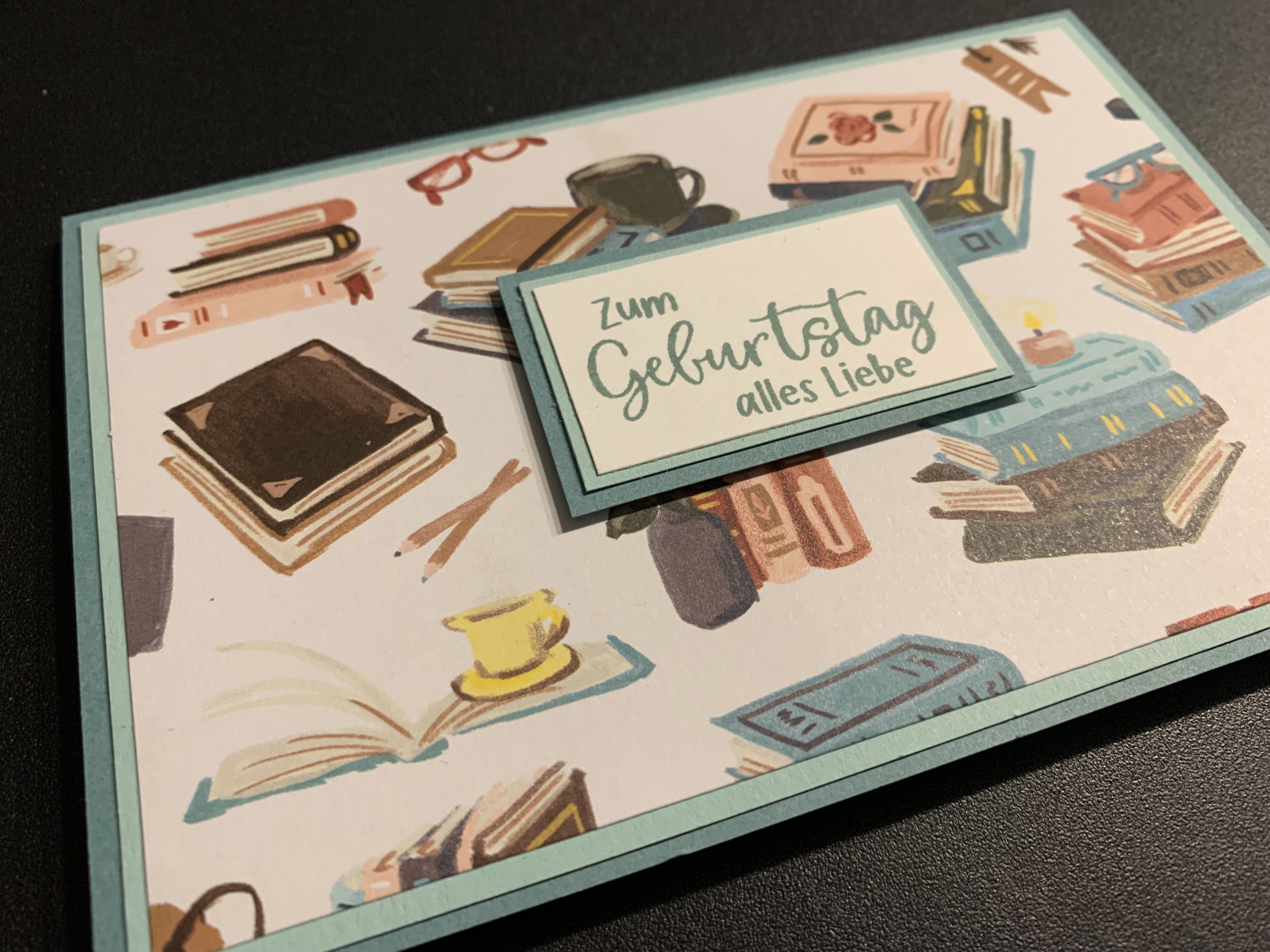 Bereits im Oktober durfte ich diese Pop-Up Gutscheinkarten-Glückwunschkarte zum Geburtstag anfertigen. Die Beschenkte liebt Bücher, bekam auch einen Büchergutschein geschenkt, und so habe ich dieses Designerpapier aus dem Stampin’ Up! Set „Zeit für Hobbys“ verwendet. Dazu habe ich Farbkarton in Grundweiß, Lagunenblau und Aquamarin kombiniert. Auch die Stempel sind von Stampin‘ Up!, teilweise auch aus älteren Sets, aber auch diese dürfen regelmäßig verwendet werden. Ich mag diese Kartenart sehr, schließlich kam man darin perfekt Gutscheinkarten oder auch Geld verschenken. Herzlichen Dank für den Auftrag!