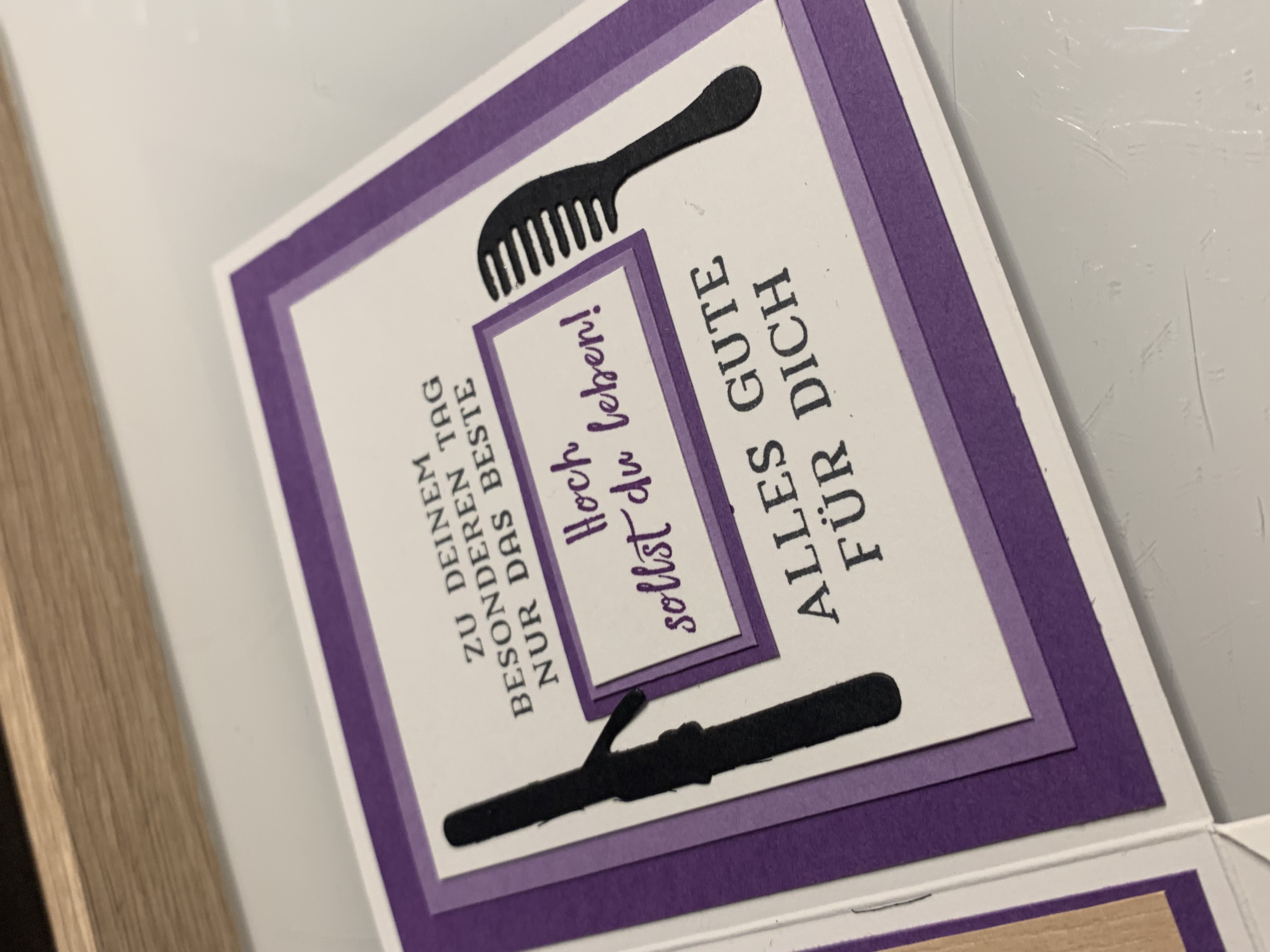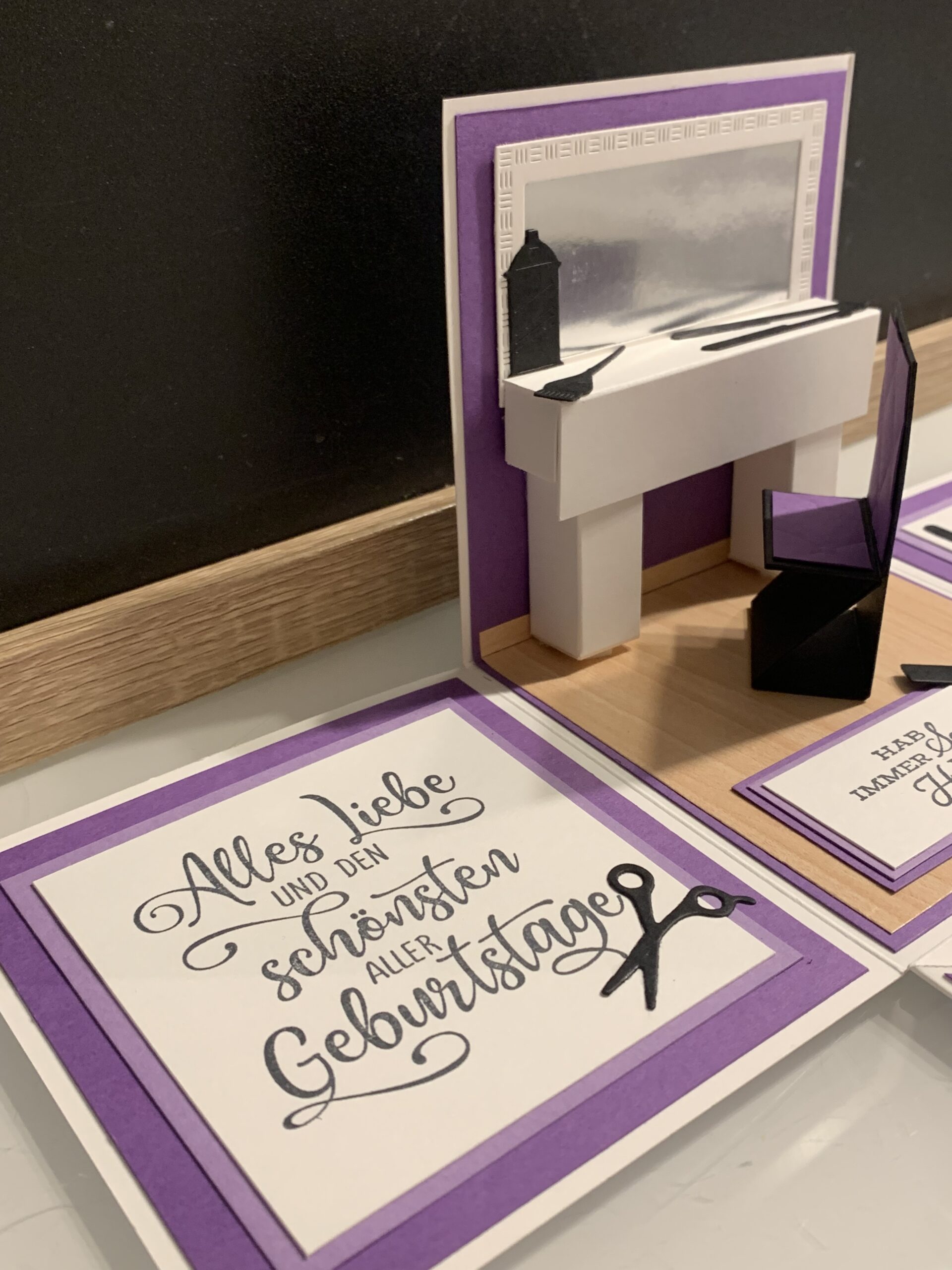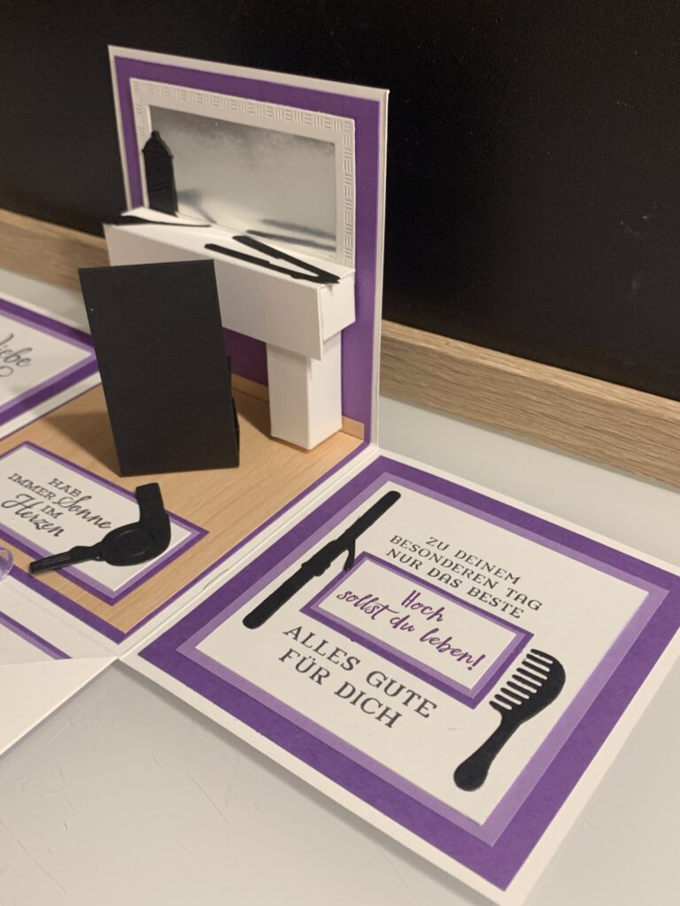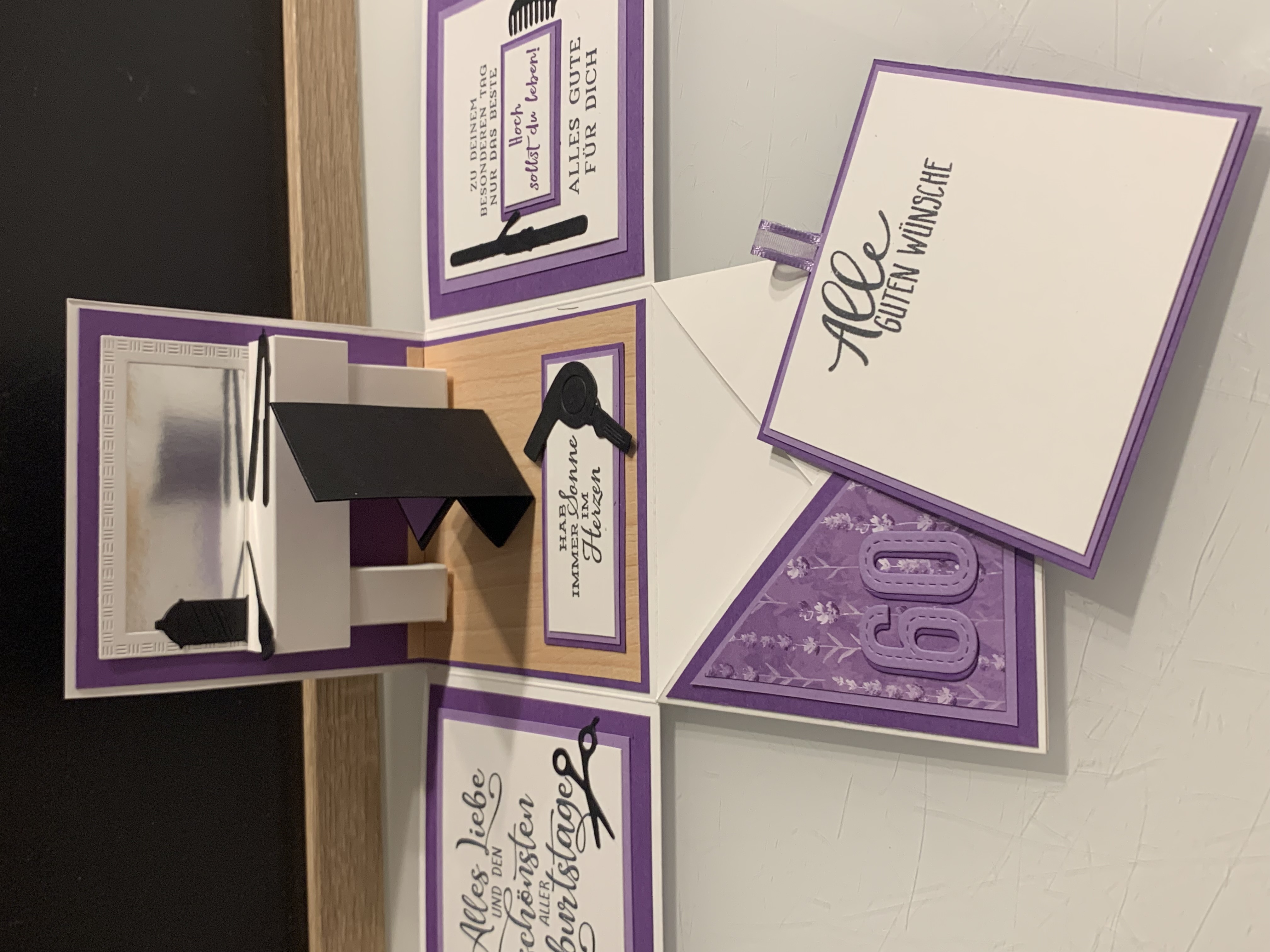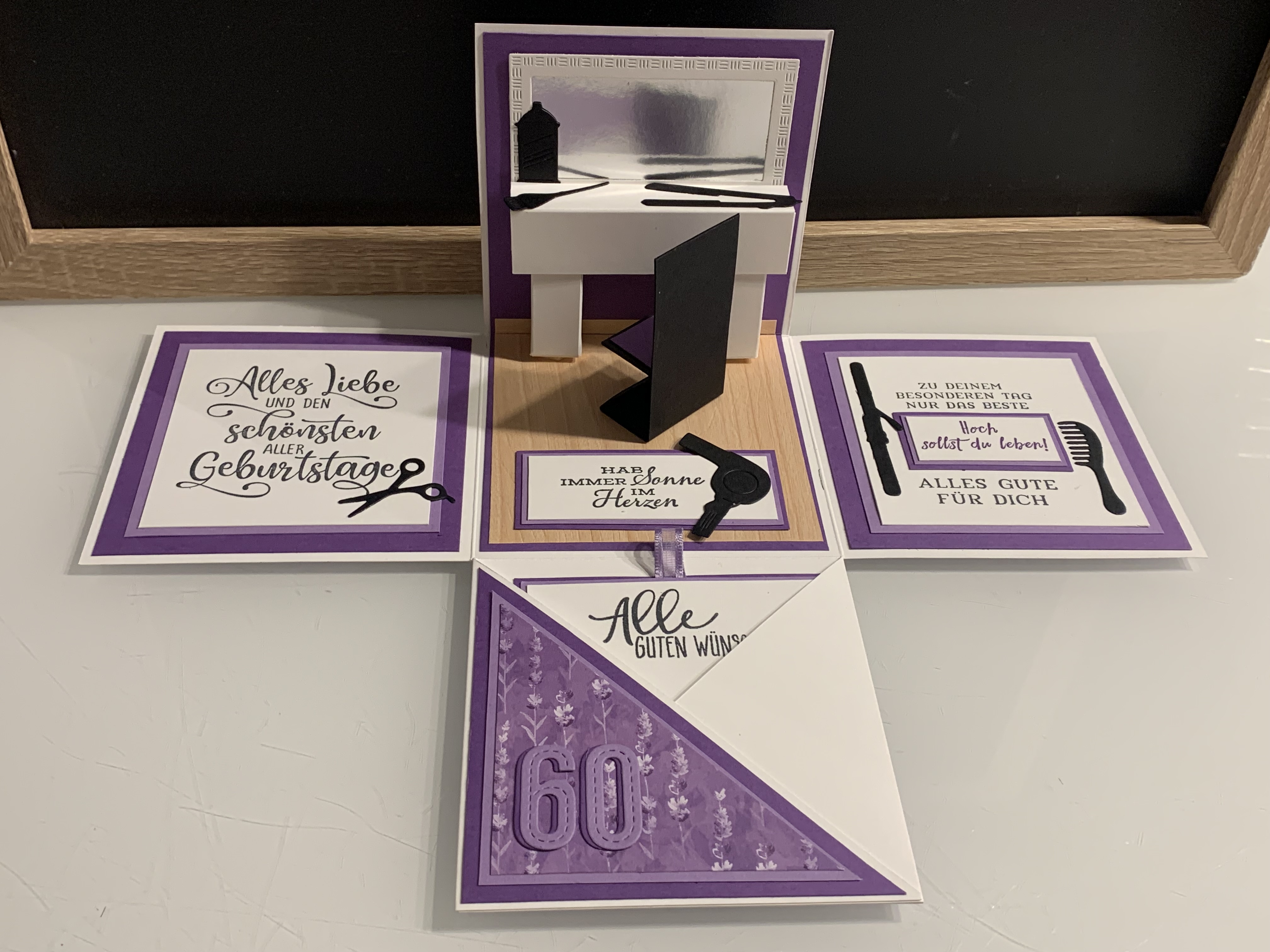 Diese hübsche Explosionsbox durfte ich zum 60. Geburtstag der lieben Margarete anfertigen. Aussen sollte sie eher neutral gehalten werden und zwar in der Lieblingsfarbe. Verwendet habe ich Farbkarton in Amethyst und Heideblüte und das Stampin’ Up! Designerpapier „Lavendelblüte“. Innen habe ich dann einen kleinen Friseur-Arbeitsplatz „gebaut“ und mit ein paar Stanzteilen, passend zum Thema, dekoriert. Herzlichen Dank für die Bestellung, ich hoffe die Überraschungsbox hat ihr gefallen! ❤️