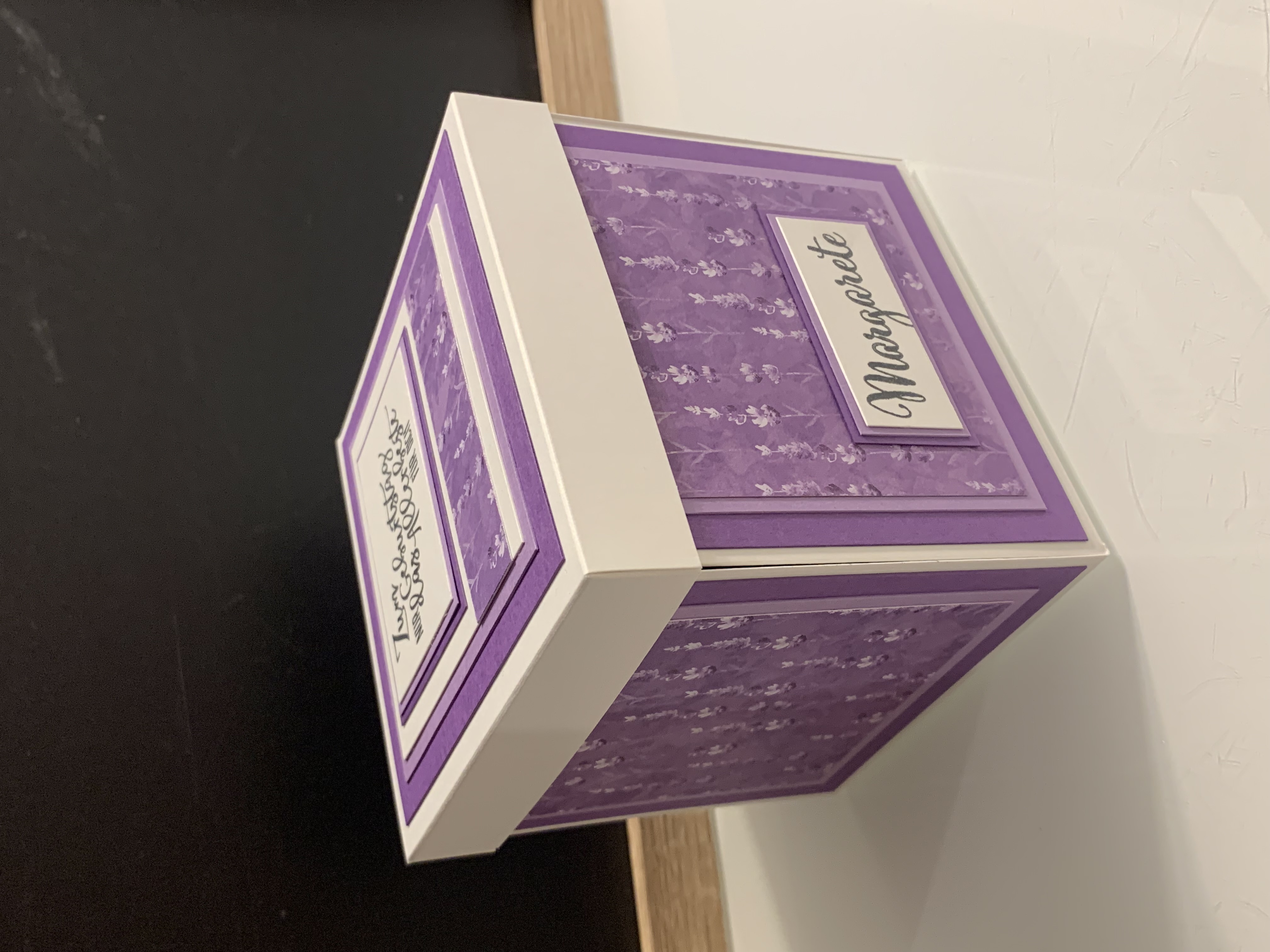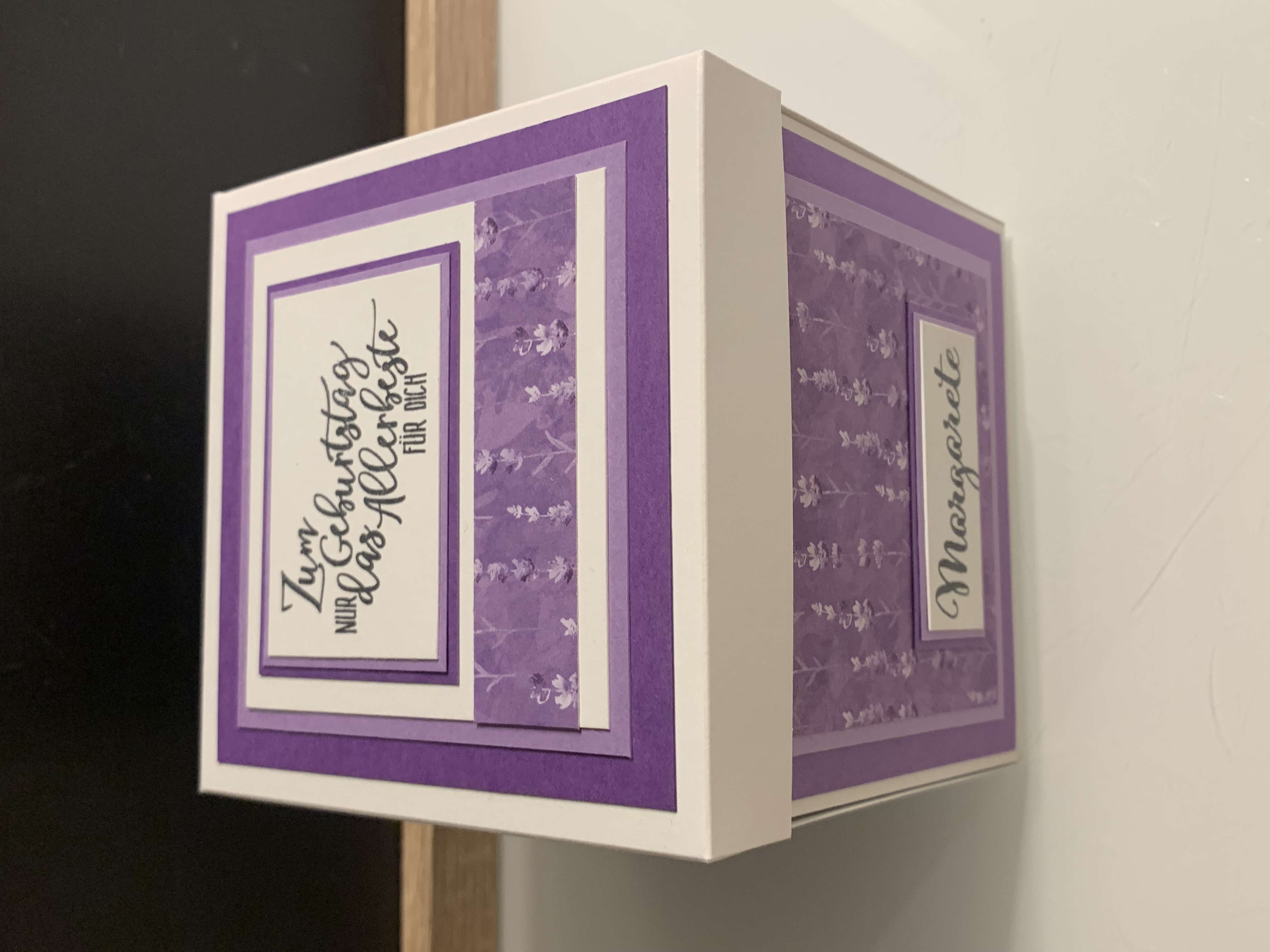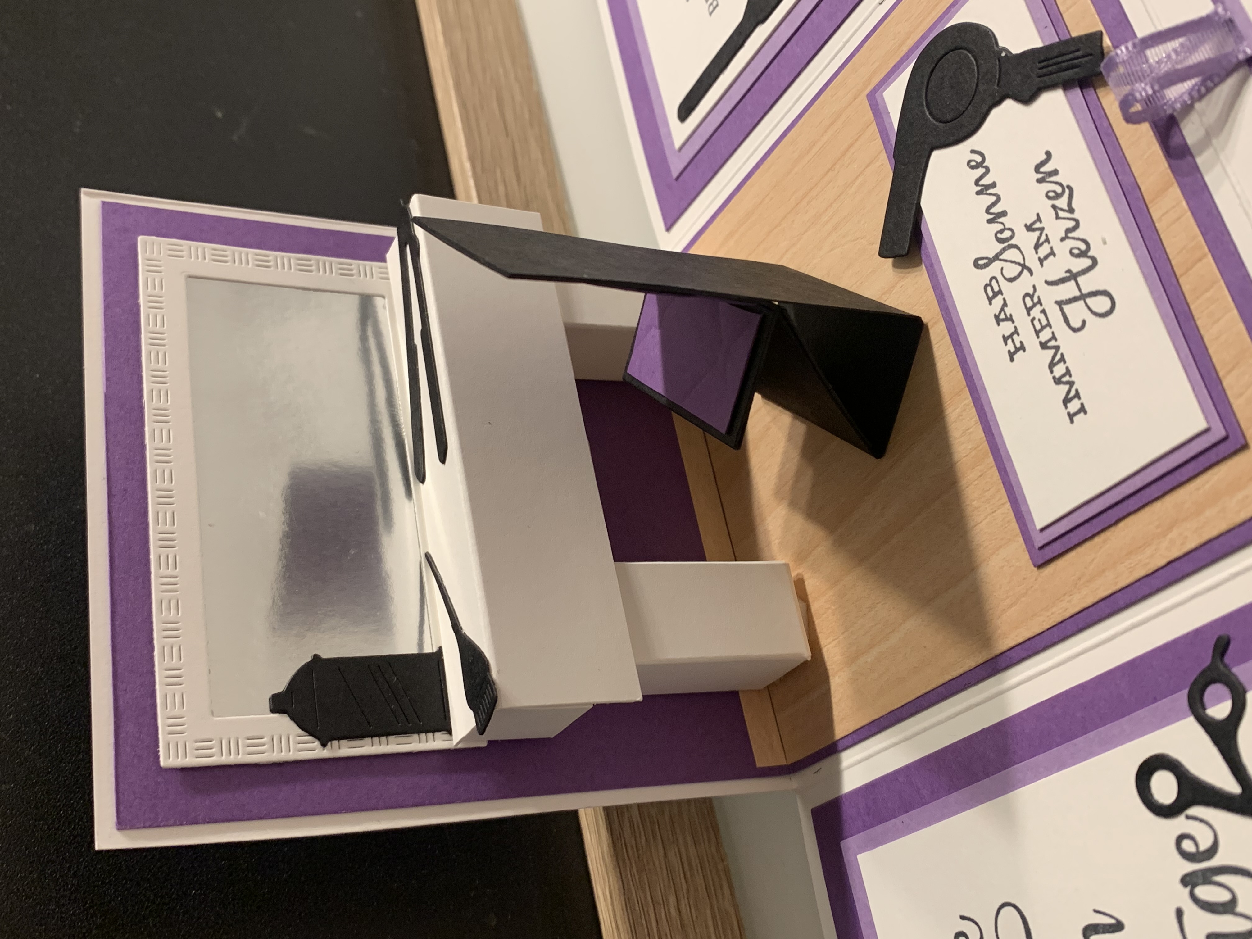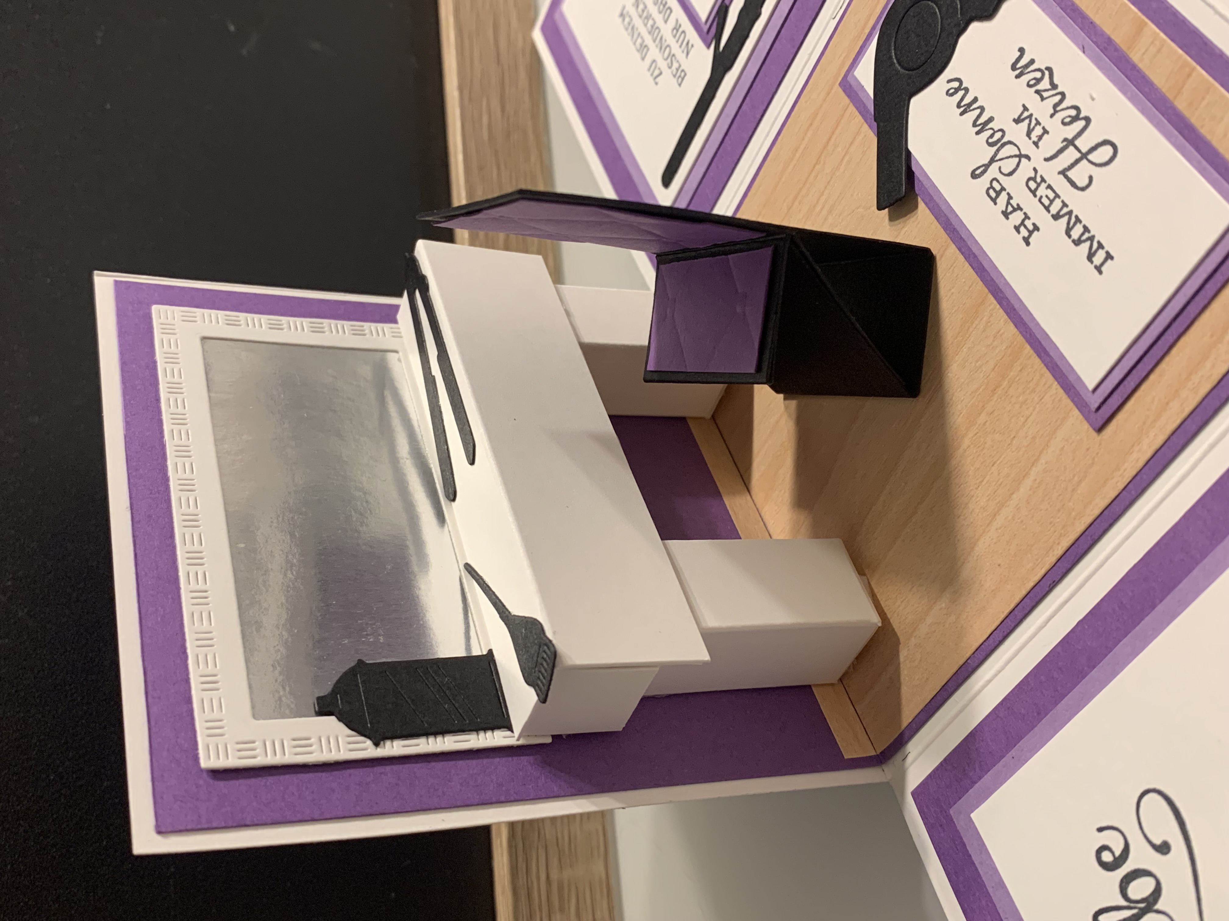 Diese hübsche Explosionsbox durfte ich zum 60. Geburtstag der lieben Margarete anfertigen. Aussen sollte sie eher neutral gehalten werden und zwar in der Lieblingsfarbe. Verwendet habe ich Farbkarton in Amethyst und Heideblüte und das Stampin’ Up! Designerpapier „Lavendelblüte“. Innen habe ich dann einen kleinen Friseur-Arbeitsplatz „gebaut“ und mit ein paar Stanzteilen, passend zum Thema, dekoriert. Herzlichen Dank für die Bestellung, ich hoffe die Überraschungsbox hat ihr gefallen! ❤️