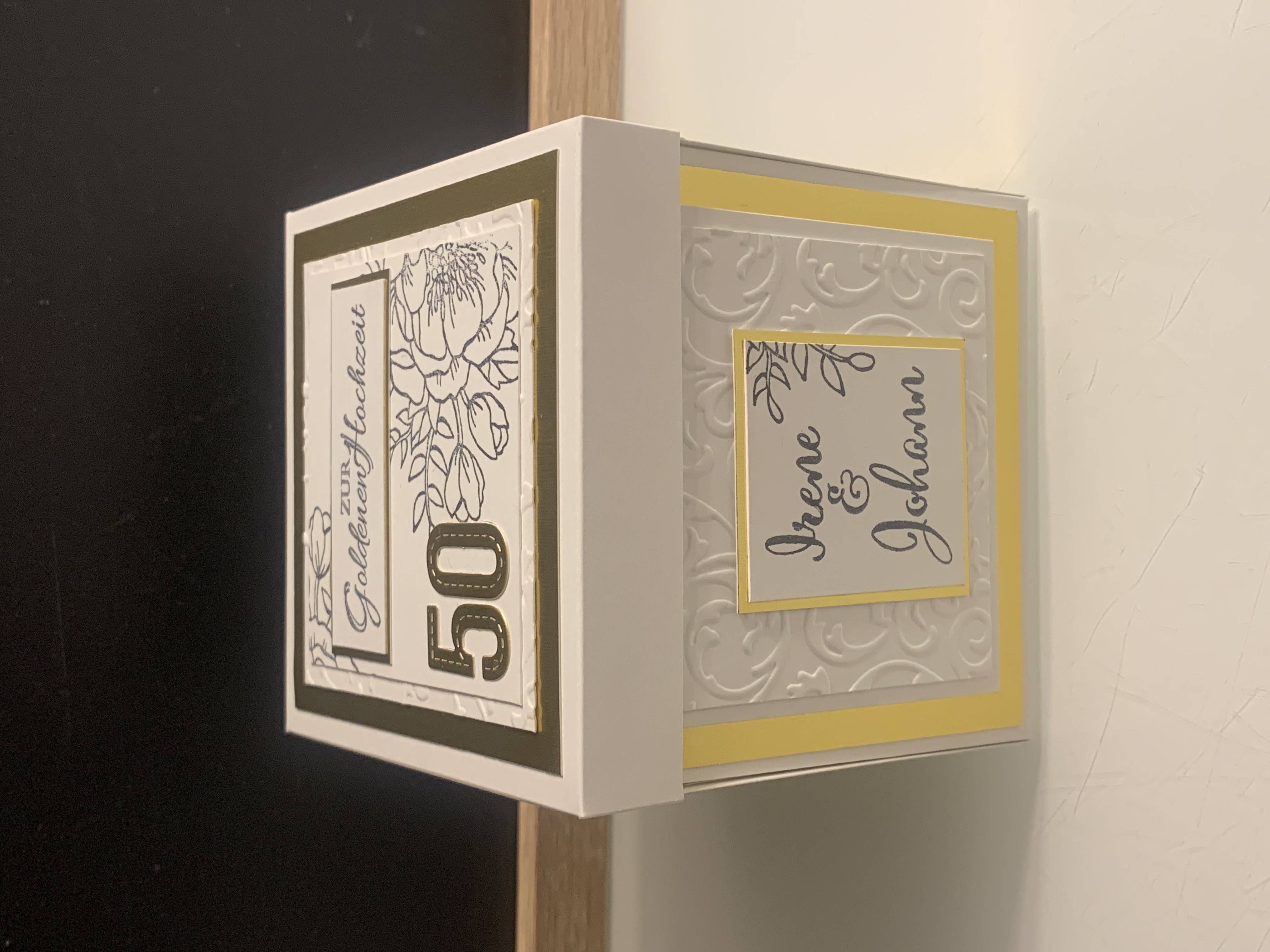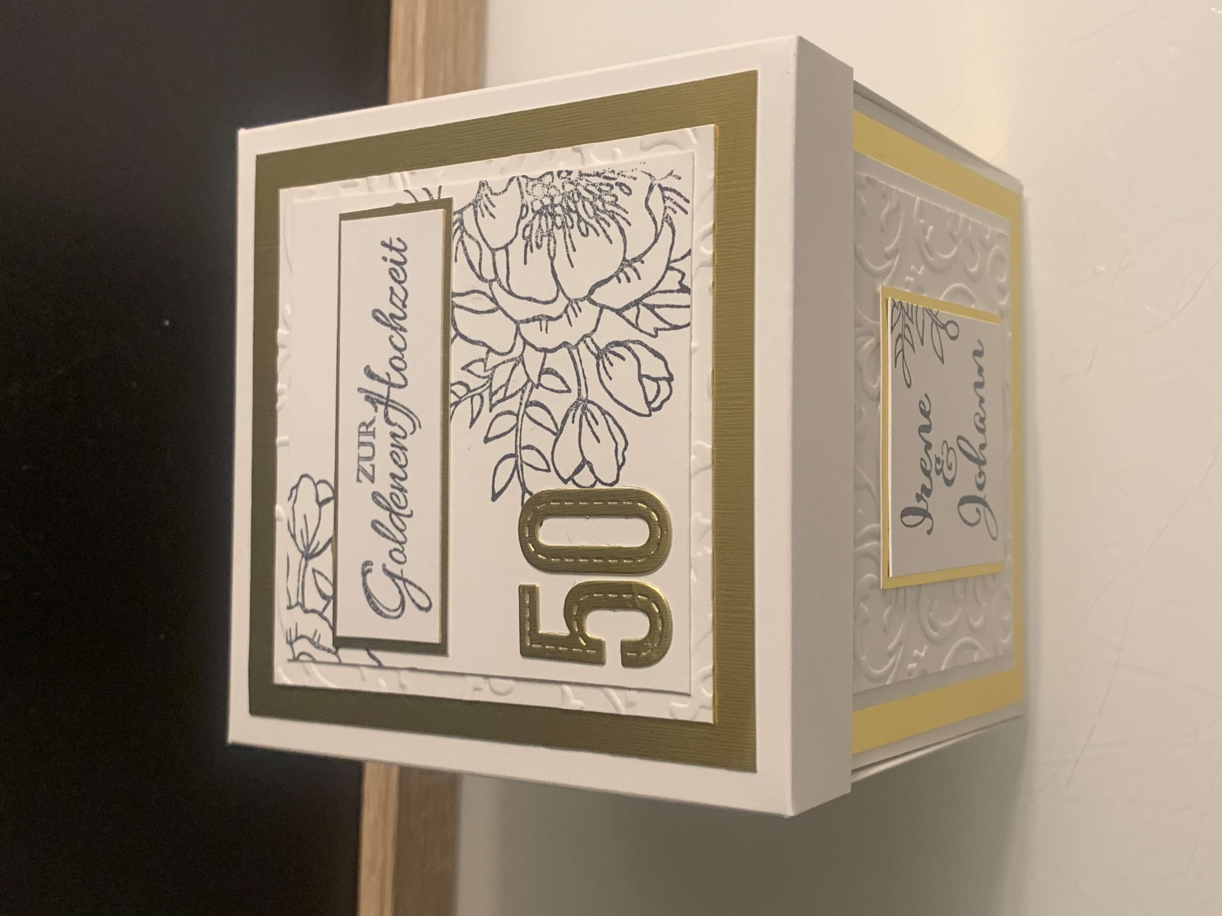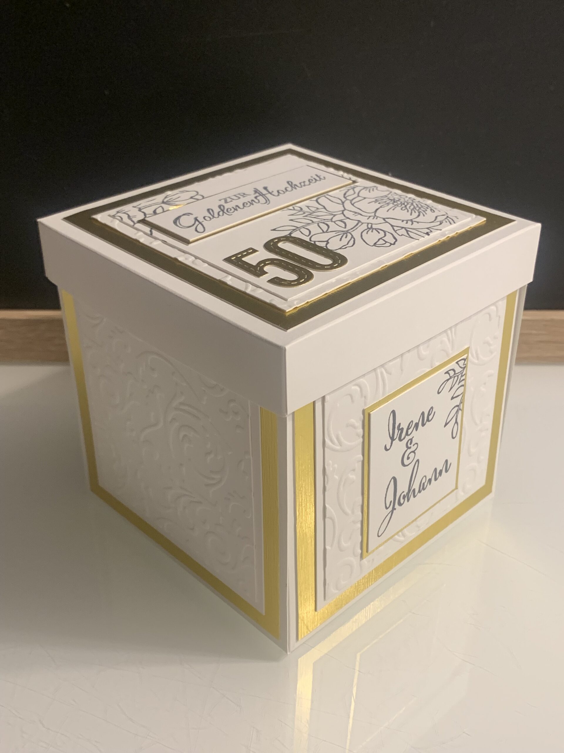 Zur Goldenen Hochzeit von Irene und Johann durfte ich diese Explosionsbox in Weiß und Gold anfertigen. Außen habe ich den Farbkarton elegant geprägt, die Schriftzüge und Motive habe ich in Memento Smoking Schwarz gestempelt. Innen befindet sich außerdem noch Platz für das Geldgeschenk in der Curvy Keepsake Box. Wie schön, dass es auch noch solch wunderbare Anlässe zum Feiern gibt! Mögen noch viele, viele weitere glückliche Ehejahre dazukommen! Vielen Dank für die Bestellung!