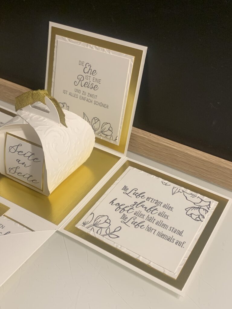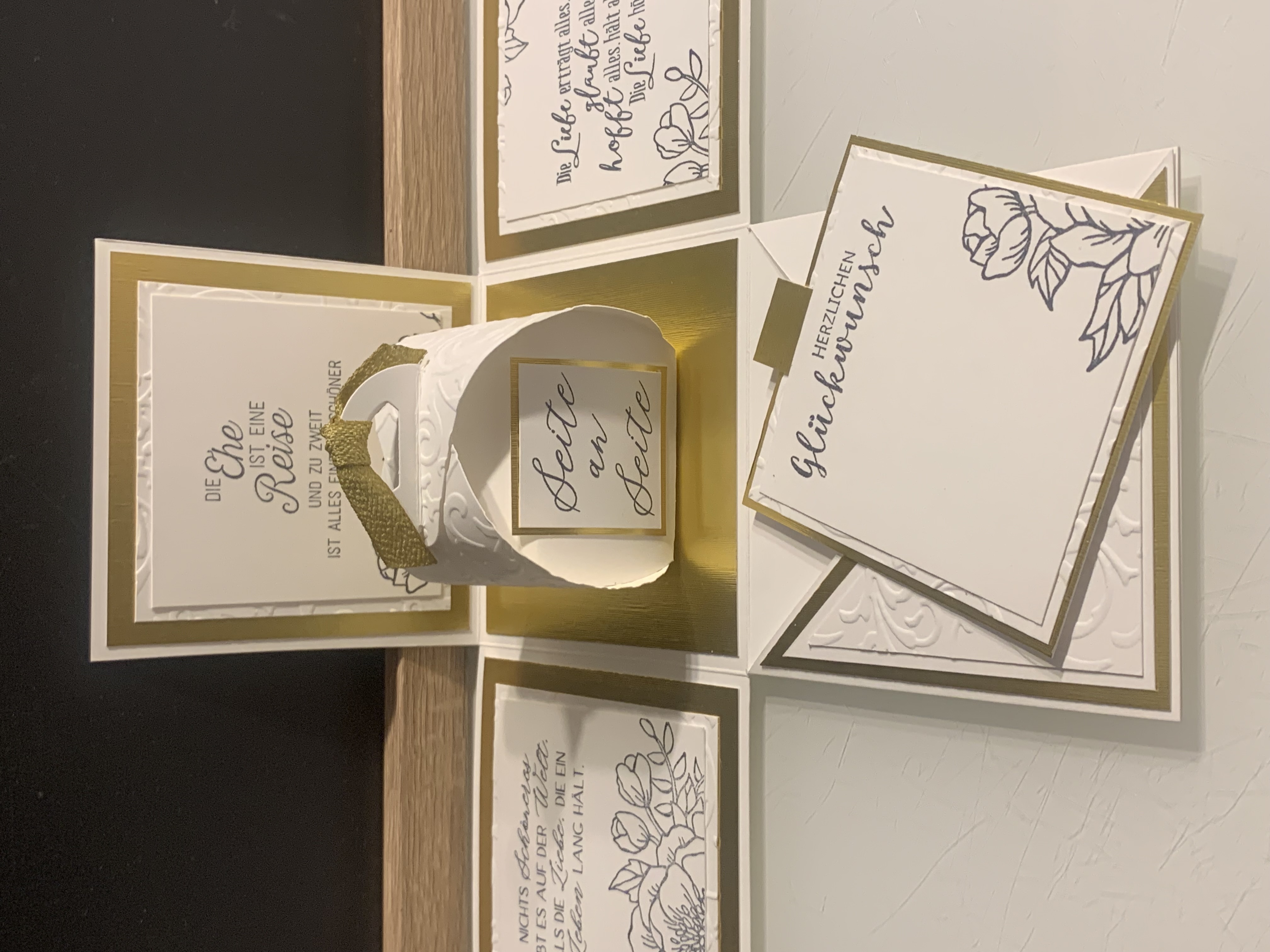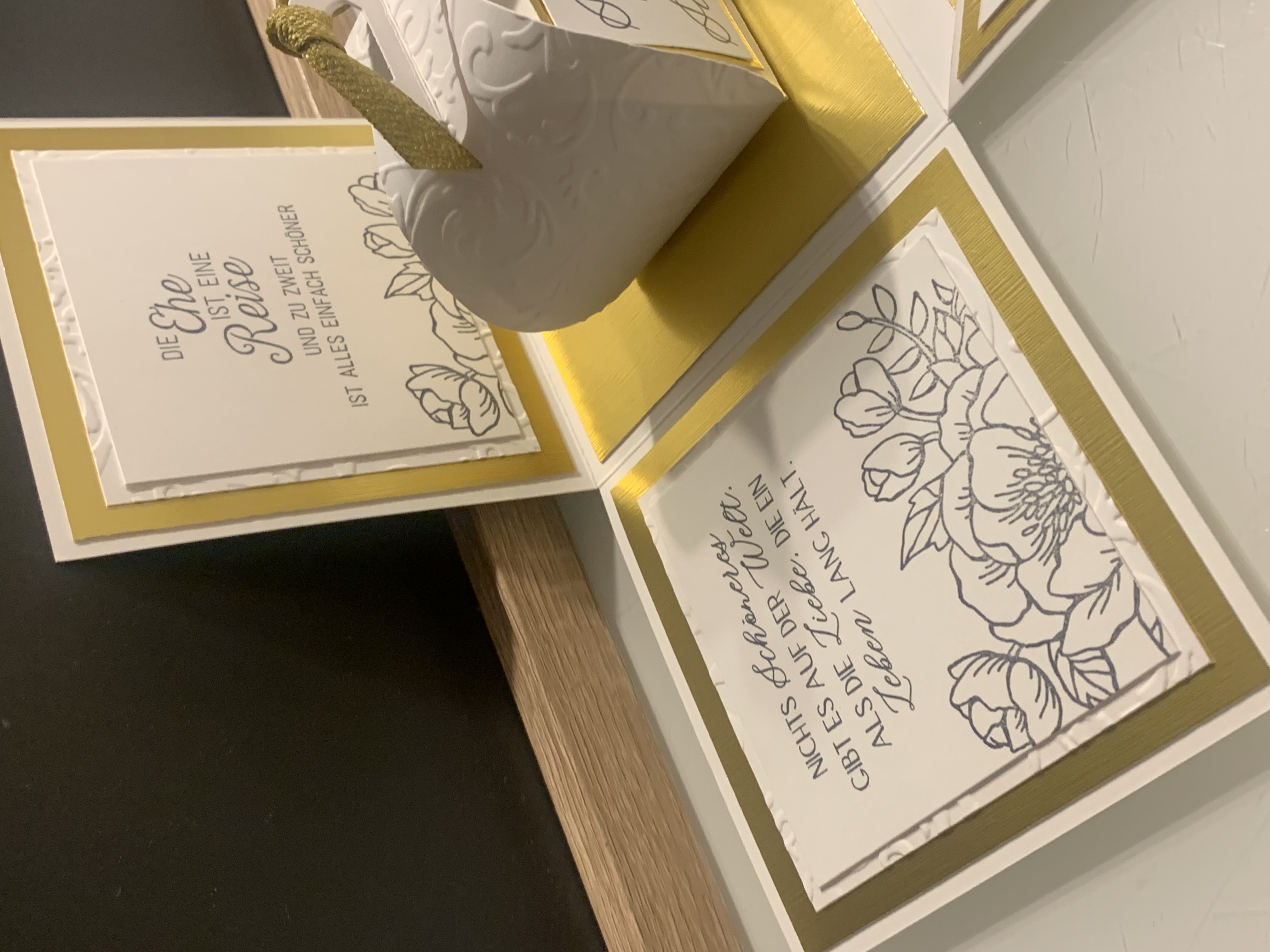 Zur Goldenen Hochzeit von Irene und Johann durfte ich diese Explosionsbox in Weiß und Gold anfertigen. Außen habe ich den Farbkarton elegant geprägt, die Schriftzüge und Motive habe ich in Memento Smoking Schwarz gestempelt. Innen befindet sich außerdem noch Platz für das Geldgeschenk in der Curvy Keepsake Box. Wie schön, dass es auch noch solch wunderbare Anlässe zum Feiern gibt! Mögen noch viele, viele weitere glückliche Ehejahre dazukommen! Vielen Dank für die Bestellung!