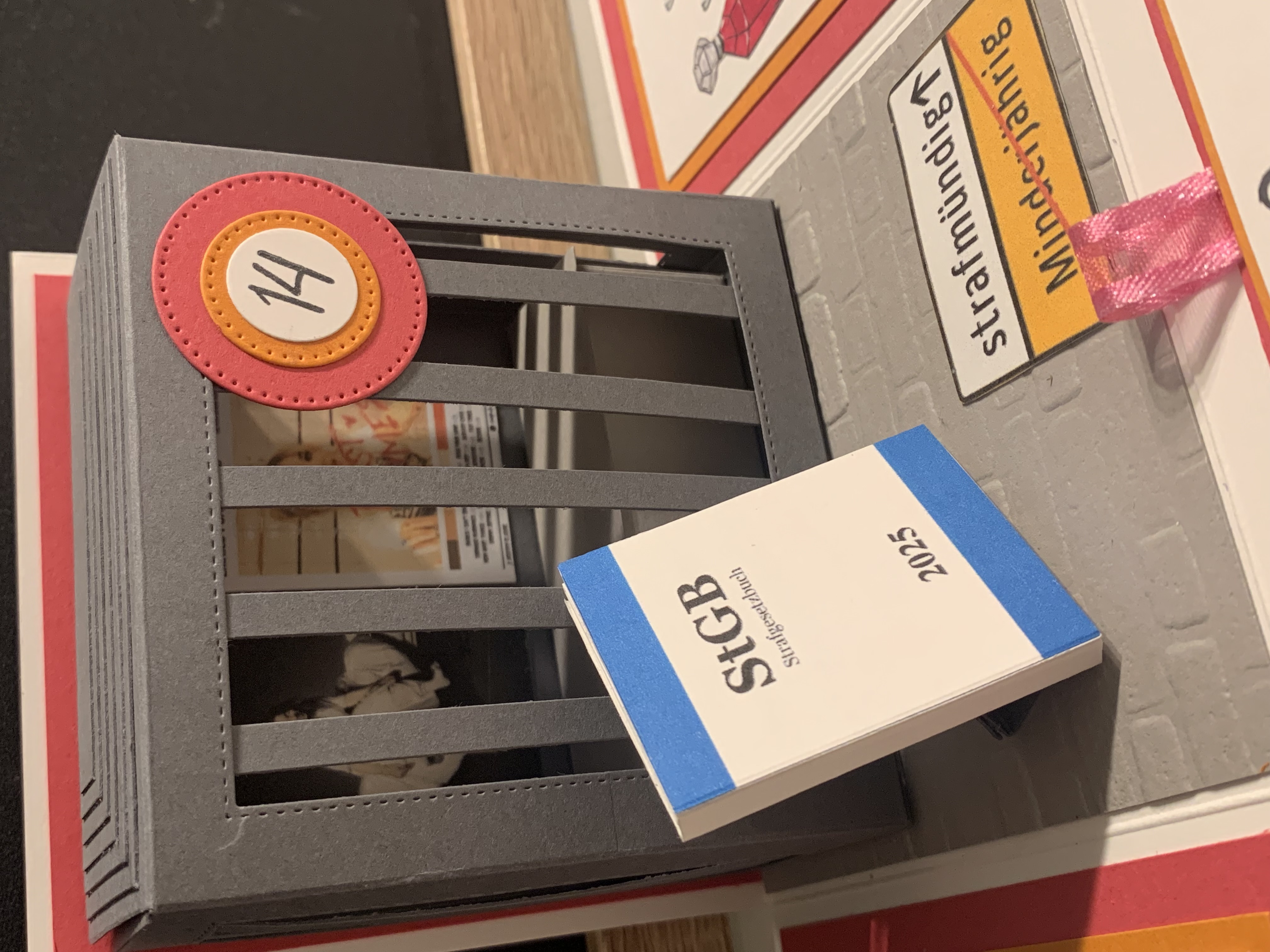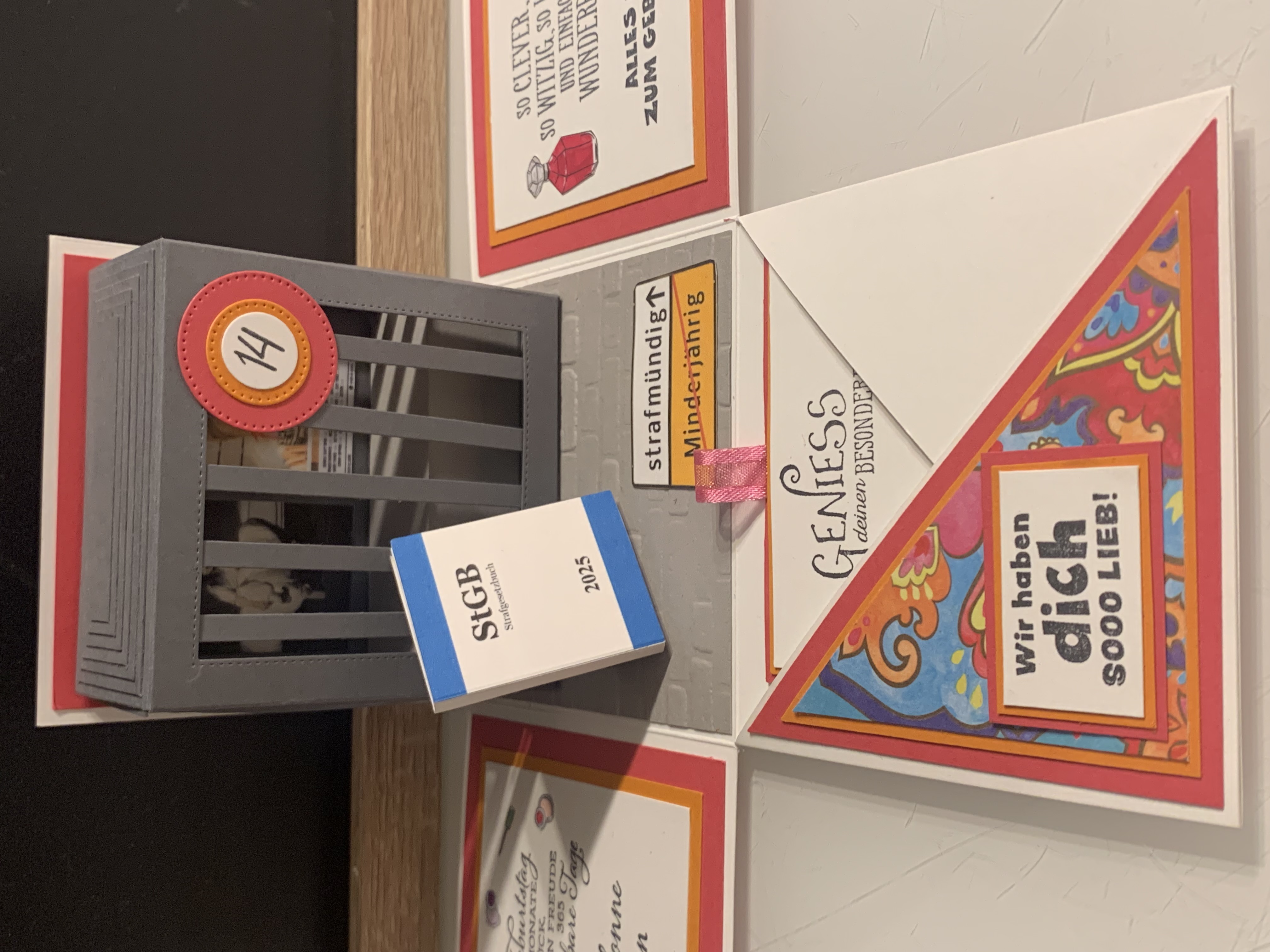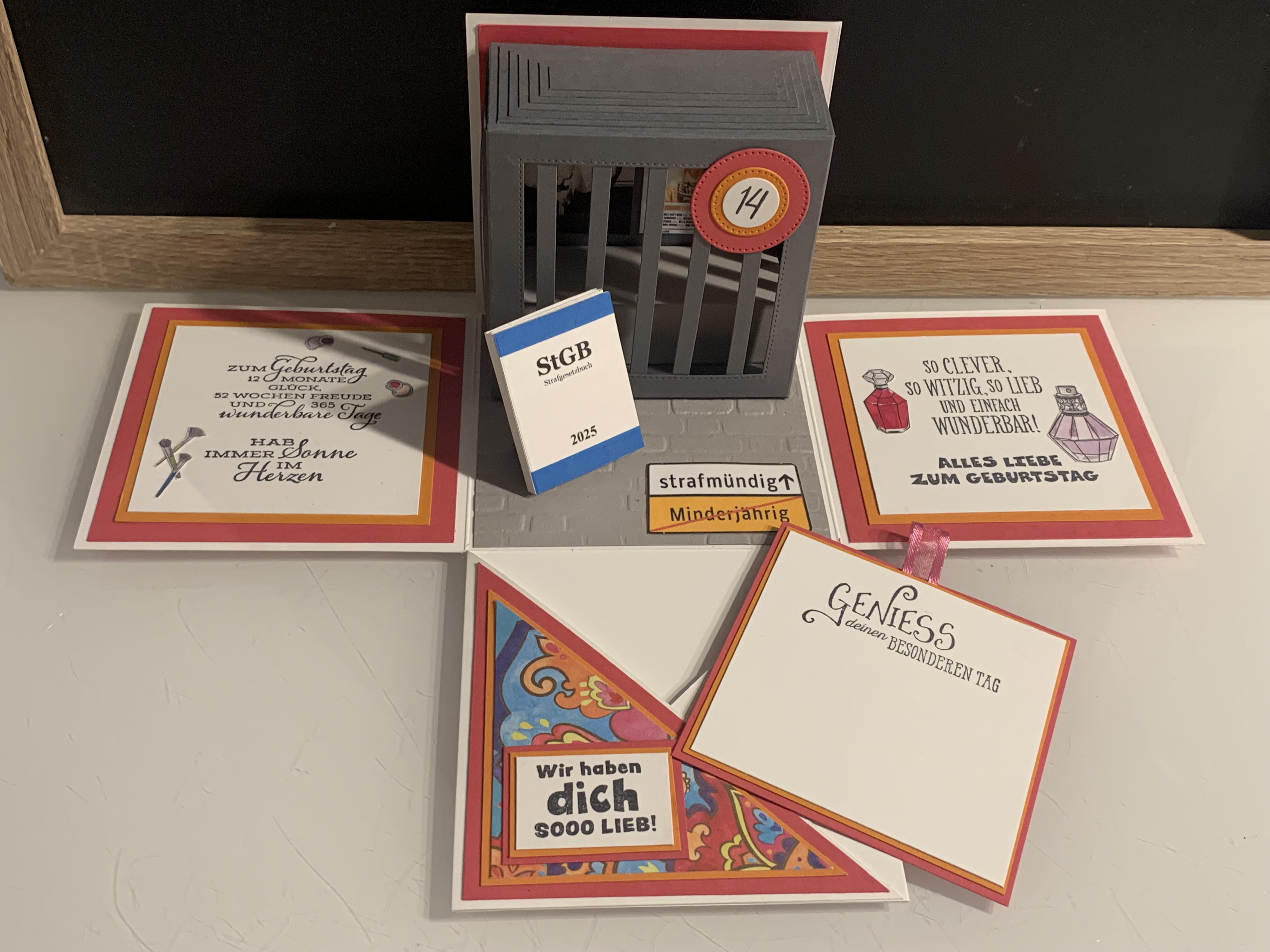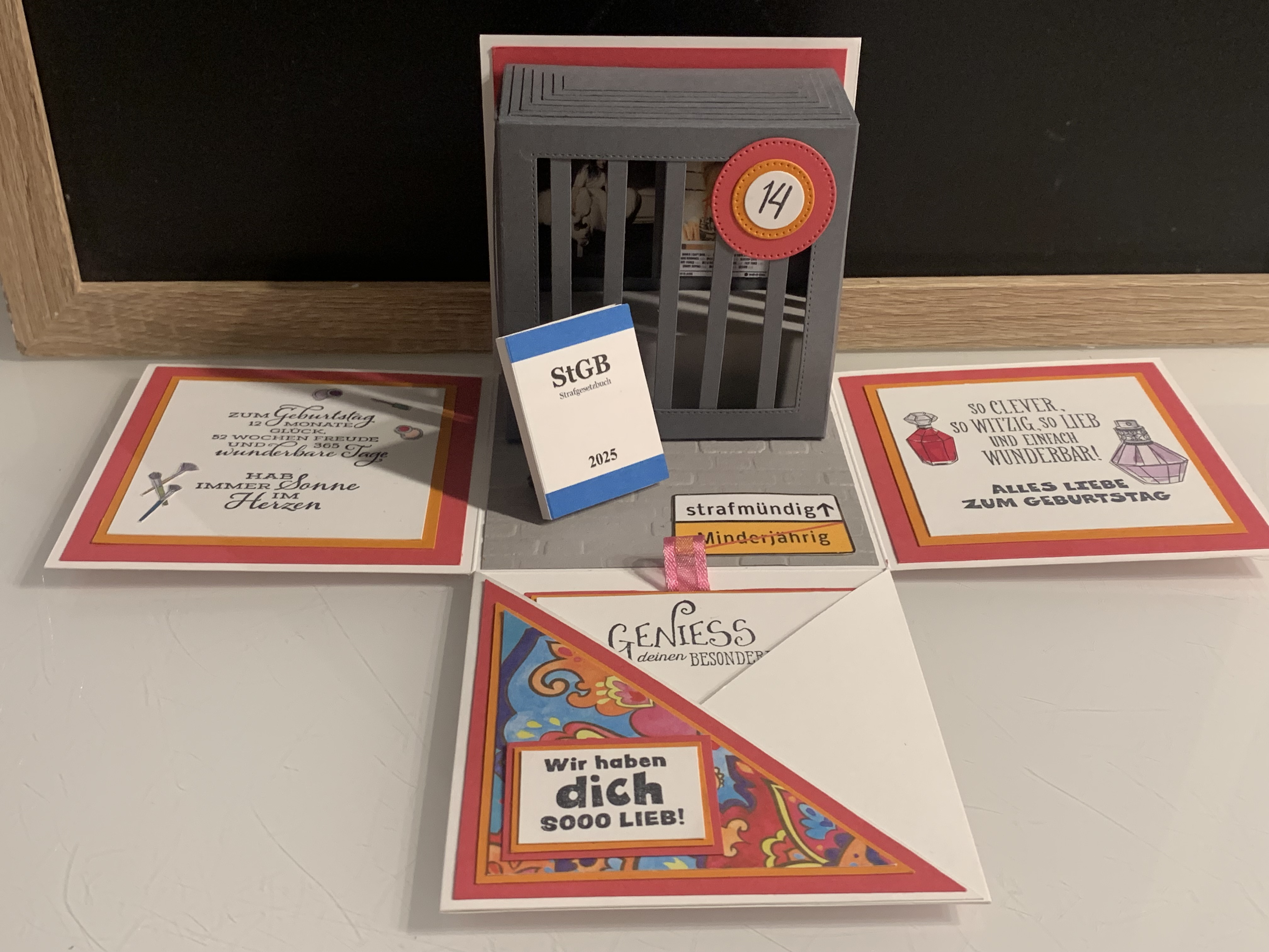 Die Eltern der lieben Anna haben diese Explosionsbox für deren 14. Geburtstag bei mir bestellt. Nachdem man in dem Alter strafmündig wird, wollten sie das Thema gerne aufgreifen, ansonsten sollte die Überraschungsbox durchaus knallig sein was die Farben betrifft. Zu dem coolen Designerpapier von Alexandra Renke habe ich Stampin‘ Up! Farbkarton in Wassermelone und Kürbisgelb verwendet, innen habe ich ein kleines „Gefängnis“ gebaut, in das auch das Pandora Armband, das sie geschenkt bekam, passen sollte, plus kleiner Pritsche und Postern an der Wand. Außerdem sind gerade Make-up und Parfum interessant, daher habe ich diese Themen an den Seiten links und rechts ein wenig aufgegriffen! Das war wirklich ein cooler, aber durchaus fordernder Auftrag! Herzlichen Dank dafür, hat Spaß gemacht! Hoffe Anna hat sich über die Box gefreut!