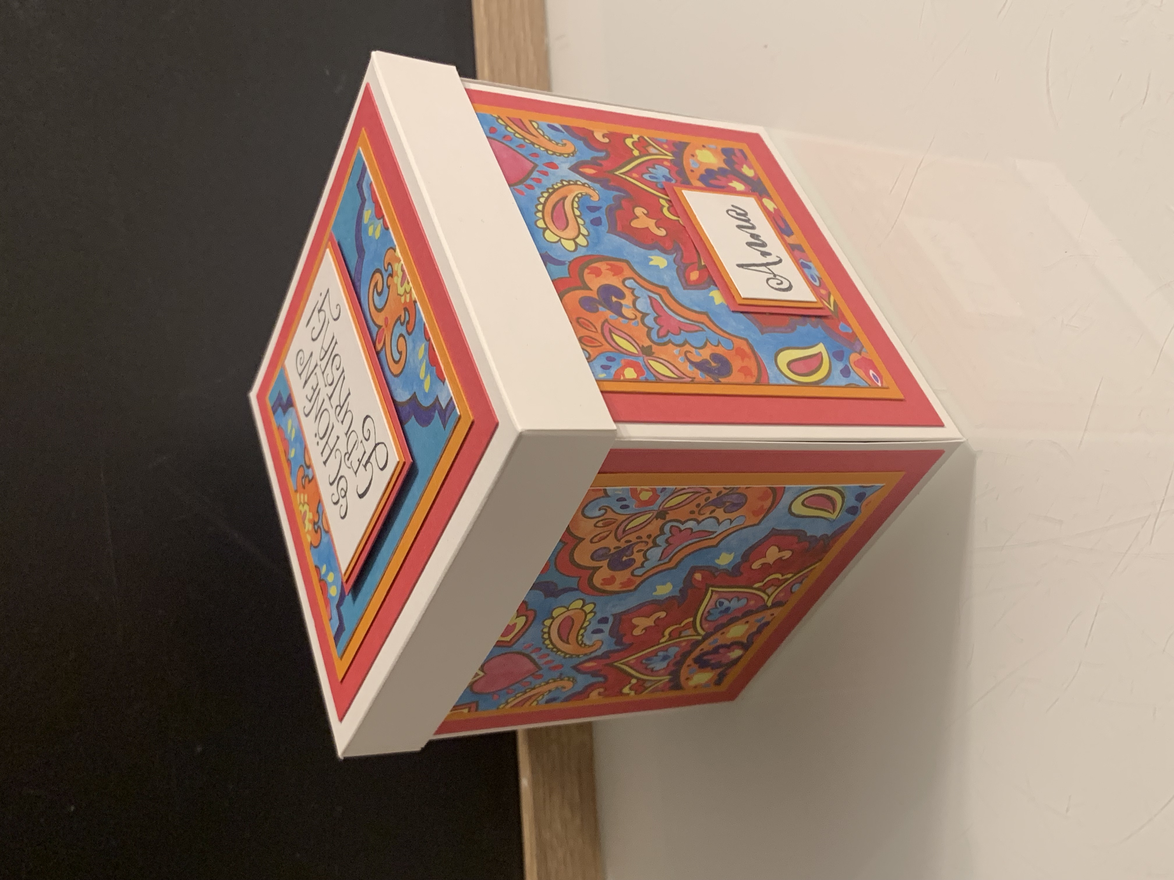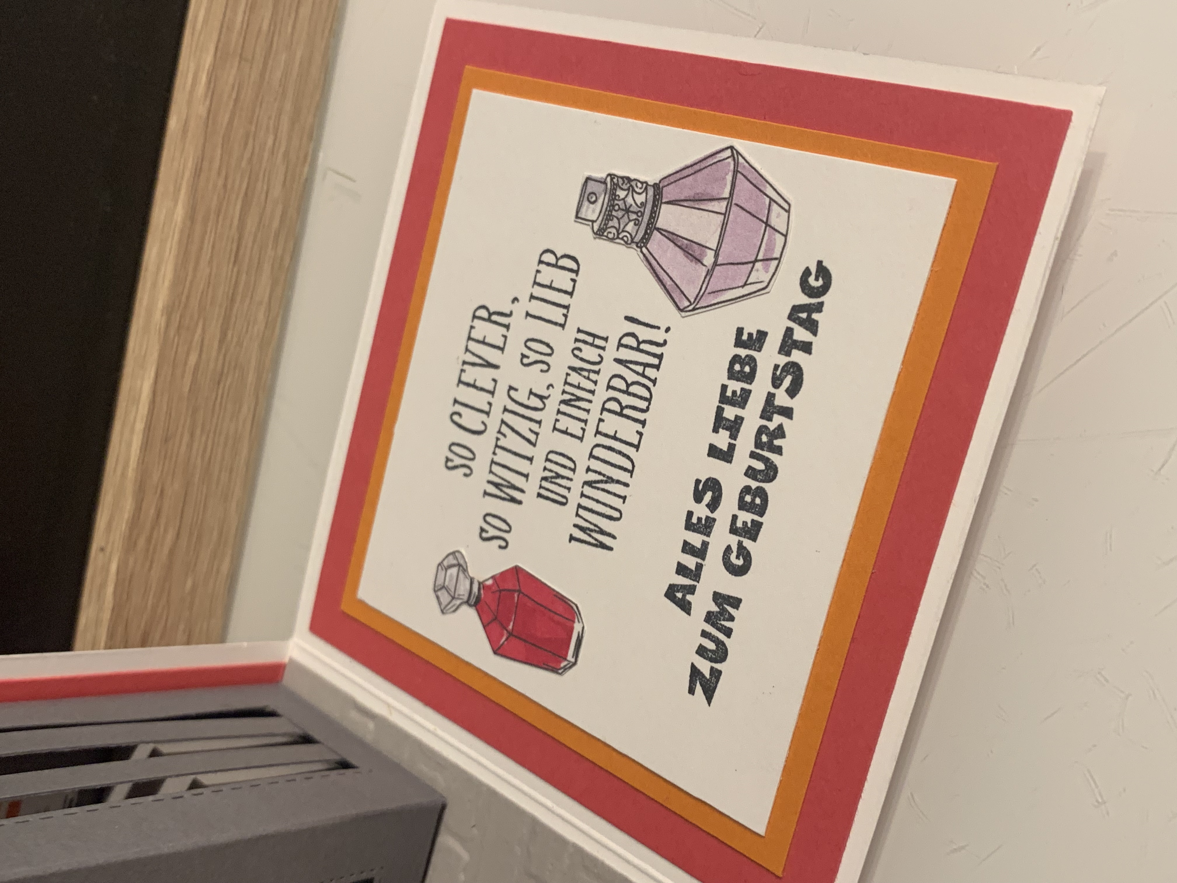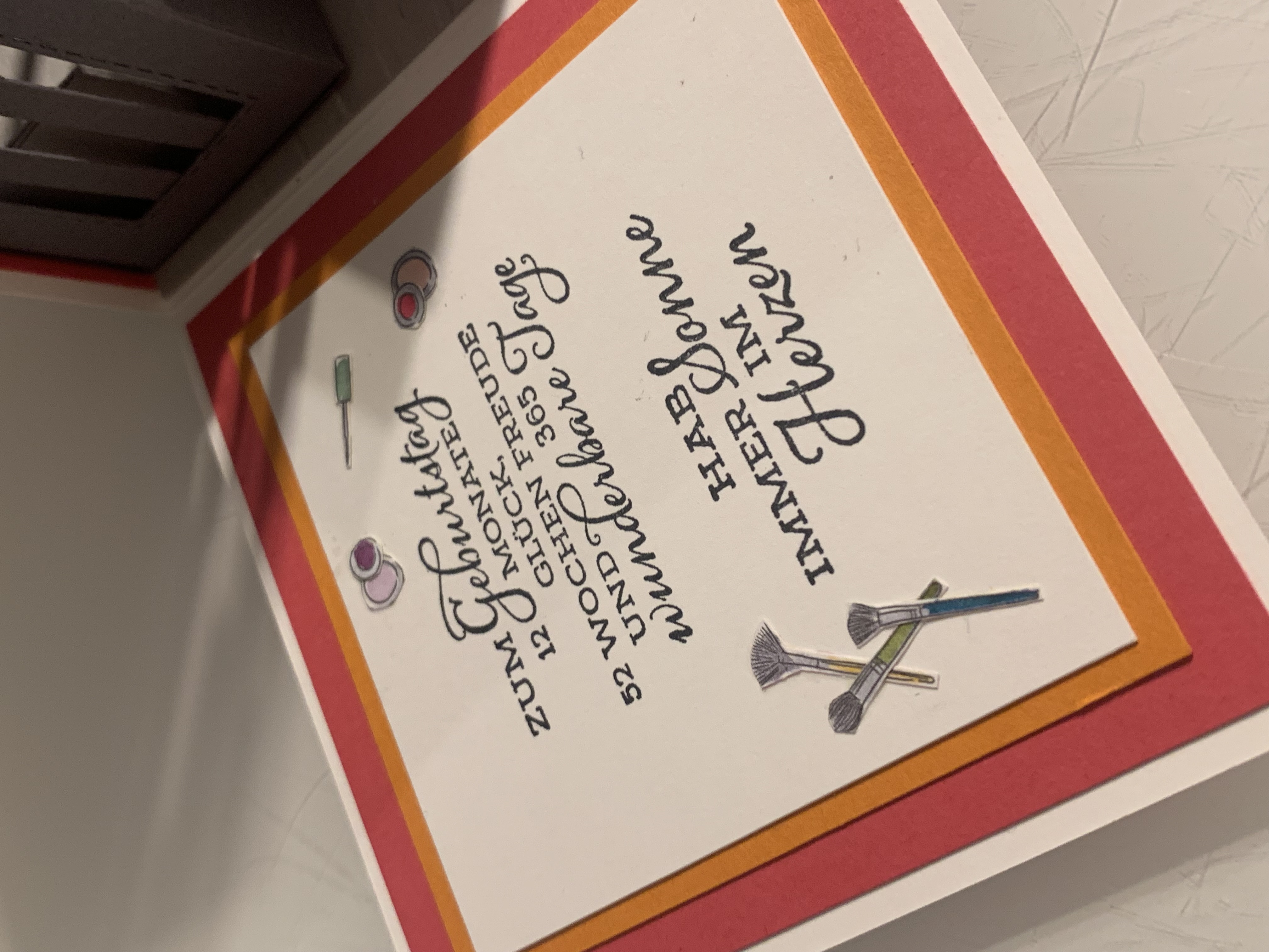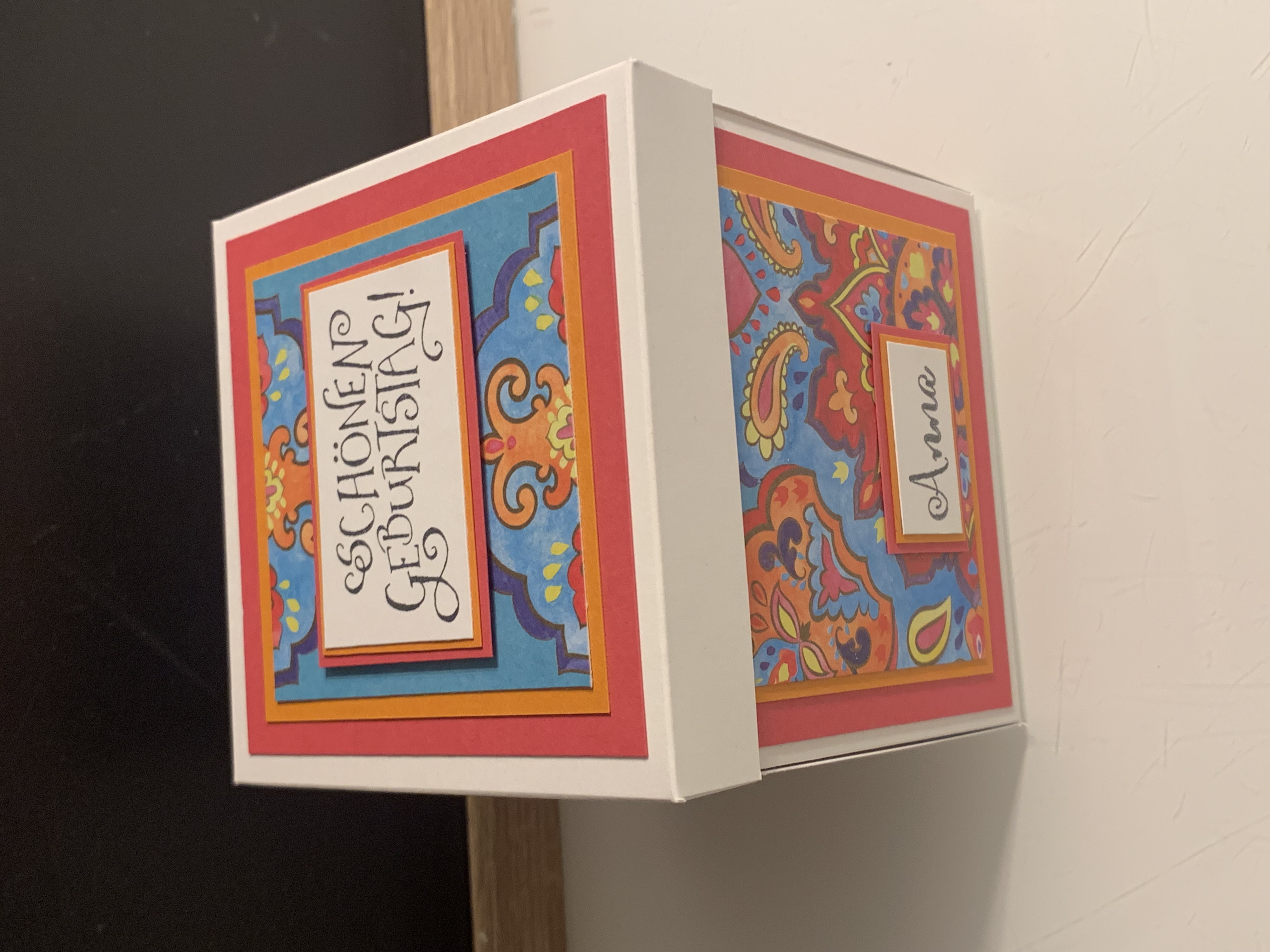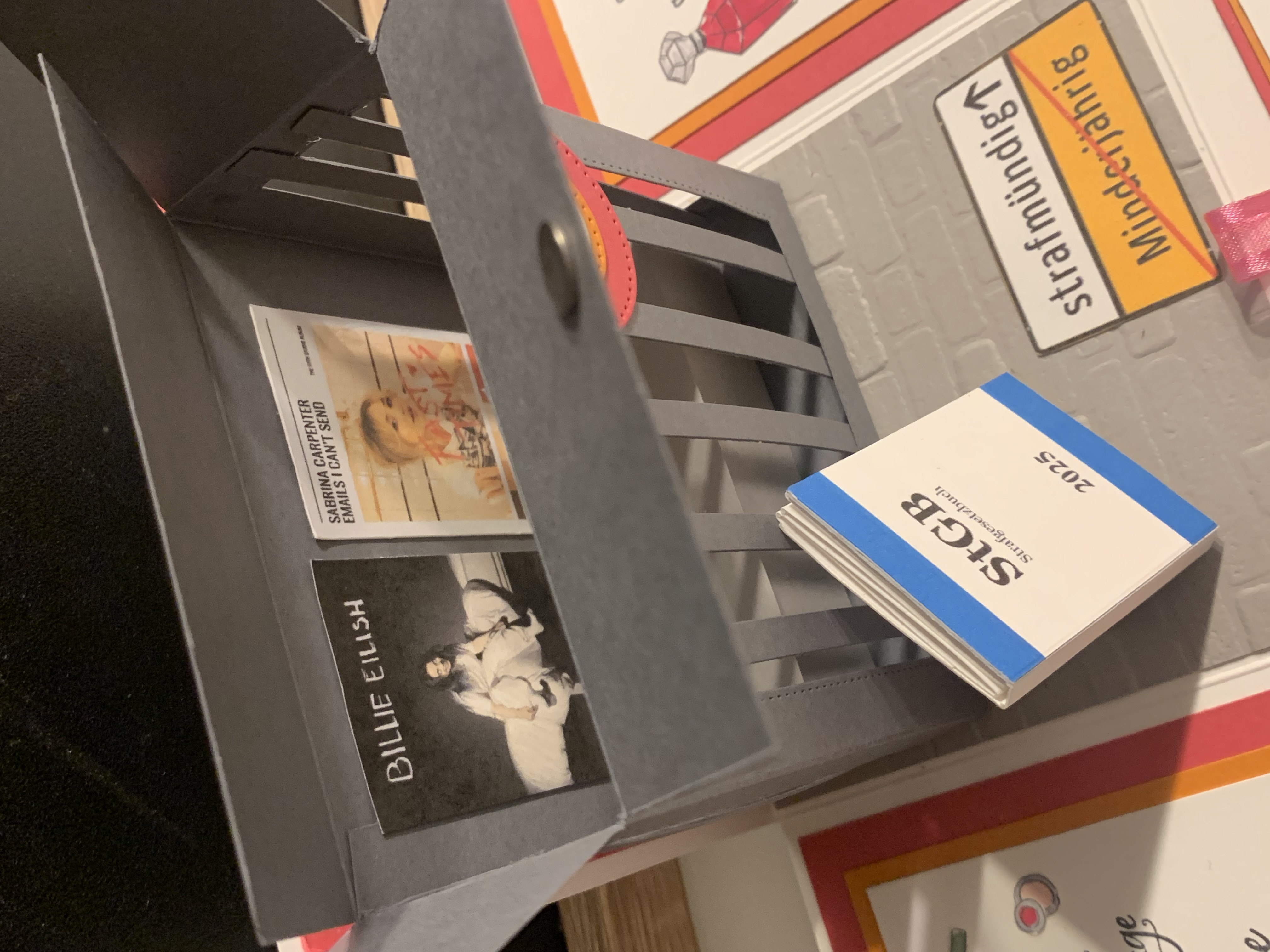 Die Eltern der lieben Anna haben diese Explosionsbox für deren 14. Geburtstag bei mir bestellt. Nachdem man in dem Alter strafmündig wird, wollten sie das Thema gerne aufgreifen, ansonsten sollte die Überraschungsbox durchaus knallig sein was die Farben betrifft. Zu dem coolen Designerpapier von Alexandra Renke habe ich Stampin‘ Up! Farbkarton in Wassermelone und Kürbisgelb verwendet, innen habe ich ein kleines „Gefängnis“ gebaut, in das auch das Pandora Armband, das sie geschenkt bekam, passen sollte, plus kleiner Pritsche und Postern an der Wand. Außerdem sind gerade Make-up und Parfum interessant, daher habe ich diese Themen an den Seiten links und rechts ein wenig aufgegriffen! Das war wirklich ein cooler, aber durchaus fordernder Auftrag! Herzlichen Dank dafür, hat Spaß gemacht! Hoffe Anna hat sich über die Box gefreut!