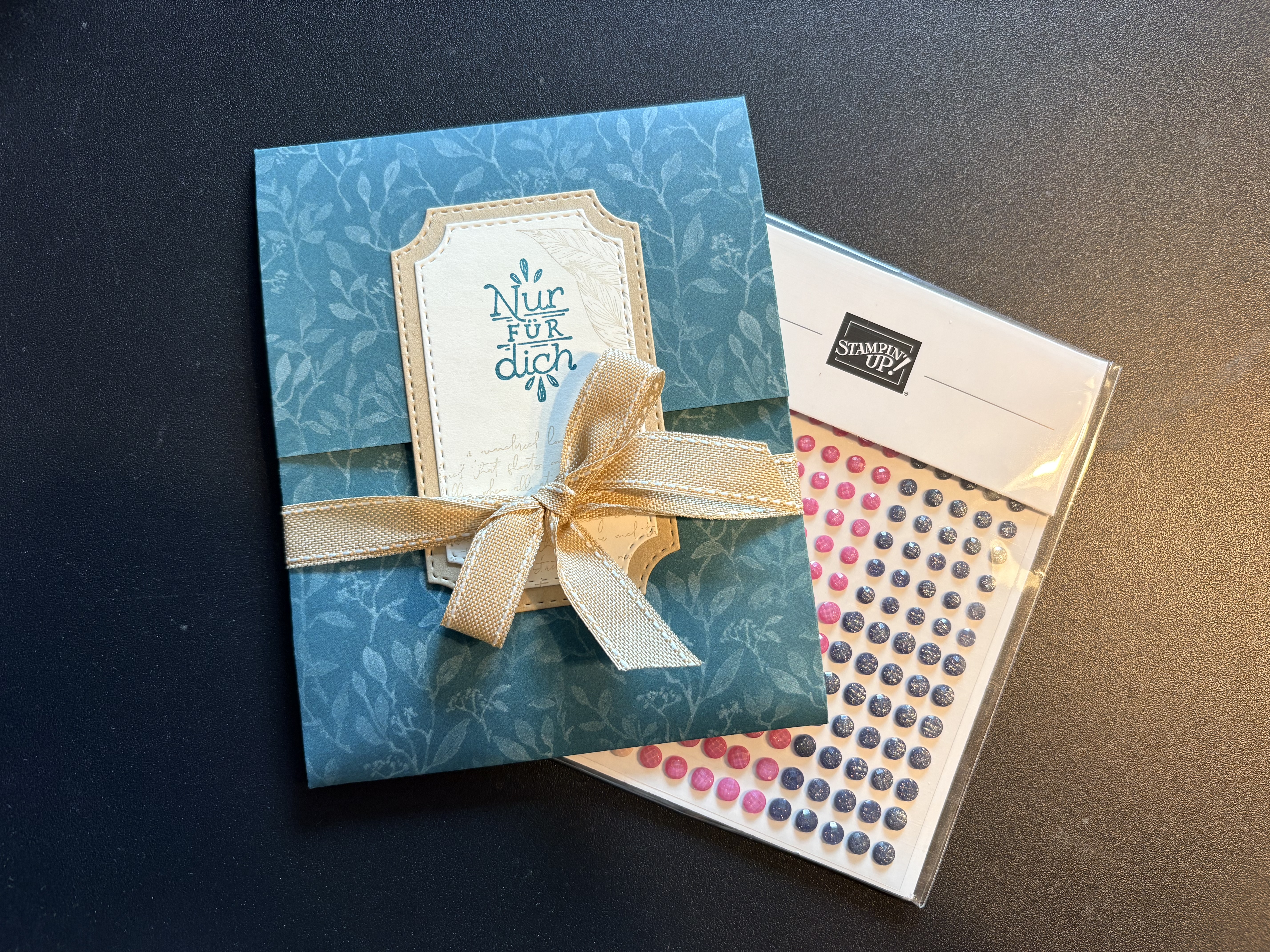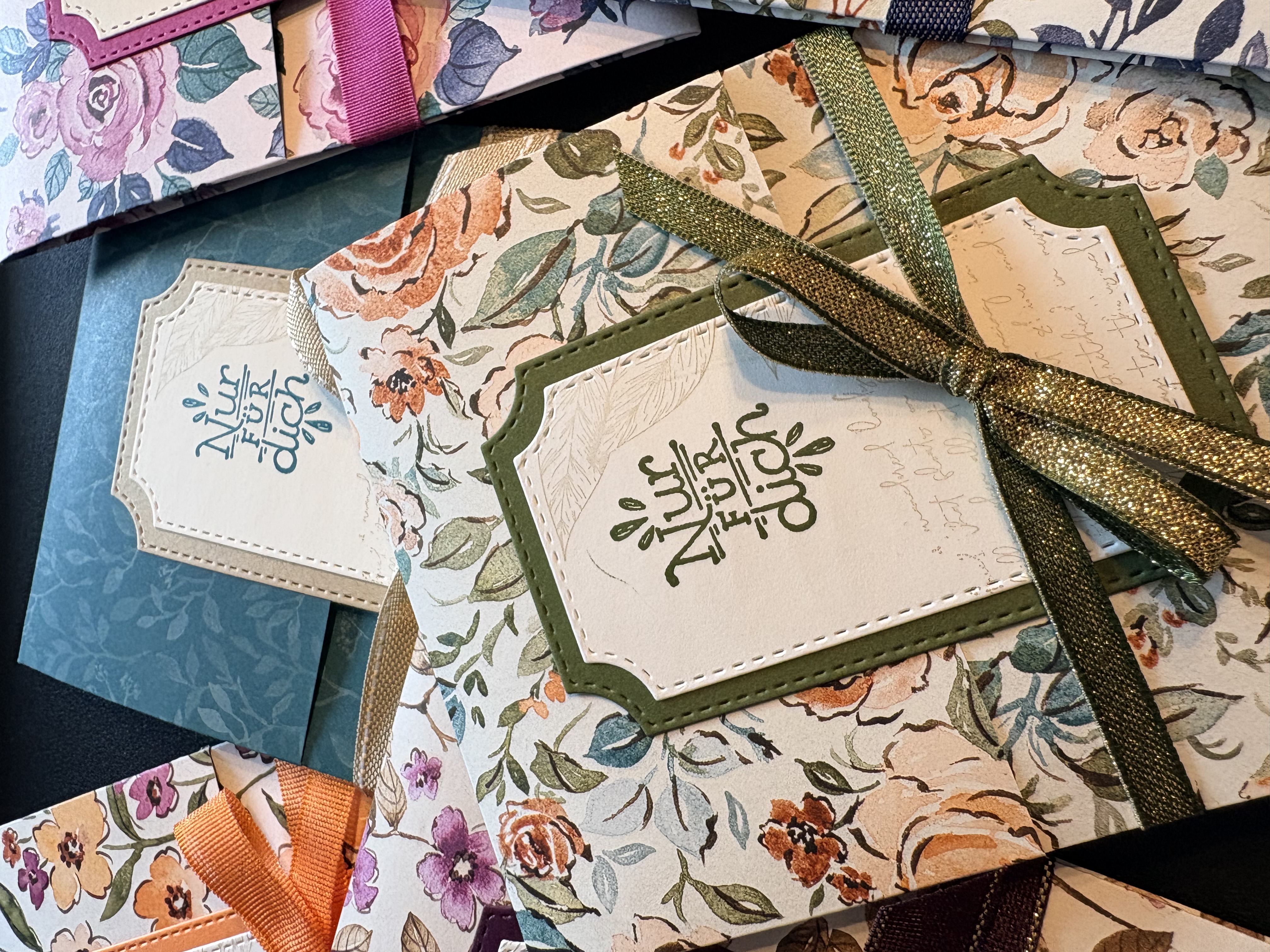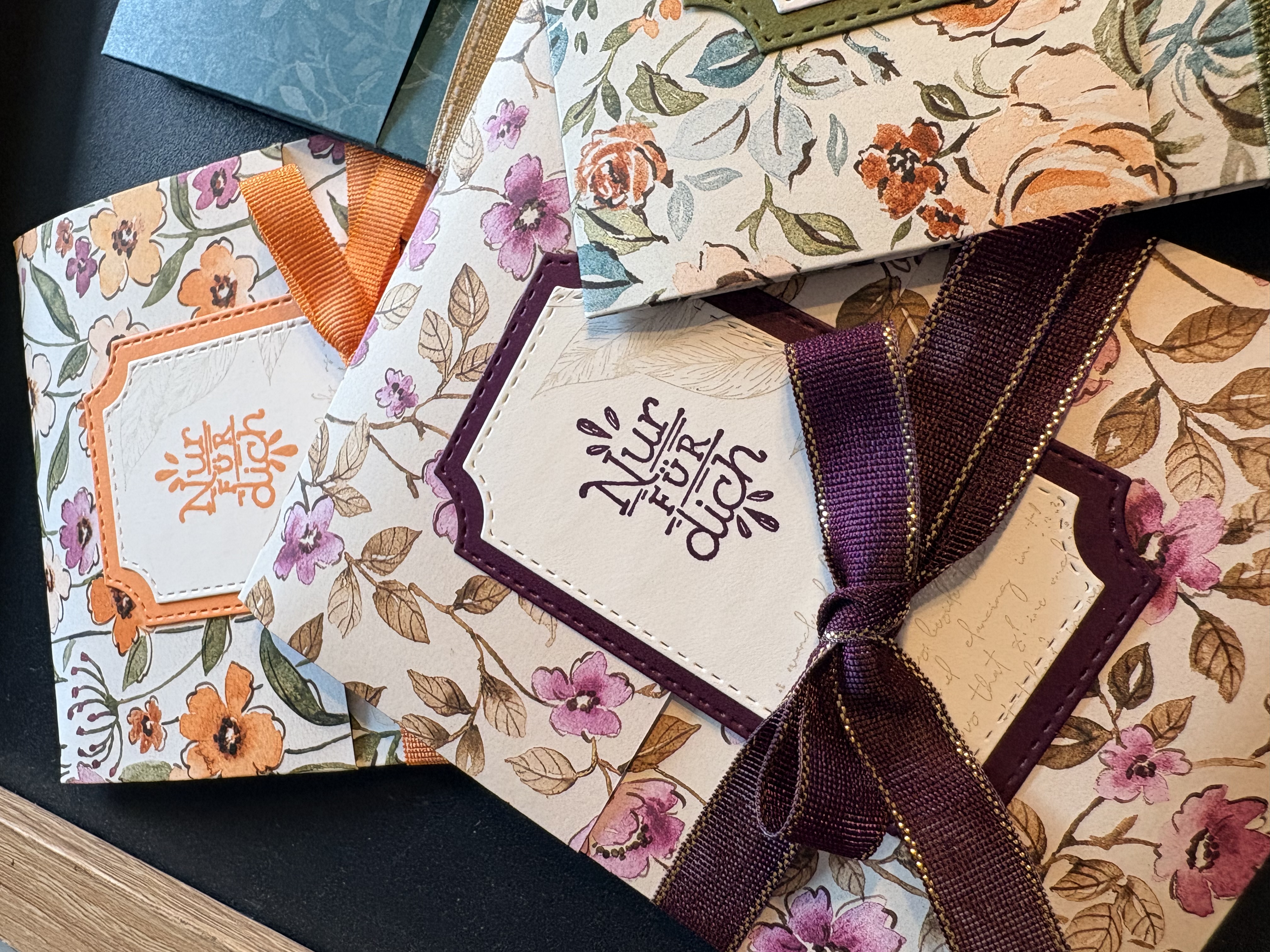Auch meine Teamies, die beim Teamtreffen dabei waren haben Glitzersteine samt Verpackung bekommen. Hier habe ich allerdings das Designerpapier „Bezaubernd Floral“ verwendet, die Stanzformen „Bezaubernde Zweige“, einen Stempel aus dem Stempelset „Schöne Etiketten“, Farbkarton in Savanne, Sommerbeere, Tigerorange, Waldmoos, Marineblau und Brombeermousse sowie farblich passende Geschenksbänder.