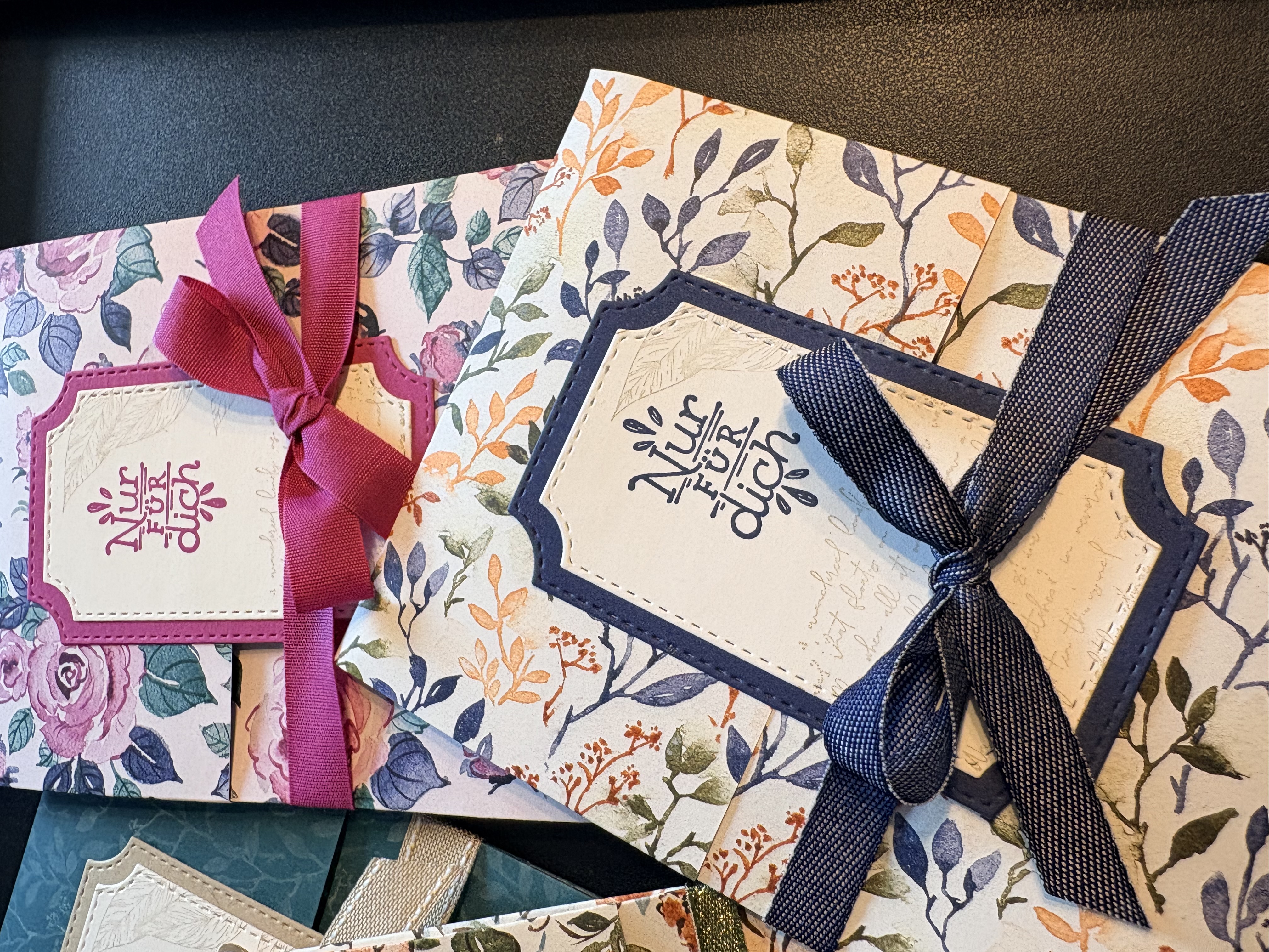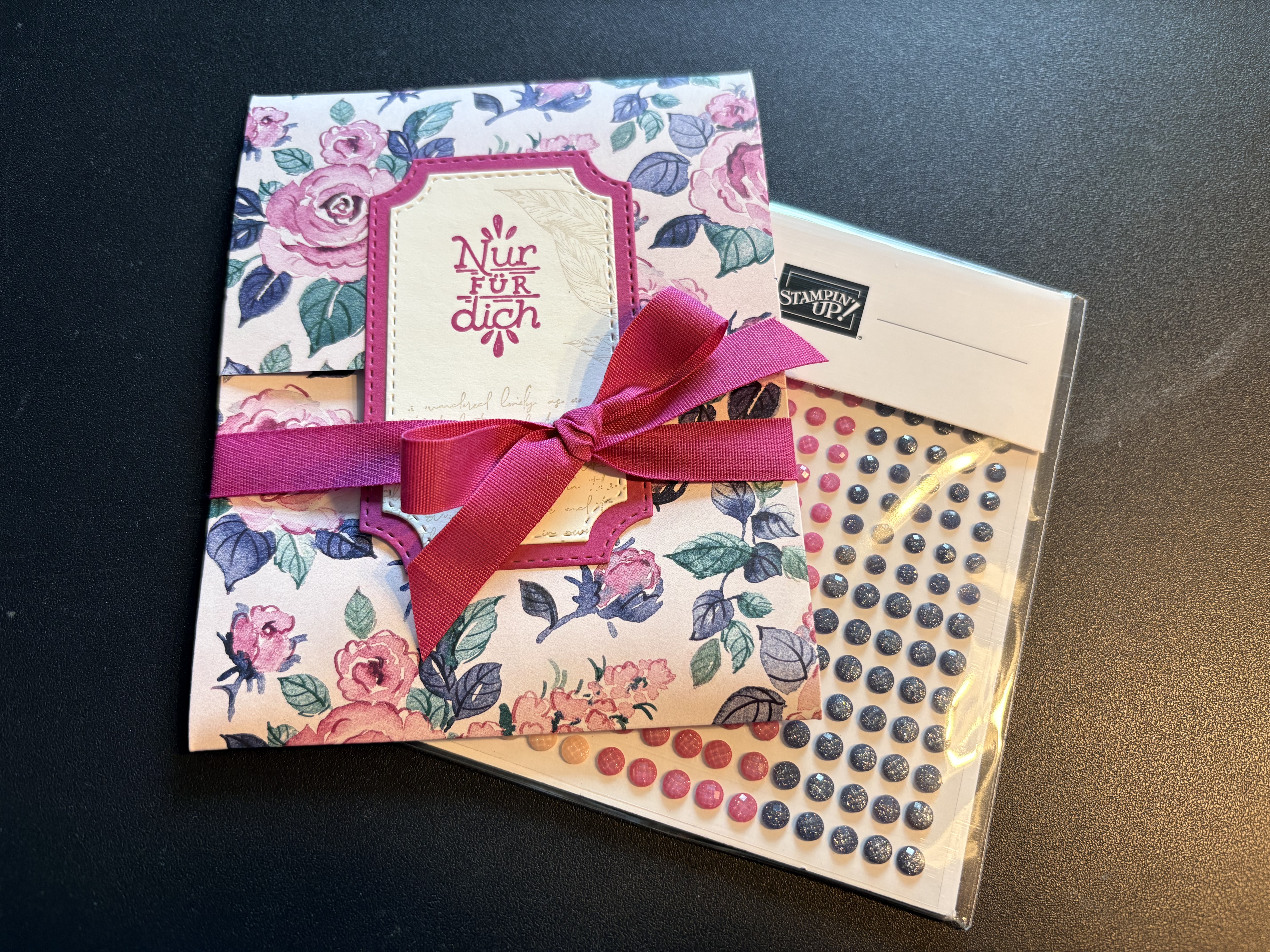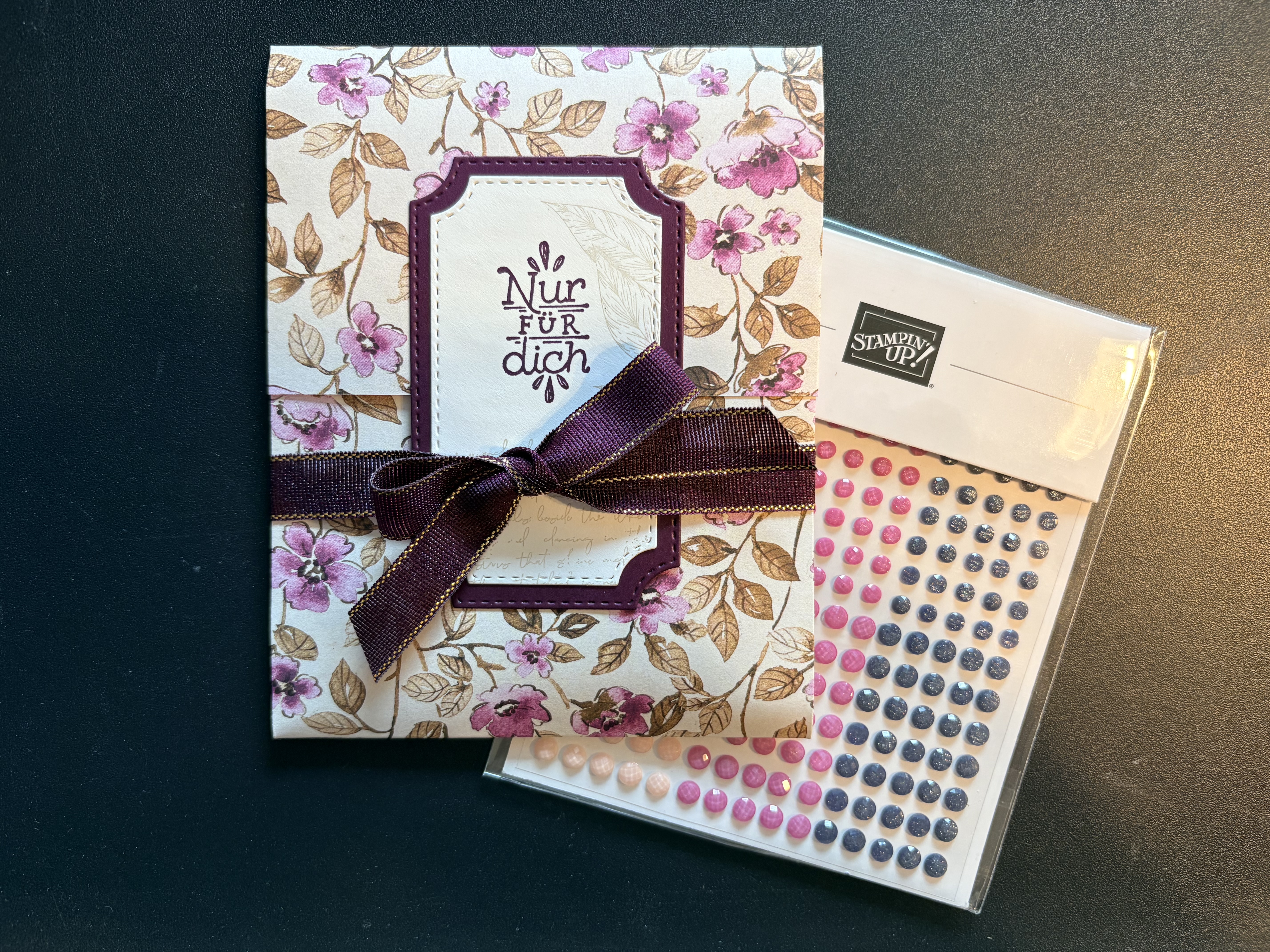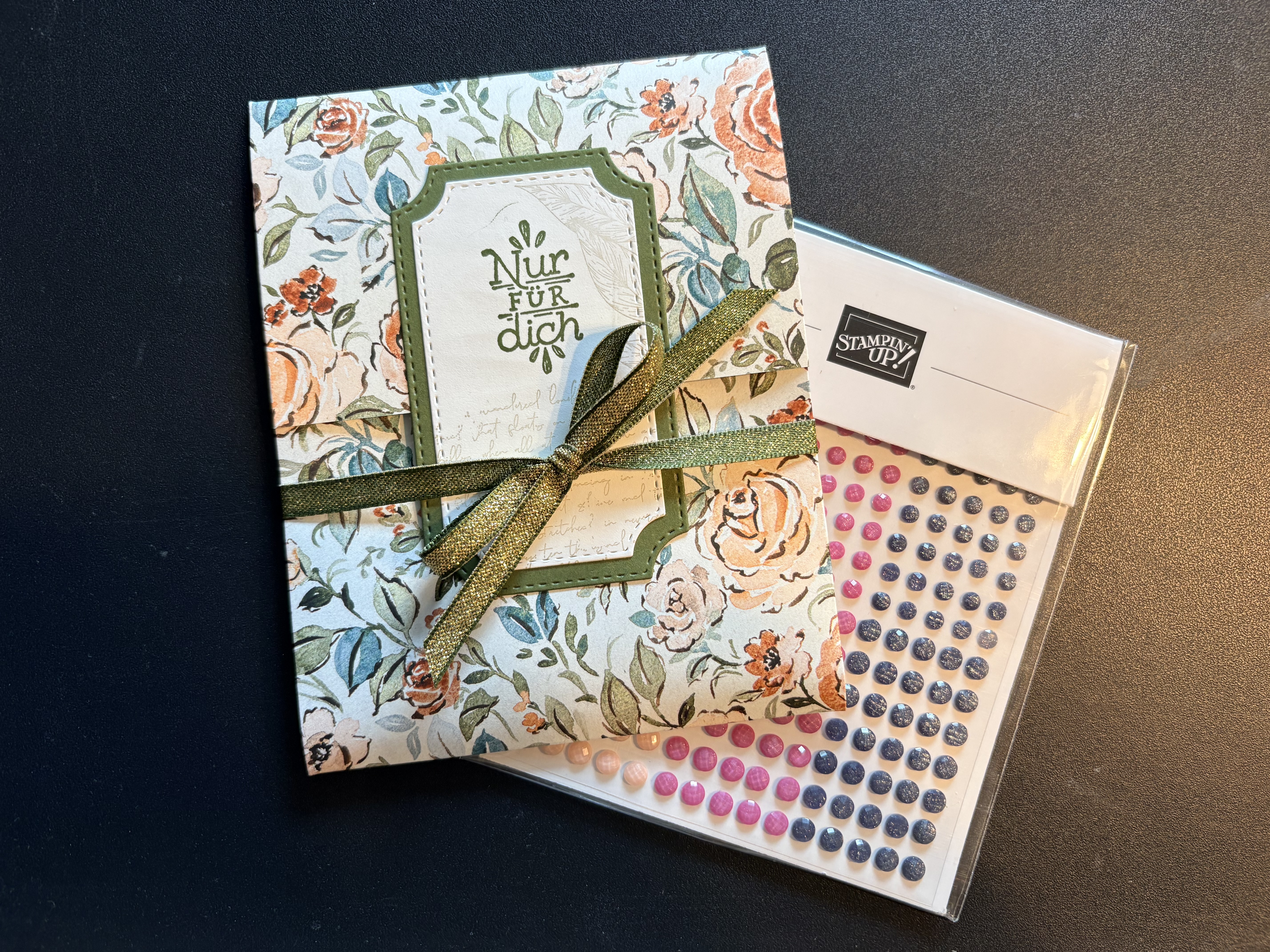Auch meine Teamies, die beim Teamtreffen dabei waren haben Glitzersteine samt Verpackung bekommen. Hier habe ich allerdings das Designerpapier „Bezaubernd Floral“ verwendet, die Stanzformen „Bezaubernde Zweige“, einen Stempel aus dem Stempelset „Schöne Etiketten“, Farbkarton in Savanne, Sommerbeere, Tigerorange, Waldmoos, Marineblau und Brombeermousse sowie farblich passende Geschenksbänder.