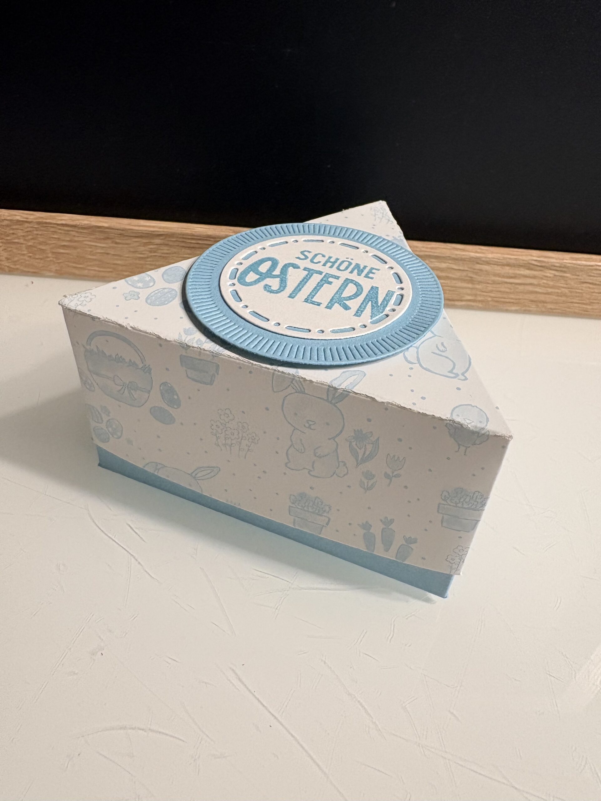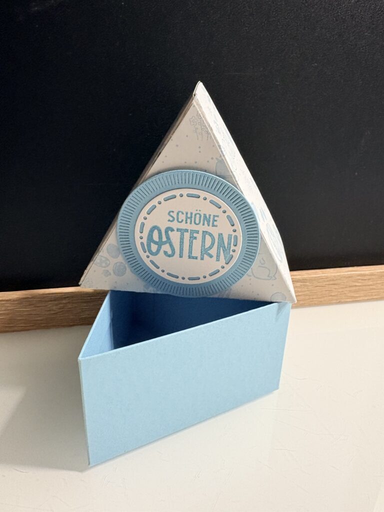 Heute stelle ich euch das 2. Projekt aus meinem April Workshop/ Workshop2Go vor – eine kleine Dreiecksbox zum Verschenken von süßen Kleinigkeiten. Das besondere Designerpapier „Osterfreuden“ ist entzückend, wobei ich zugeben muss, dass mir die Rückseiten des Designerpapiers eindeutig besser gefallen. Hier habe ich die lieben Häschen verwendet und dazu farblich passenden Farbkarton sowie Stempelfarbe in Babyblau. Gestempelt habe ich mit dem Stempelset „Gründe zum Feiern“ einen Ostergruß und zwar auf Kreisen, die ich mit dem tollen Stanzenset „Naturverliebte Kreise“ ausgestanzt und mit Stampin‘ Dimensionals angeklebt habe.